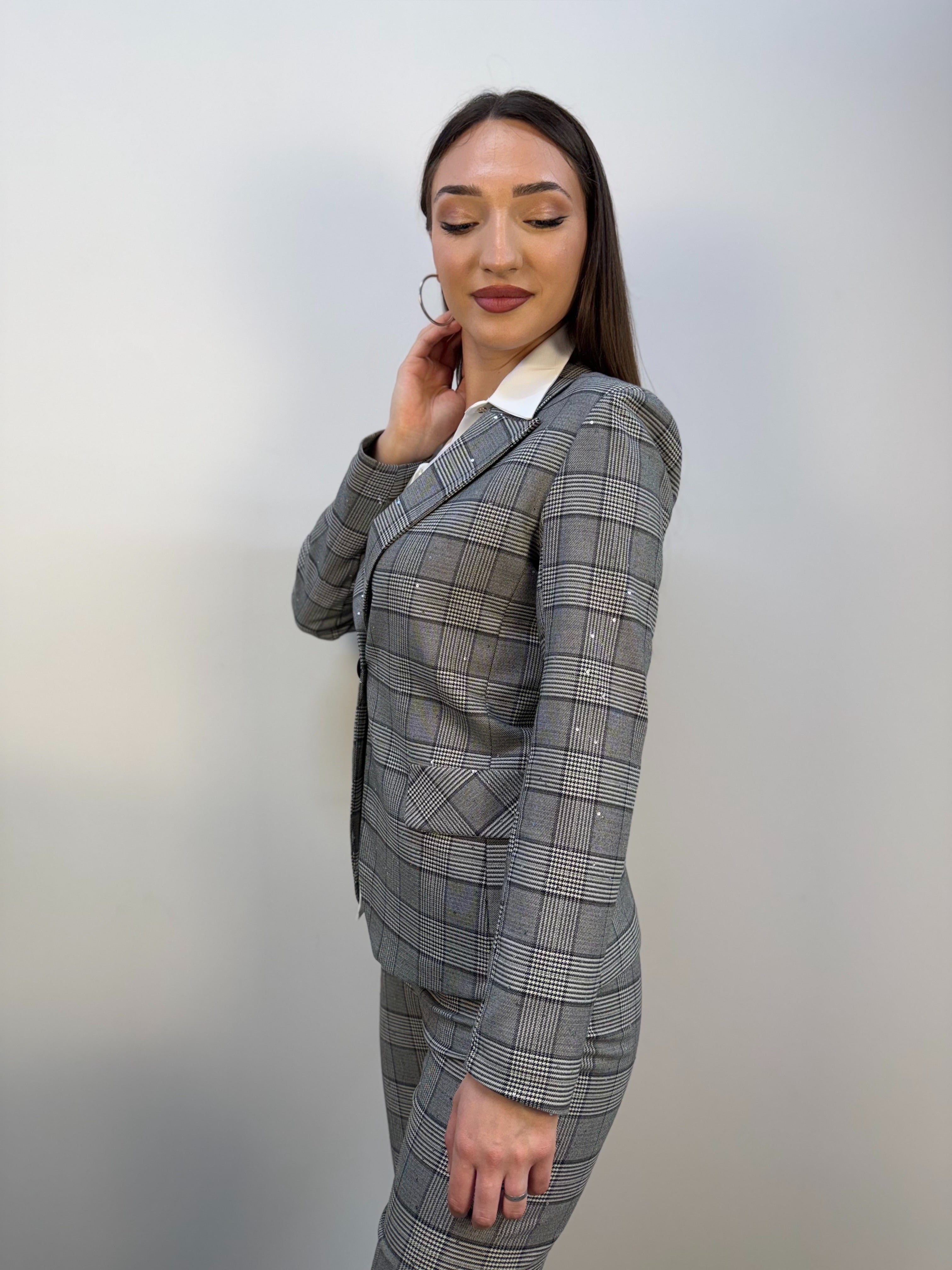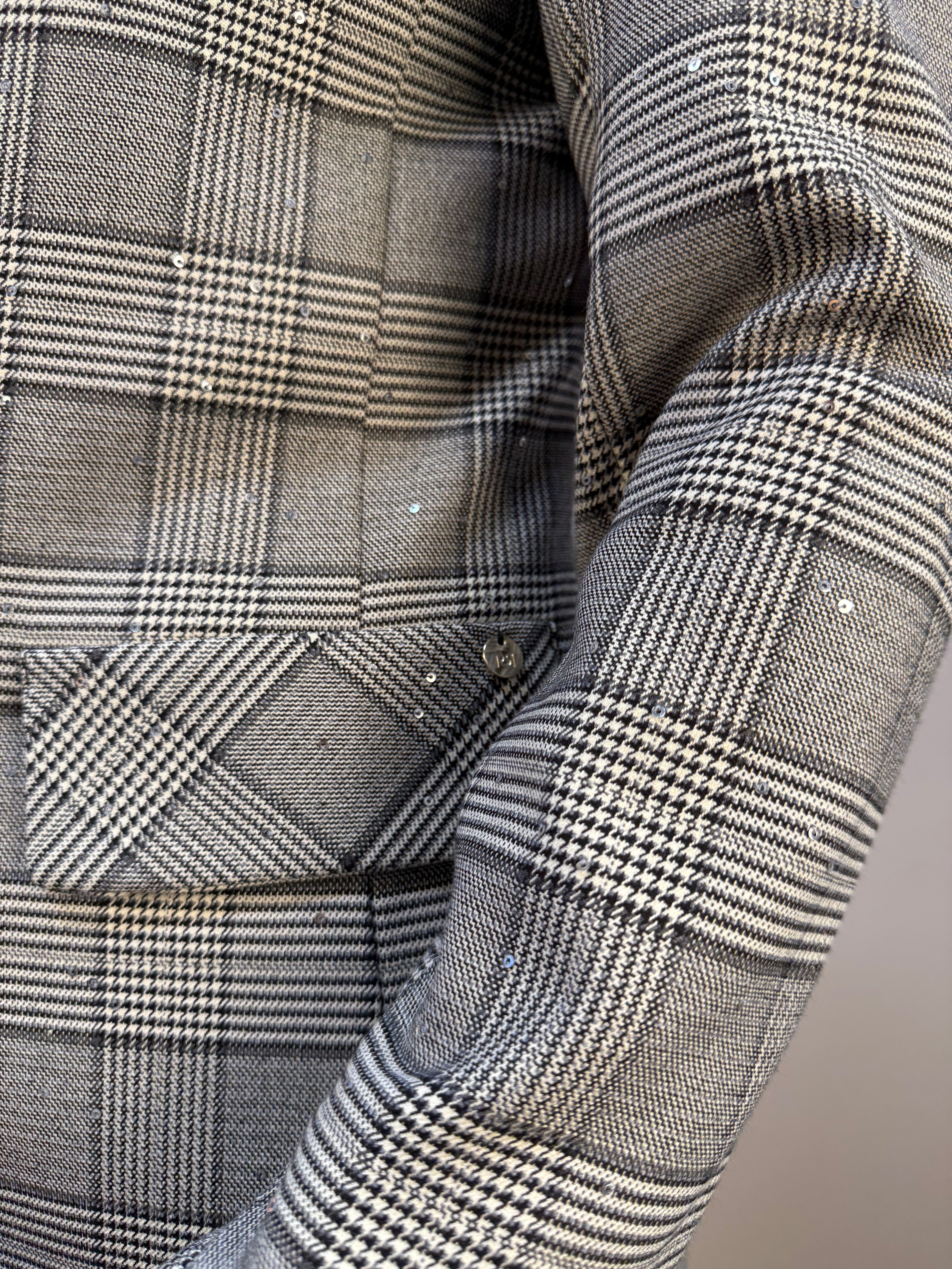Giacca check con spalle imbottite e paillettes trasparenti
