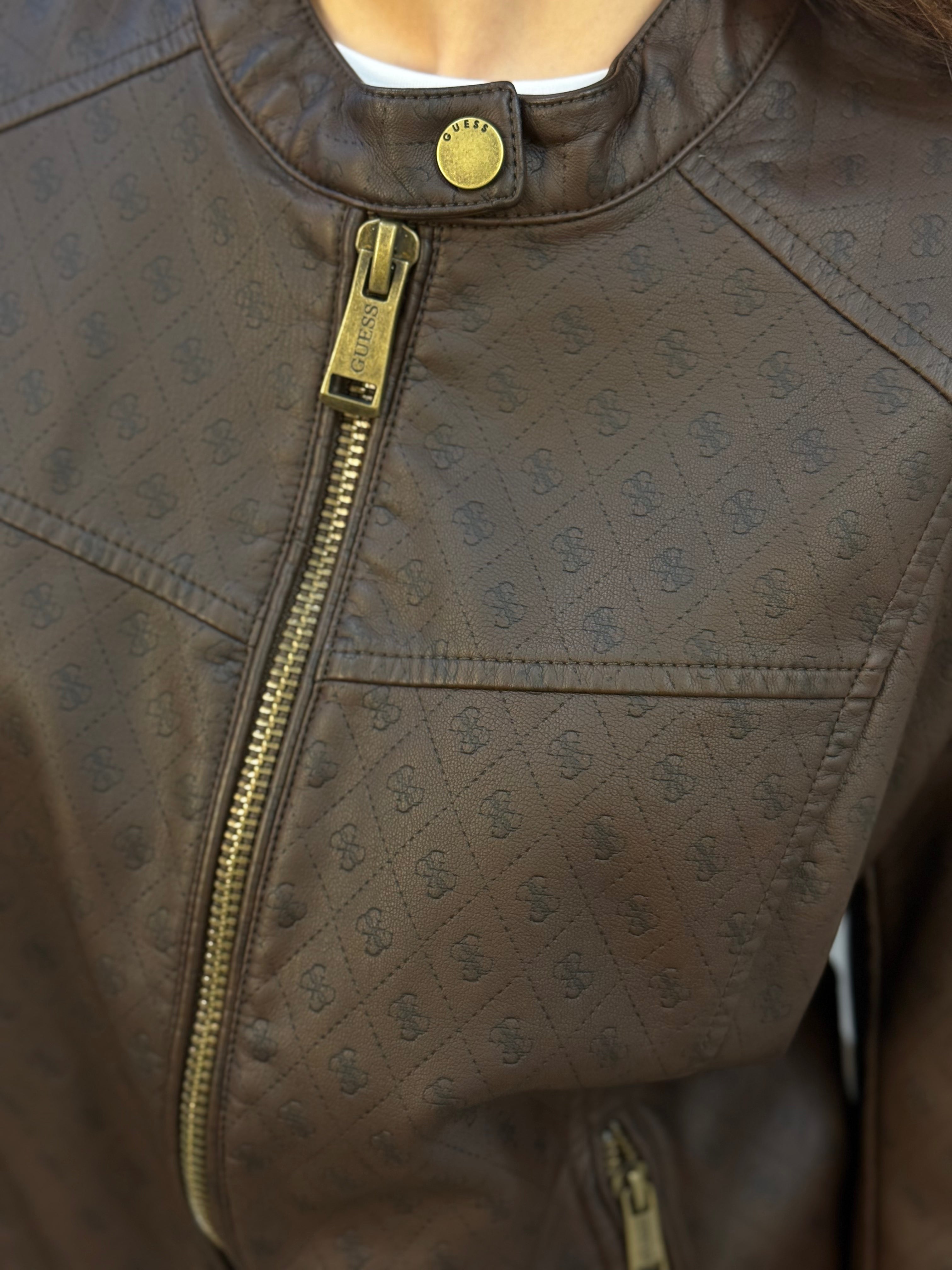 Giacchetto GUESS in similpelle logato 4G, chiusura a zip e spallina imbottita.