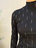 Un capo essenziale che non passa inosservato: questa maglia Akè a collo alto a costine nere è arricchita da una delicata stampa glitterata che dona luce e personalità al look. La vestibilità aderente e il tessuto elasticizzato la rendono confortevole e perfetta da abbinare a blazer, gonne o pantaloni per un tocco luminoso anche nei look più semplici.