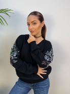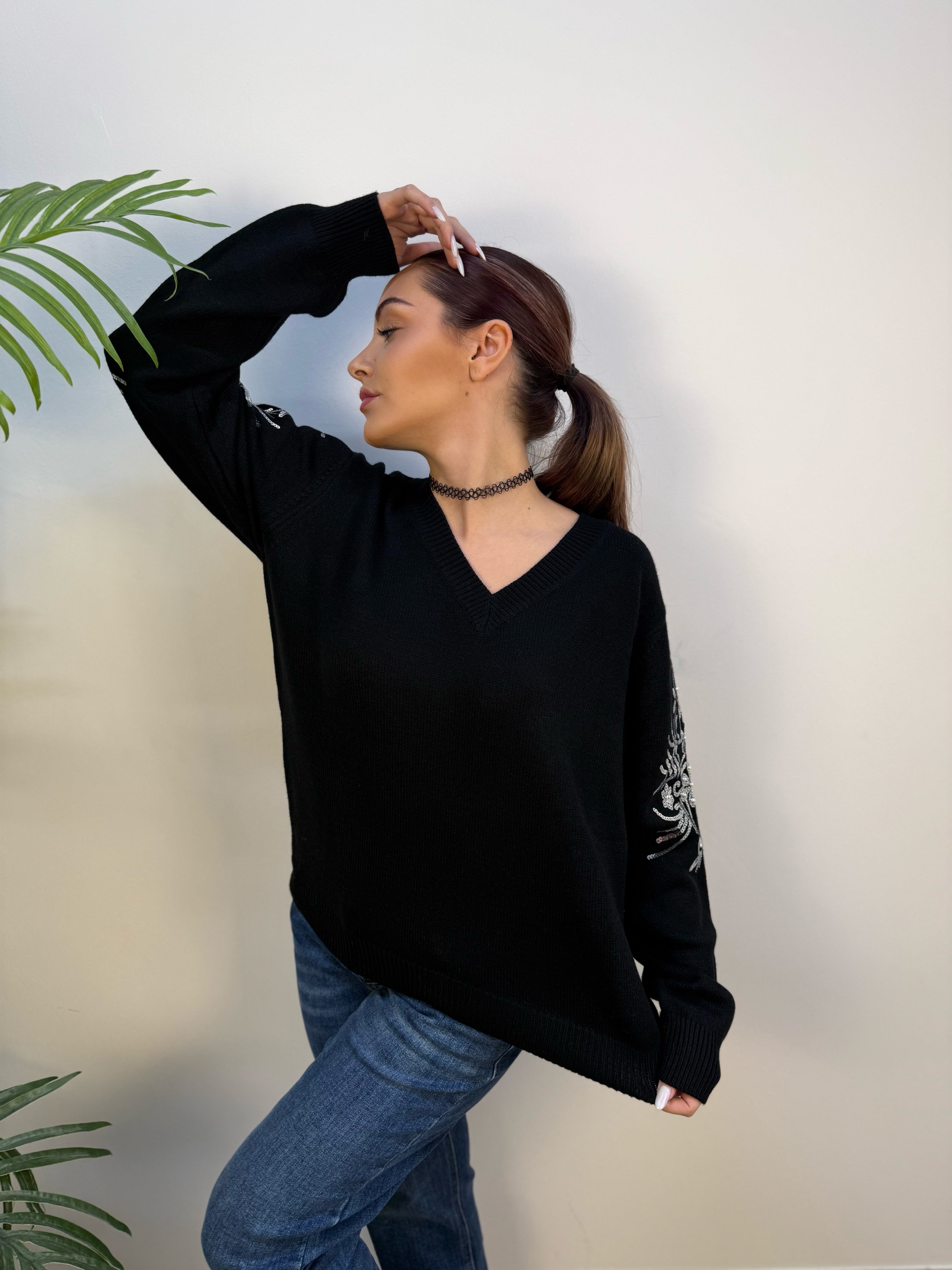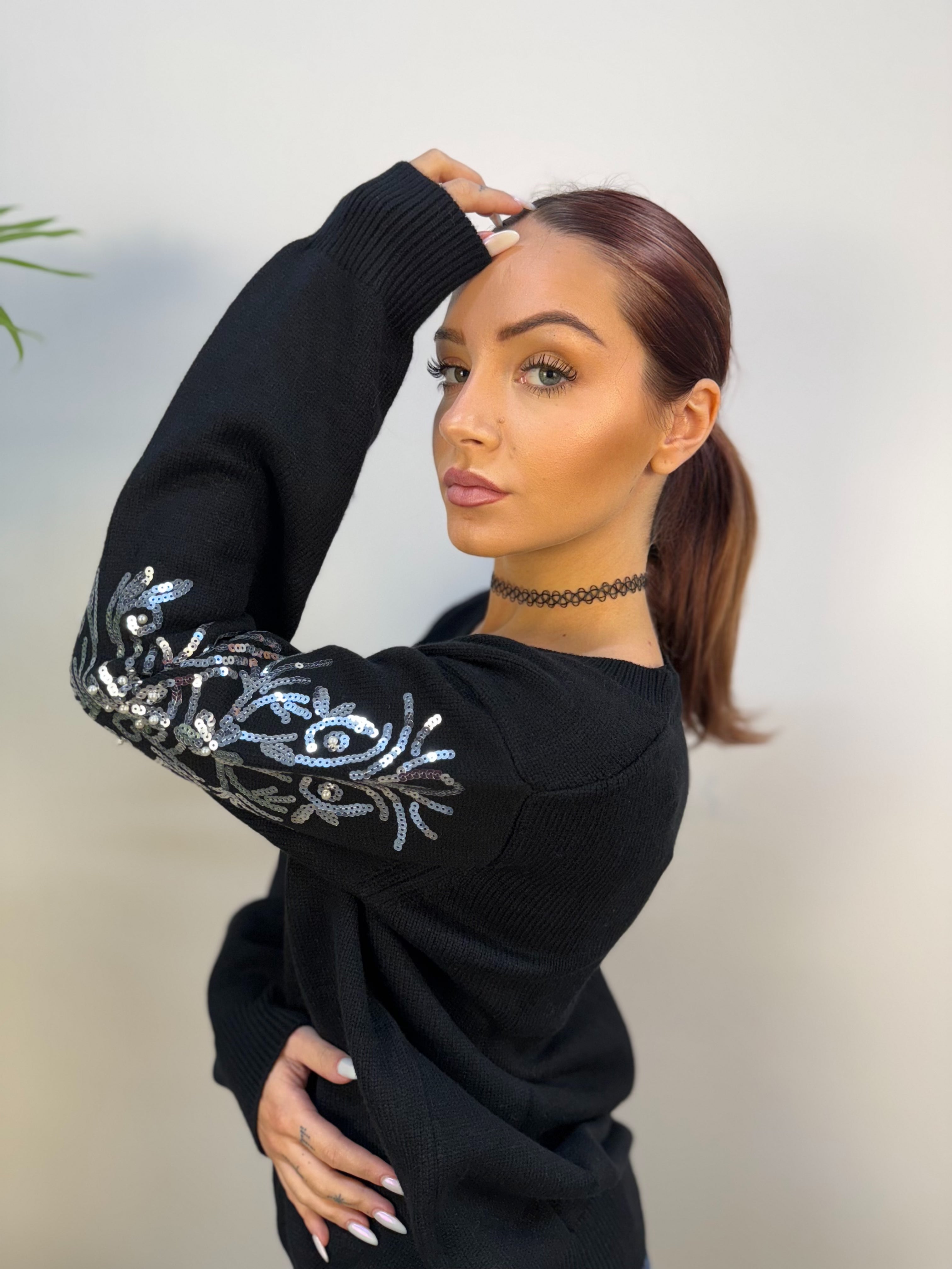 Maglia Exsy a tinta unita con scollo a V realizzata in un morbido e caldo misto viscosa, pensata per offrire comfort e una vestibilità piacevole. Le maniche decorate con paillettes argento aggiungono un tocco luminoso e sofisticato, perfetto per valorizzare ogni look. Rifinita con polsini, scollo e fascione a costine per un effetto elegante e una migliore aderenza, la maglia è leggermente elasticizzata per seguire armoniosamente le forme.