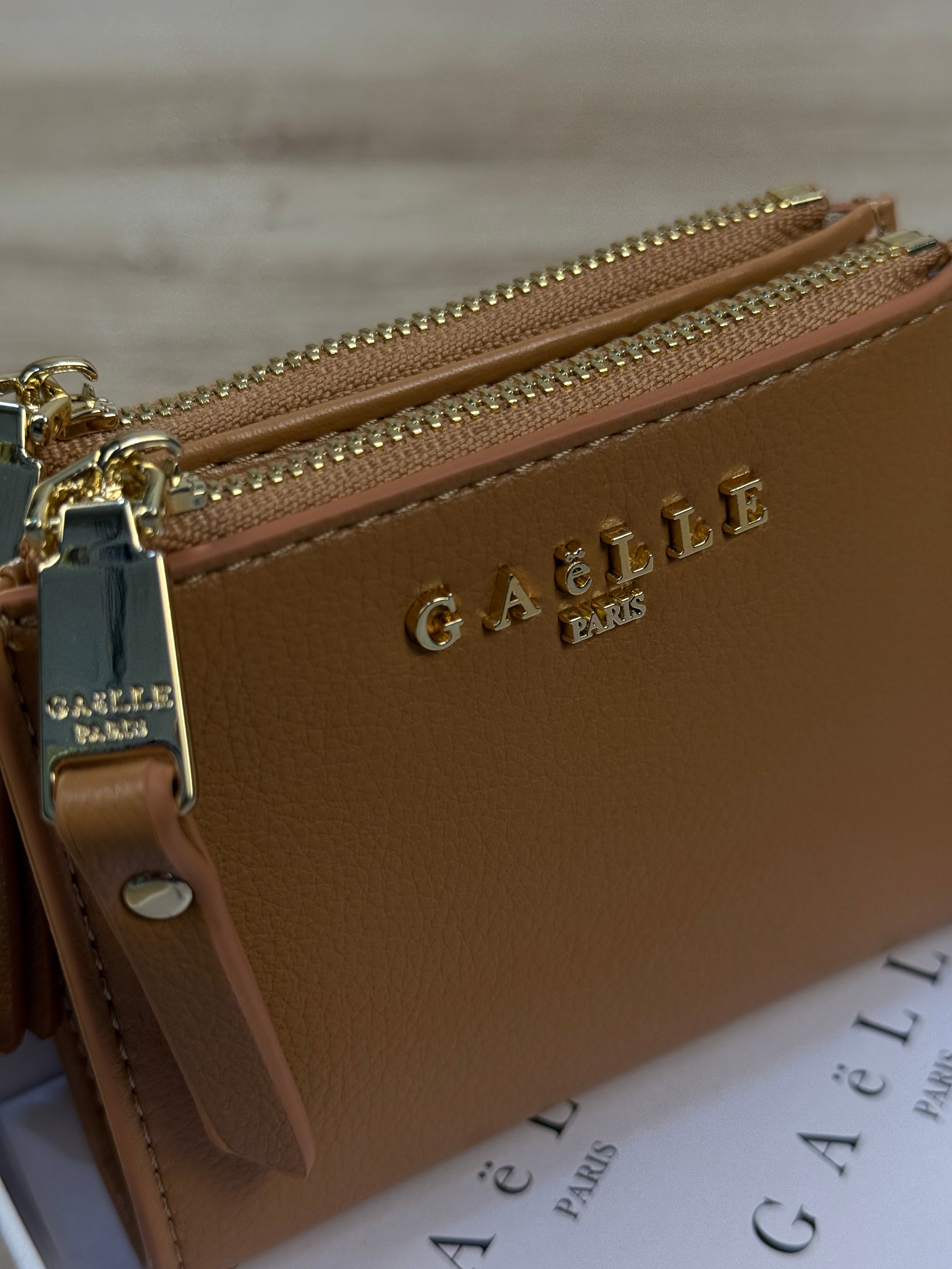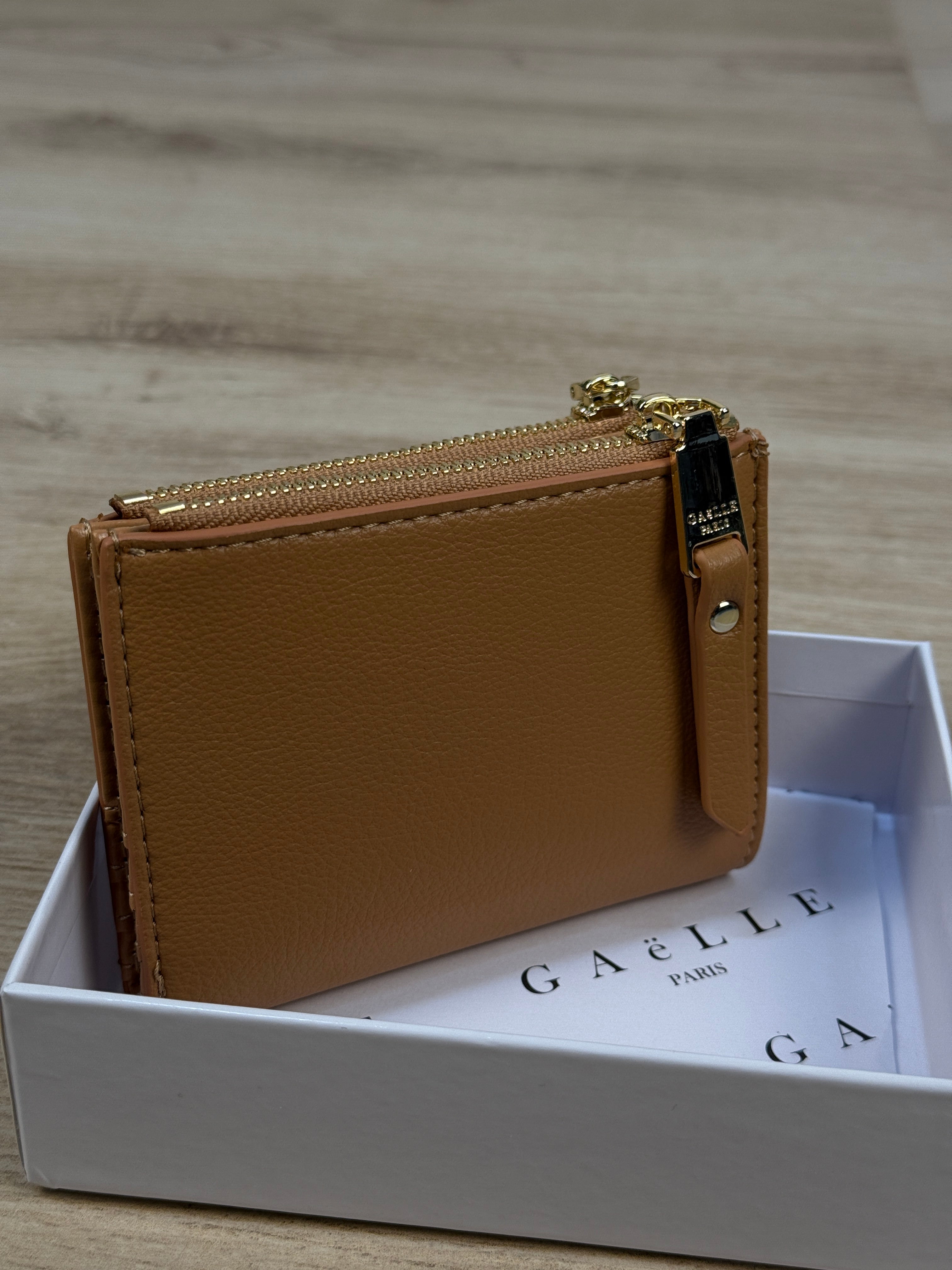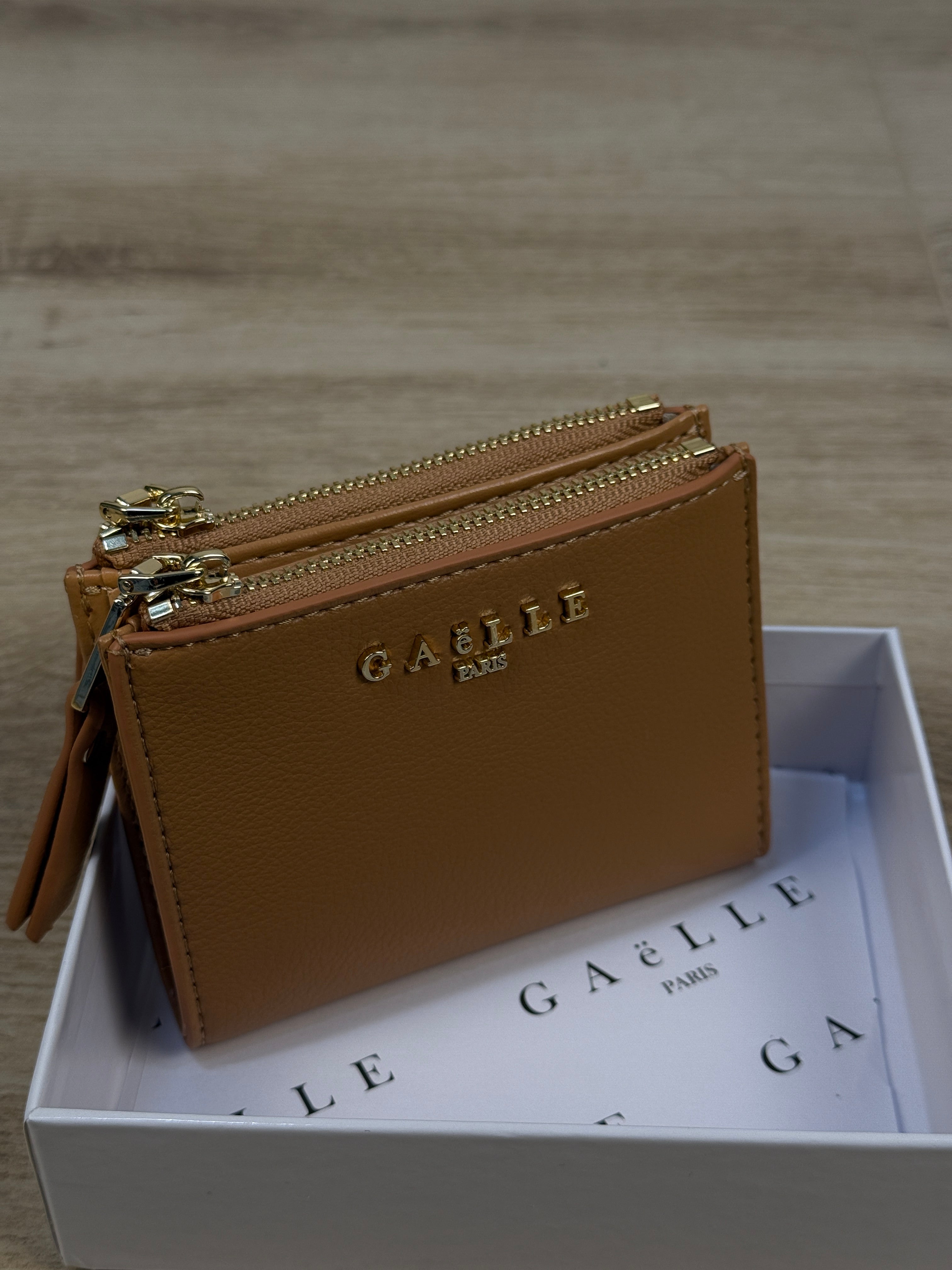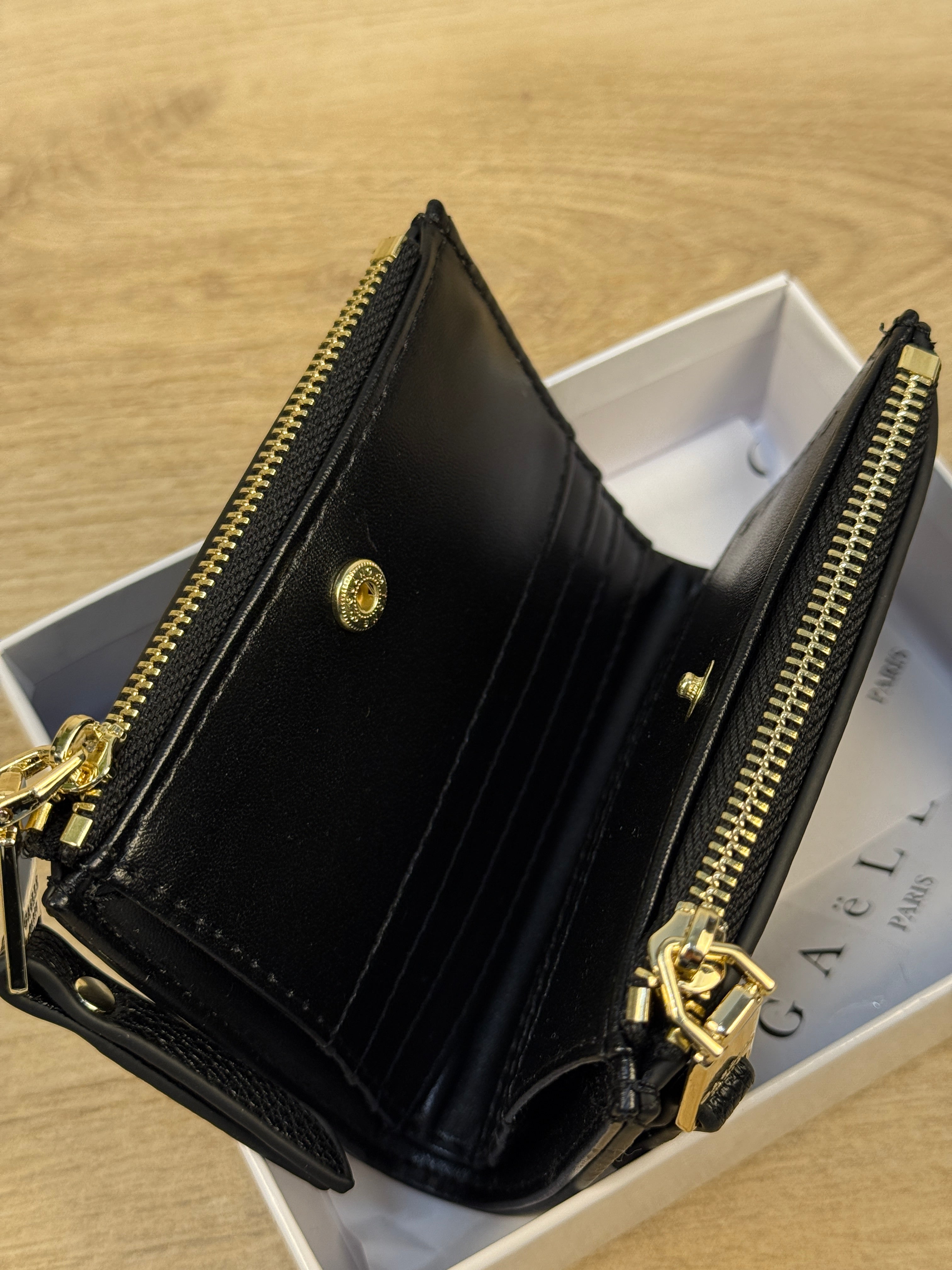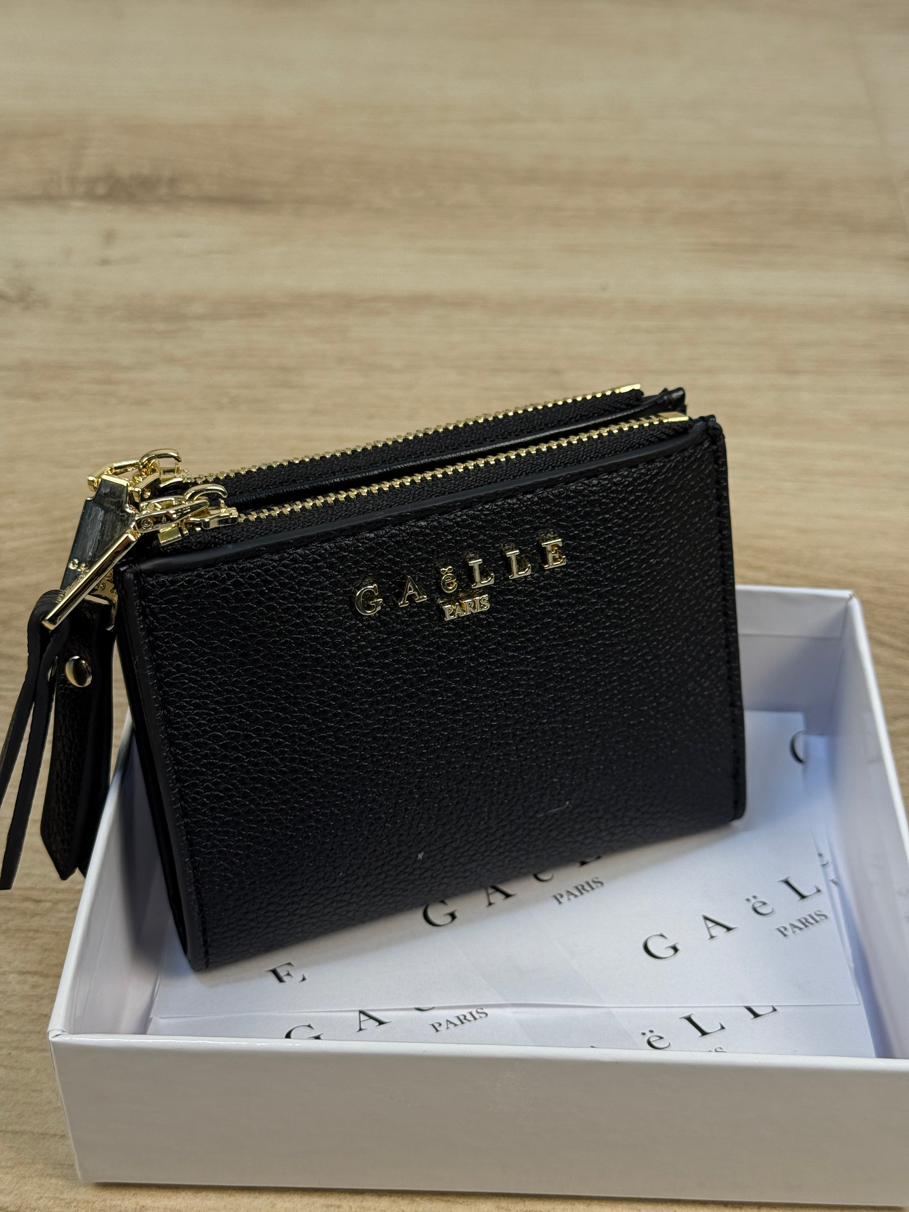 Mini portafoglio GAELLE in similpelle liscia e logo metallico frontale con chiusura a bottone ad incastro. Doppia zip, porta carte e porta monete.