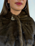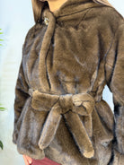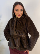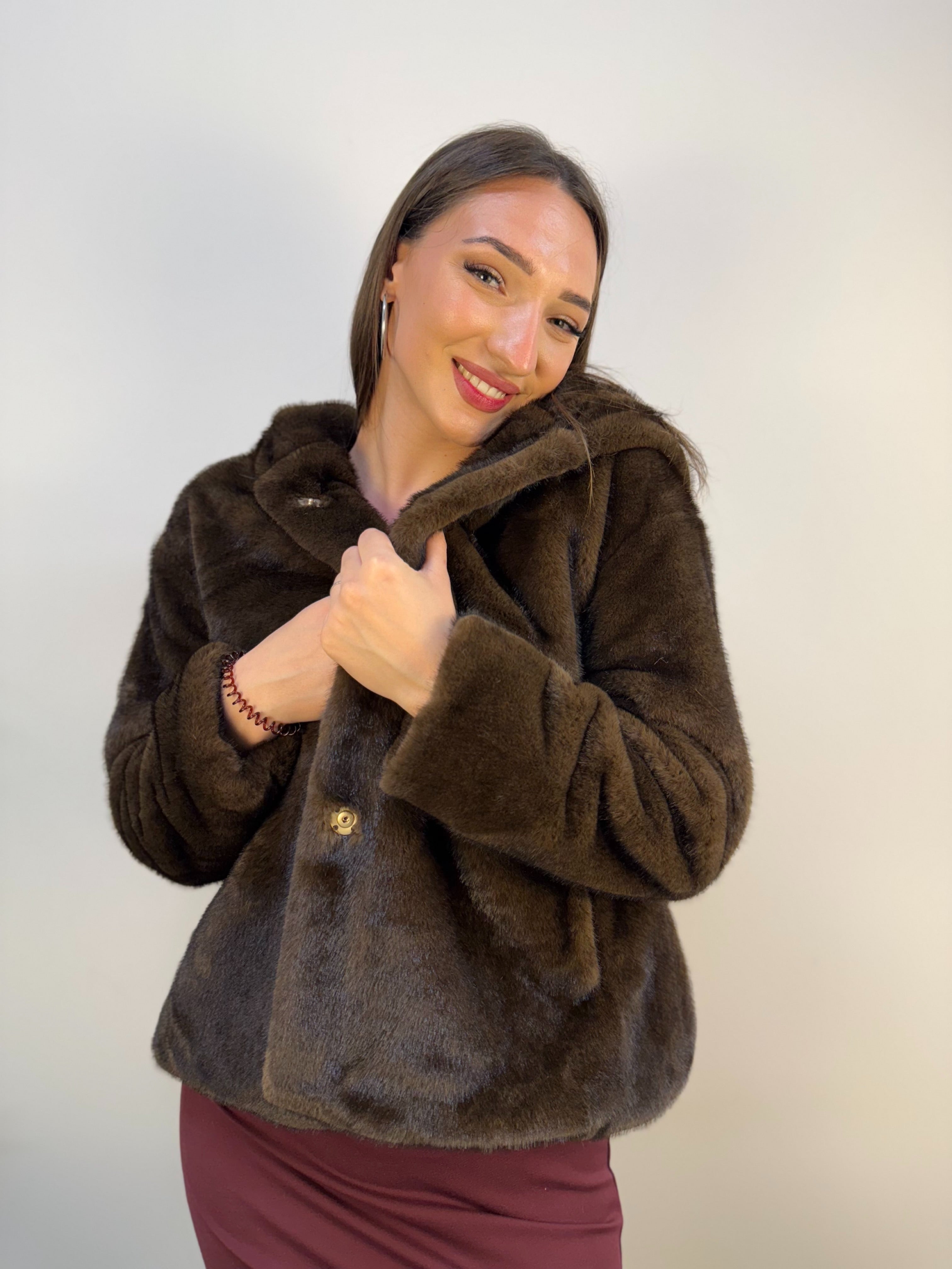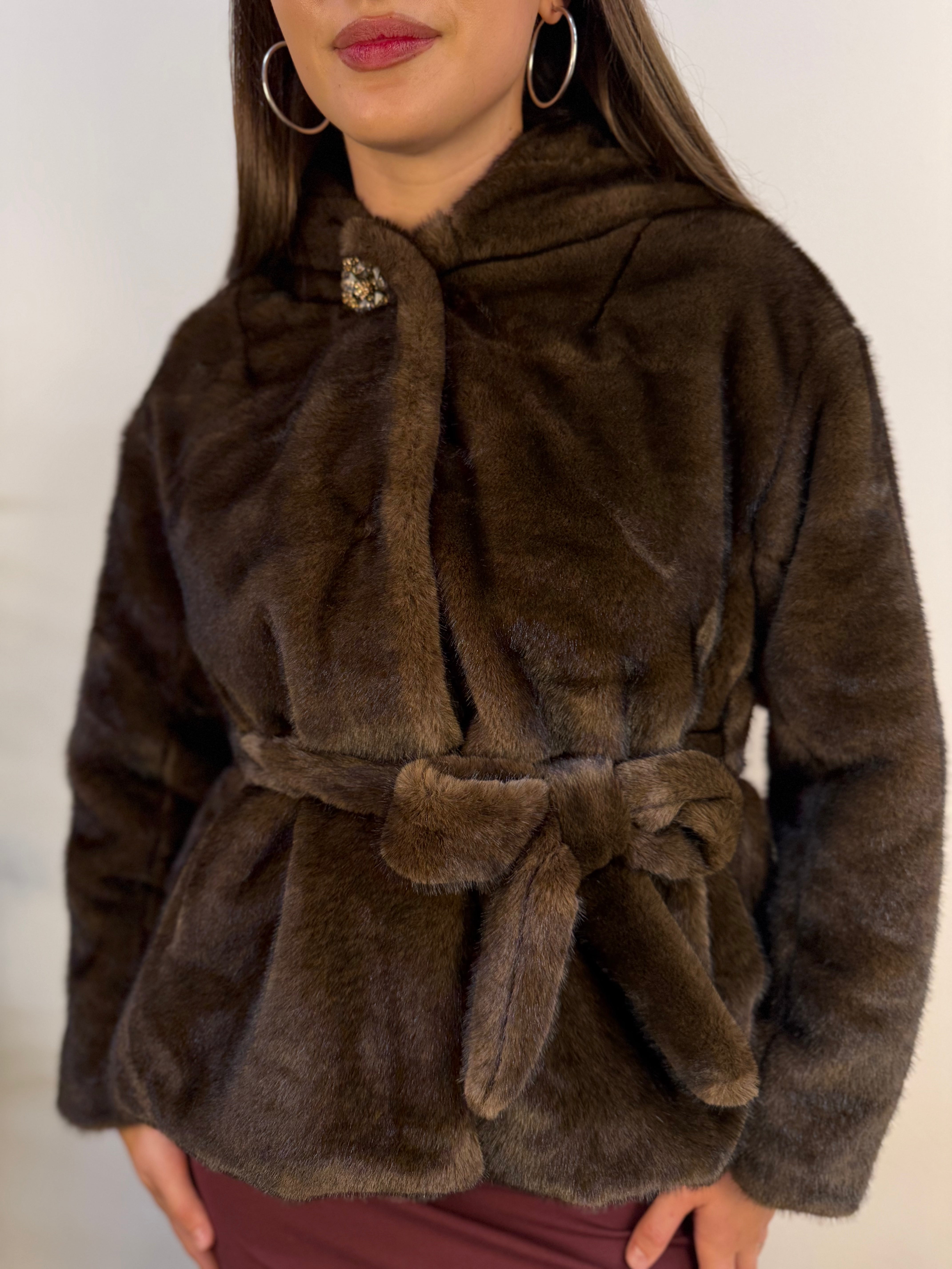 Pelliccia corta con cappuccio, cintura in vita e chiusura a bottoni a pressione