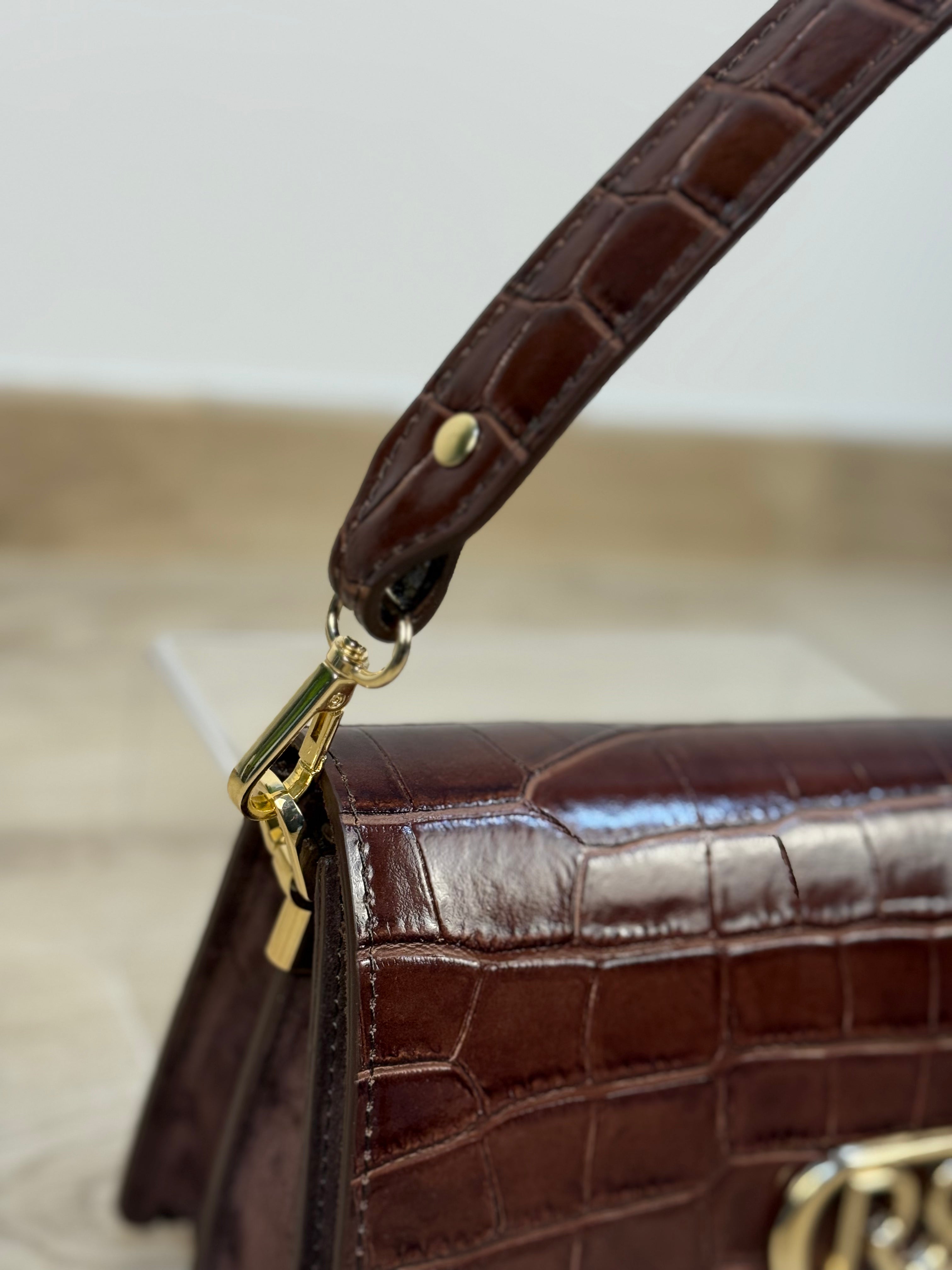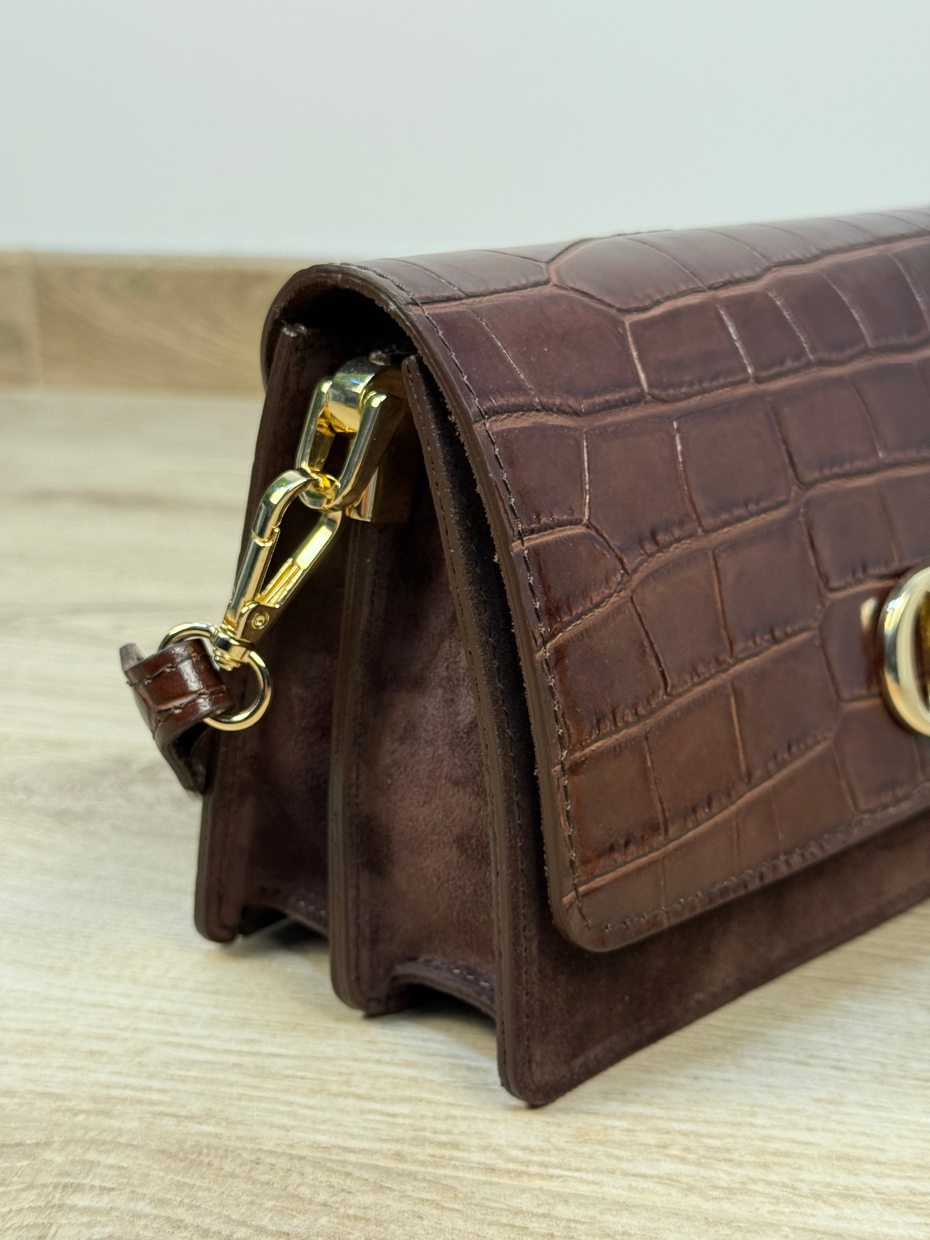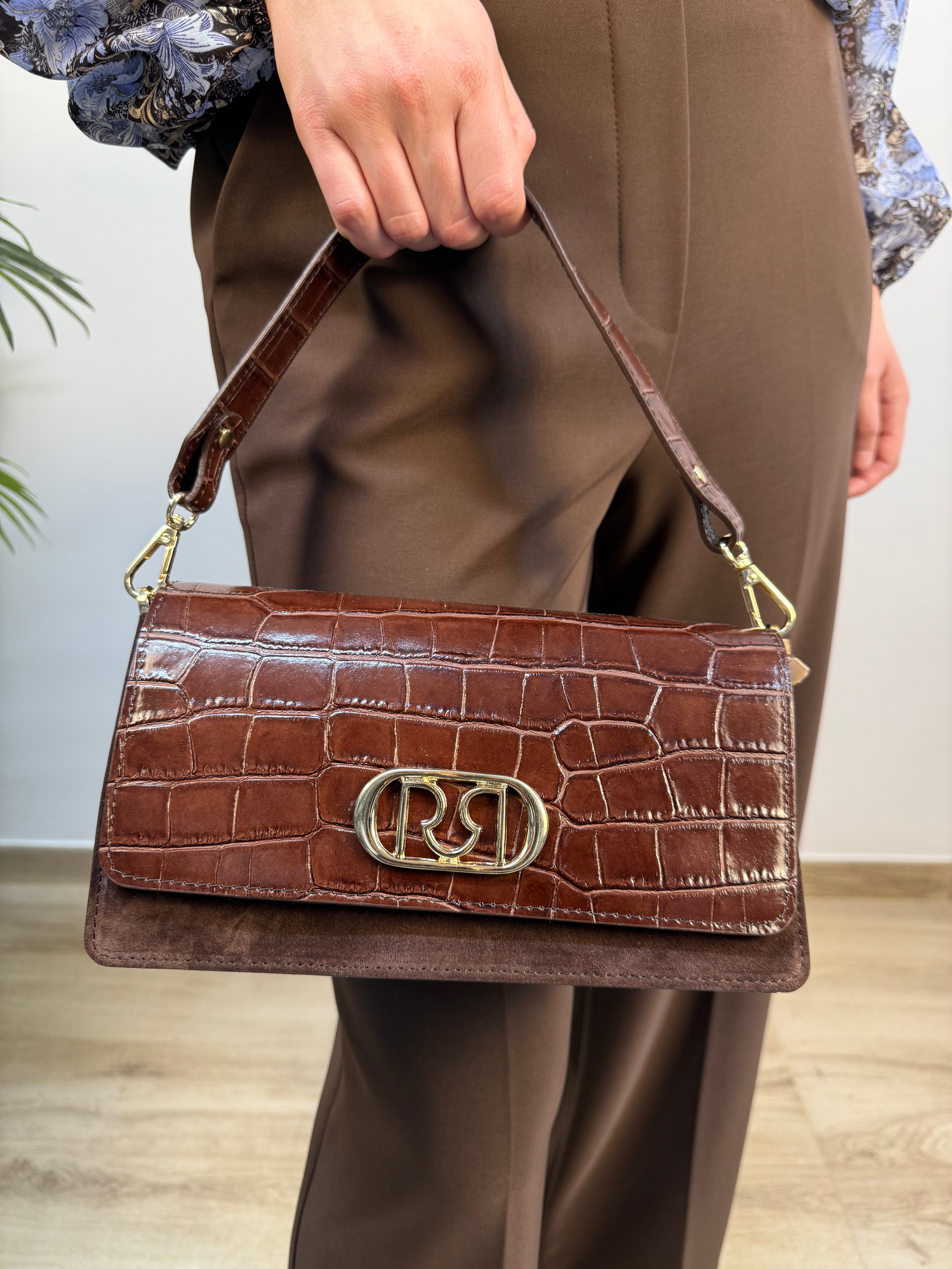 La New OperaBag Mini è una borsa compatta e sofisticata, pensata per completare look eleganti o aggiungere un tocco raffinato agli outfit di tutti i giorni. Realizzata in 100% pelle e interamente Made in Italy, combina una patta effetto cocco lucida con una base in pelle scamosciata, creando un raffinato contrasto di texture. Il design strutturato è valorizzato da rifiniture oro, che aggiungono luminosità e carattere. La borsa si chiude con due bottoni a calamita per una chiusura pratica e sicura. All’interno, uno scomparto centrale con zip divide il vano principale in due sezioni funzionali, ideali per organizzare al meglio gli oggetti essenziali. È dotata di doppia tracolla tono su tono, una più corta per un look a mano e una più lunga, removibile e lucida, per un utilizzo versatile a spalla o crossbody.