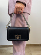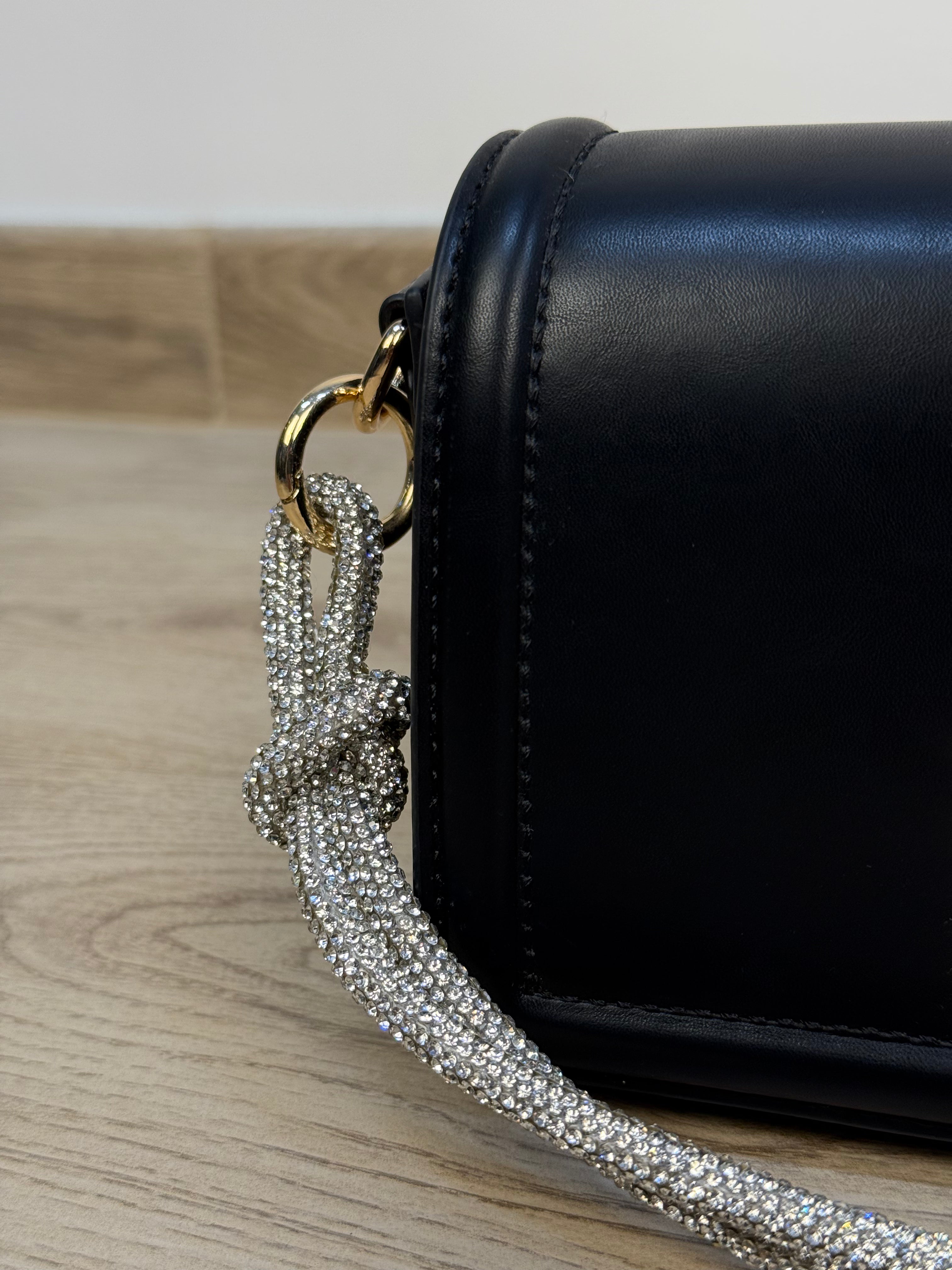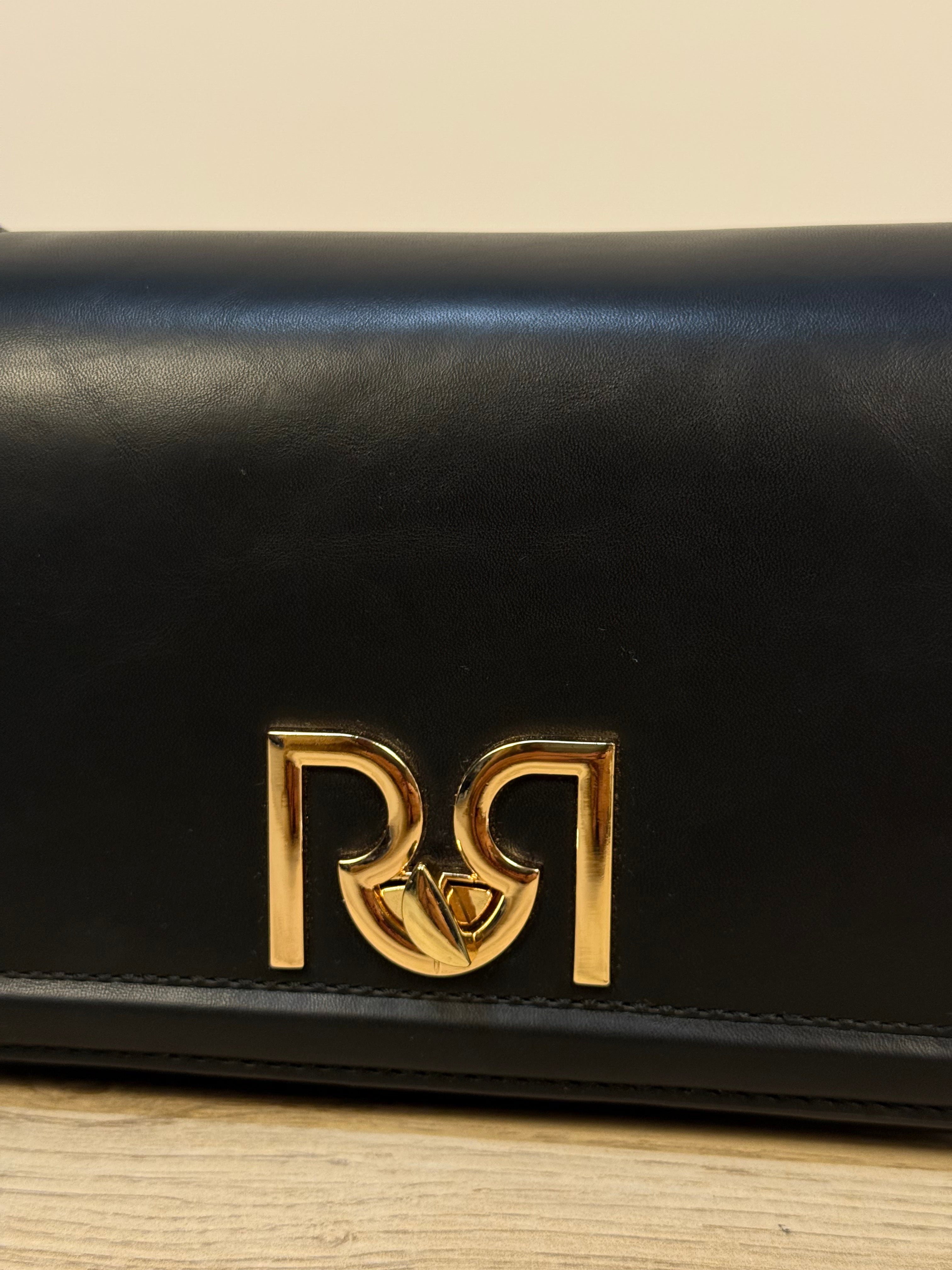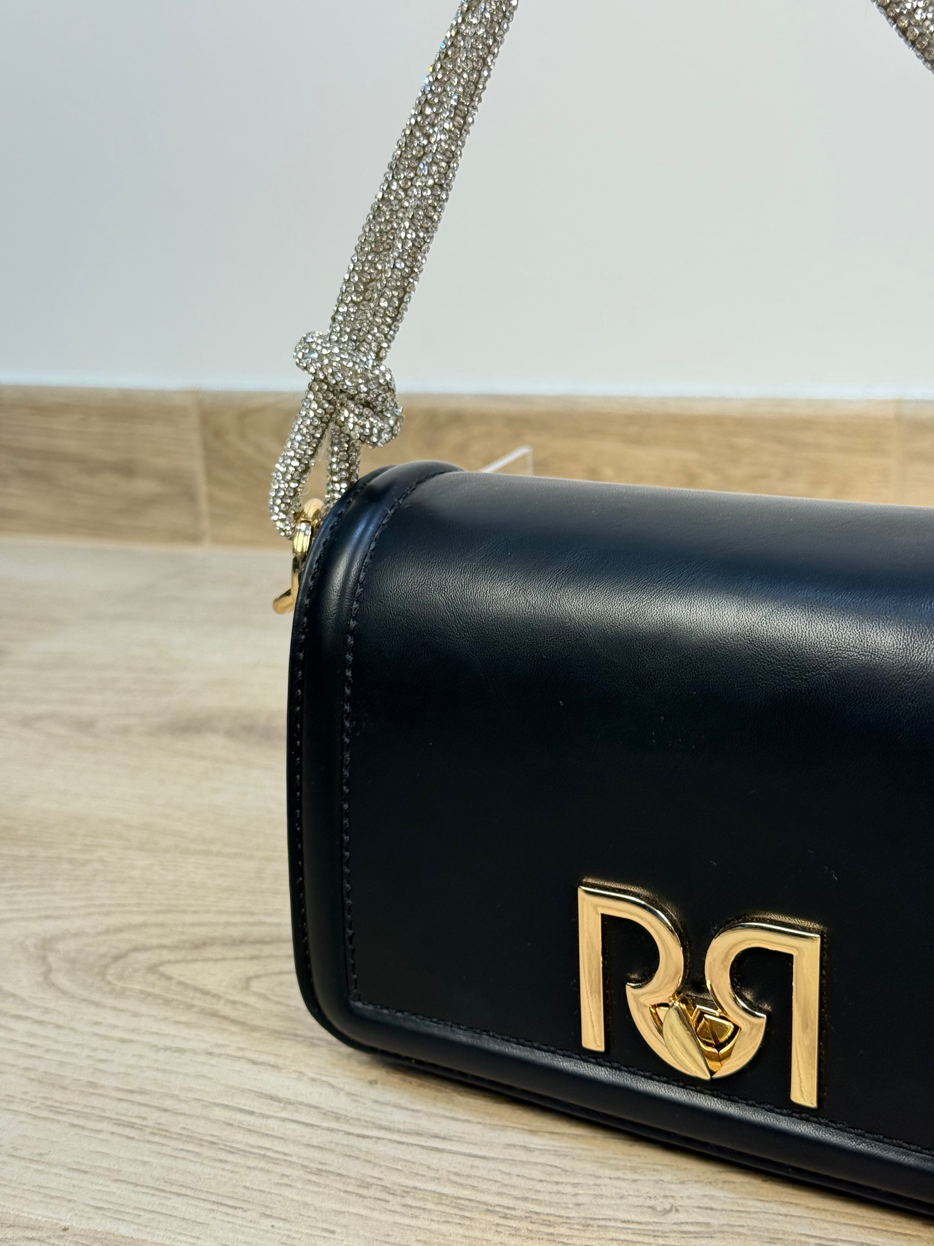 Compatta, luminosa e dal fascino sofisticato, questa borsa a mano Rinascimento con pattina rigida è la scelta perfetta per completare i look da sera o da occasione con un tocco glamour. Caratterizzata da una chiusura con bottone magnetico e impreziosita dal logo RR in metallo dorato applicato sul davanti. Il vero protagonista è il manico corto in tubolare metallico con strass all-over e nodo decorativo, che dona luce e personalità al design.