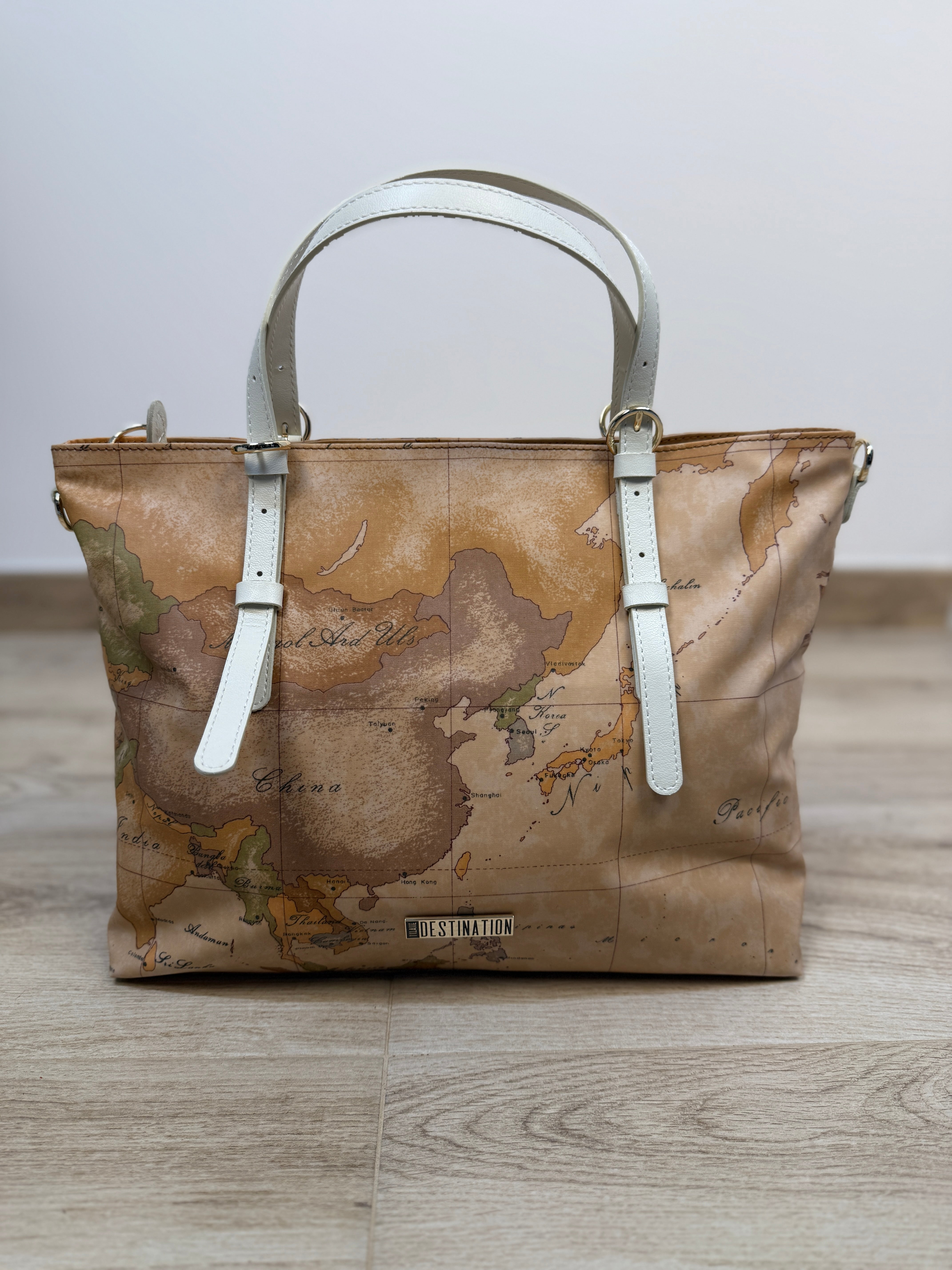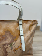 Borsa RINASCIMENTO shopper 1° classe destination in similpelle morbida in fantasia geografica, con tracolla removibile.