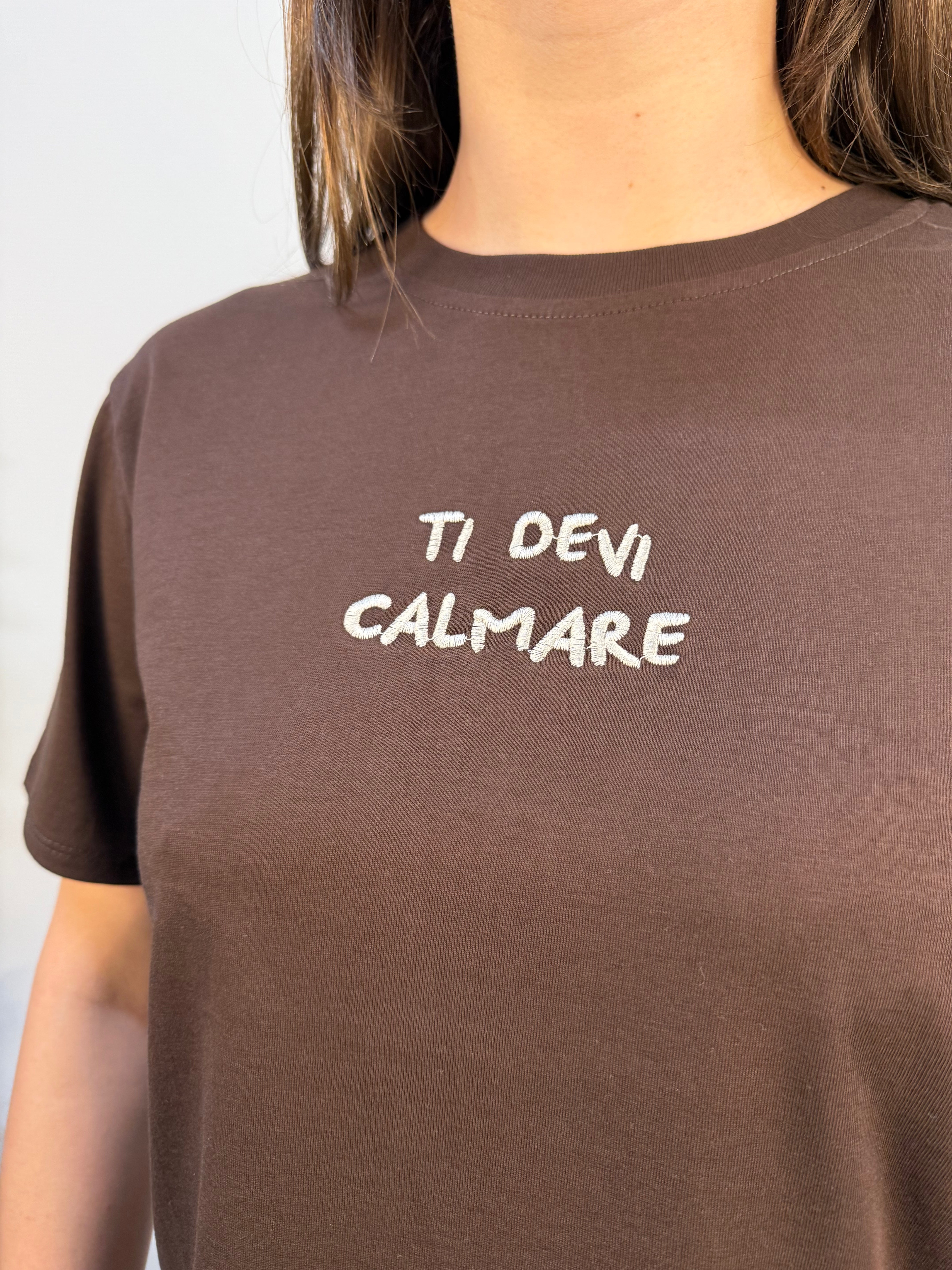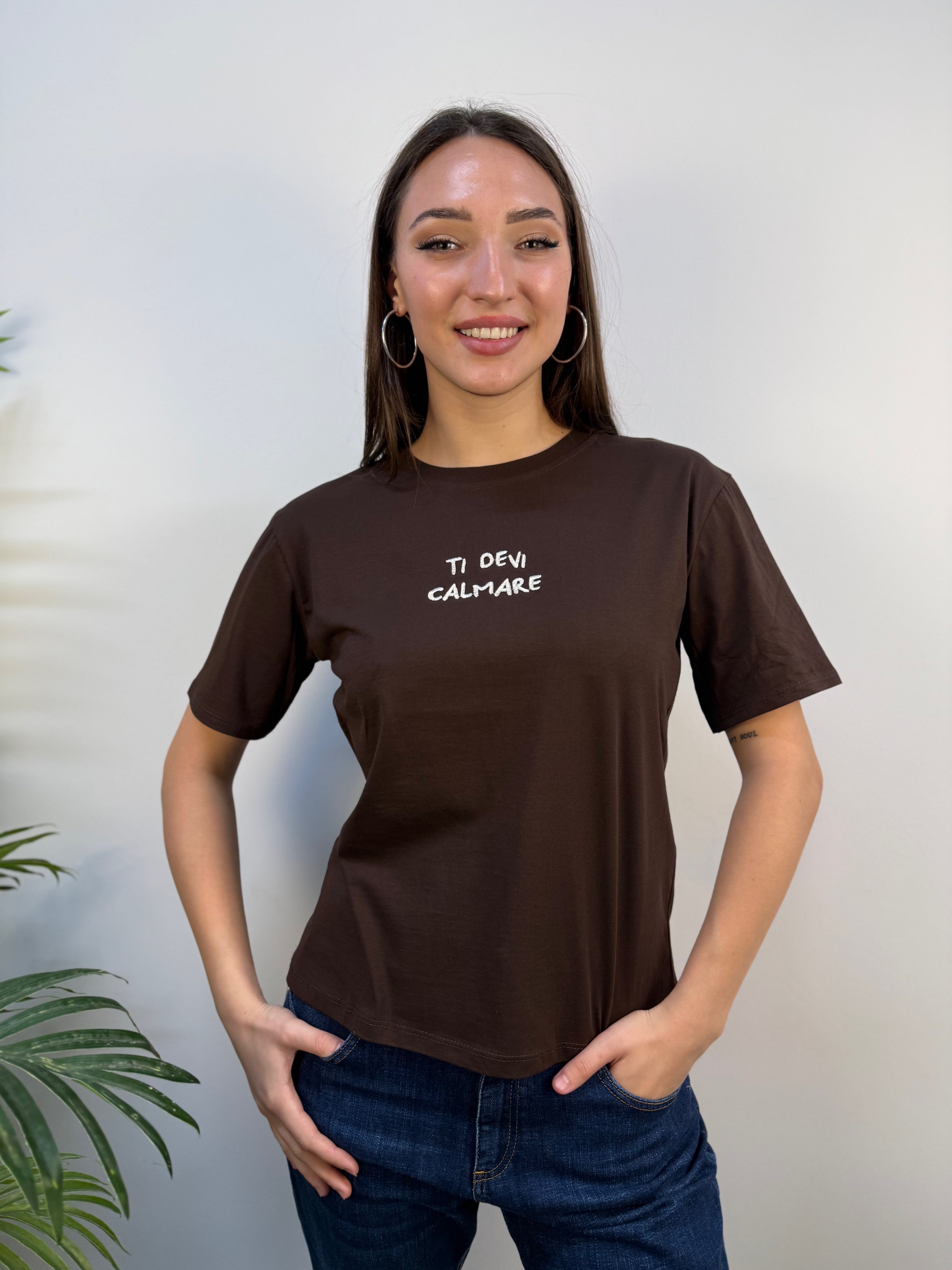 Minimalista ma d'effetto, questa t-shirt You Decide girocollo in cotone tinta unita color moro conquista con il suo messaggio ironico e deciso. Il ricamo bianco "ti devi calmare" sul petto aggiunge un tocco distintivo e contemporaneo a un capo essenziale, perfetto da indossare ogni giorno con personalità. Realizzata in morbido cotone, è comoda e traspirante, ideale da abbinare a jeans, gonne o pantaloni per un look casual ma curato.