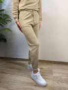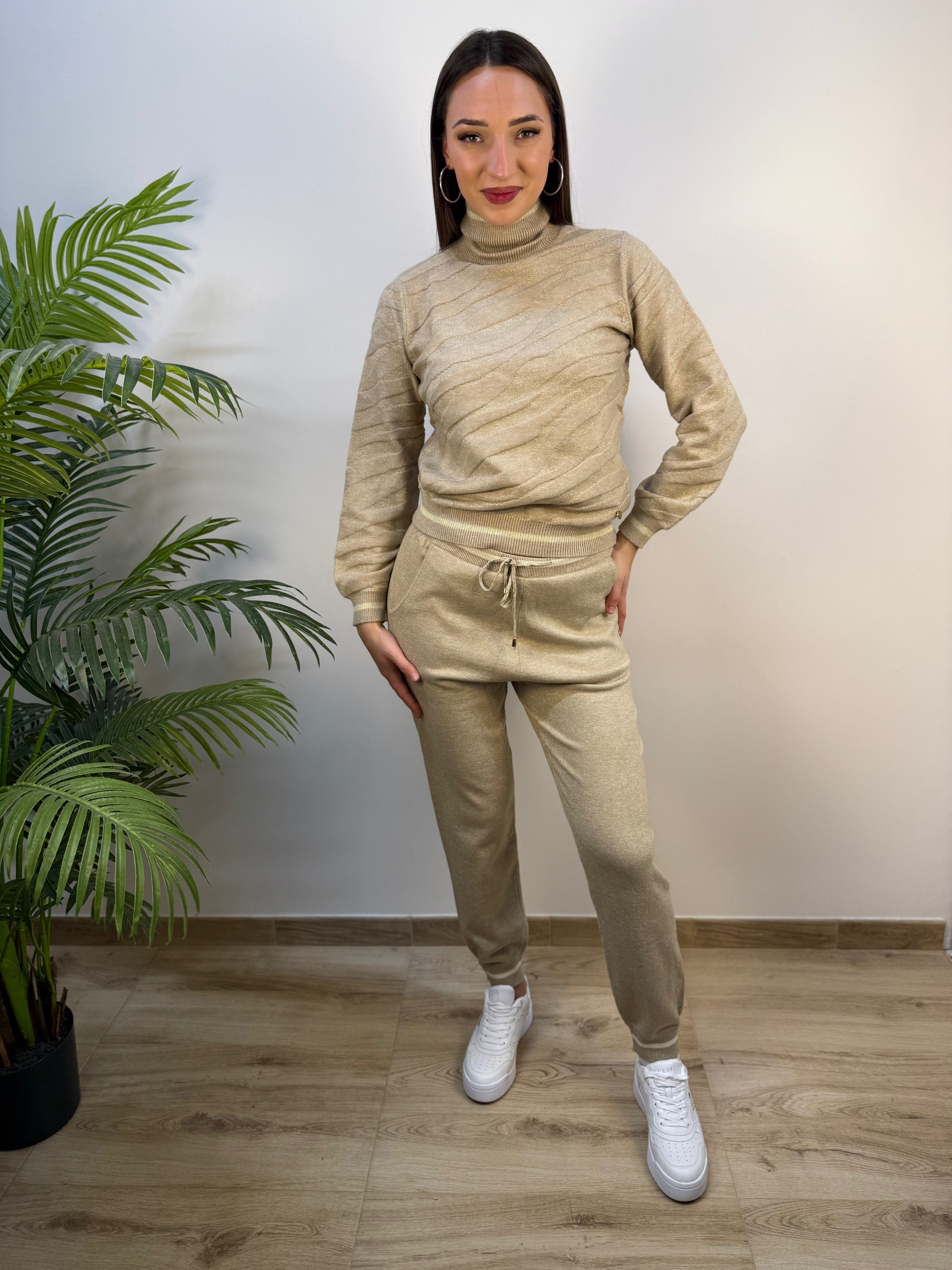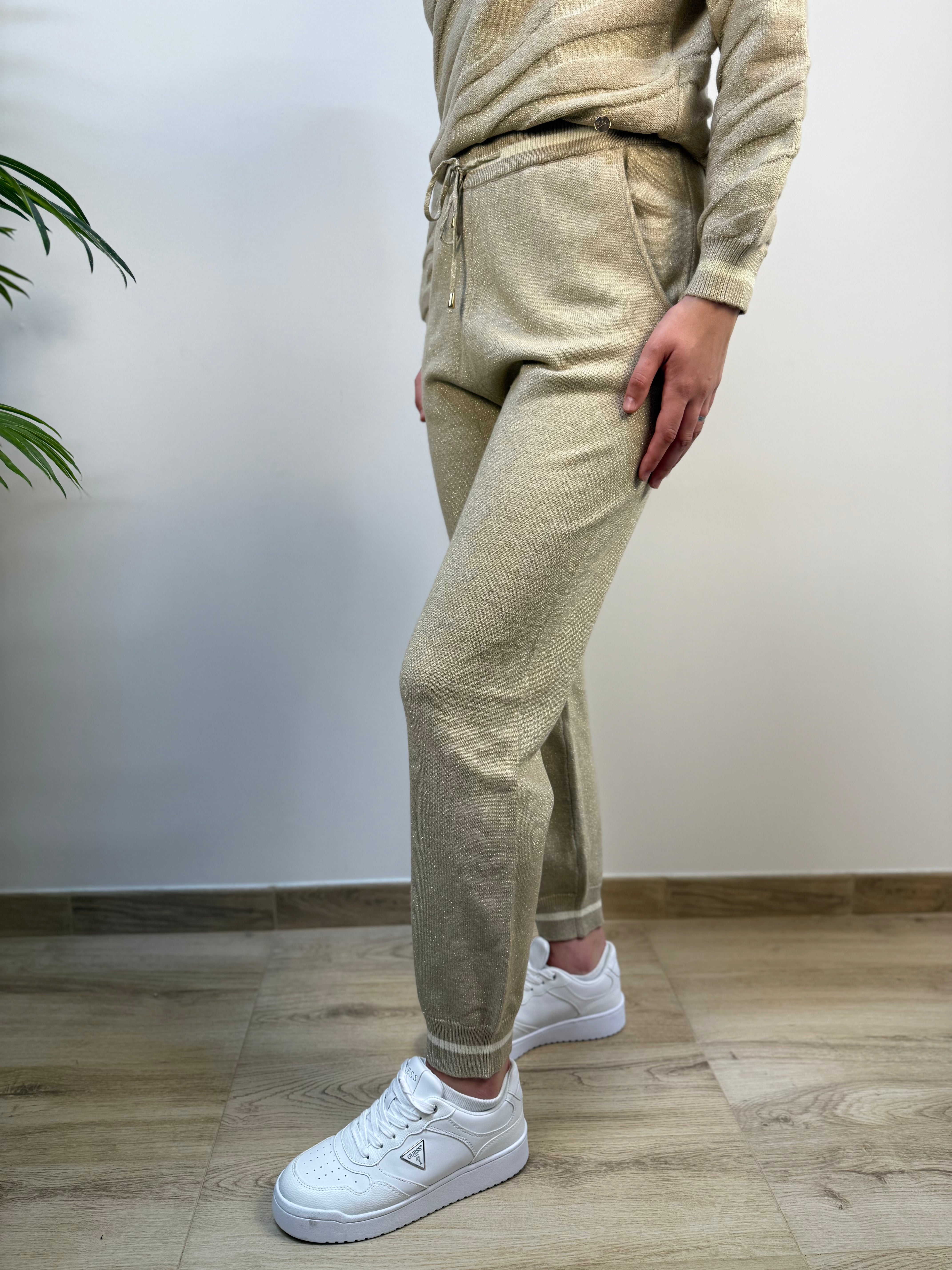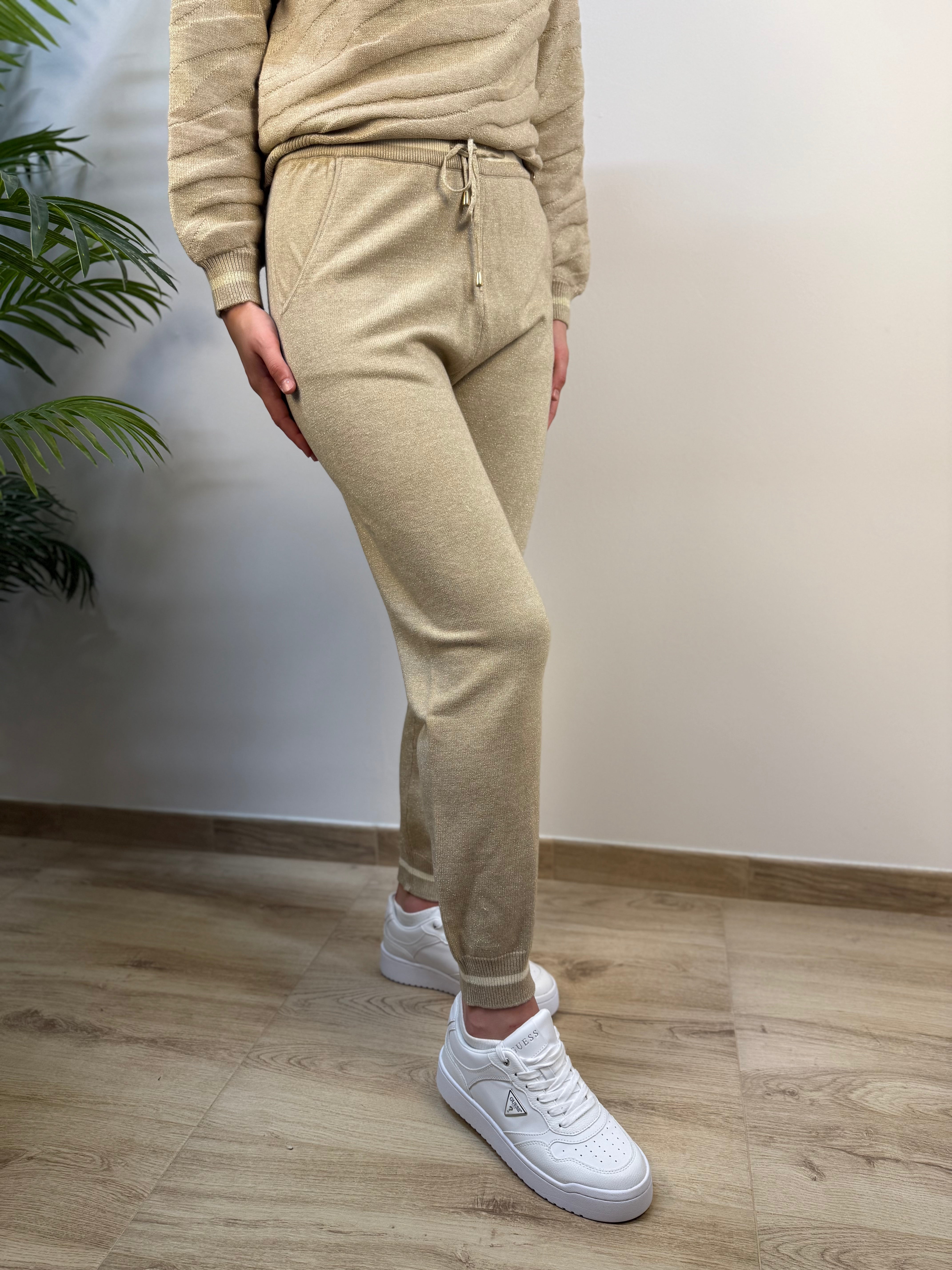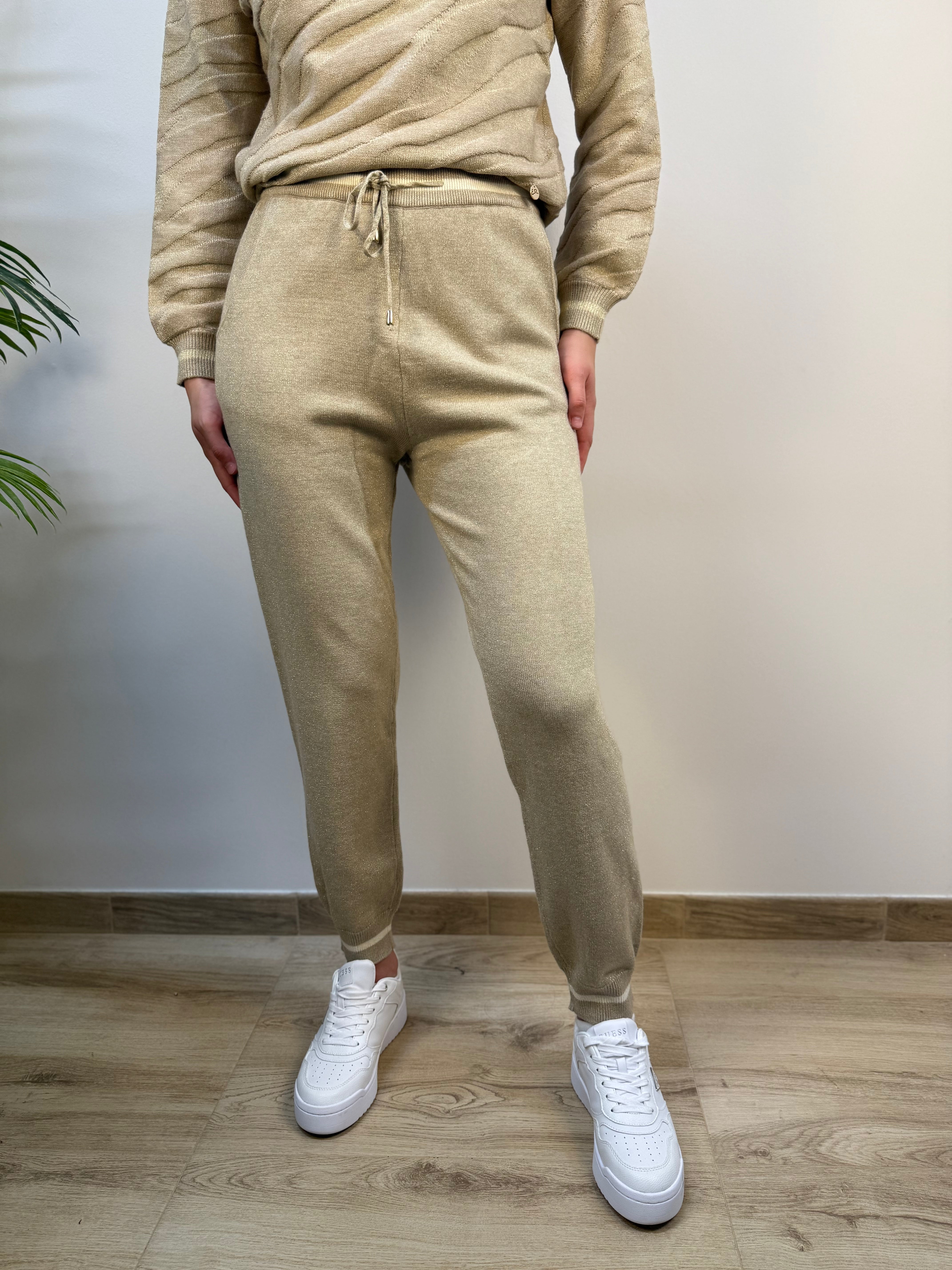 Pantaloni Yes-Zee in tessuto spazzolato caldo e morbido, realizzati in fantasia tigrata tono su tono in elegante colore oro, con filati lurex che donano un tocco di luce raffinata al capo. Il modello presenta una coulisse regolabile in vita con lacci in tessuto tono su tono, polsino a fine gamba per una vestibilità moderna e definita, e comode tasche laterali.