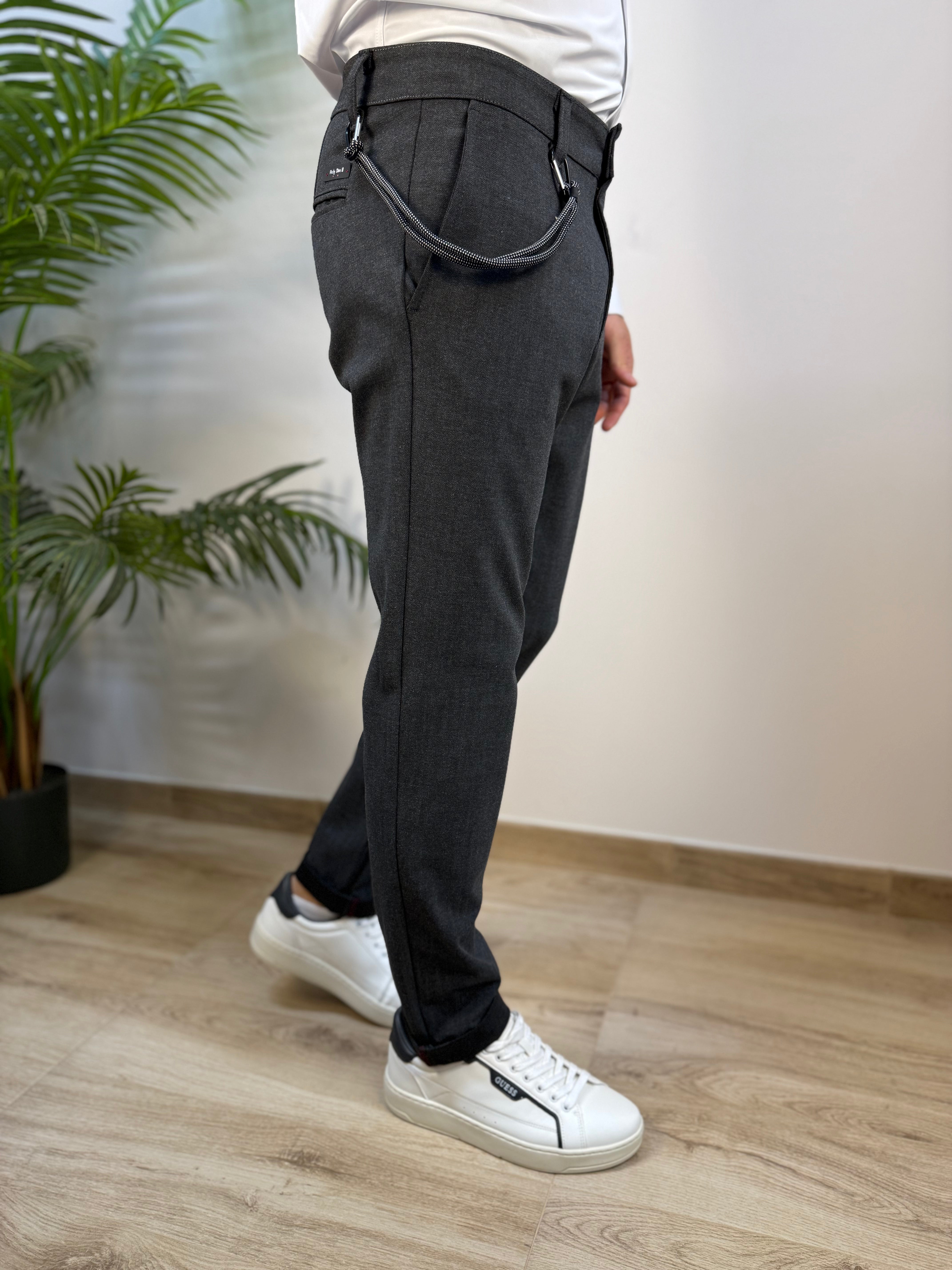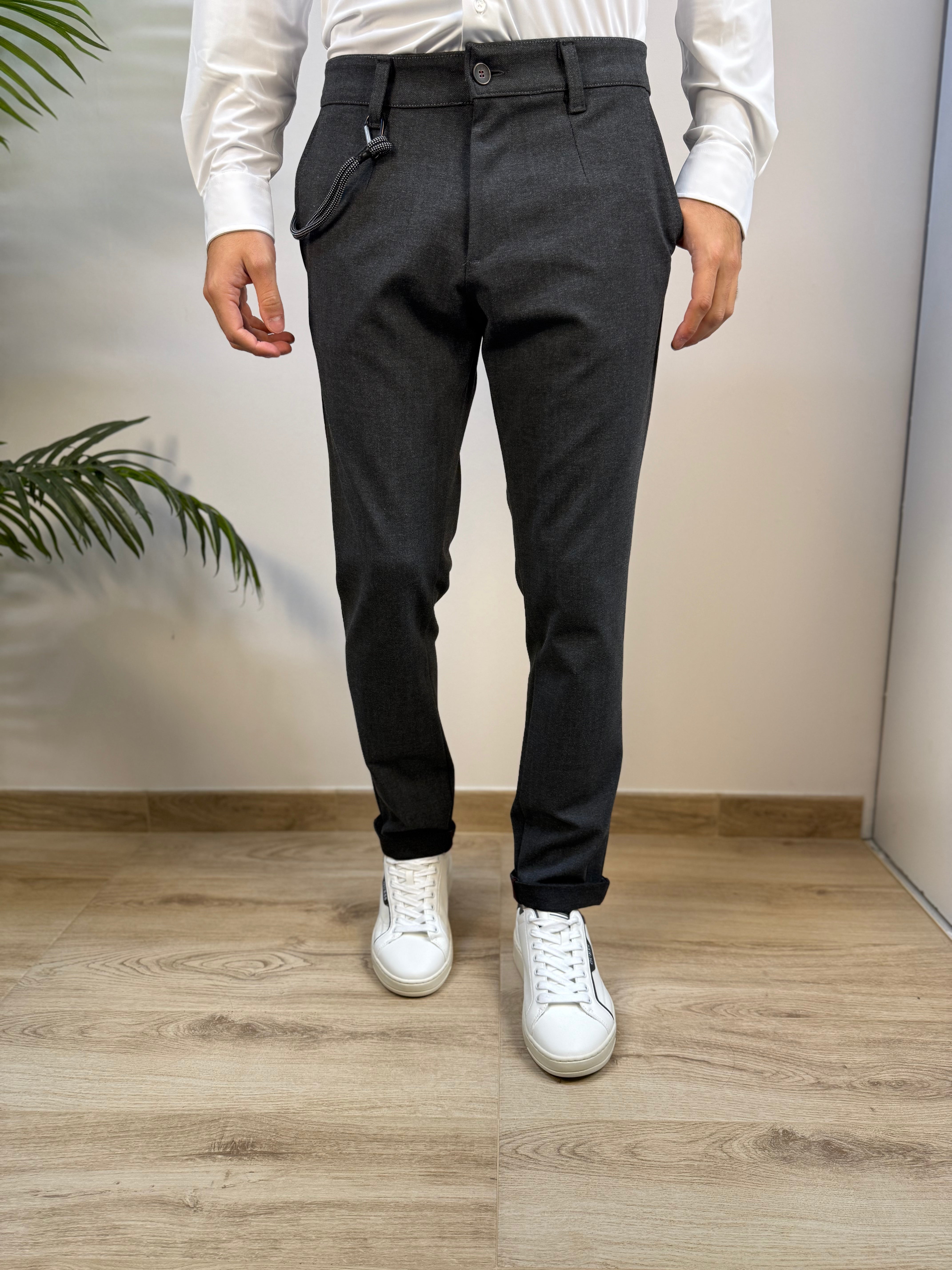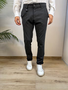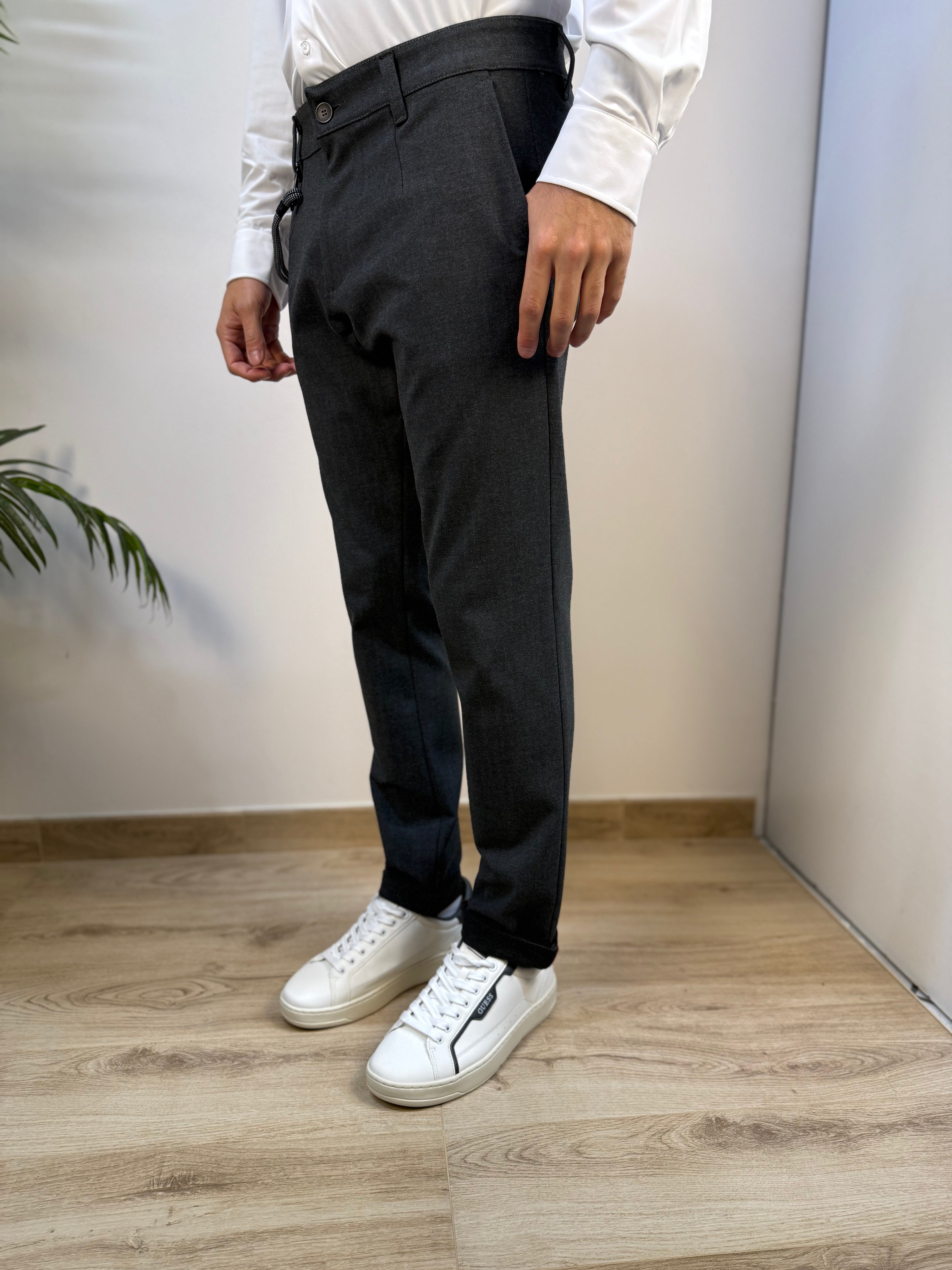 Pantalone Andy Don B dal taglio chino slim fit, realizzato in tessuto microtramato tono su tono per un effetto raffinato e discreto. Dotato di chiusura a bottone e zip, unisce linea slanciata e comfort, perfetto per look eleganti e contemporanei.