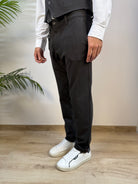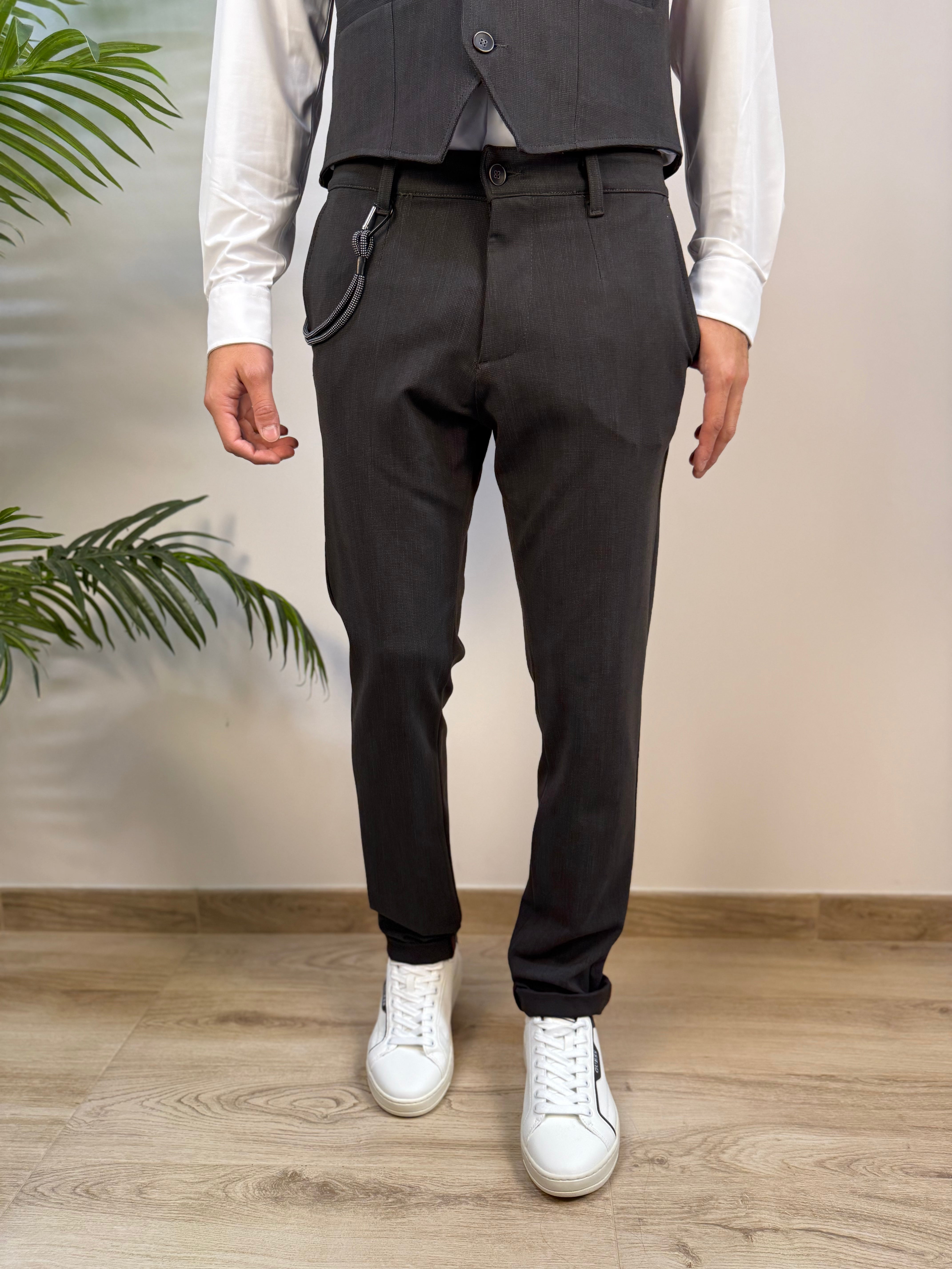 Pantalone Andy Don B dal taglio chino slim fit, realizzato in tessuto microtramato tono su tono per un effetto raffinato e discreto. Dotato di chiusura a bottone e zip, unisce linea slanciata e comfort, perfetto per look eleganti e contemporanei.