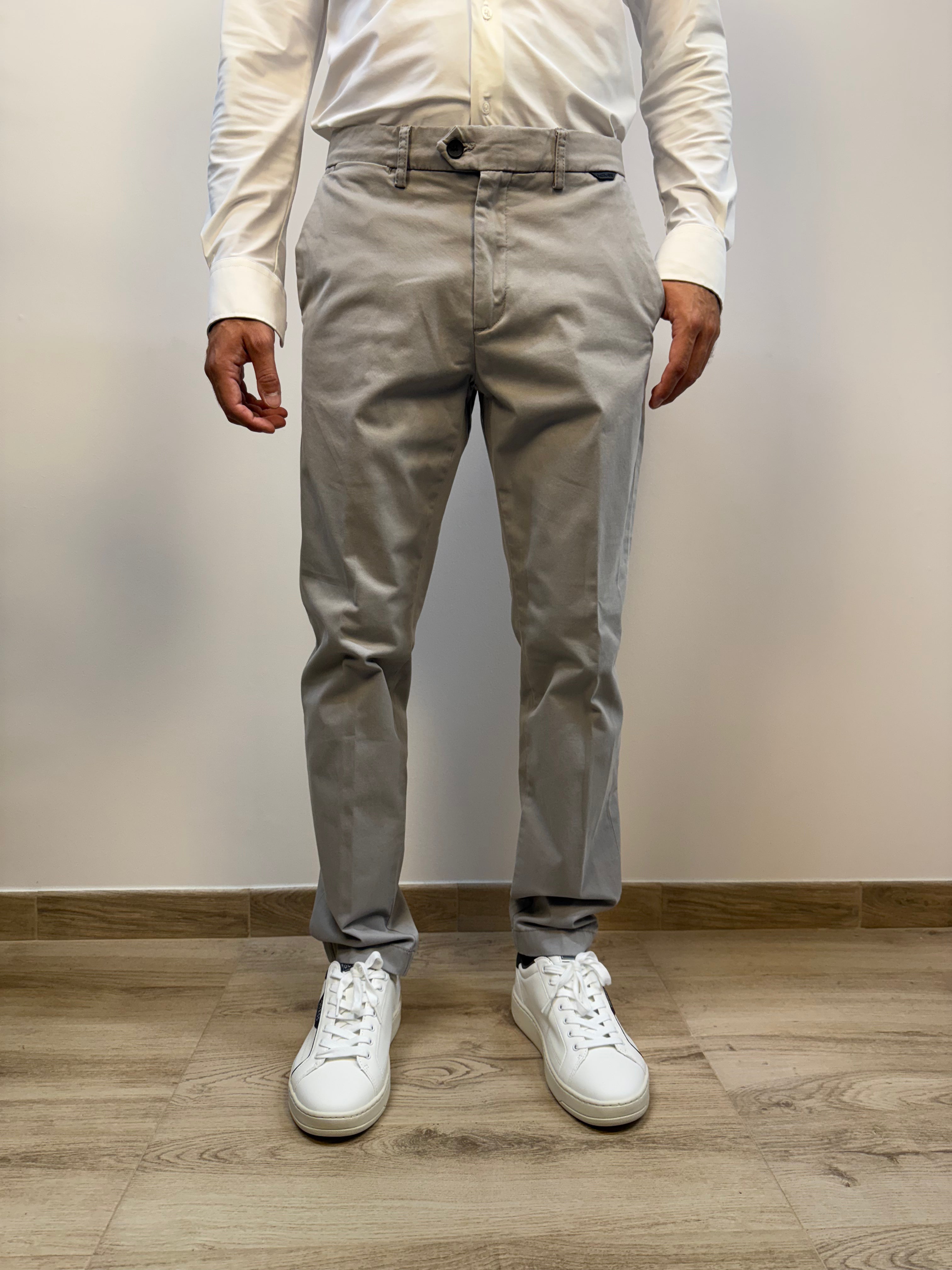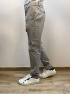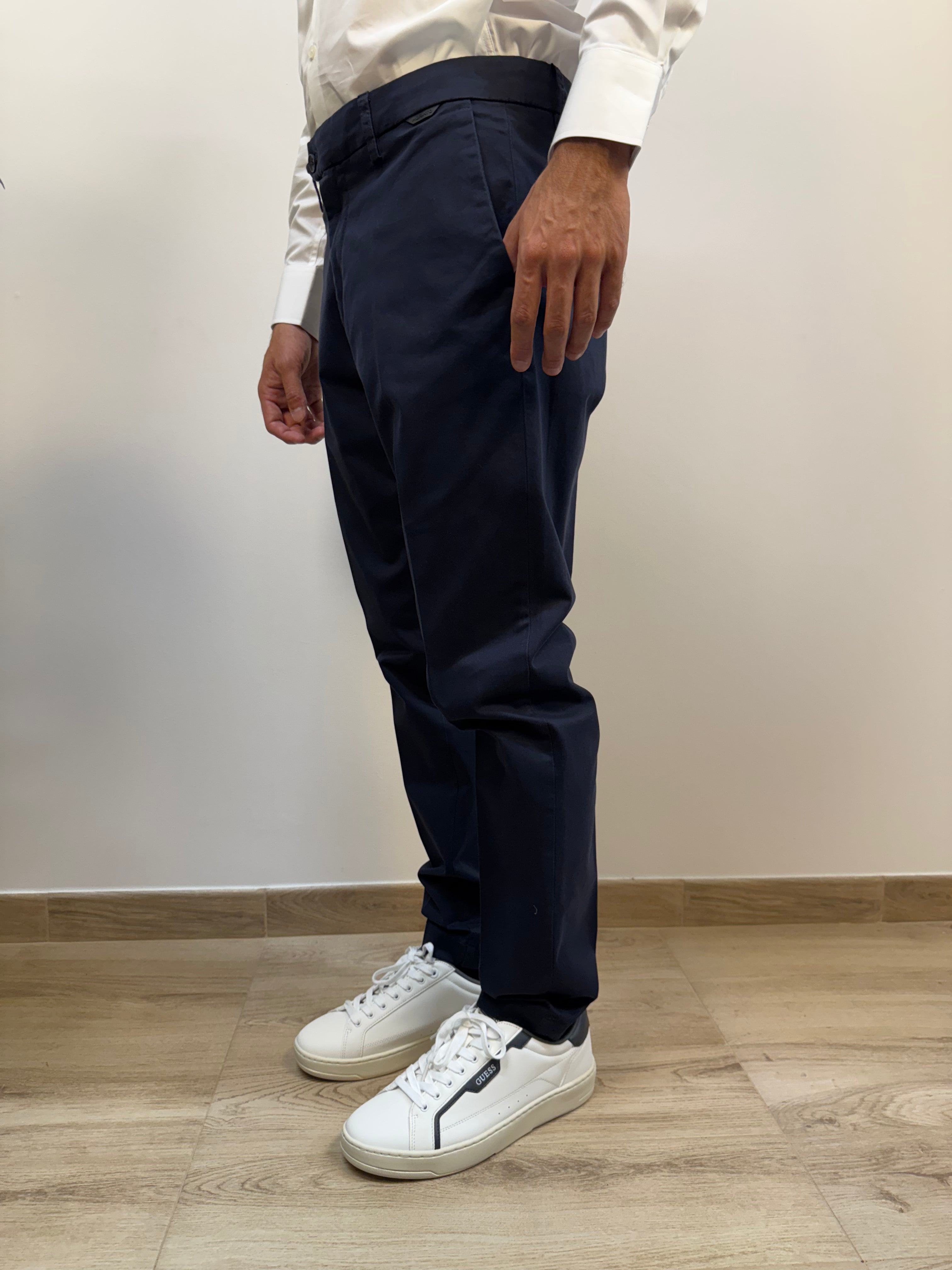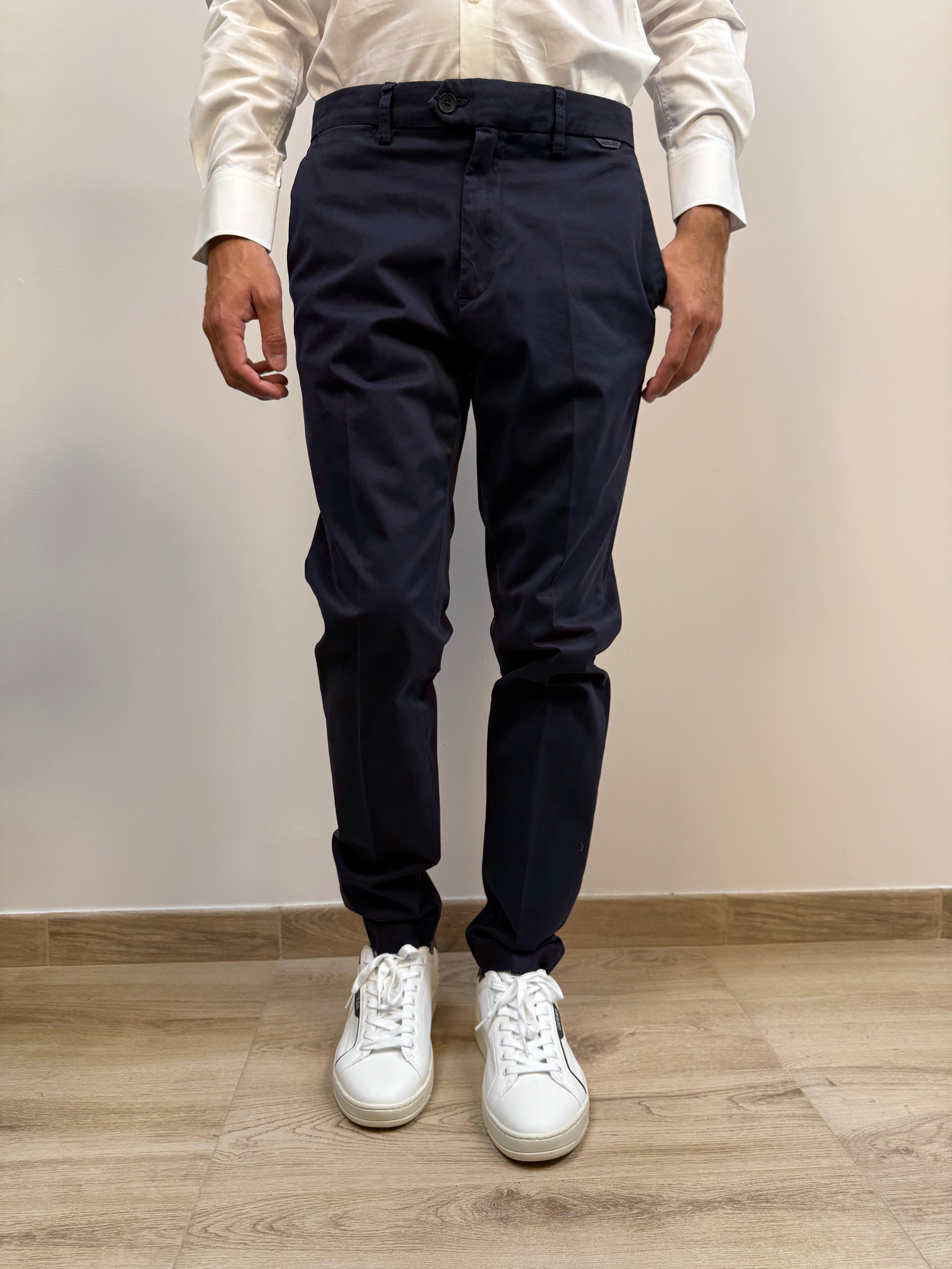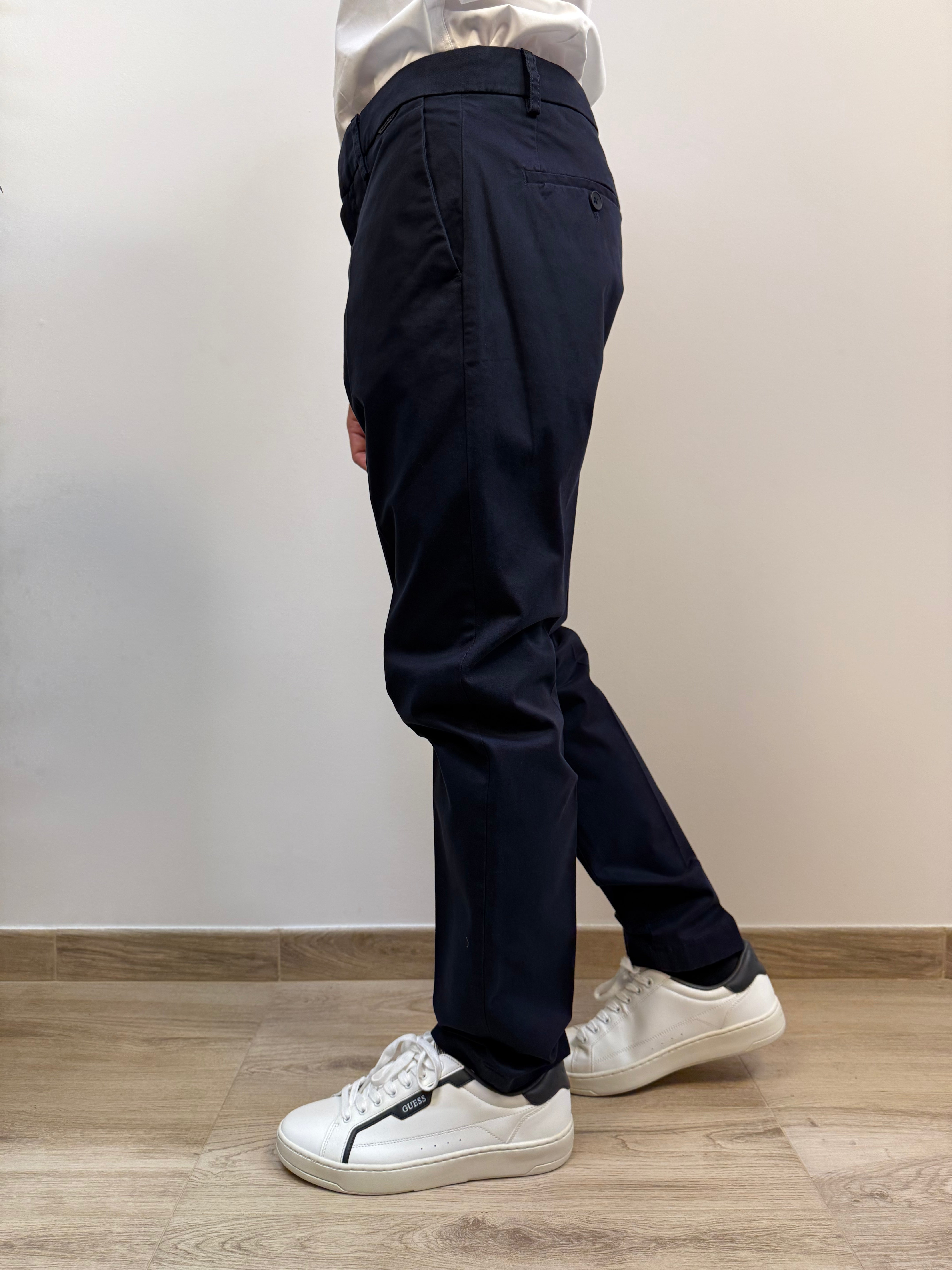 Pantalone Antony Morato modello slim Mark, dal taglio pulito e contemporaneo, proposto nelle varianti navy o grigio. Presenta due tasche chinos a filo e una chiusura con doppio bottone e cerniera. Due tasche posteriori con chiusura a bottone aggiungono praticità al design. Completa il capo un discreto dettaglio gommato posizionato sotto al passante posteriore, per un tocco distintivo ed essenziale. Perfetto per look versatili, dal casual al formale.