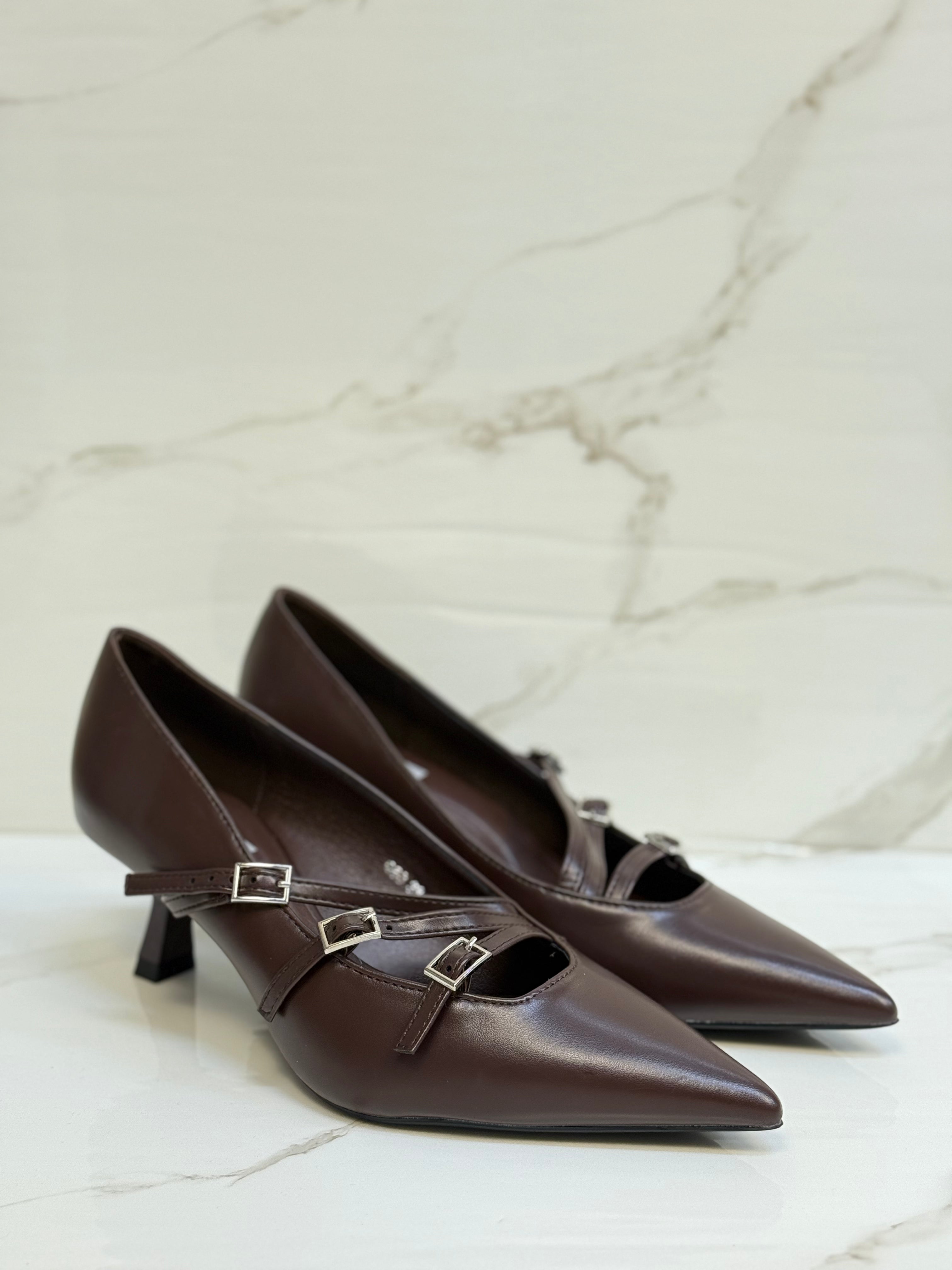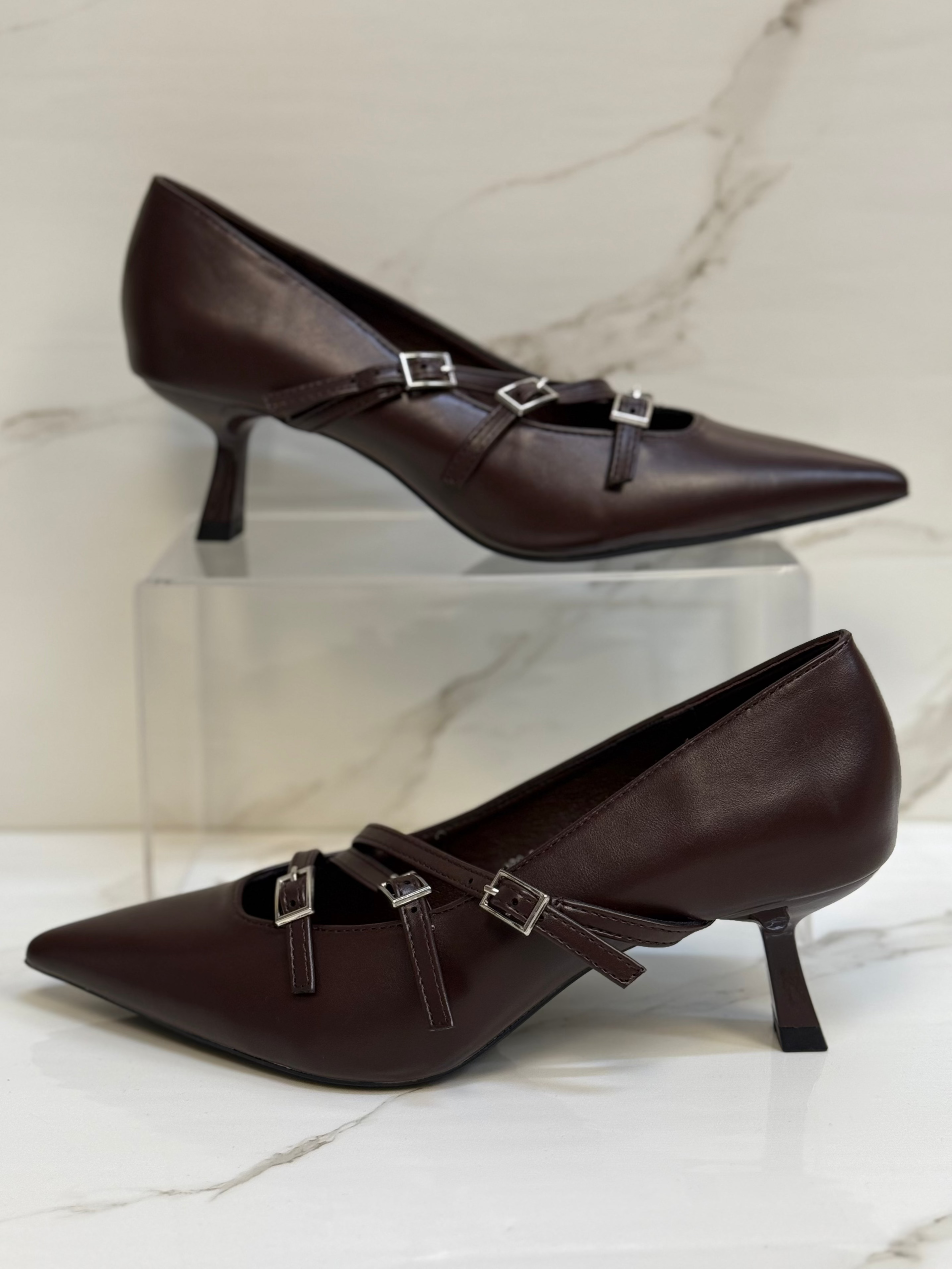 Un'eleganza dal carattere deciso: questo décolleté in similpelle color bordeaux scuro coniuga stile rétro e modernità. Il tacco a zampa di elefante da 6 cm dona stabilità e un tocco vintage, perfetto per slanciare la figura con comfort. Sul collo del piede, tre fibbie regolabili in finitura argento aggiungono un dettaglio grintoso e ricercato, rendendo la calzatura non solo un accessorio, ma una vera protagonista del look. Ideale per chi cerca un’eleganza sofisticata ma fuori dagli schemi.