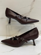 Décolleté in similpelle bordeaux scuro con tacco a zampa e dettagli a fibbia