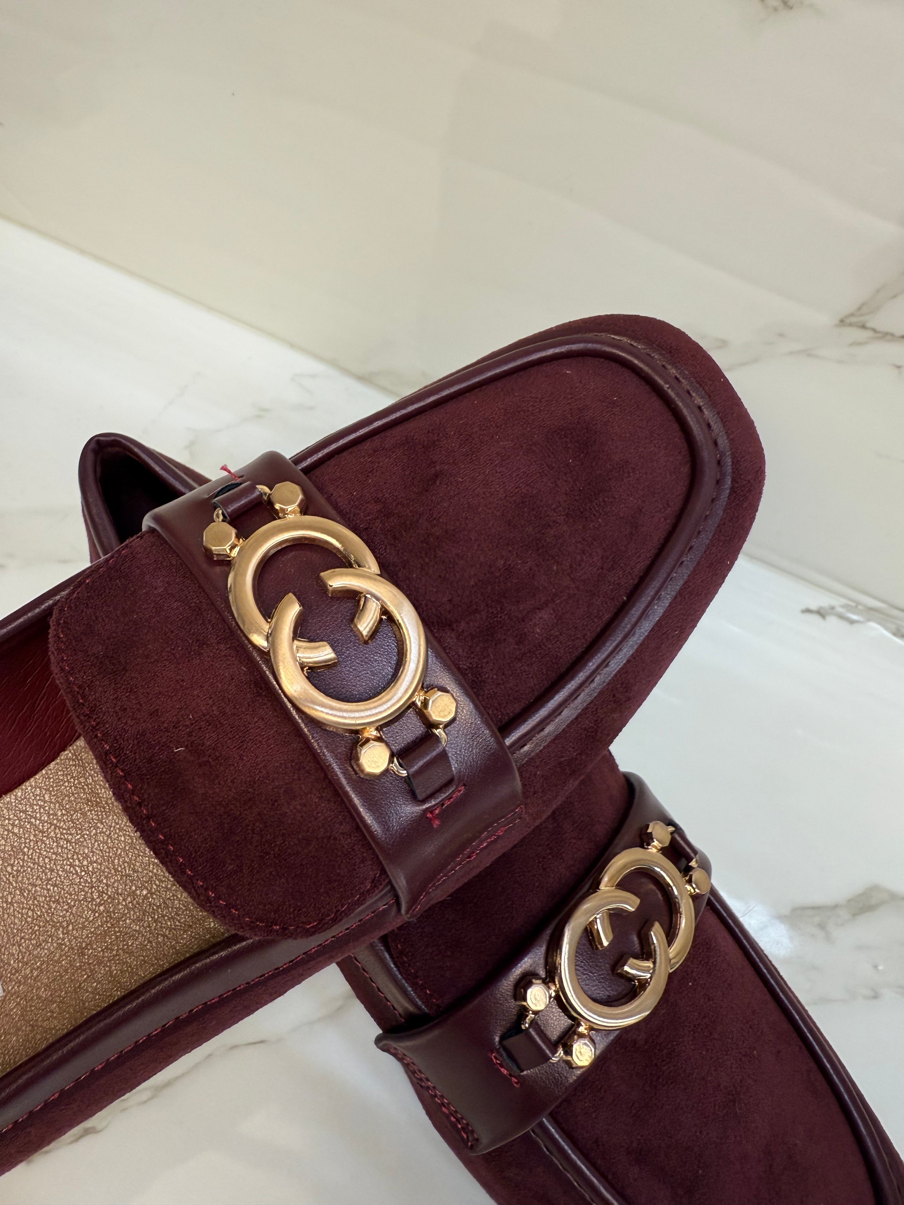 Mocassino in camoscio bordeaux con dettaglio metallico oro