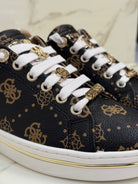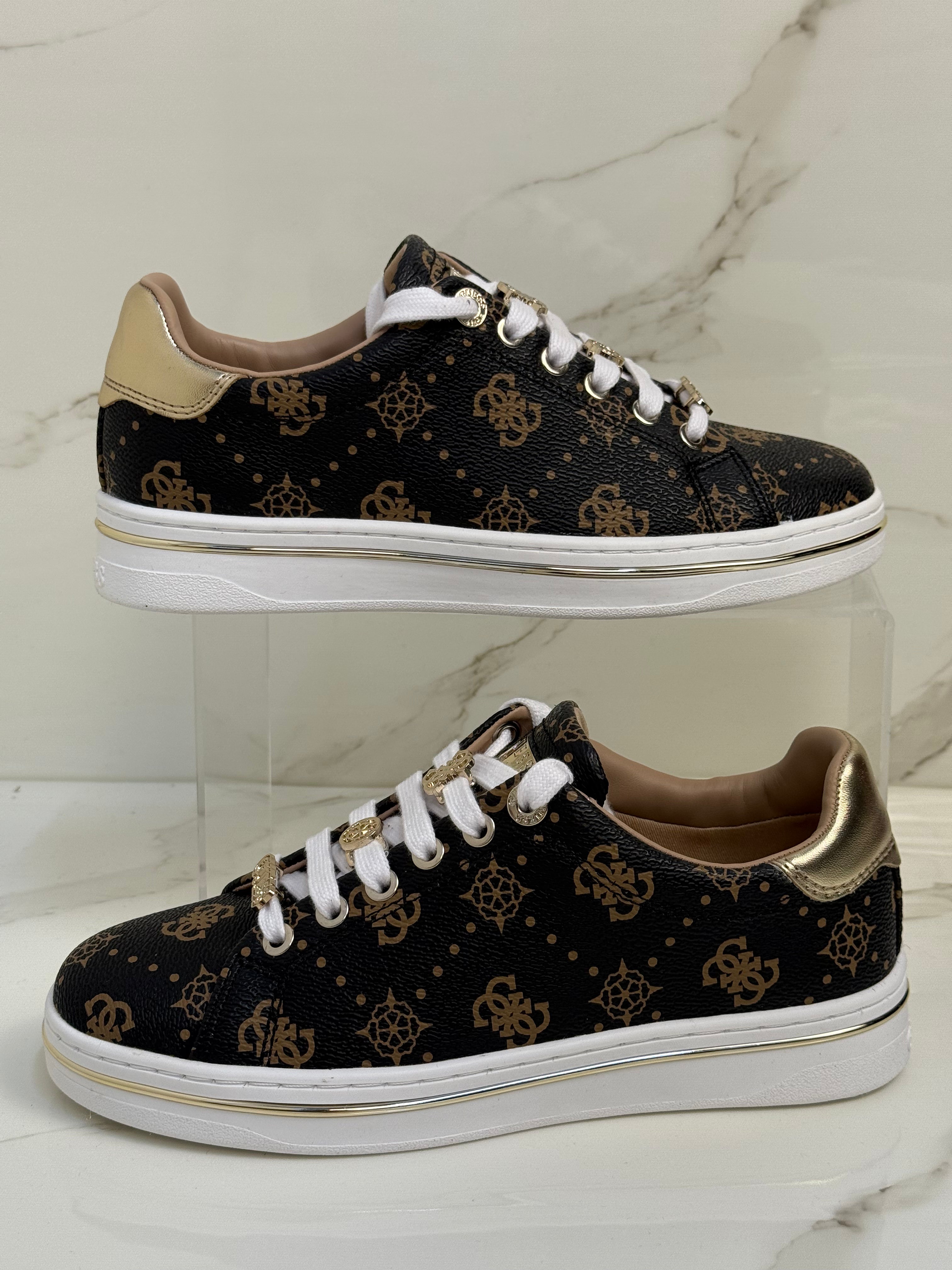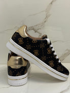 Questa sneakers Guess bassa combina stile iconico e raffinatezza moderna. La tomaia in 100% poliuretano è interamente ricoperta dalla celebre trama logata 4G nei toni caldi del marrone, per un look distintivo e riconoscibile. La suola in gomma è impreziosita da un elegante inserto metallico oro che avvolge il profilo e richiama il retro della scarpa in finitura oro lucido. I charm dorati applicati sui lacci e la targhetta metallica logata sulla linguetta completano il design con un tocco gioiello, perfetto per chi cerca una sneaker d’impatto senza rinunciare all’eleganza.