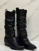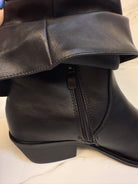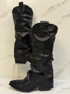 Uno stivale alto che reinterpreta lo stile camperos in chiave più casual e moderna. Realizzato in similpelle nera liscia, presenta un tacco a rocchetto da 5 cm che unisce comodità e stile quotidiano. La zip nascosta facilita l’indossatura, rendendo questo modello pratico e versatile. Perfetto per completare look informali con un tocco di carattere senza rinunciare alla semplicità.