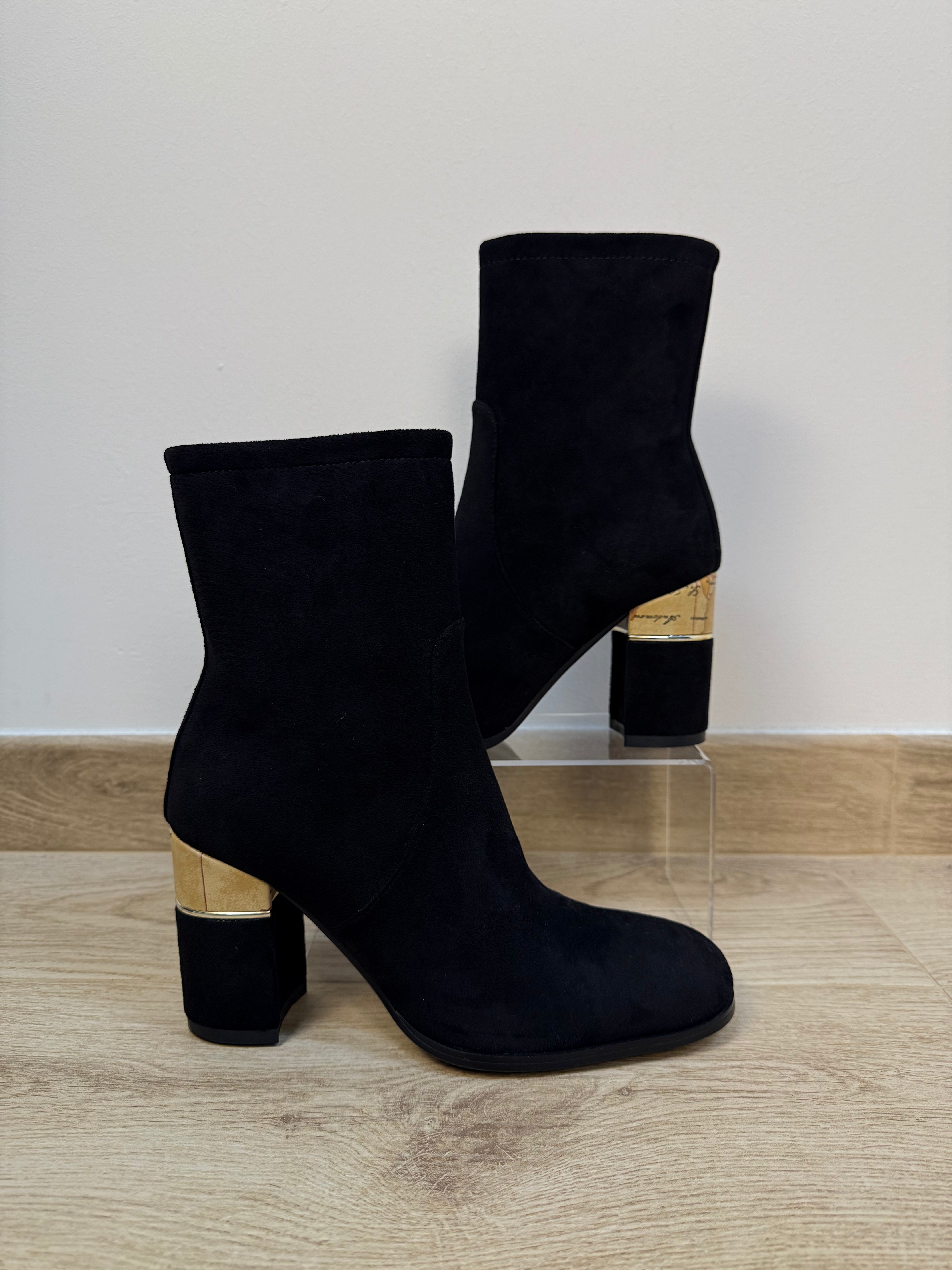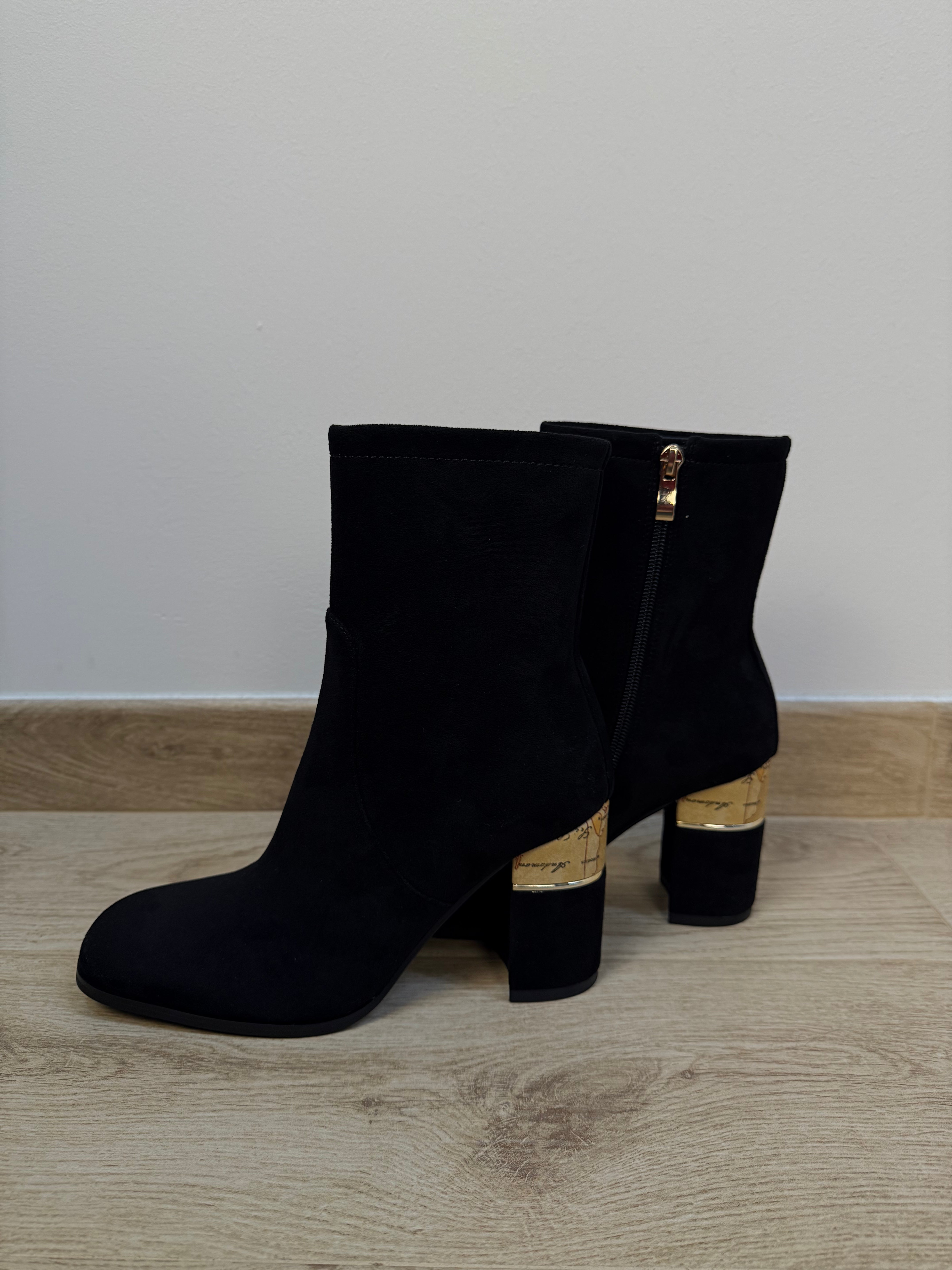 Stivaletto elegante firmato Alviero Martini, realizzato in morbido camoscio nero. Il design essenziale e raffinato è valorizzato dal tacco a trapezio di 8 cm, comodo e stabile, che slancia la silhouette con eleganza. Il dettaglio Geo sul tacco, iconico simbolo della Maison, aggiunge un tocco distintivo e contemporaneo, rendendo il modello riconoscibile e sofisticato. La zip interna assicura una calzata pratica e confortevole, mentre la tinta unita nera ne esalta la versatilità, perfetta per completare con stile sia look quotidiani che più ricercati. Un accessorio raffinato e senza tempo, che racchiude tutta l’eleganza e la personalità dello stile 1ª Classe.