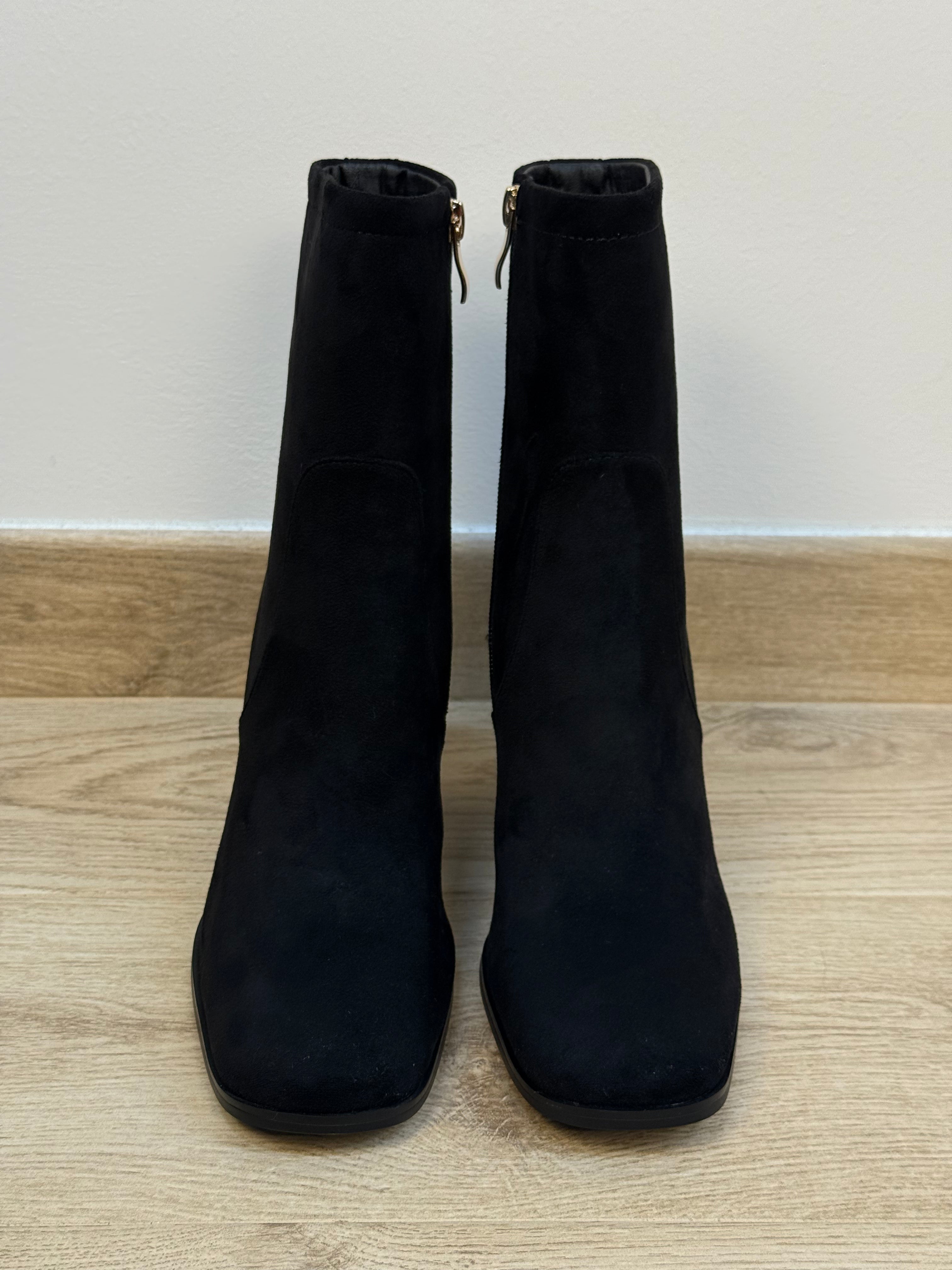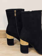 Stivaletto in camoscio nero con tacco trapezio e dettaglio geo