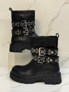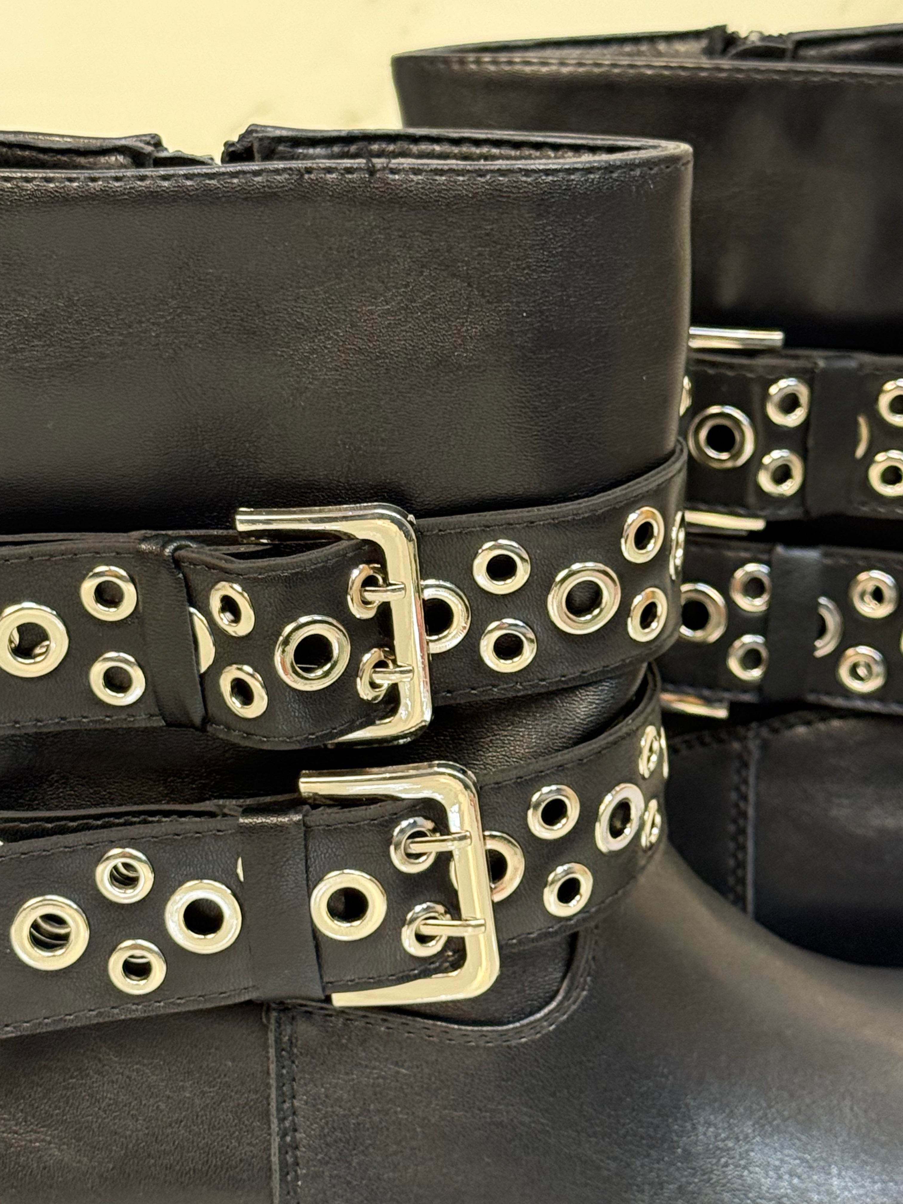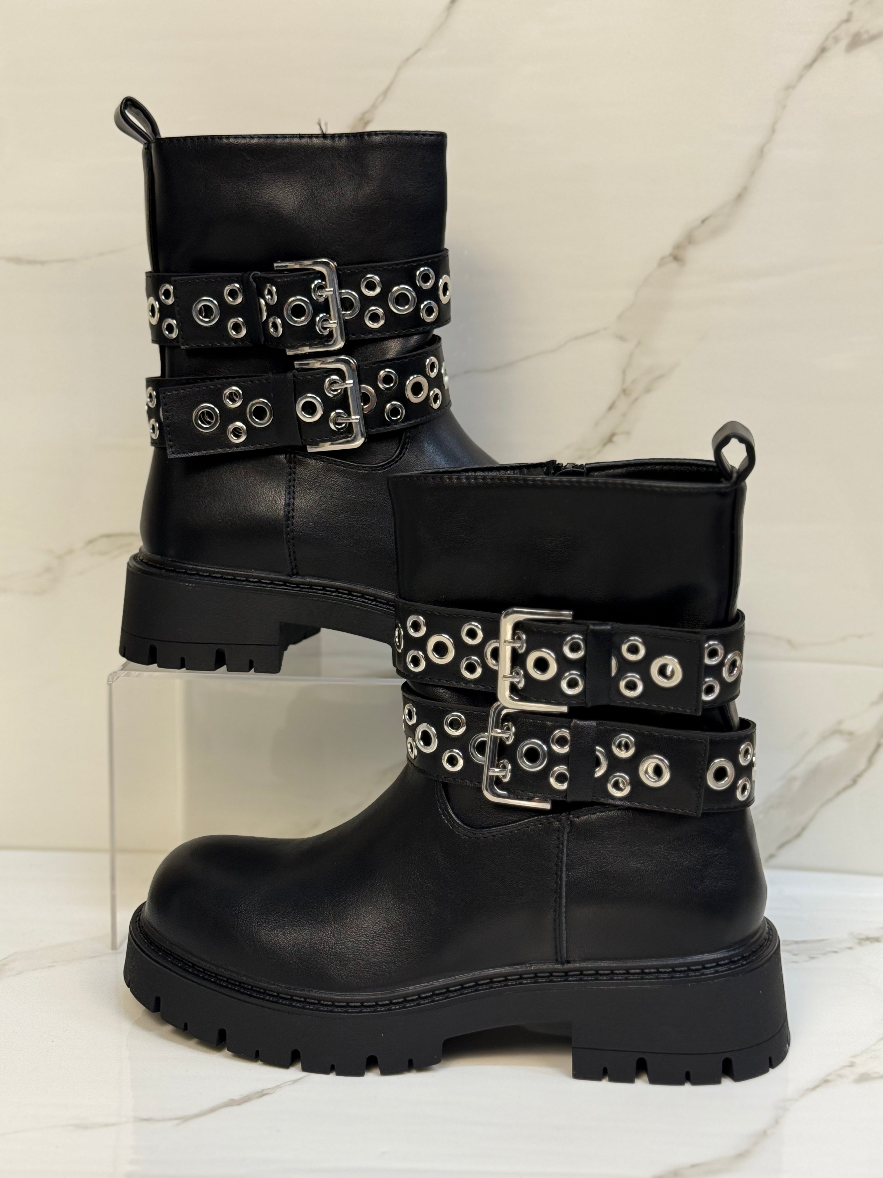 Grintoso e confortevole, questo anfibio in similpelle nera è imbottito internamente per offrire calore e protezione nelle giornate più fredde. La suola carrarmato da 4 cm garantisce stabilità e comodità durante la camminata, senza rinunciare allo stile. Le fibbie decorative con dettagli in argento aggiungono un tocco rock, mentre la zip interna rende l’indossatura pratica e veloce. Perfetto per affrontare la stagione con carattere e funzionalità.