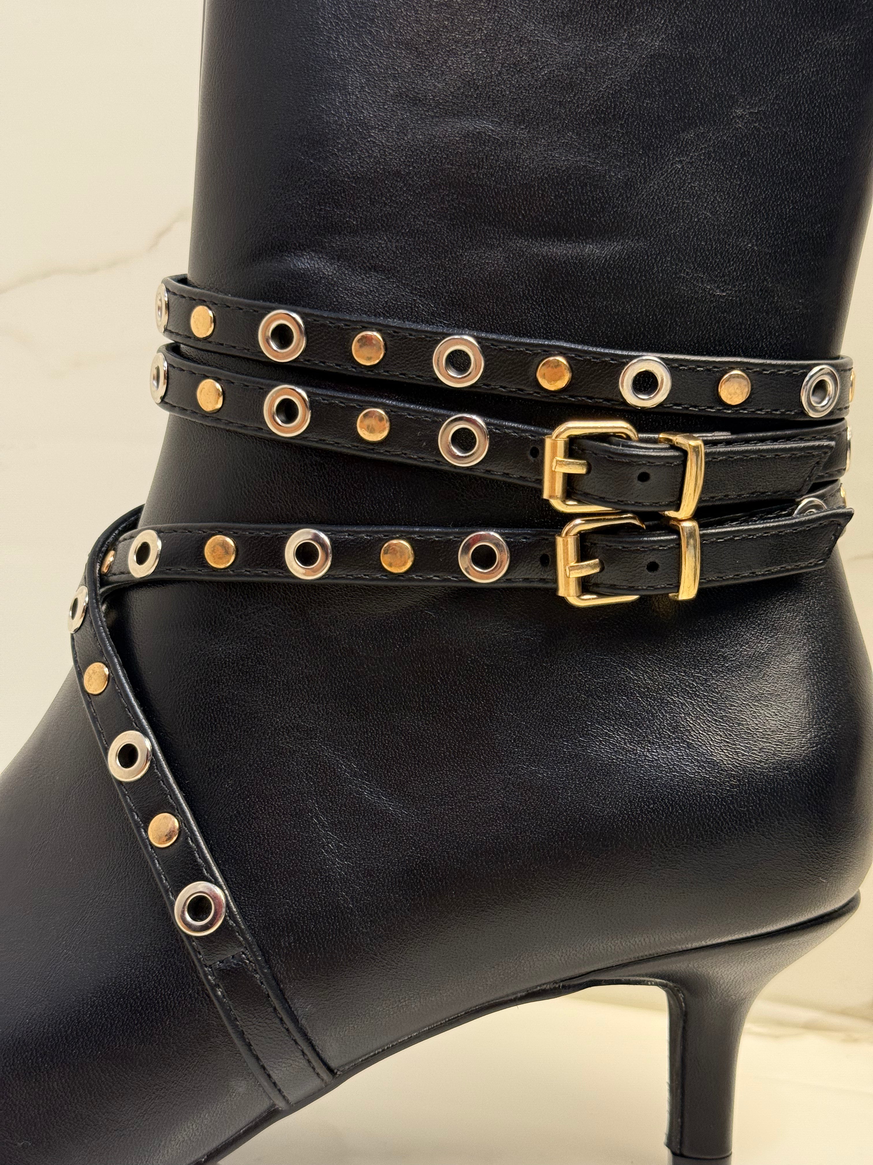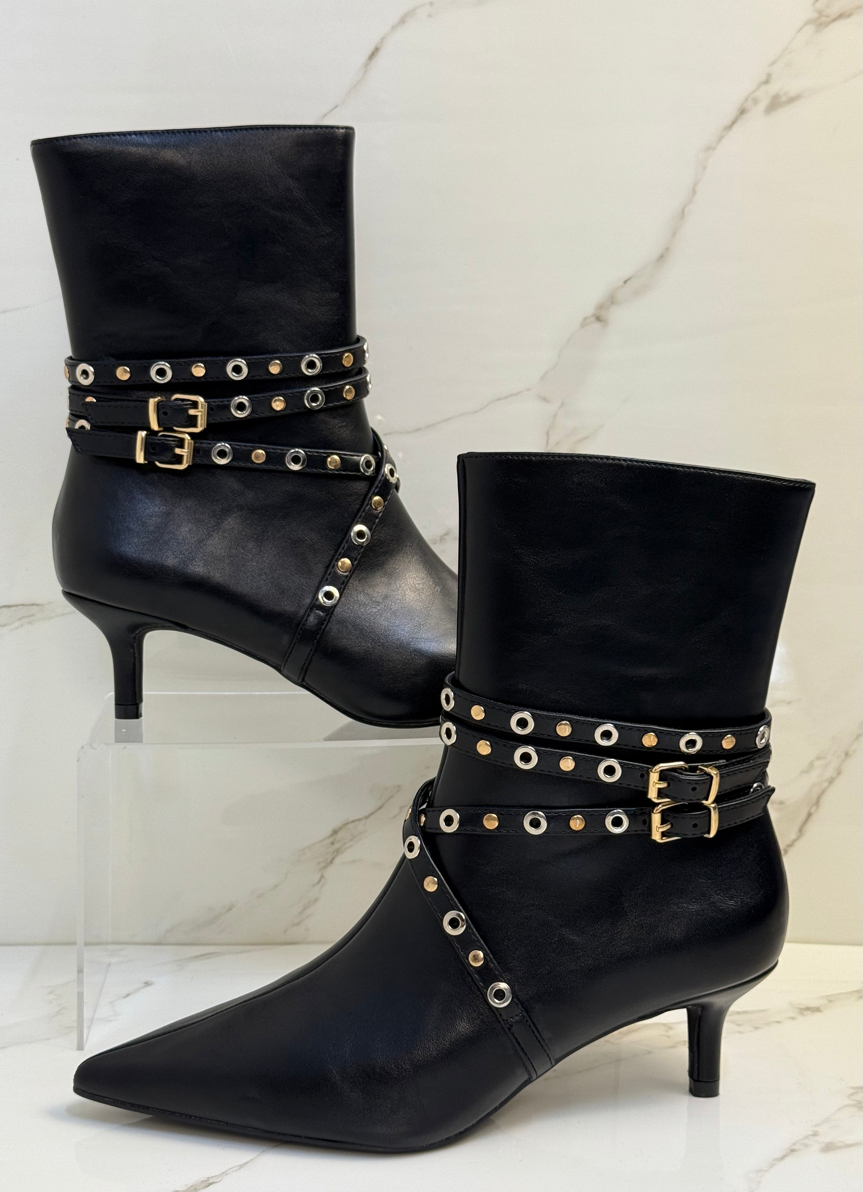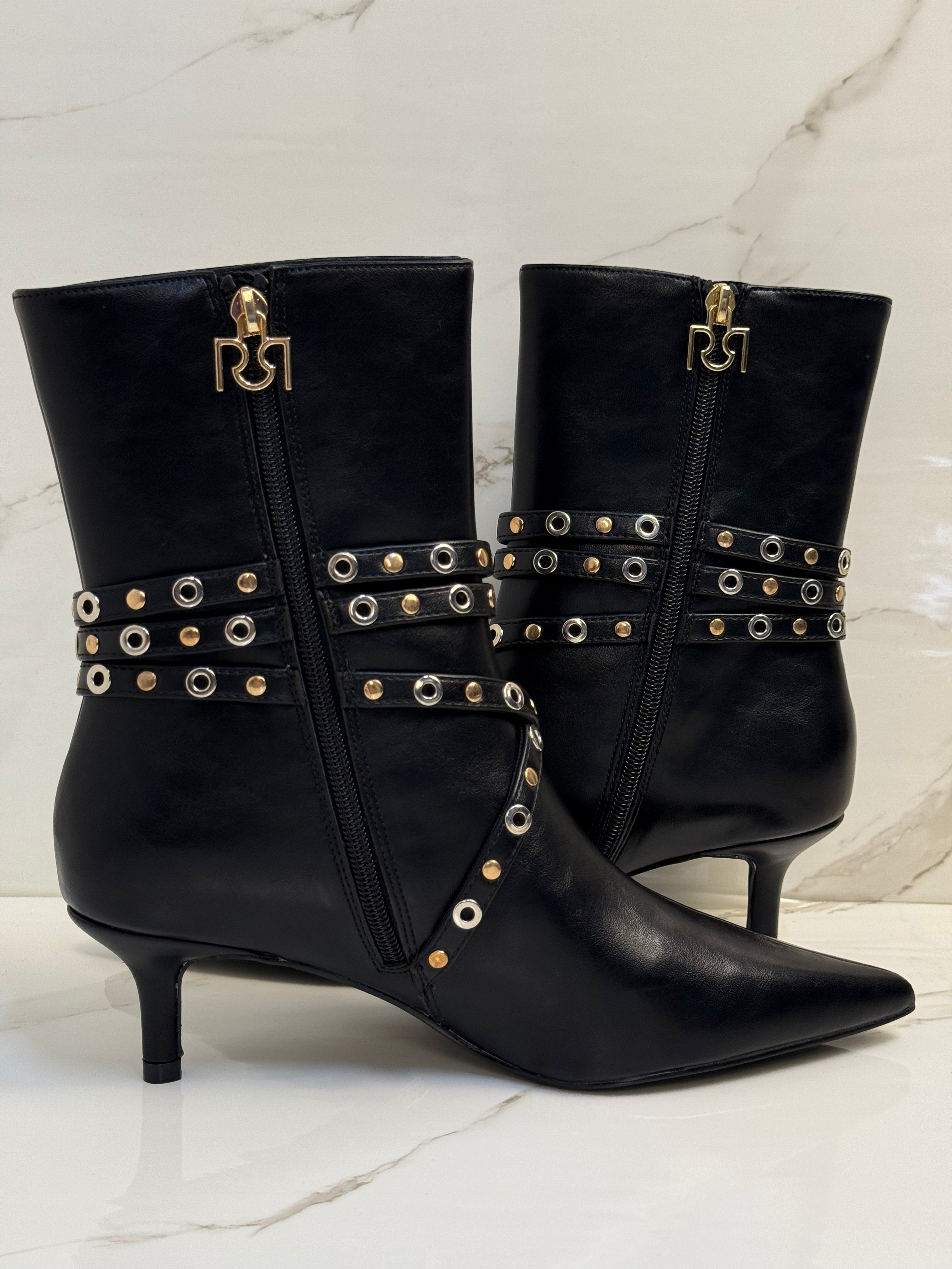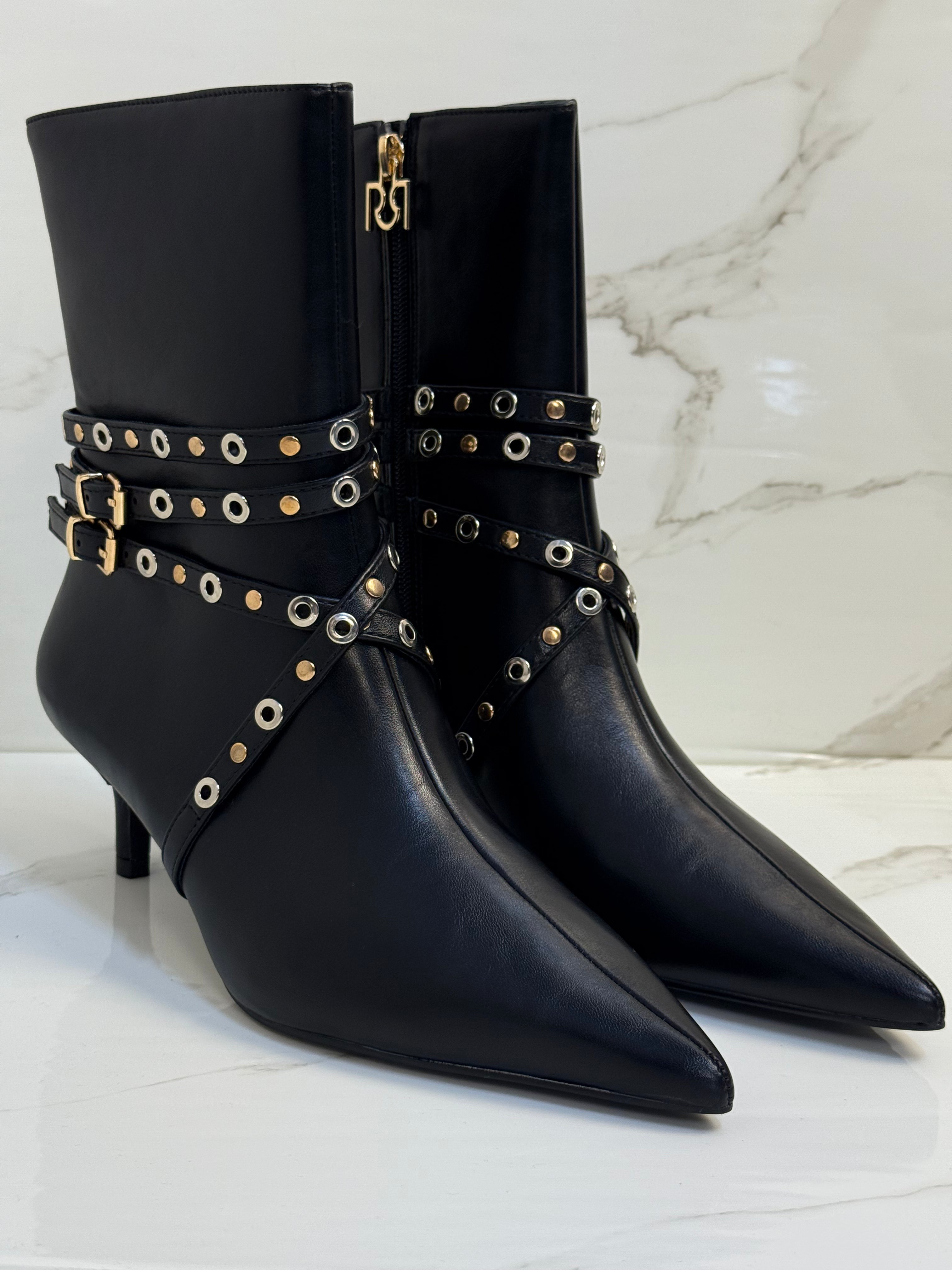 Stivaletto alla caviglia Rinascimento in similpelle nera con punta affusolata e tacco sottile da 7 cm, pensato per un look deciso ma femminile. Il design è arricchito da cinturini decorativi impreziositi da borchie metalliche oro e argento, completati da fibbie dorate che donano carattere e luminosità. Facile da calzare grazie alla zip interna con cursore logato in metallo dorato. Un modello versatile e ricco di dettagli, perfetto per dare un tocco grintoso ai tuoi outfit.