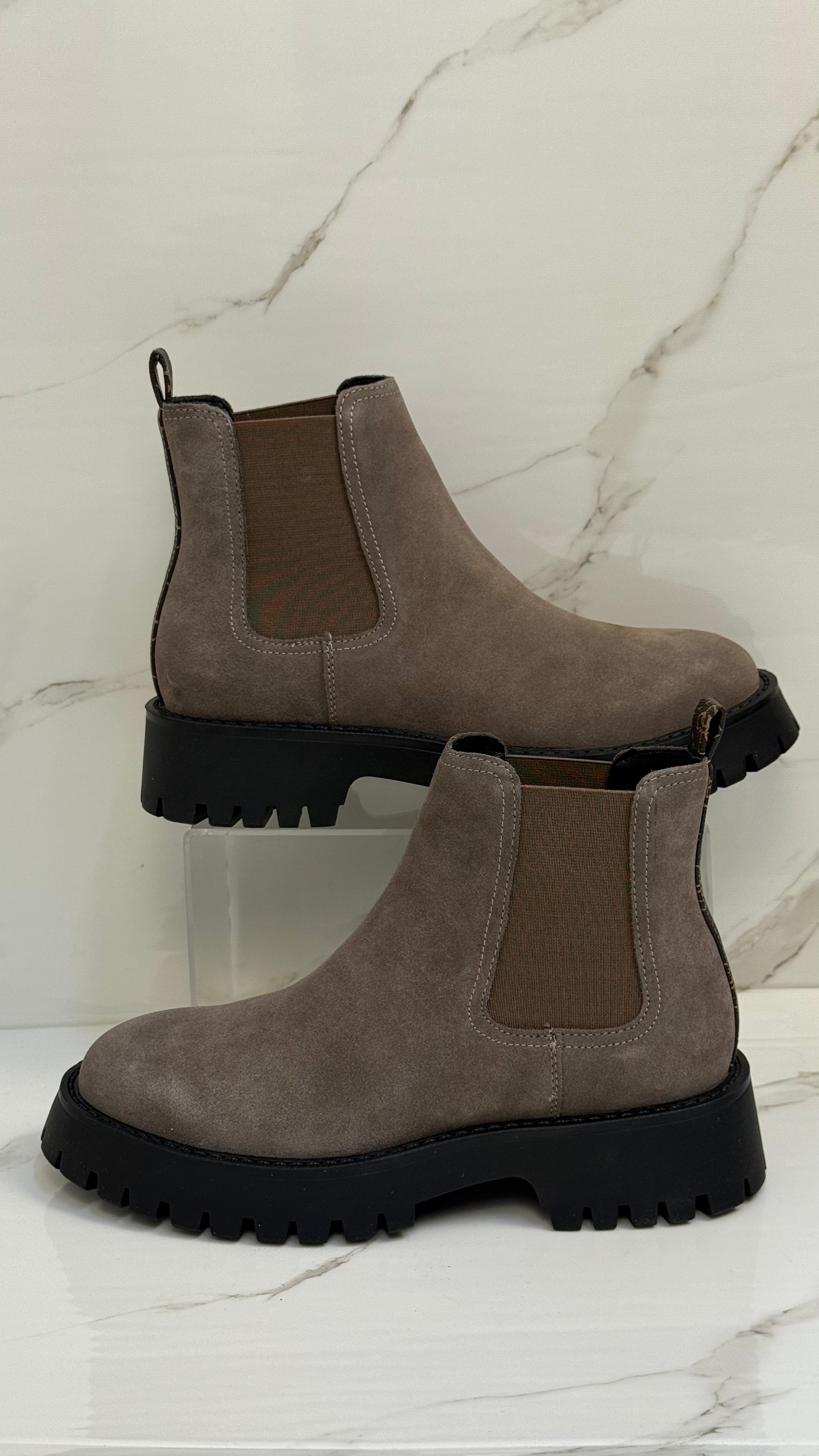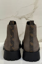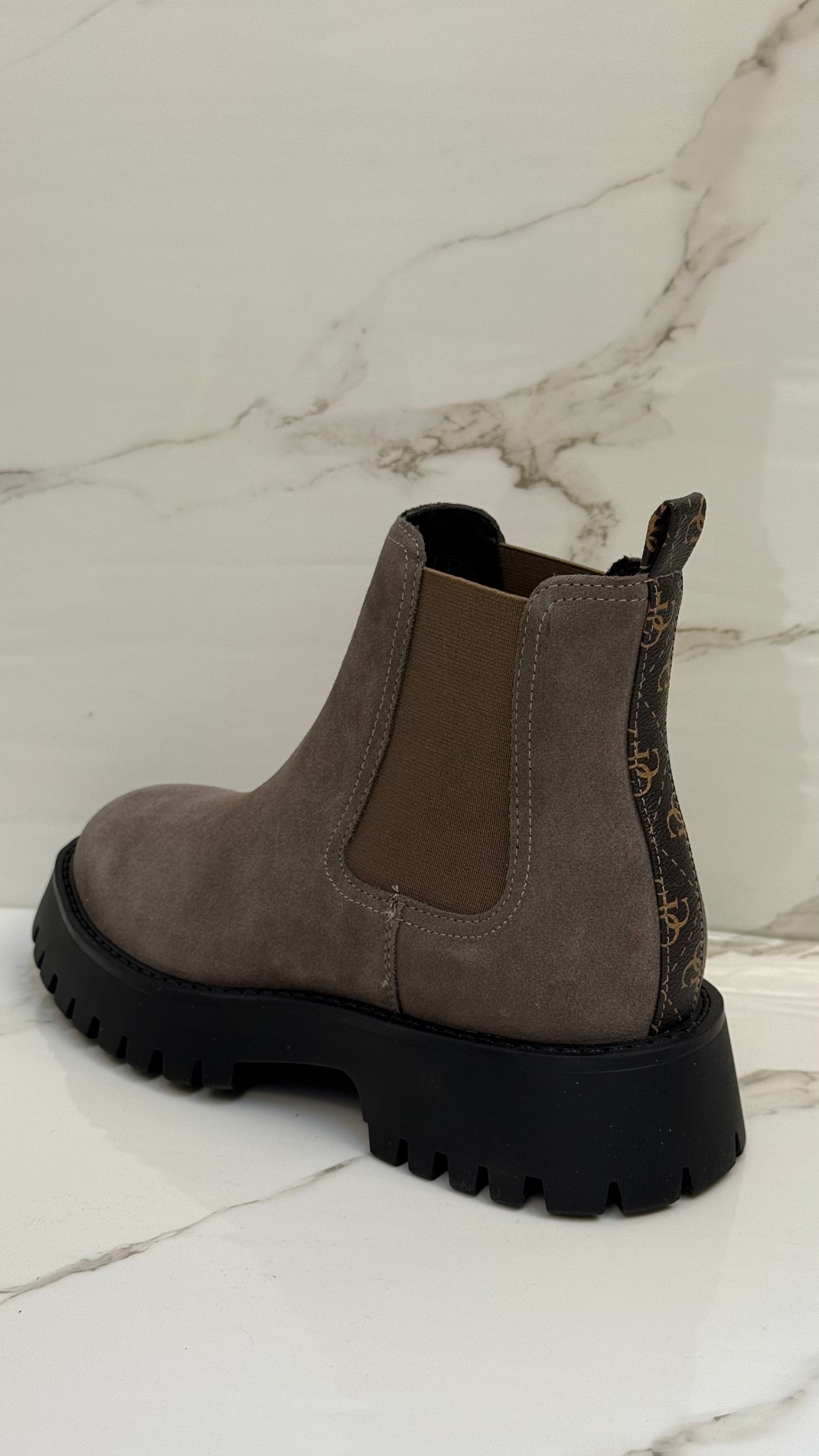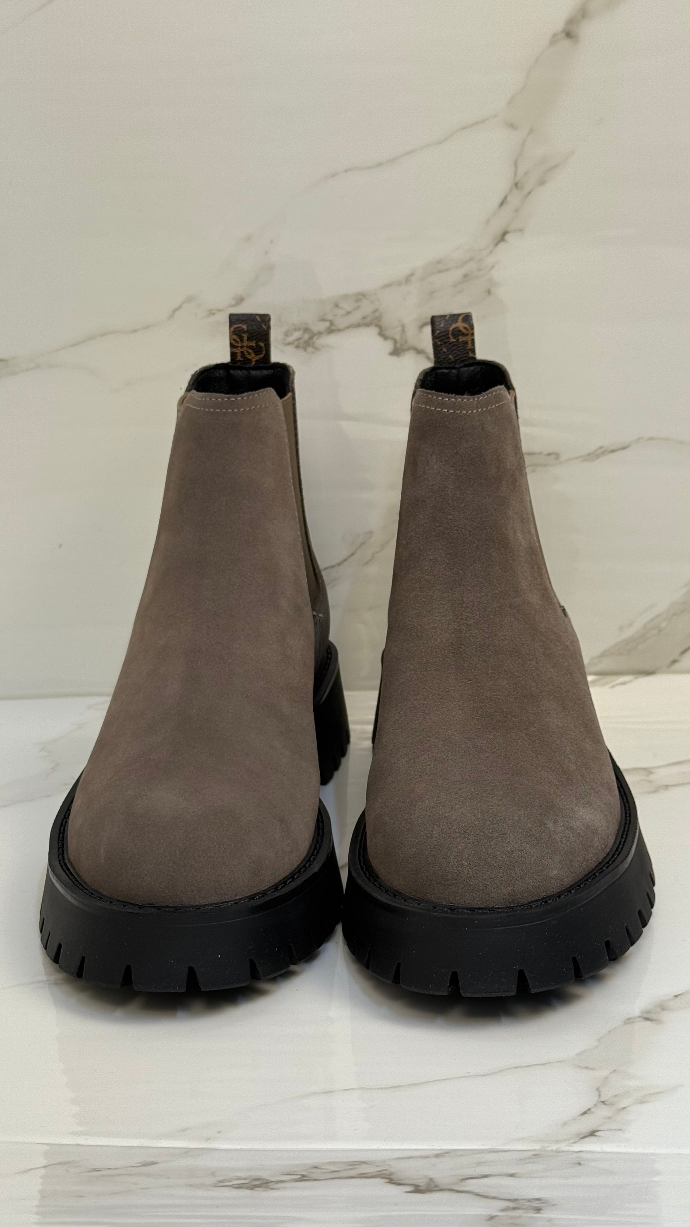 Stivaletto Guess in effetto camoscio color fango, dal design essenziale e raffinato. Gli inserti laterali in tessuto stretch facilitano la calzata e assicurano una vestibilità comoda e aderente.