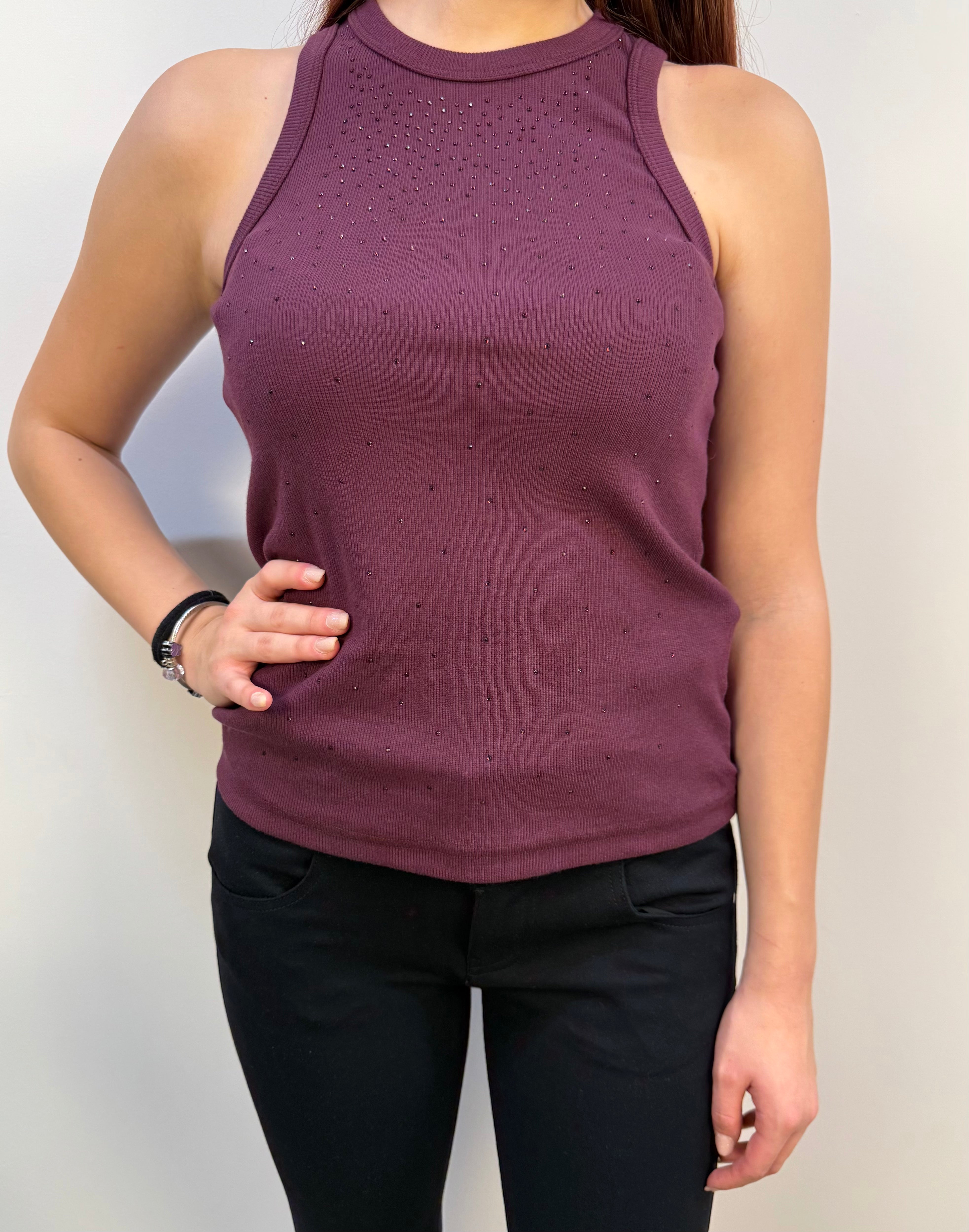Canotta a costine bordeaux con strass tono su tono