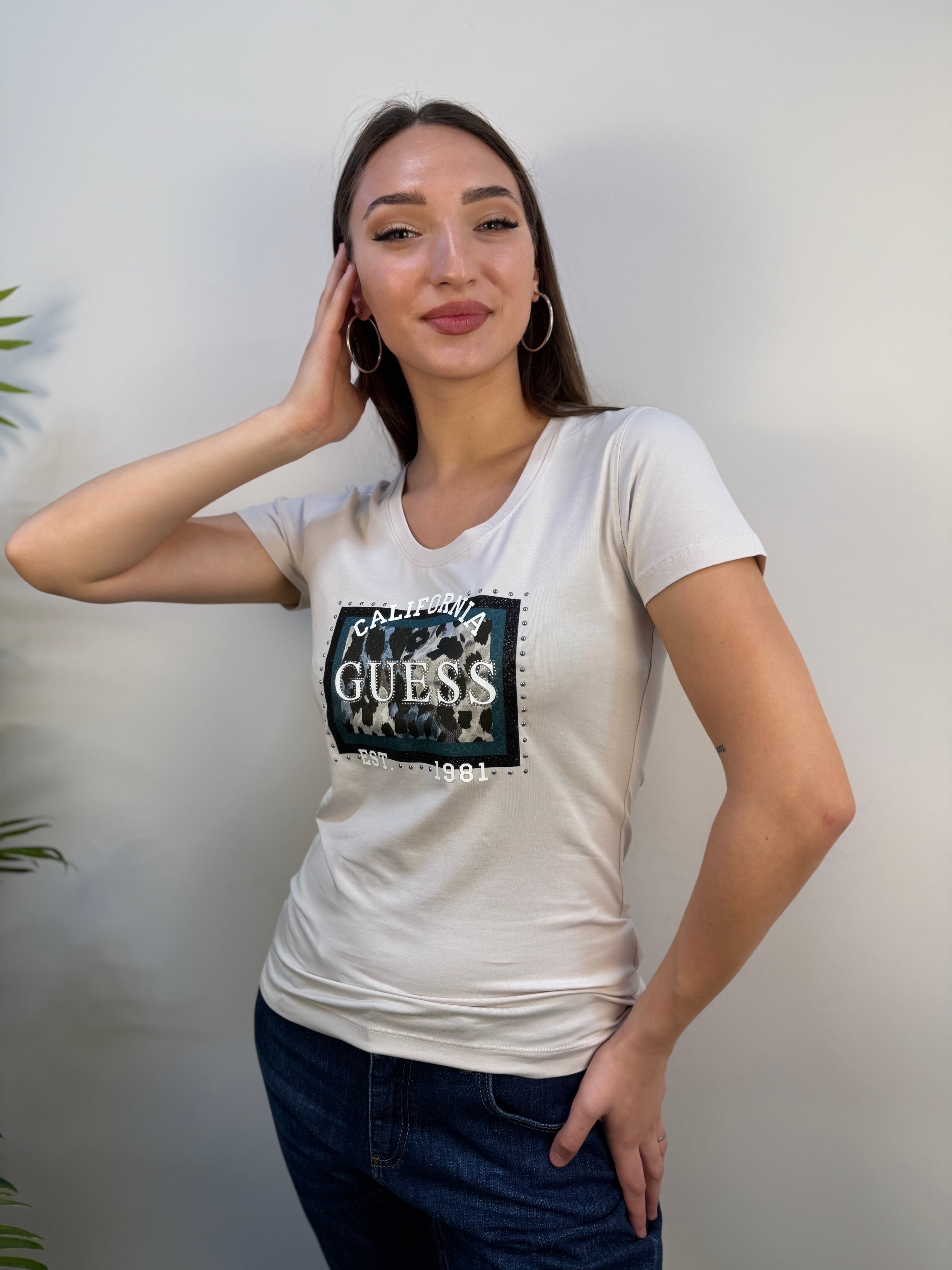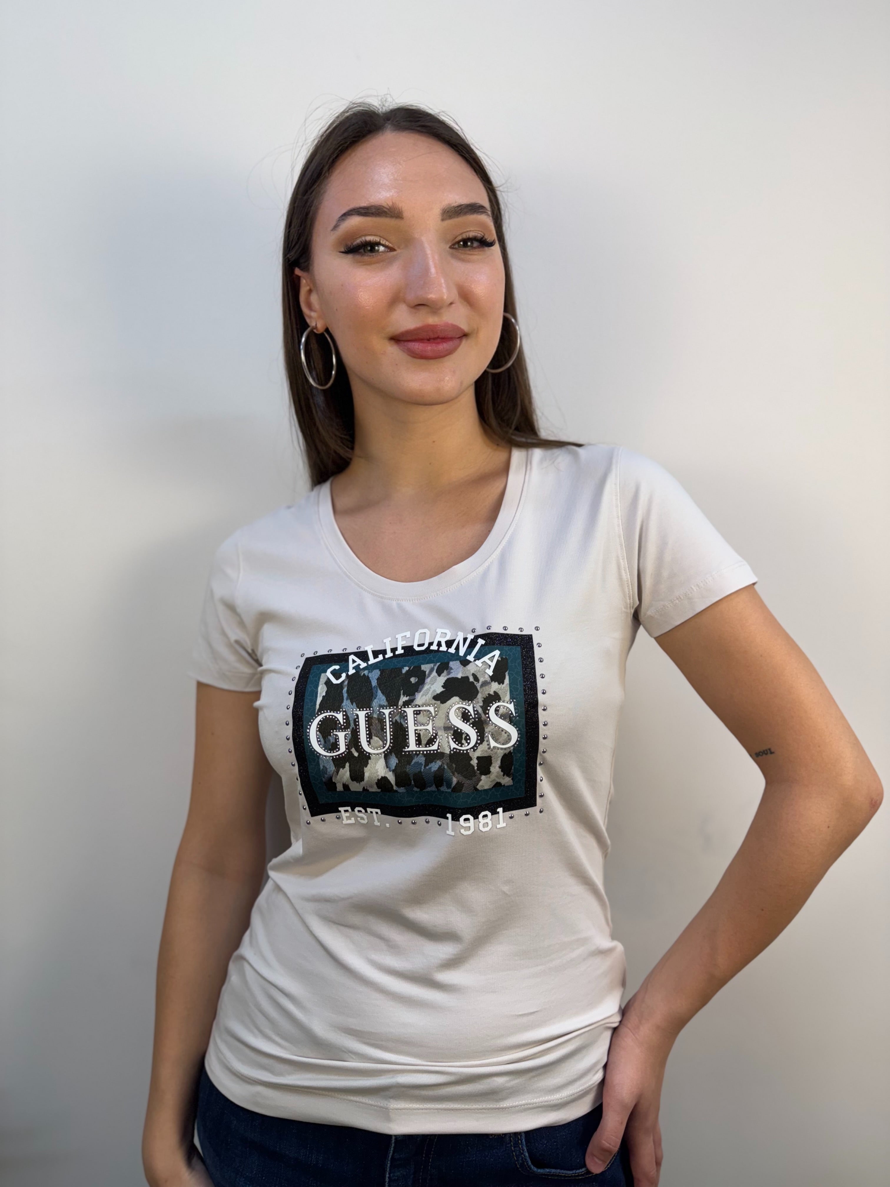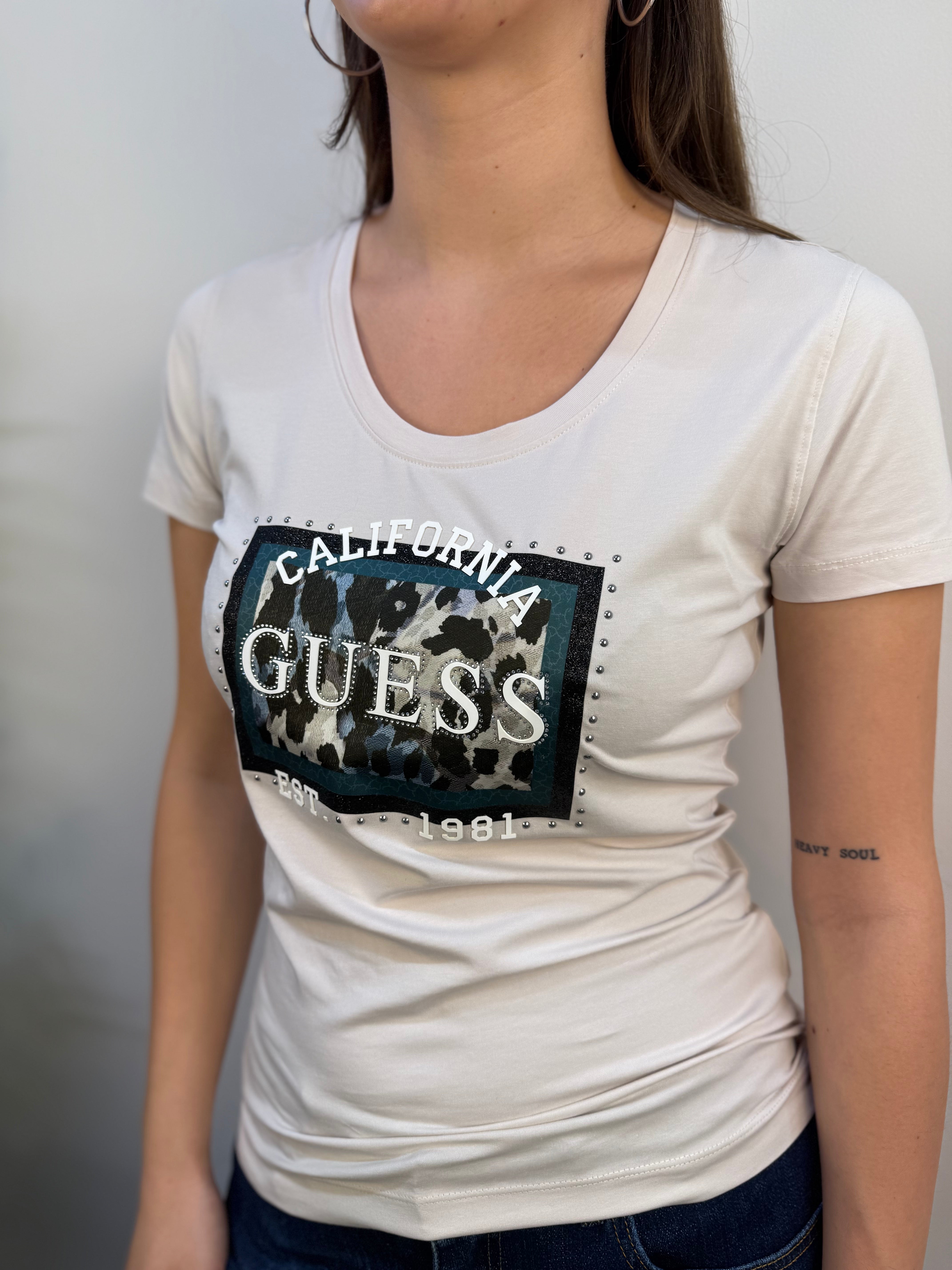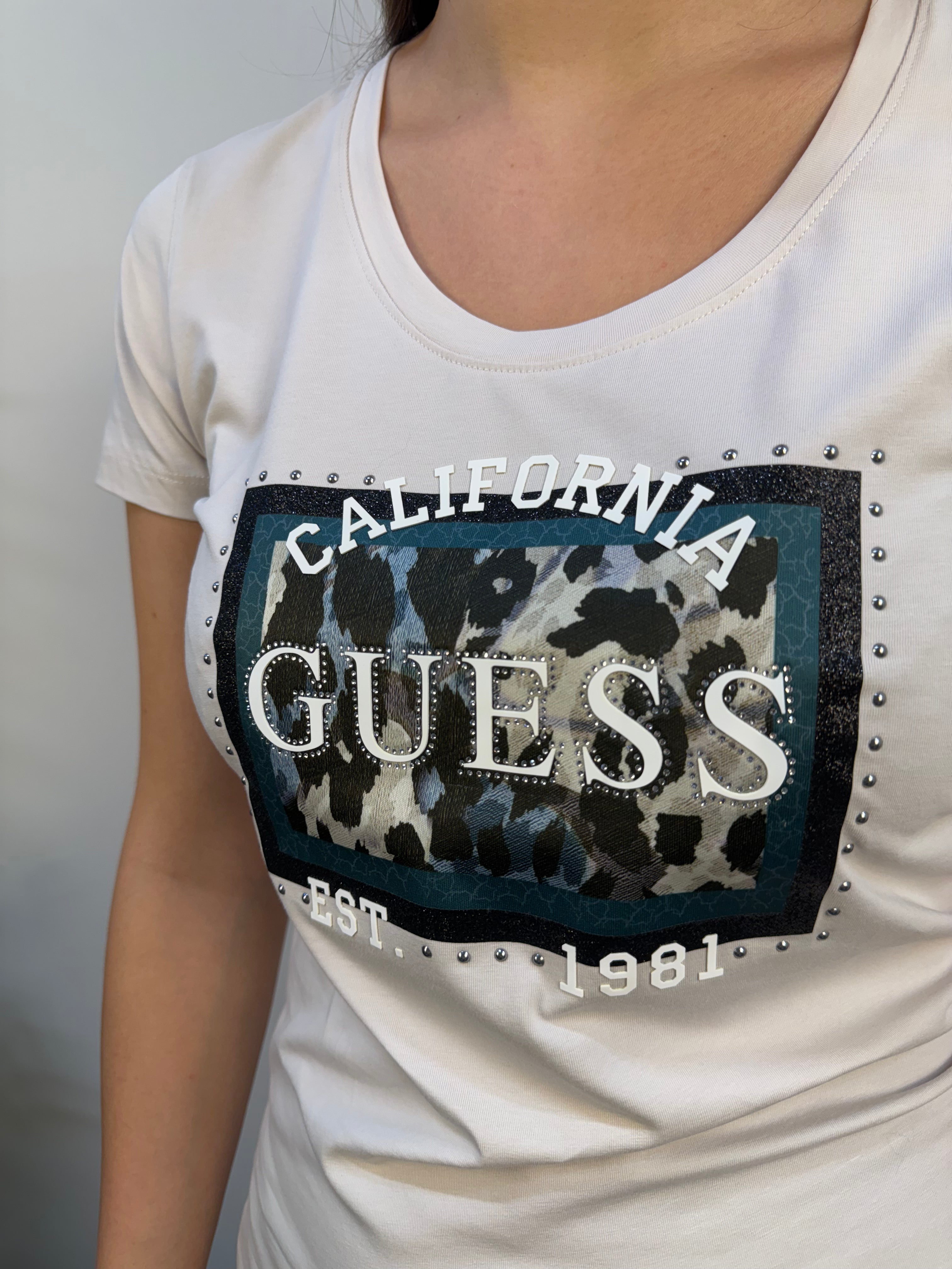 T-shirt Guess a manica corta con scollo rotondo, realizzata in morbido cotone color gesso. Il capo è decorato da una stampa logata nei toni del verde, arricchita da un elegante contorno di strass e borchiette argento, che donano un tocco luminoso e moderno. Completano il design dettagli in gomma in rilievo color bianco, per un effetto tattile e contemporaneo. Una t-shirt versatile e di carattere, perfetta per aggiungere stile e personalità ai tuoi outfit casual.