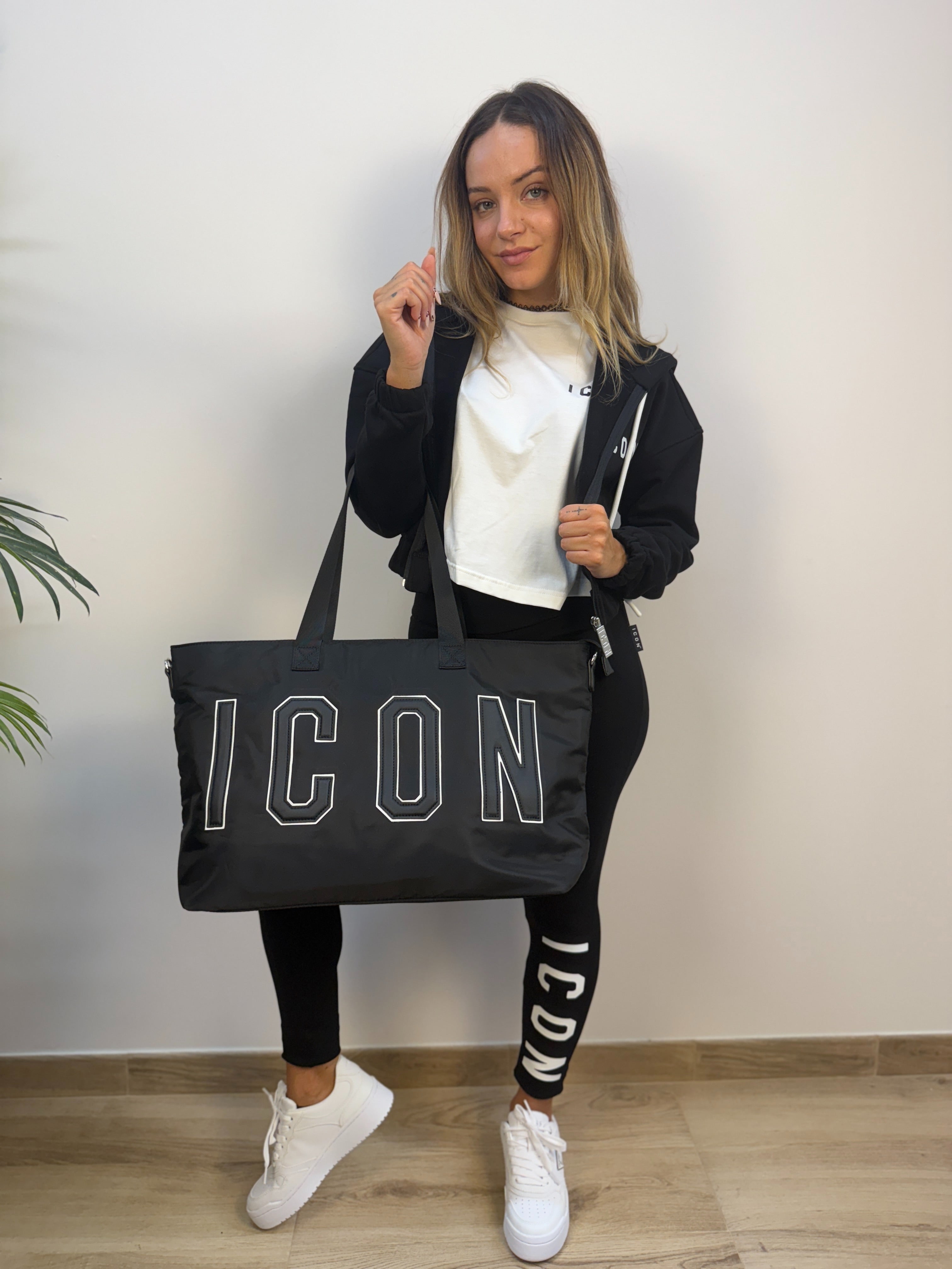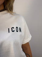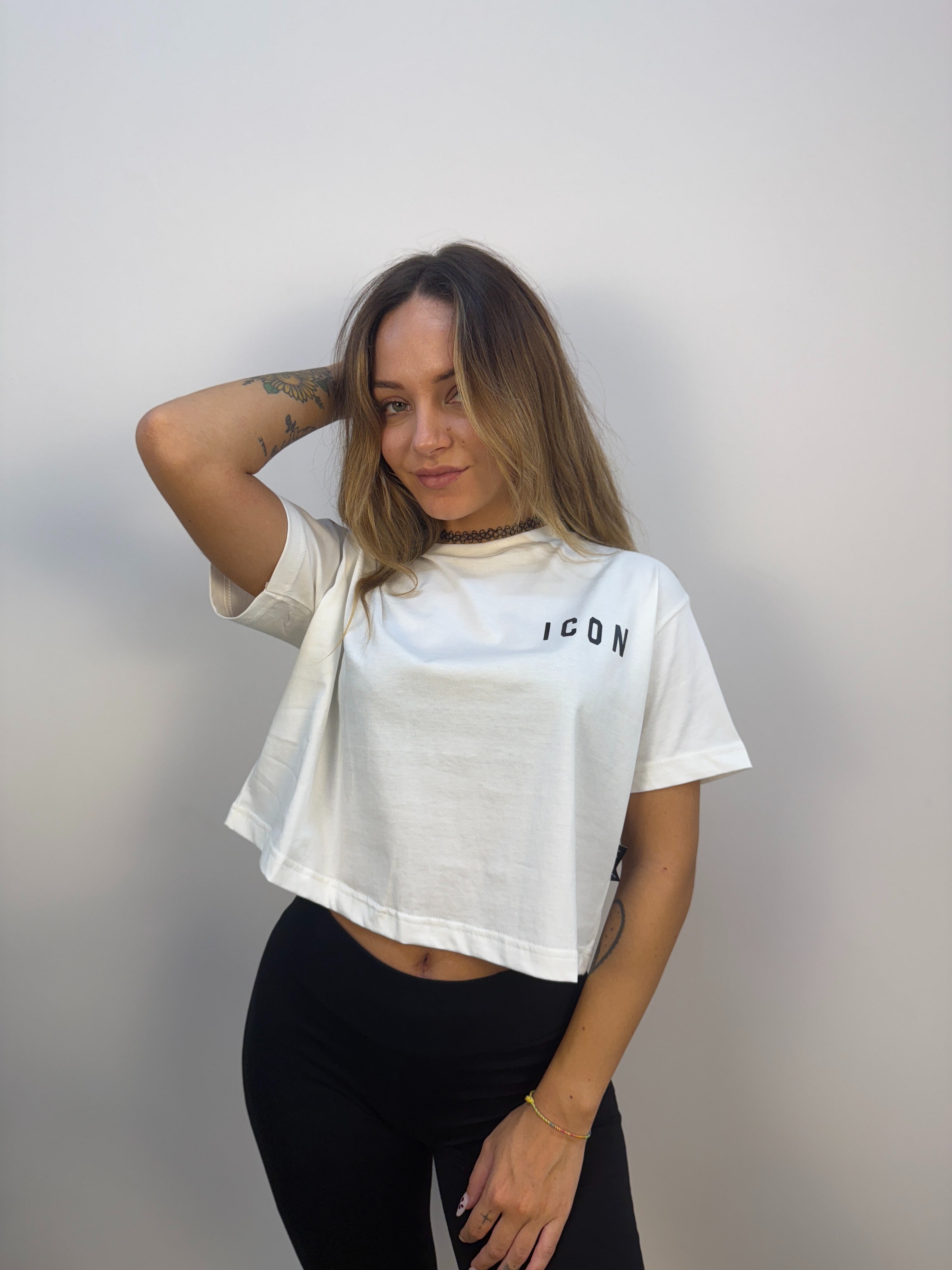 T-shirt crop ICON in tinta unita bianca, dal design essenziale e contemporaneo. Realizzata in tessuto leggero e fresco, presenta un classico girocollo e una vestibilità corta che valorizza la silhouette. Sul cuore spicca una stampa logata a contrasto in nero, che dona al capo un tocco distintivo e moderno. Perfetta per completare look casual e minimal con personalità.