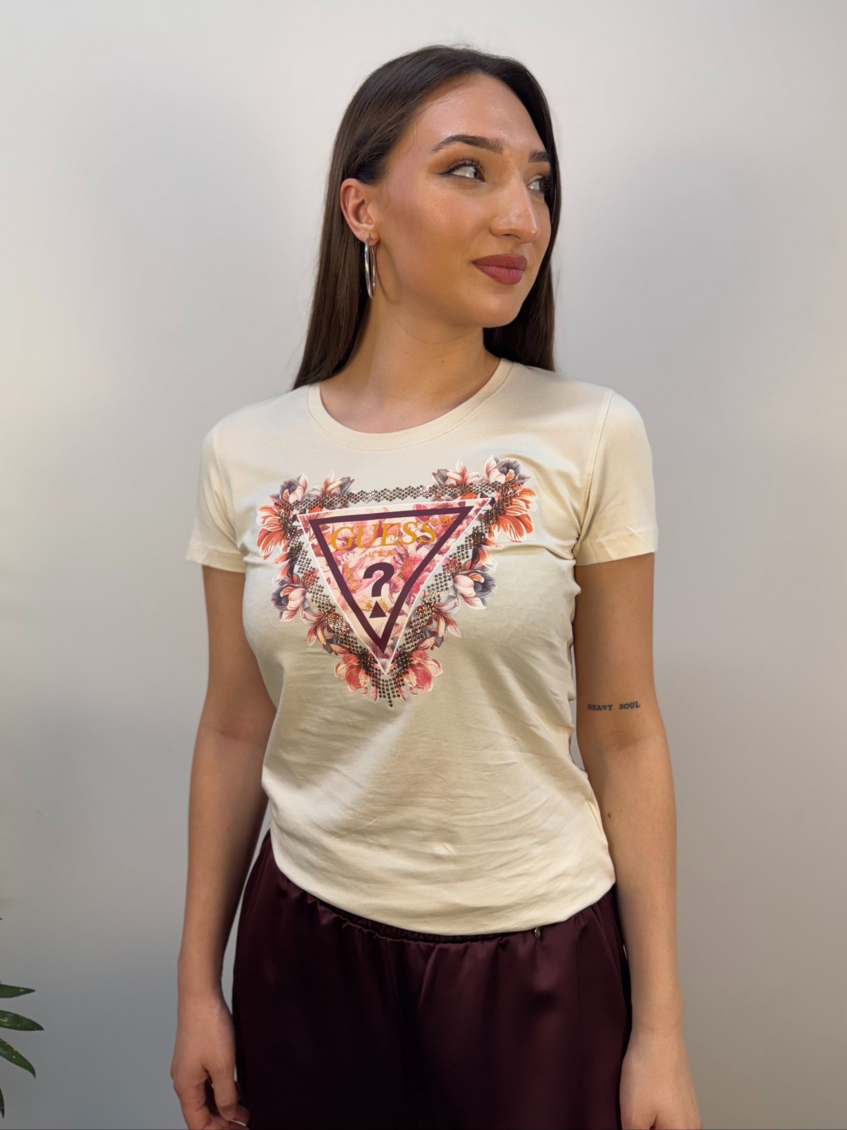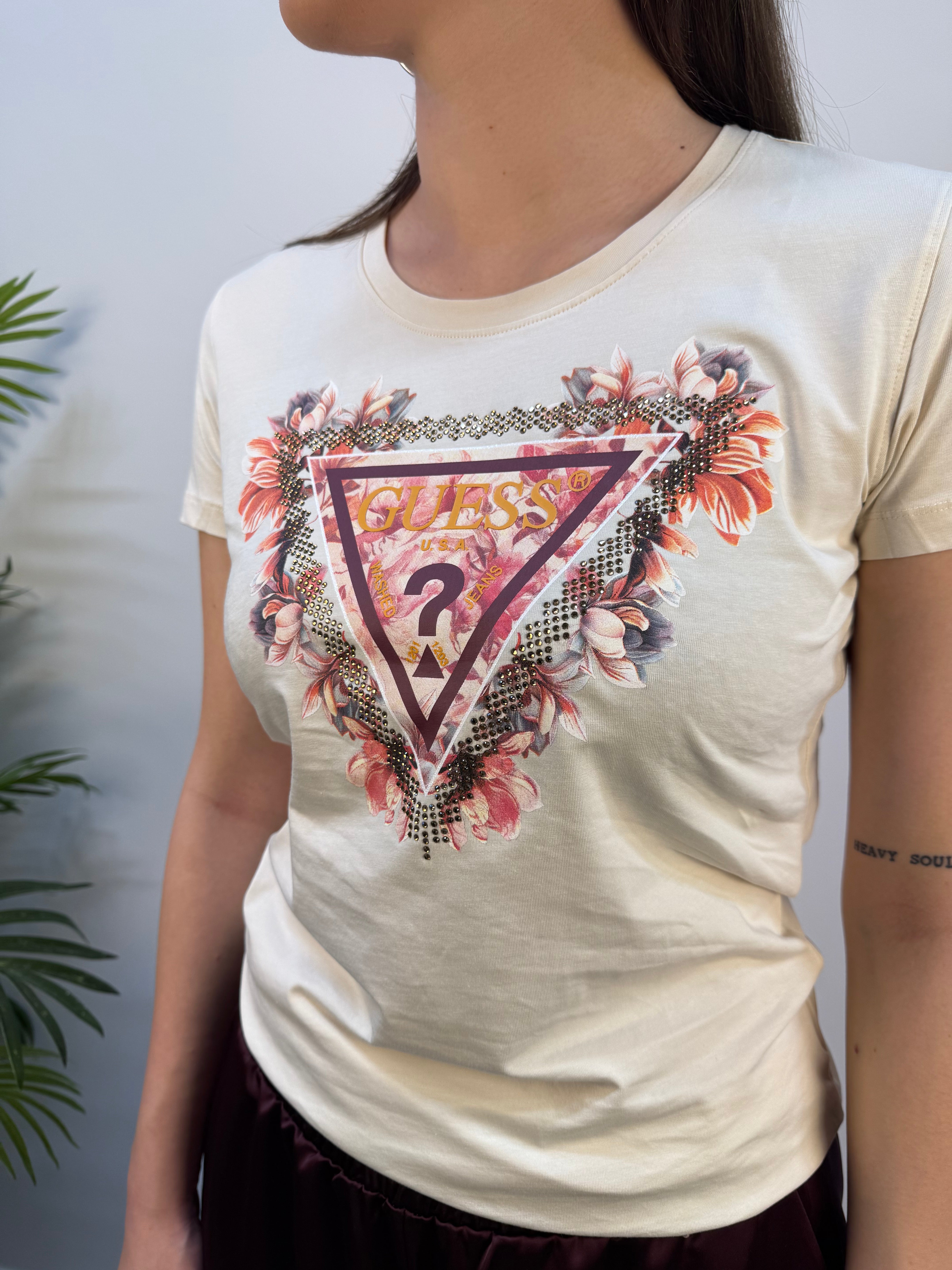 Elegante nei toni e curata nei dettagli, questa t-shirt Guess beige si distingue per il suo stile sobrio ma raffinato. Realizzata in cotone, presenta un classico scollo rotondo, maniche corte e una vestibilità slim che segue delicatamente le linee del corpo. Il fronte è decorato da una stampa logata nei toni pastello e bordeaux, con il caratteristico logo a triangolo impreziosito da strass color marrone, per un tocco luminoso e armonioso. Perfetta da indossare ogni giorno, aggiunge un dettaglio ricercato anche ai look più essenziali.