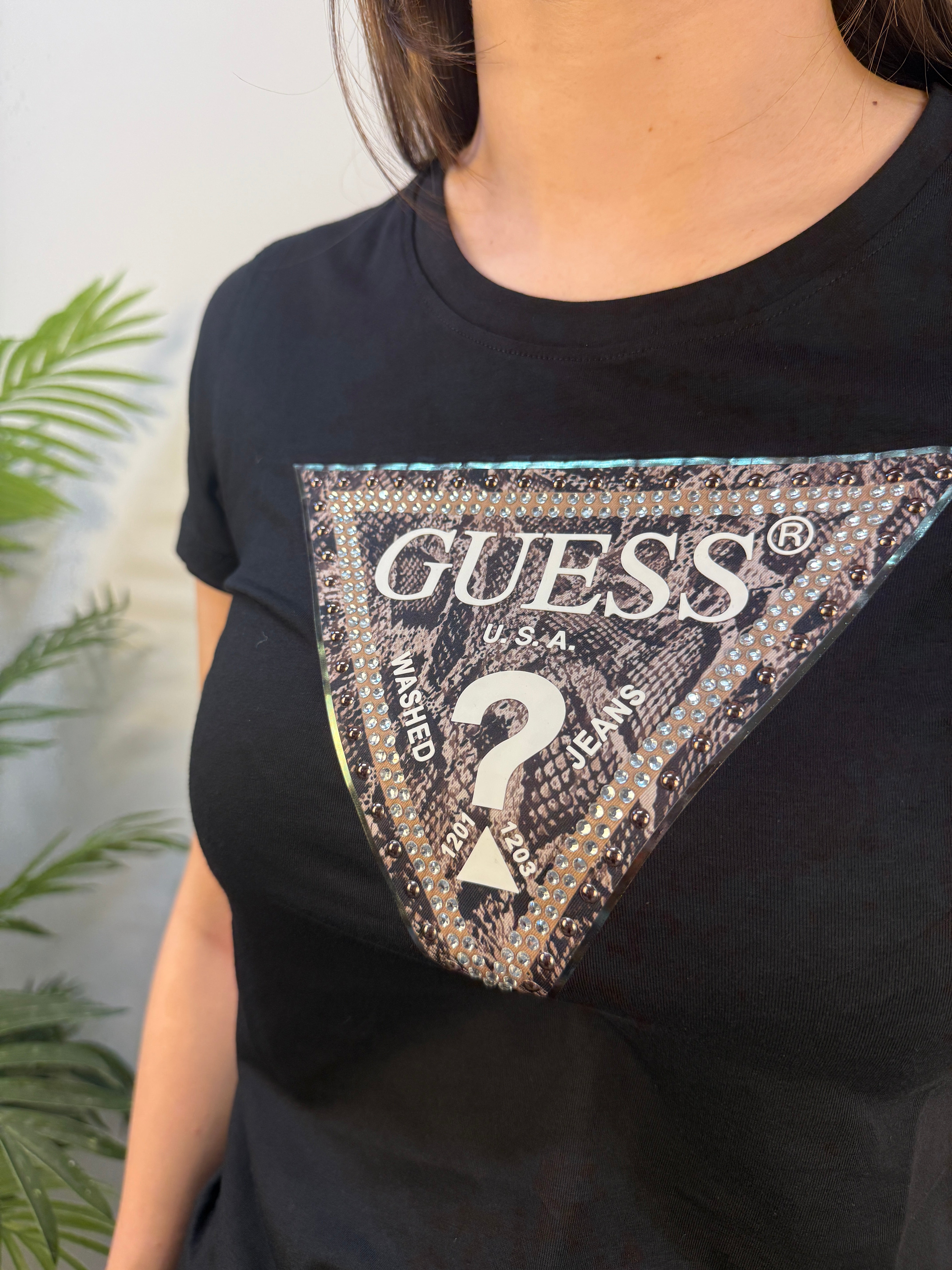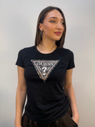 T-shirt Guess in cotone nero con scollo rotondo e vestibilità slim (sfiancata) che valorizza la figura senza rinunciare al comfort. Il lato frontale è impreziosito da un delicato logo a triangolo con stampa pitonata nei toni del marrone, su cui spicca il marchio in bianco per un contrasto deciso. Il logo è ulteriormente arricchito da strass argento e marroni che aggiungono luce e femminilità al design. Una t-shirt dallo stile raffinato ma grintoso, perfetta per completare look casual chic.