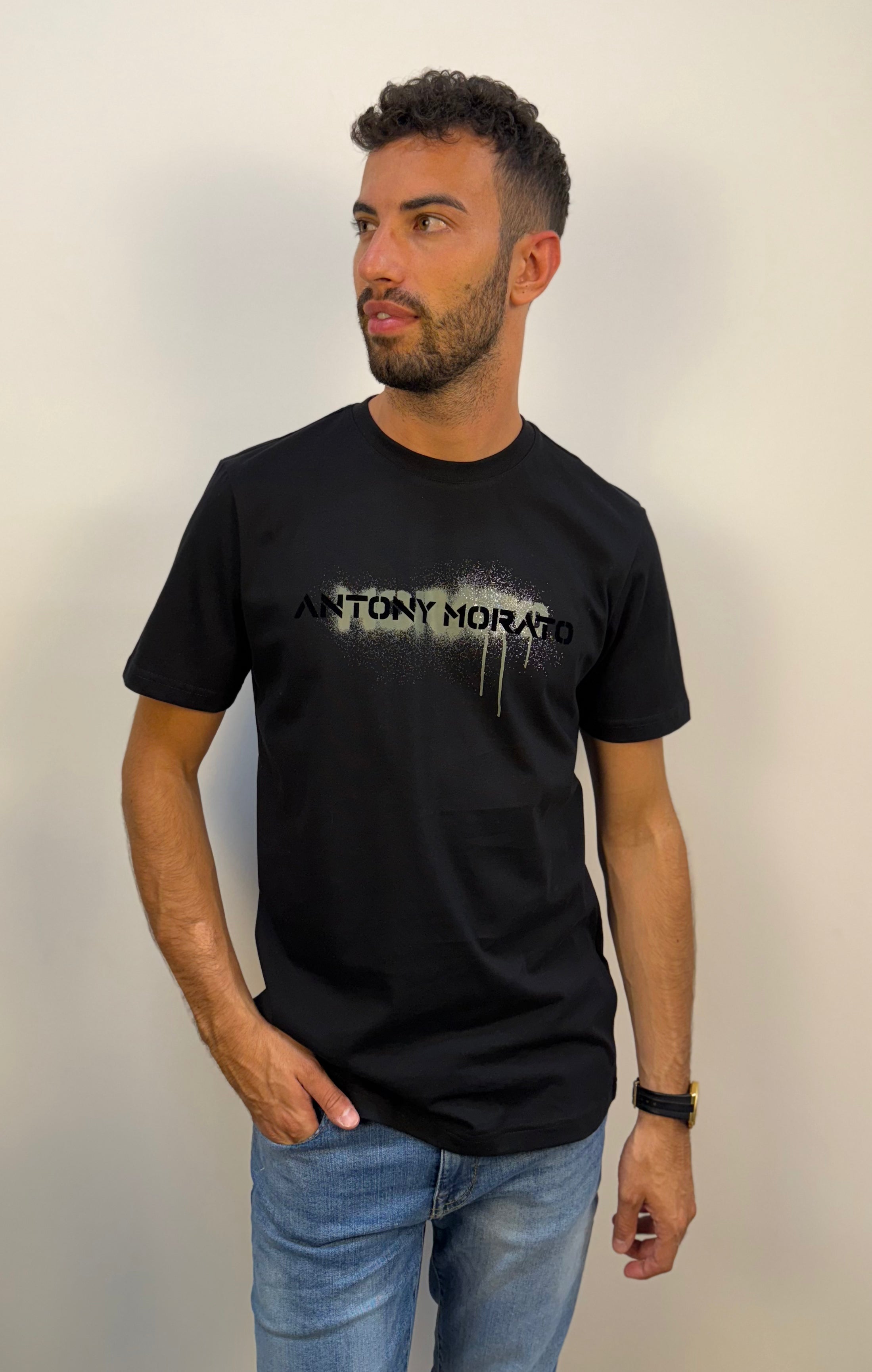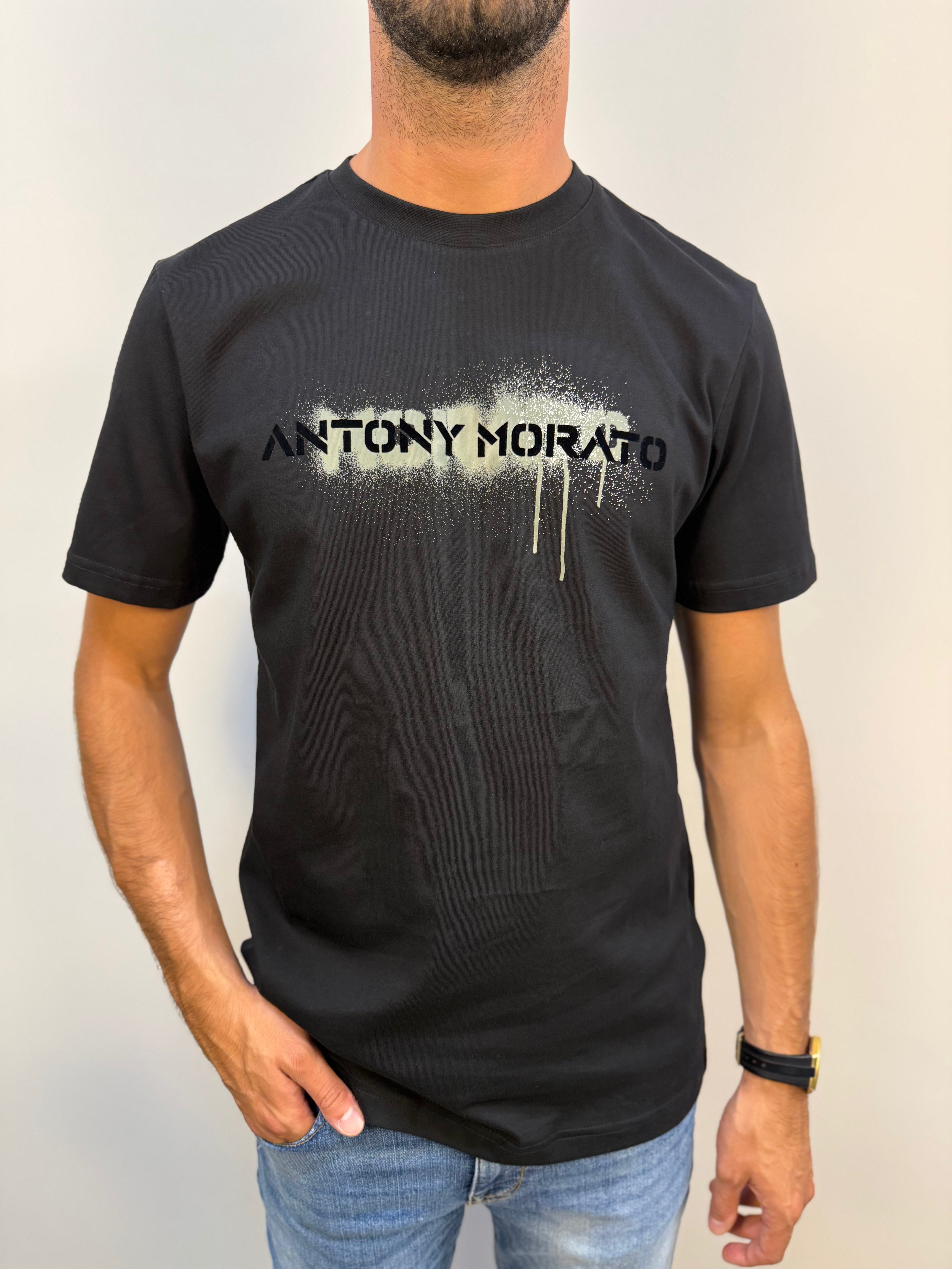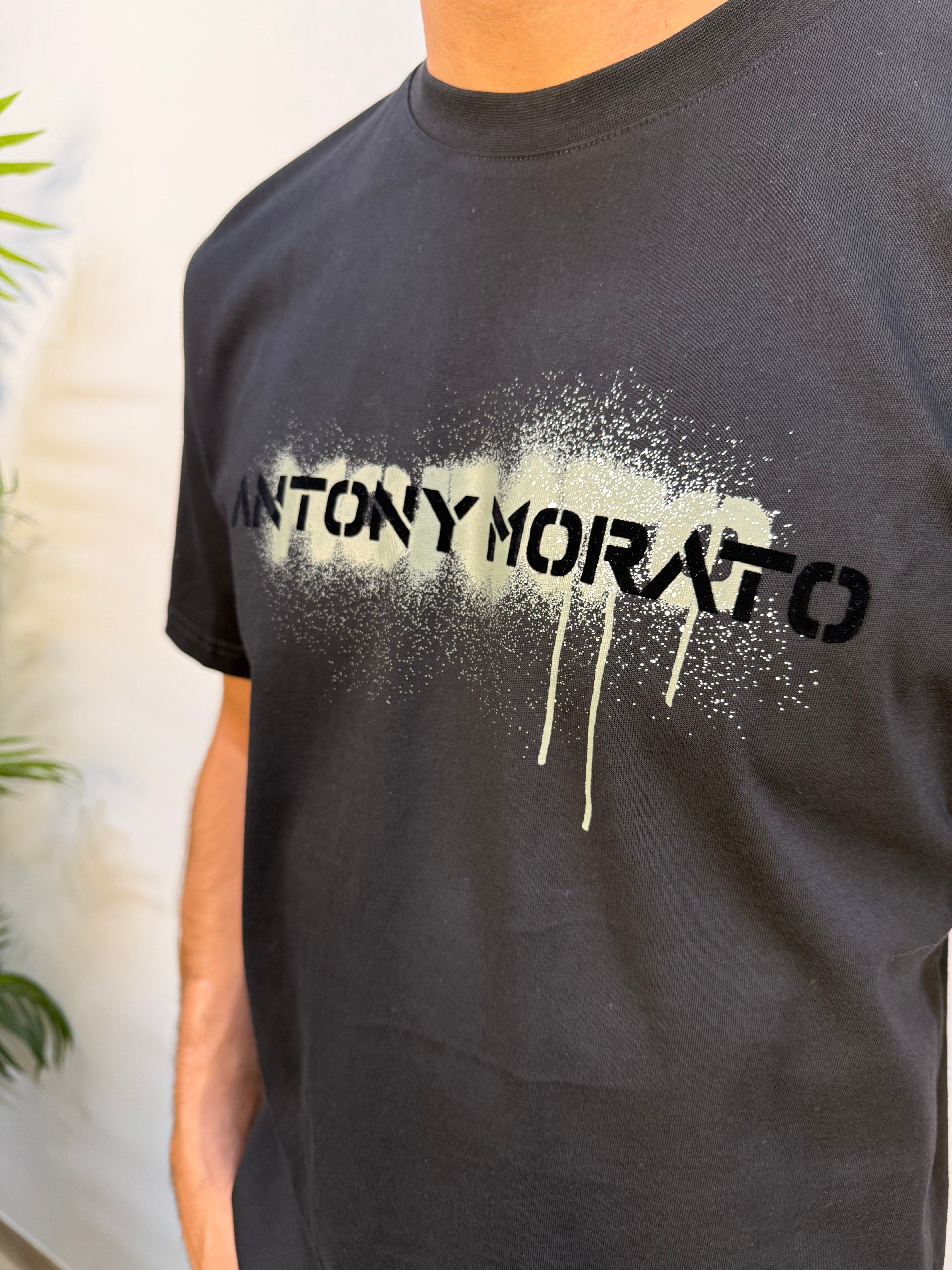 T-shirt Antony Morato girocollo in tinta unita nera, realizzata in 100% cotone. Stampa logata frontale in rilievo effetto soft touch, applicata su sfondo verde militare con effetto macchia. Un capo dal carattere deciso, ideale per look urbani e contemporanei.