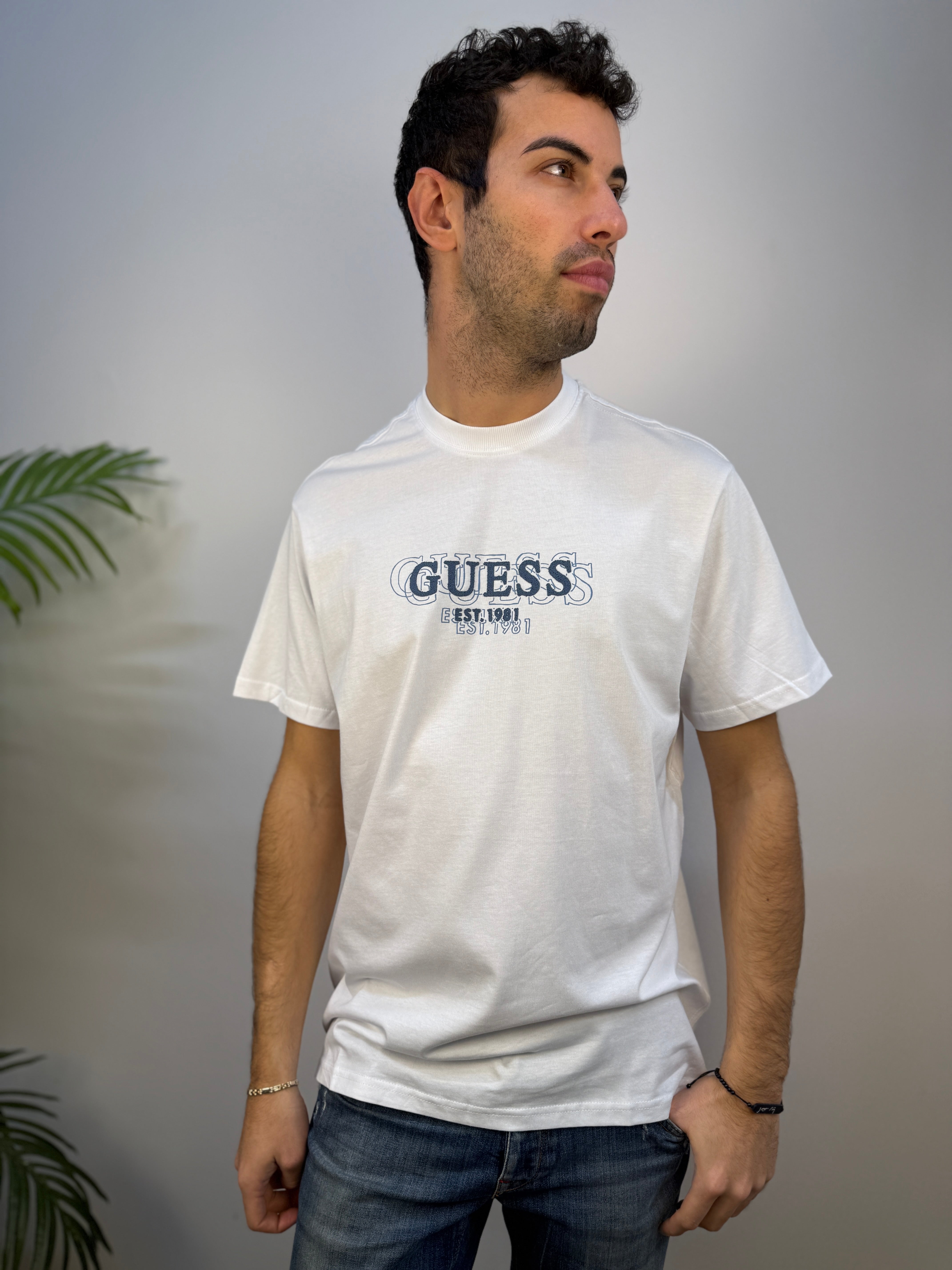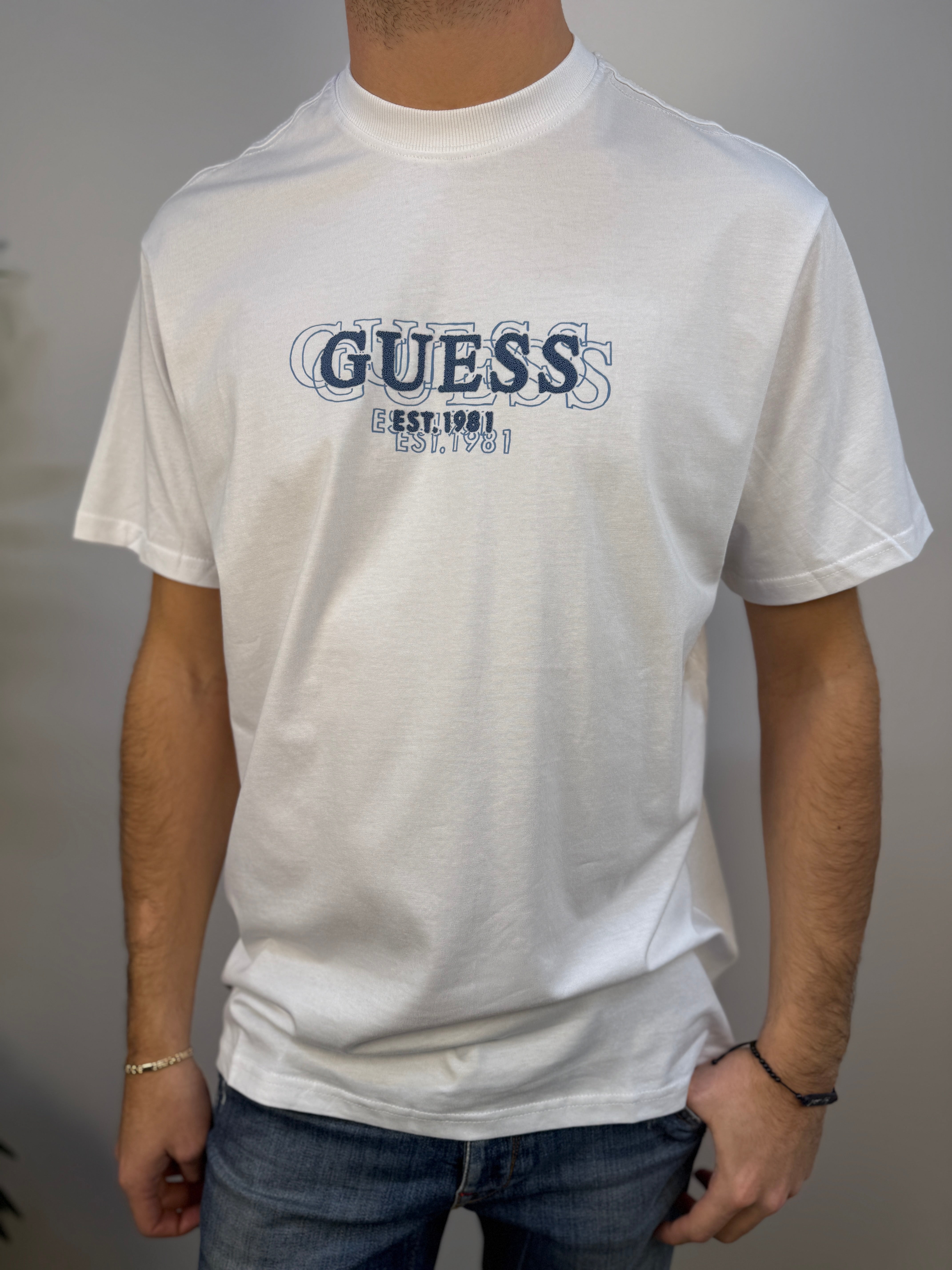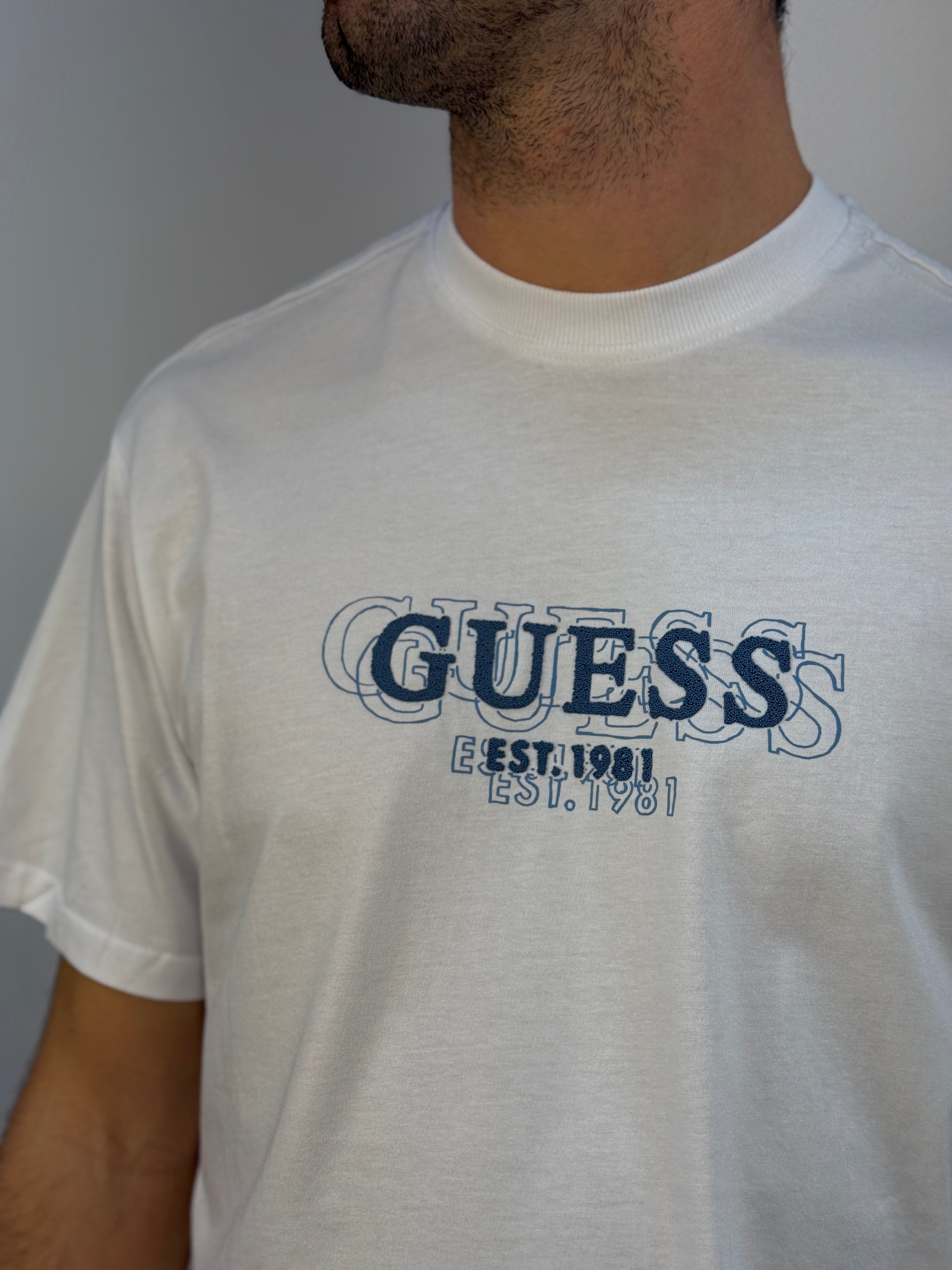 T-shirt Guess girocollo dal design pulito, caratterizzata da una stampa in rilievo sul petto che aggiunge un dettaglio distintivo e moderno. La vestibilità regular fit garantisce comfort e praticità, rendendola un capo versatile e adatto a ogni occasione.