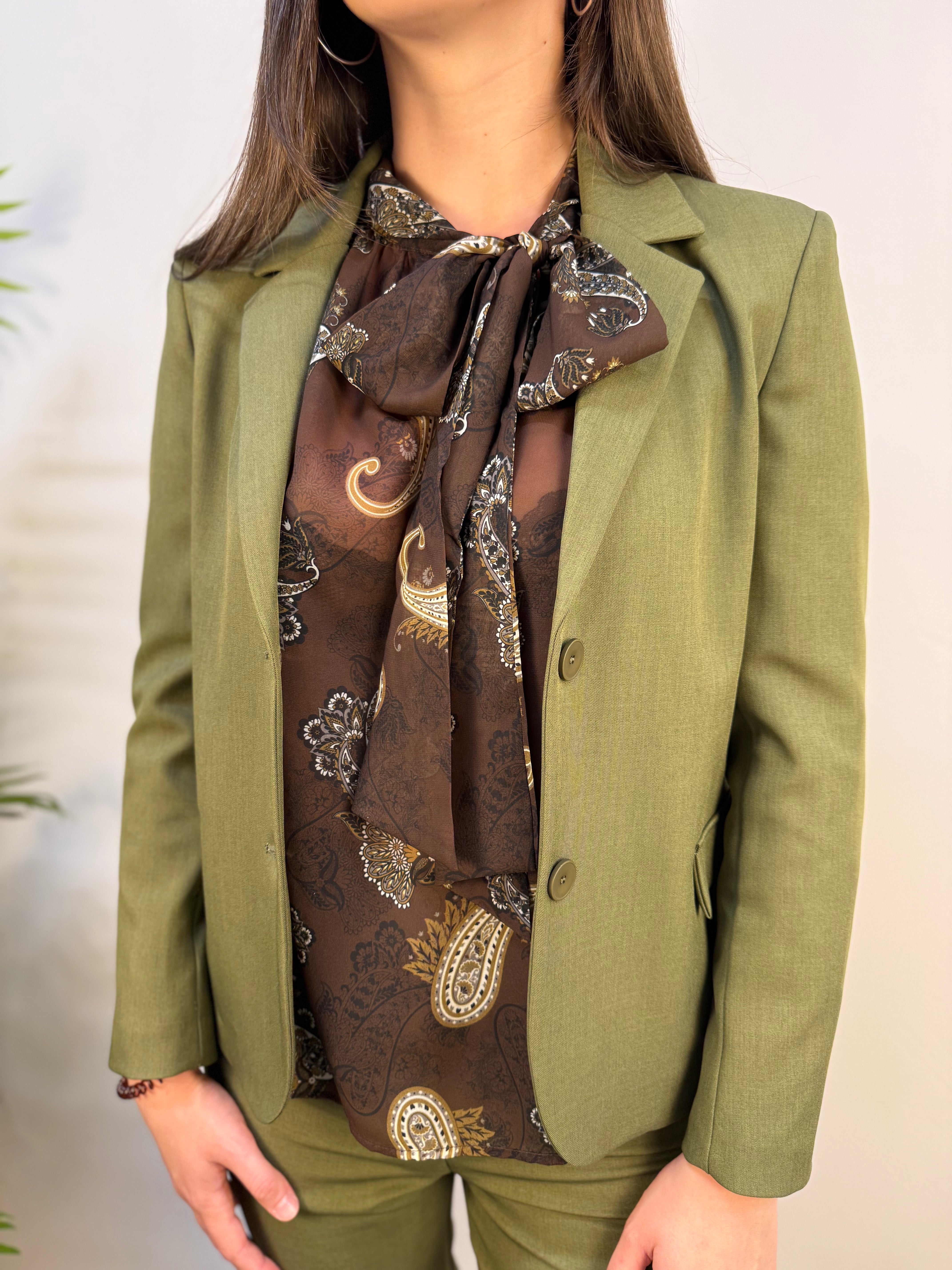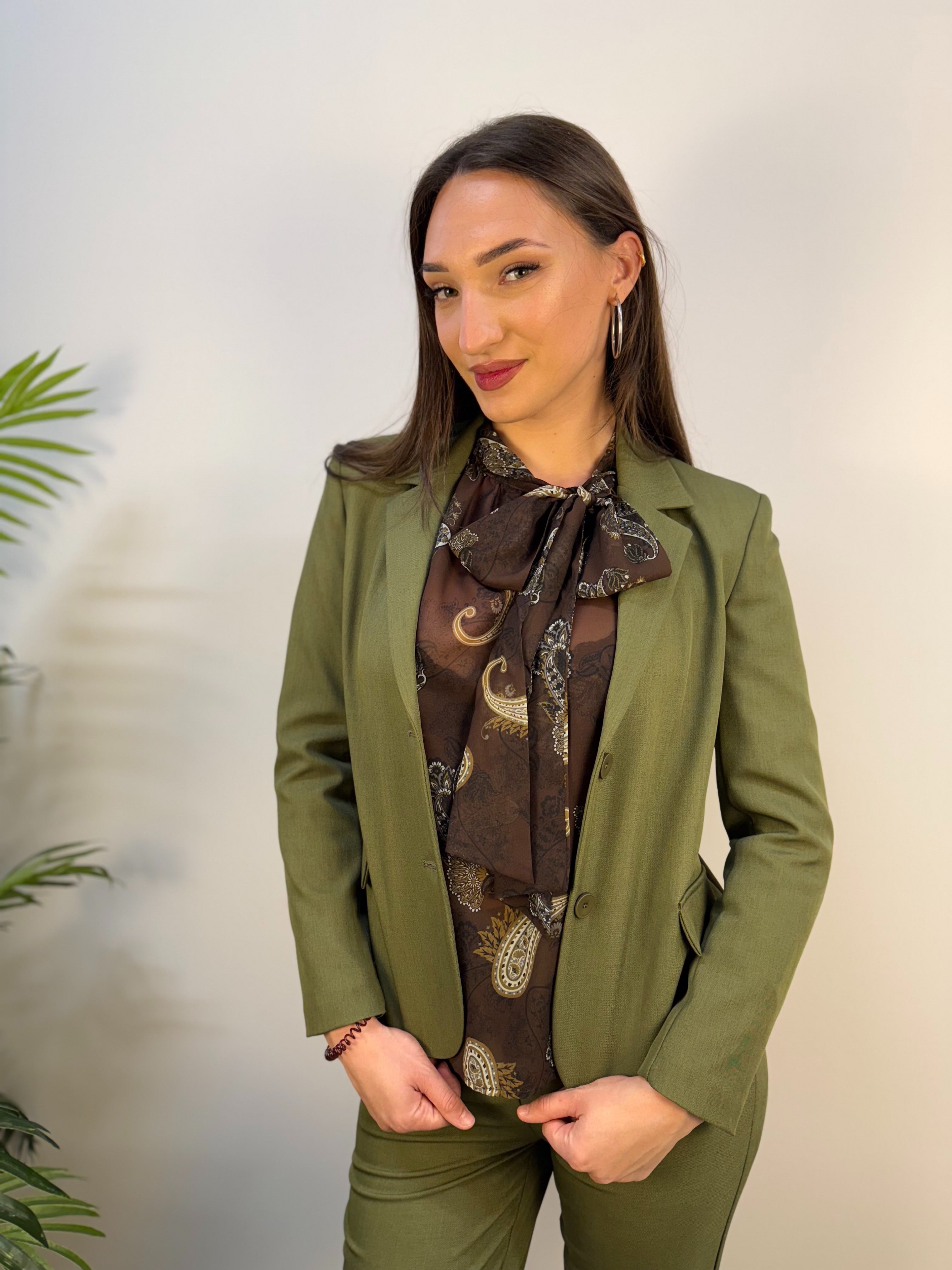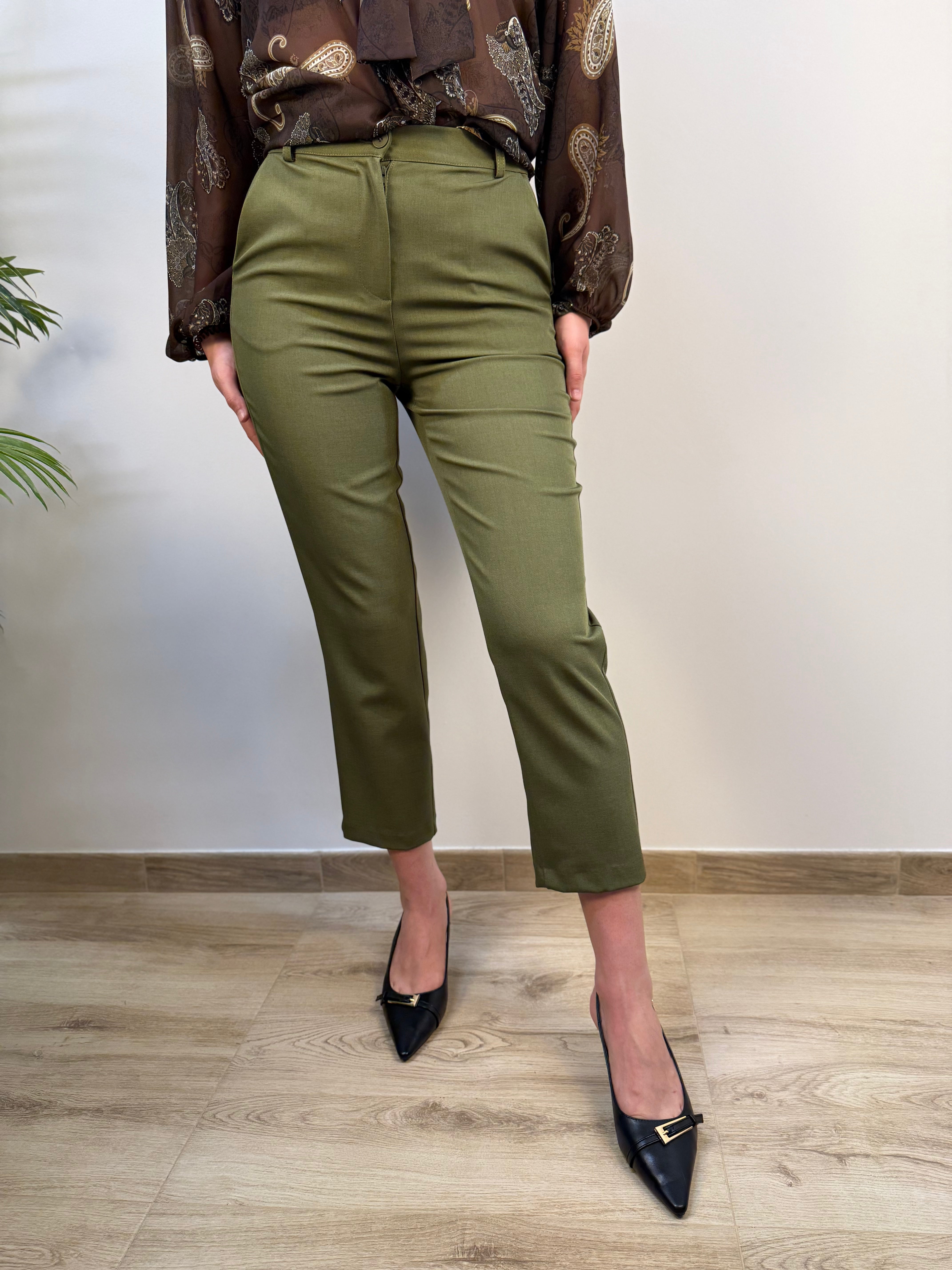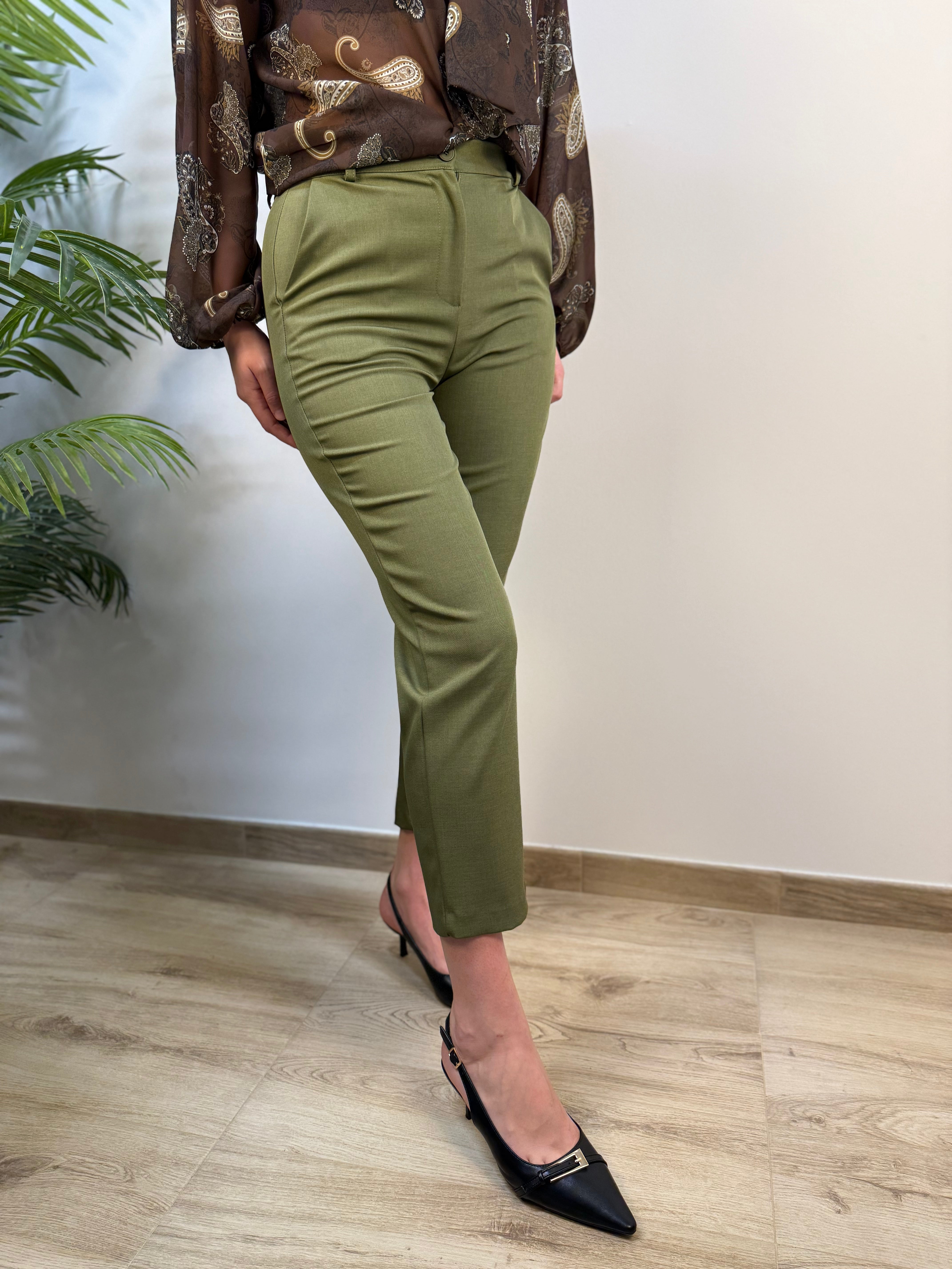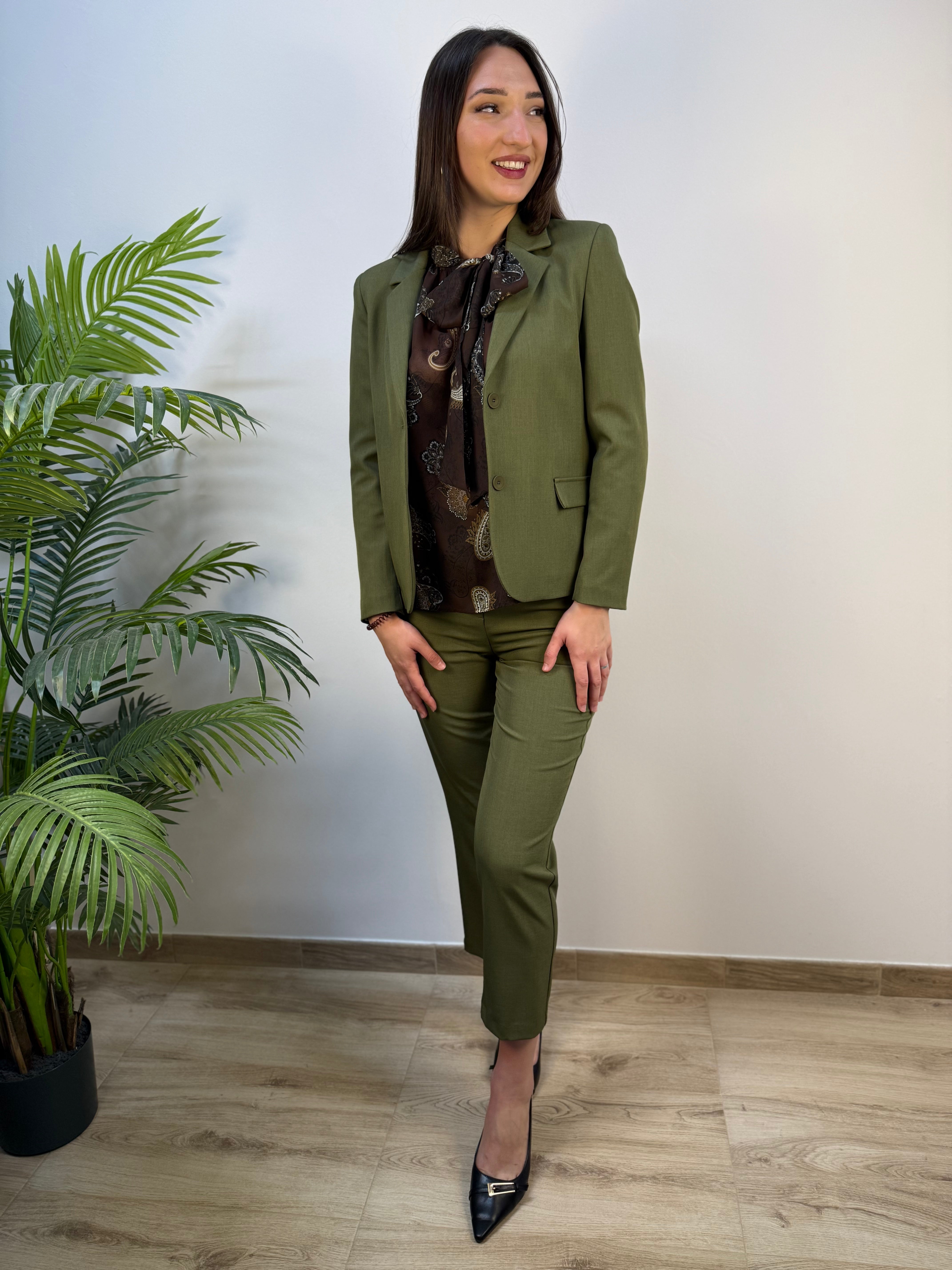 Tailleur verde oliva con pantalone a sigaretta e giacca strutturata