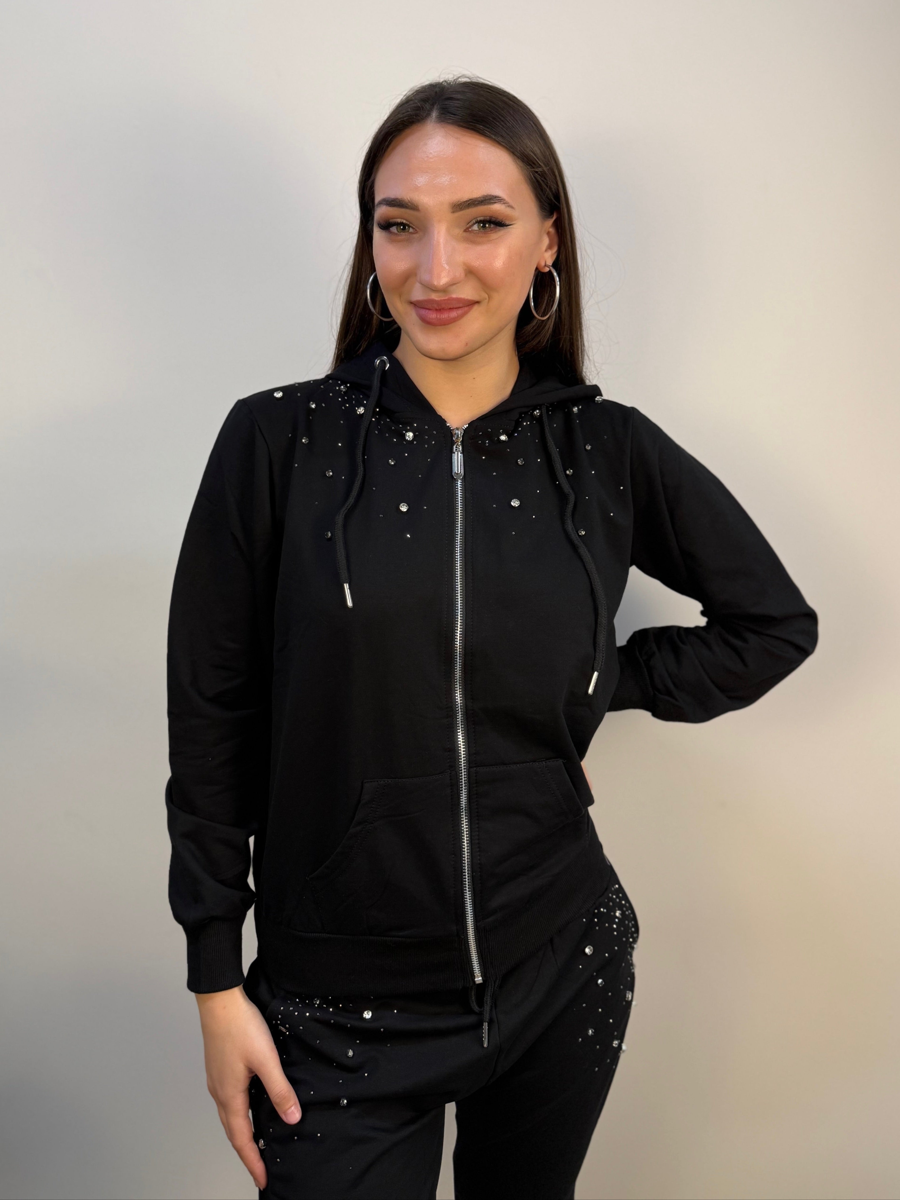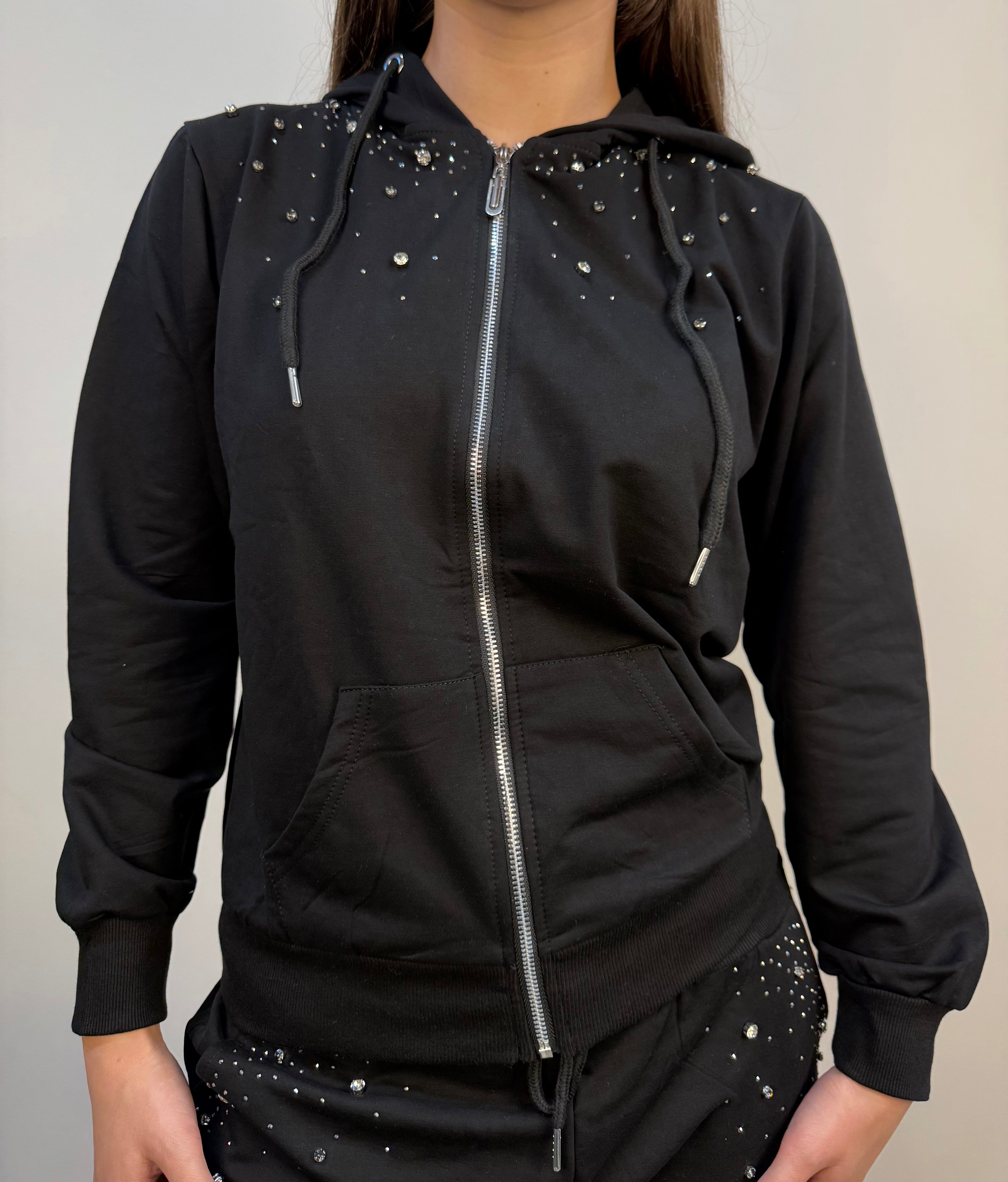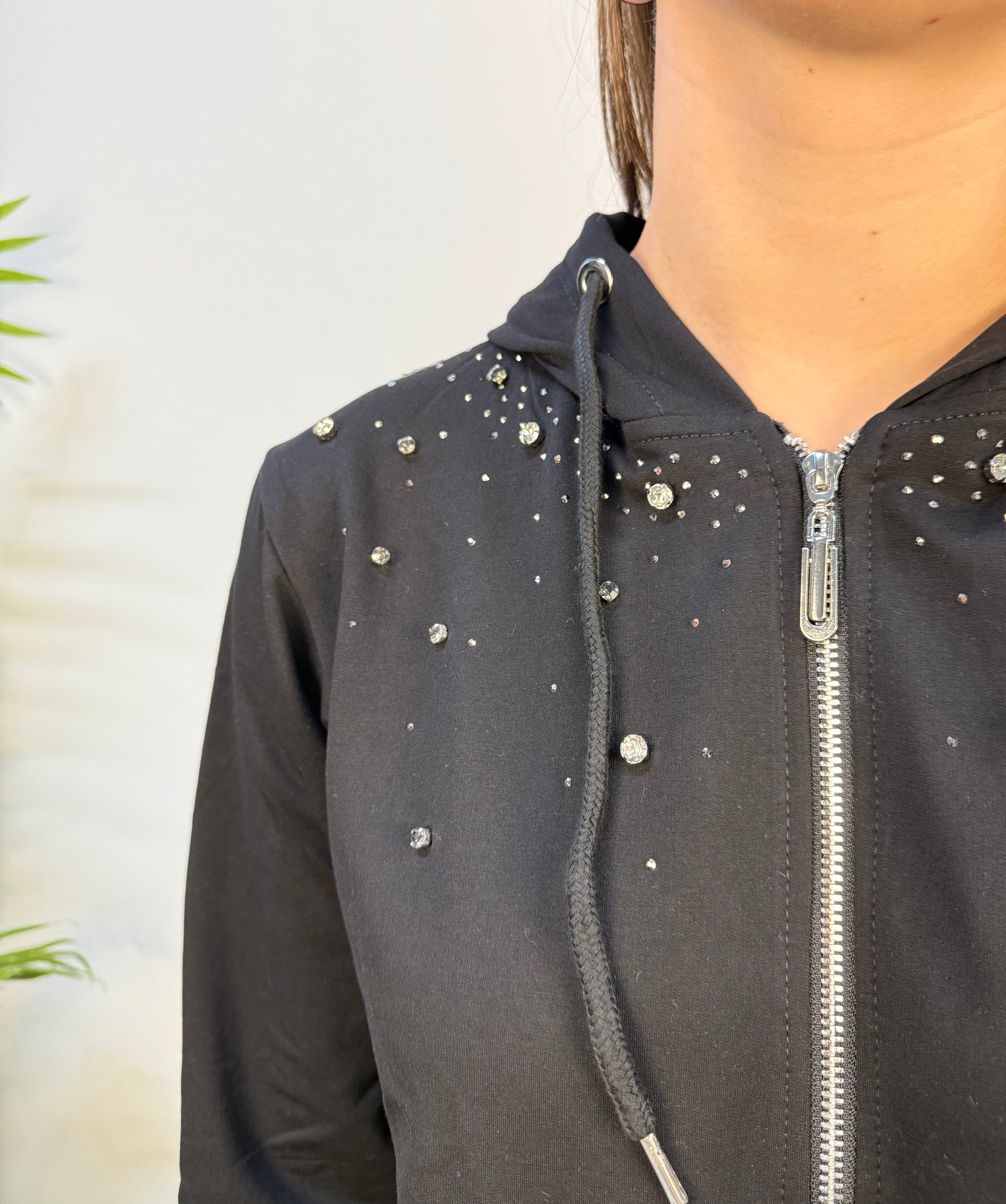 Felpa in cotone felpata con zip e dettaglio strass sulle spalle