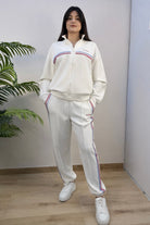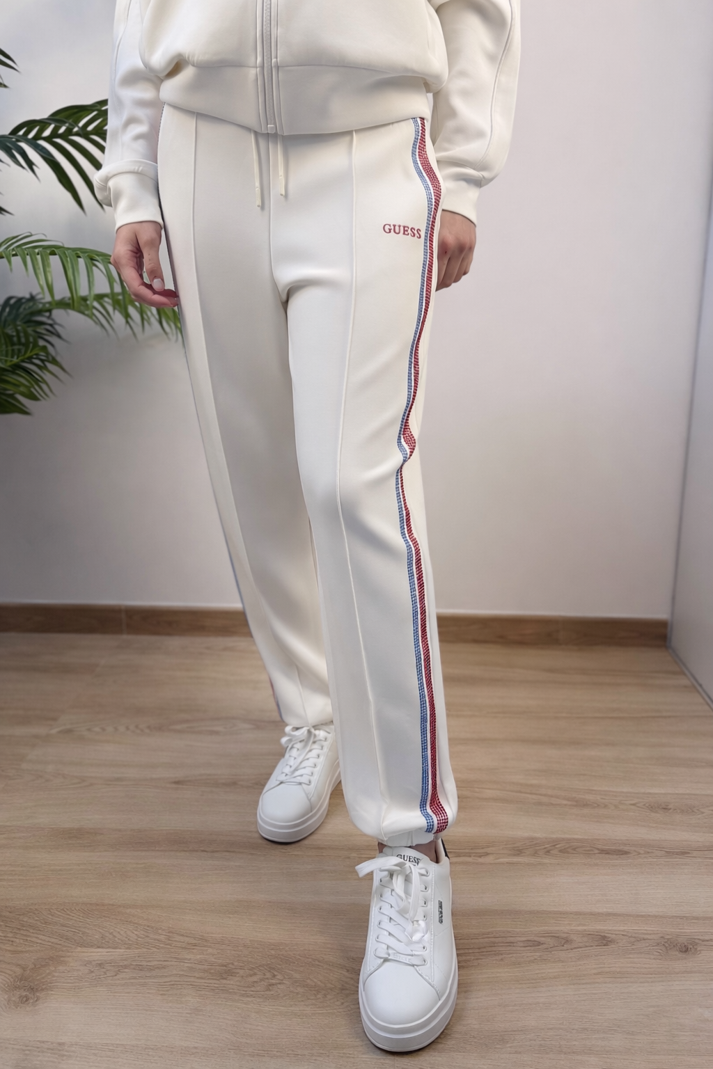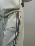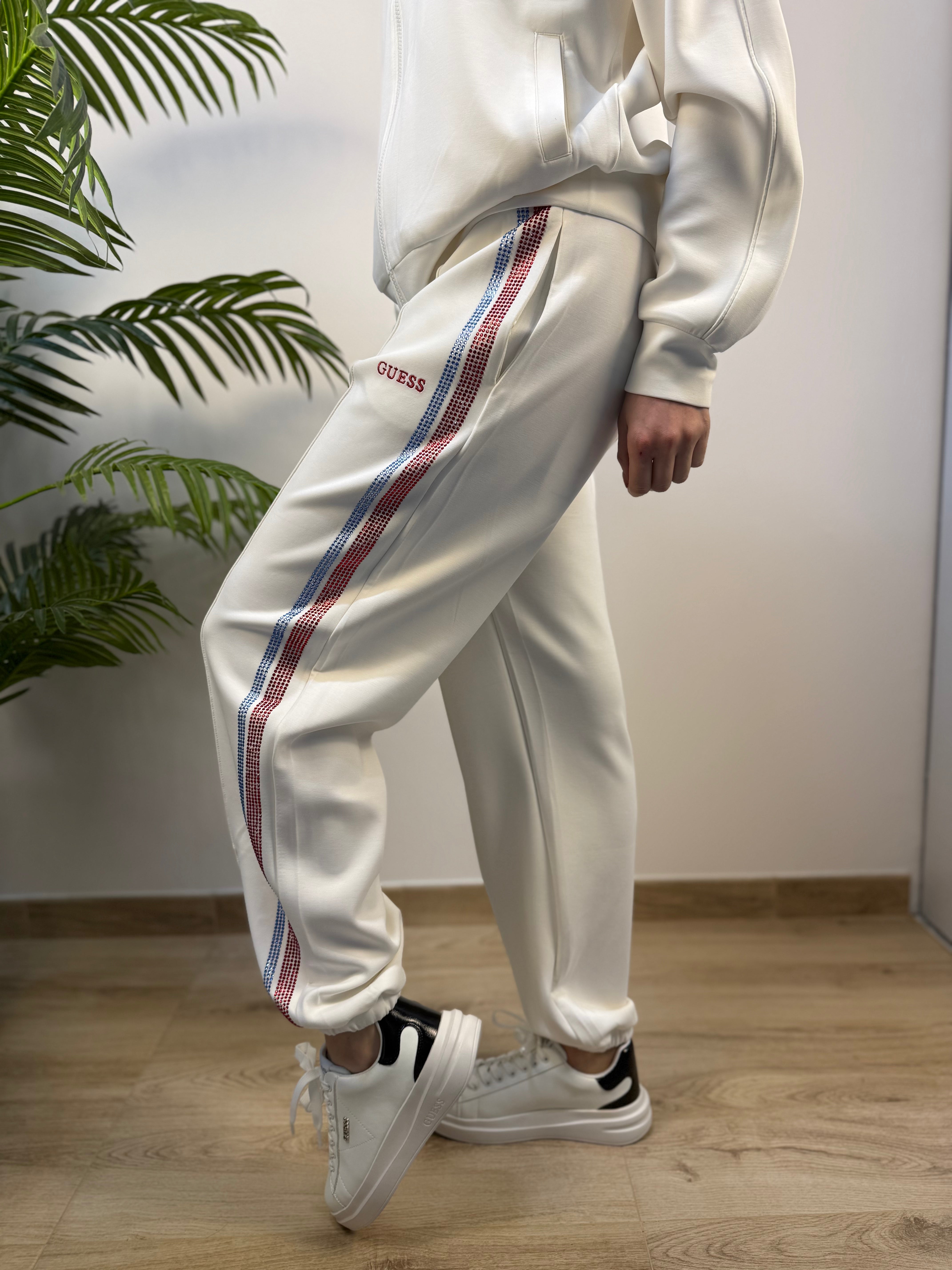 Pantalone GUESS in scuba con banda laterale in strass colorati. Coulisse in vita ed elatsico nel polsino.