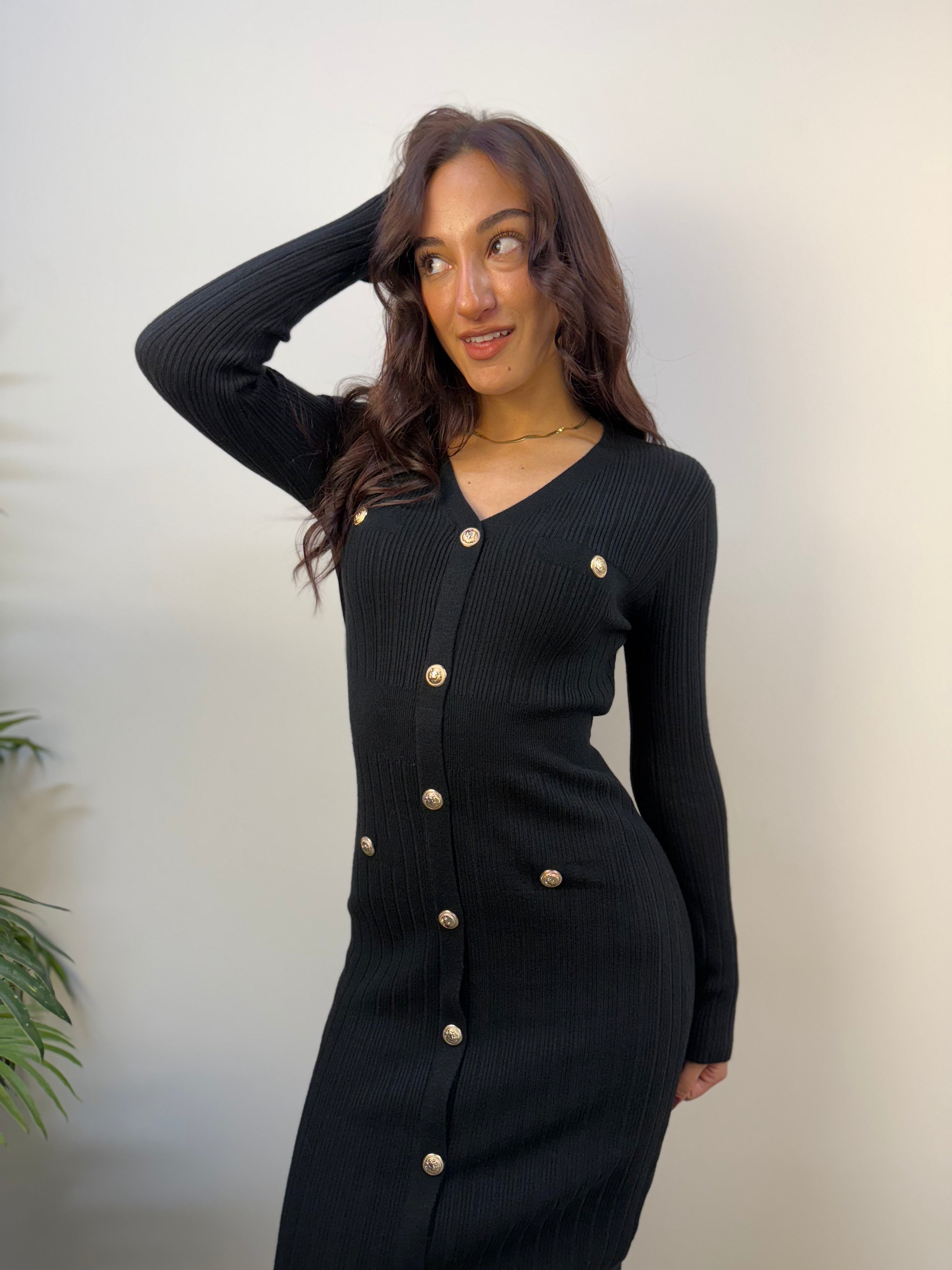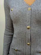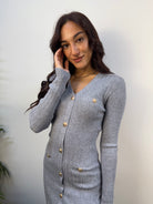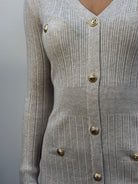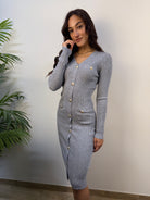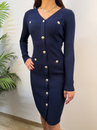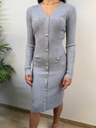 Abito in maglia Akè dal design femminile e contemporaneo, realizzato in morbida viscosa elasticizzata che assicura una vestibilità aderente ma confortevole. Lo scollo a V valorizza la silhouette, mentre la trama a righe e le diverse varianti colore donano al capo un carattere moderno e versatile. A impreziosire la tinta unita, il dettaglio dei bottoni metallici oro aggiunge un tocco luminoso ed elegante. Un abito caldo e raffinato, ideale per affrontare la stagione con stile e comfort.