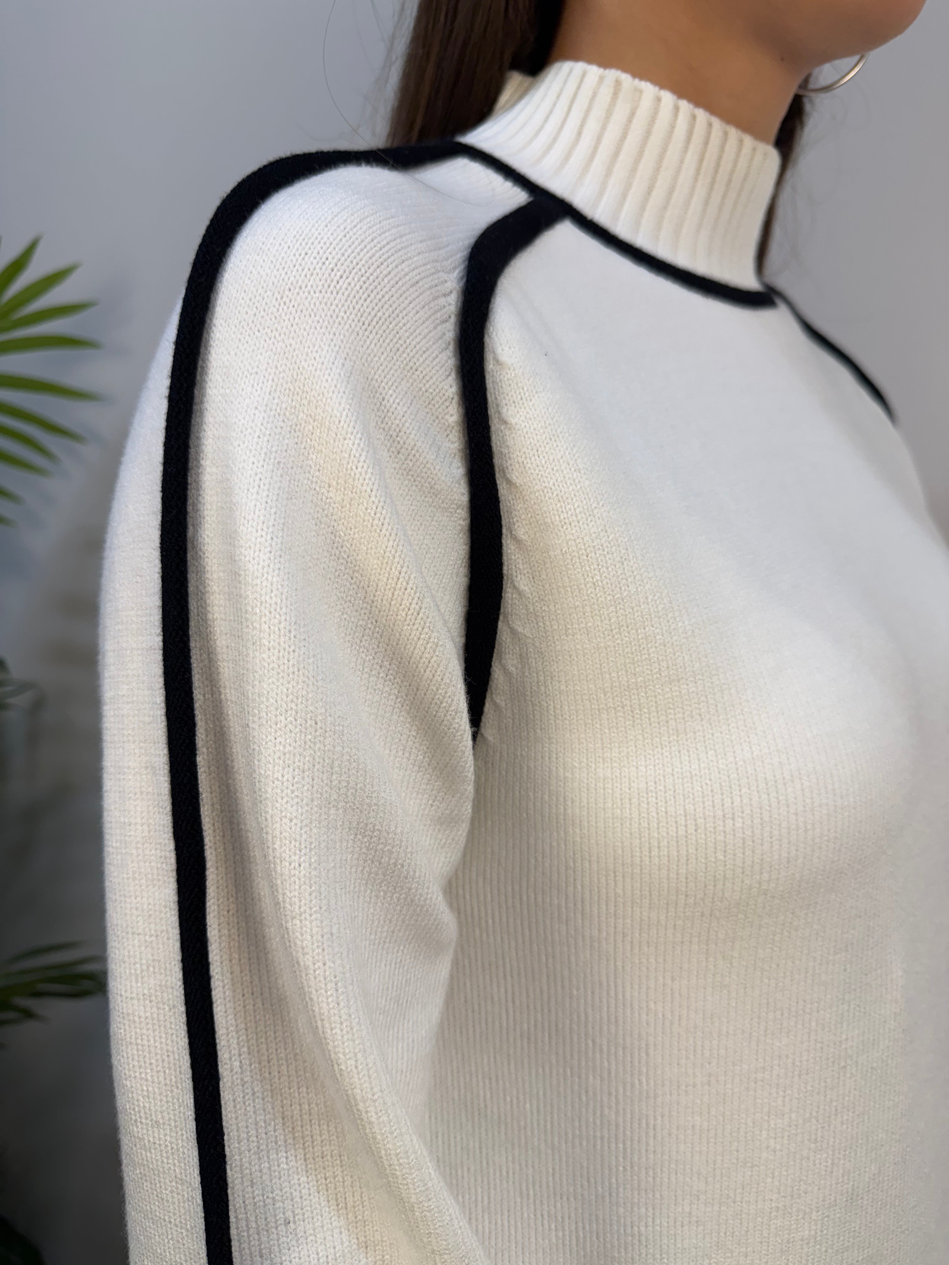 Abito Artigli in maglia tinta unita, proposto nelle delicate varianti colore nero e avorio, con un elegante collo alto che valorizza il décolleté in modo discreto. Il design è impreziosito da un bordo a contrasto in tessuto a taglio vivo, che aggiunge un tocco moderno e sofisticato al capo. Collo, polsini e fascione sono rifiniti a costine, per un dettaglio strutturato che completa la vestibilità. La linea è fluida e raffinata, con una vestibilità che cade morbida sui fianchi, valorizzando la silhouette senza costringerla. Un abito versatile e femminile, perfetto per le occasioni speciali o per un look elegante da giorno.