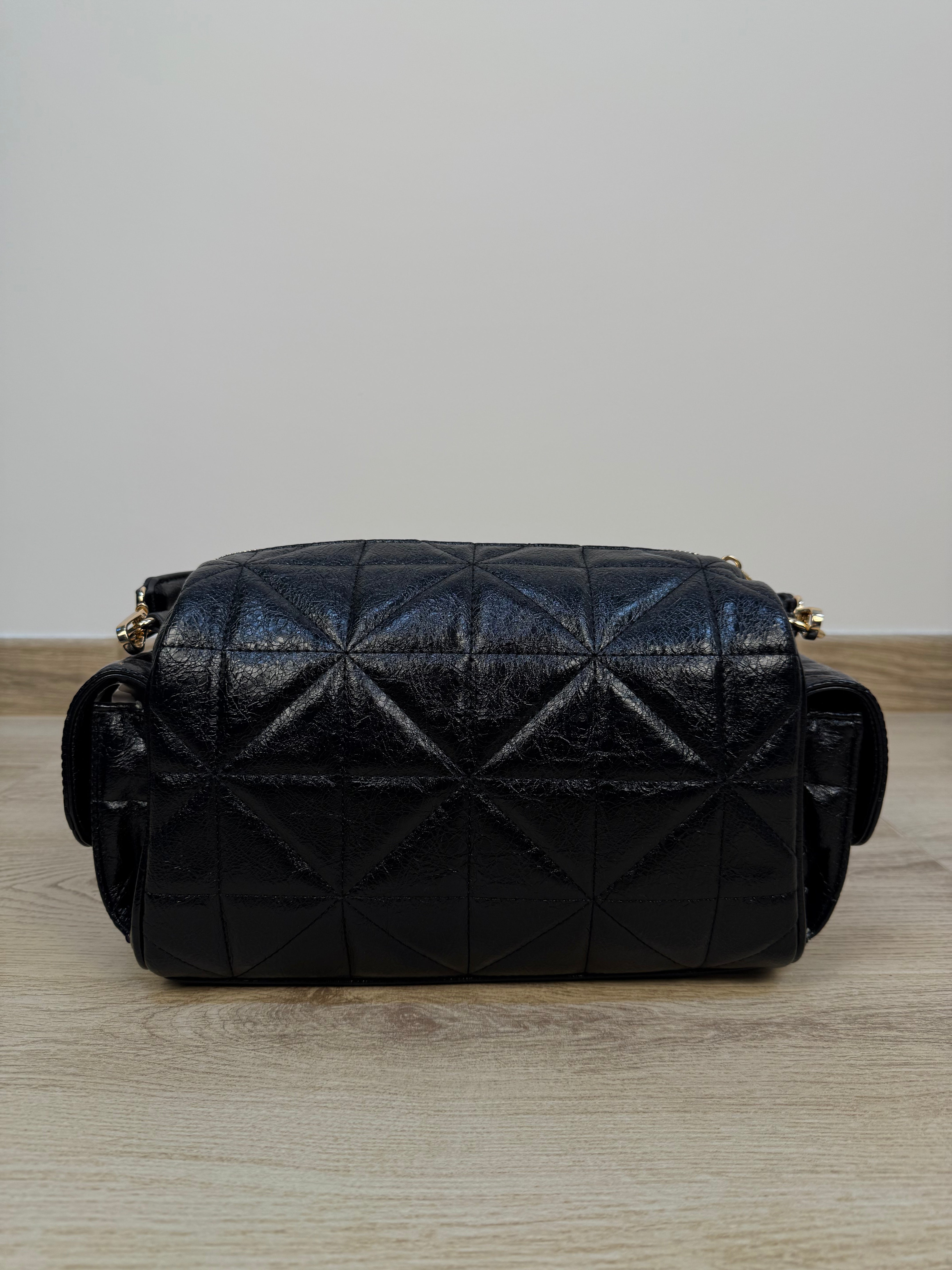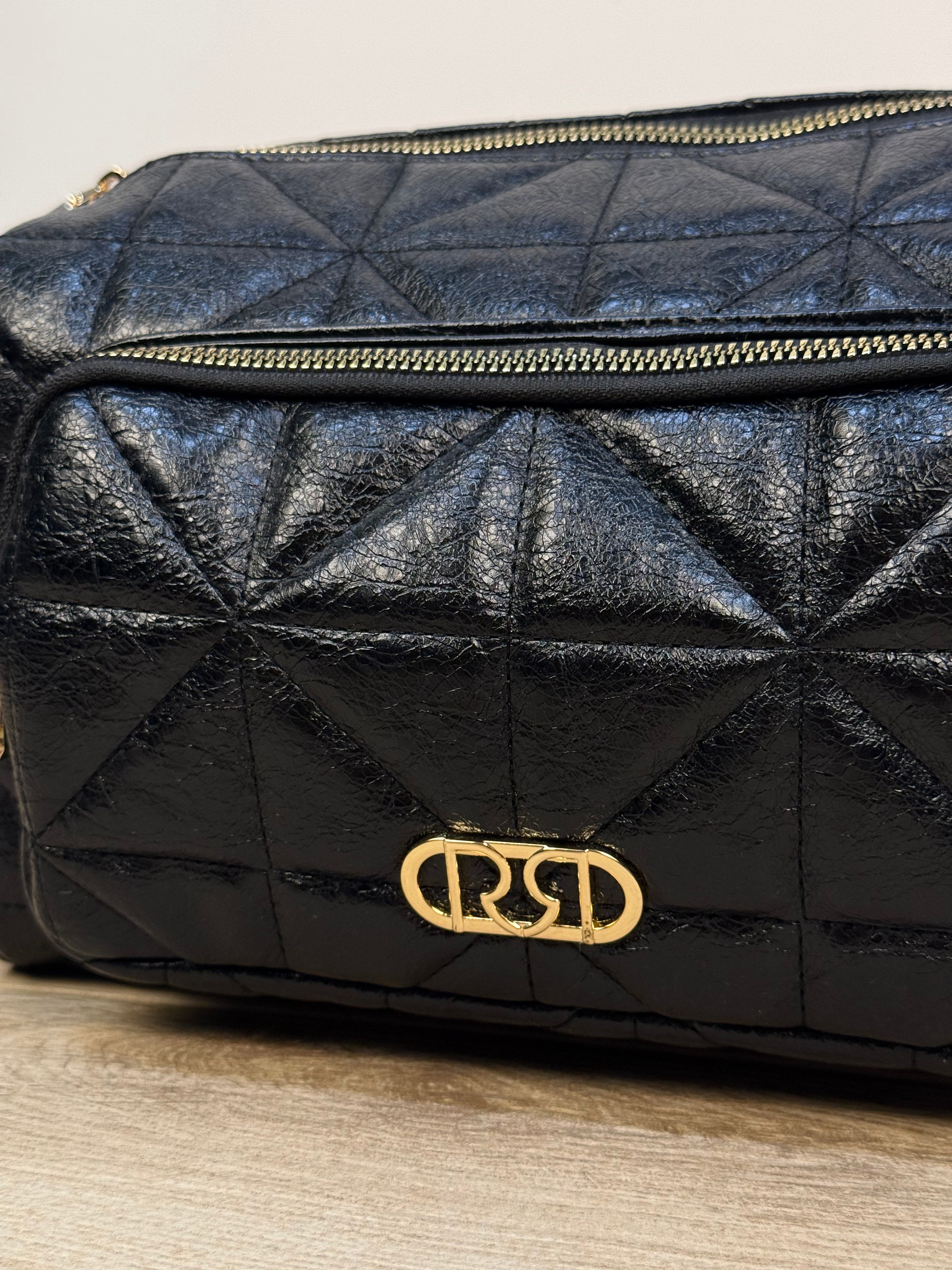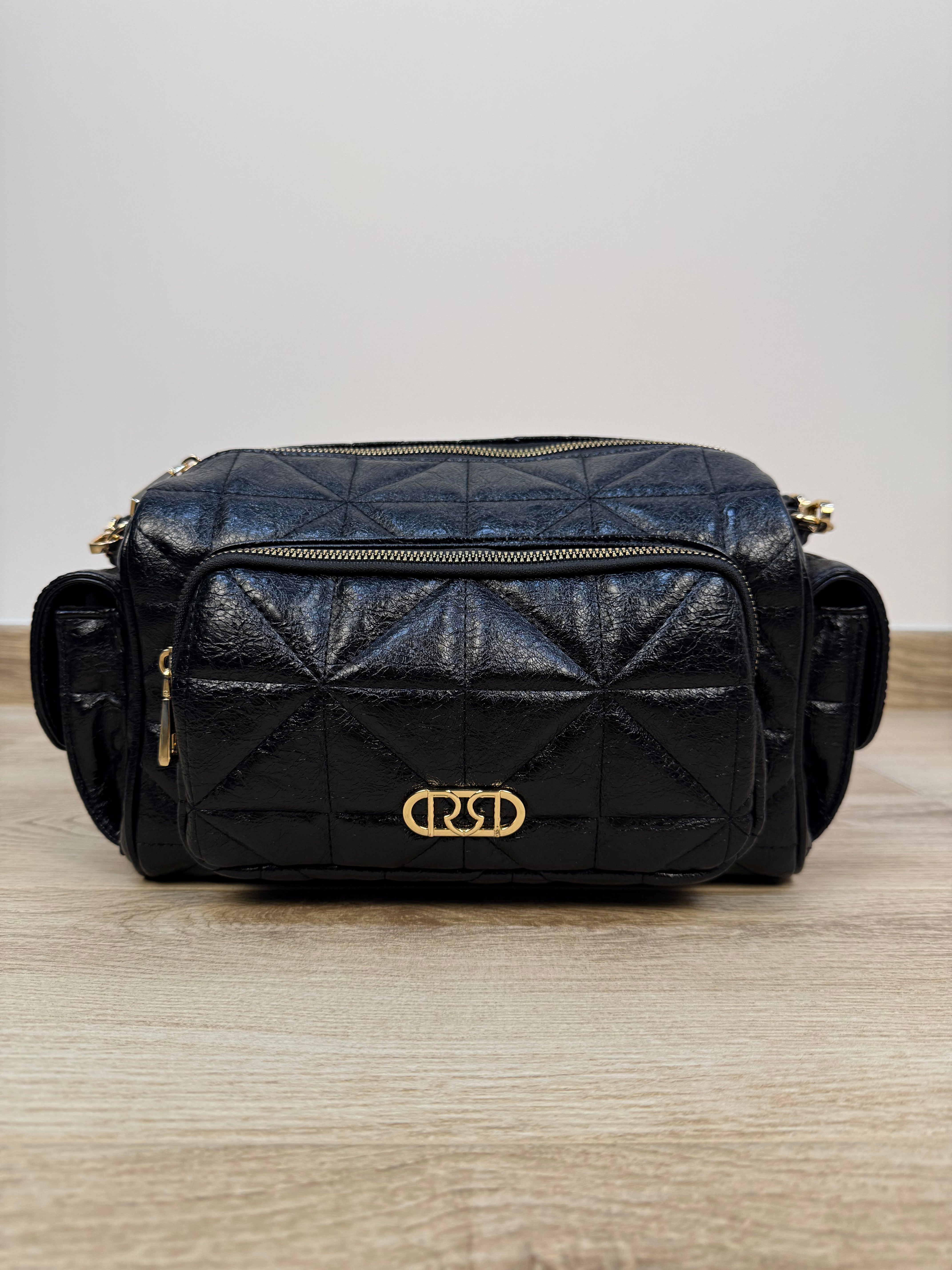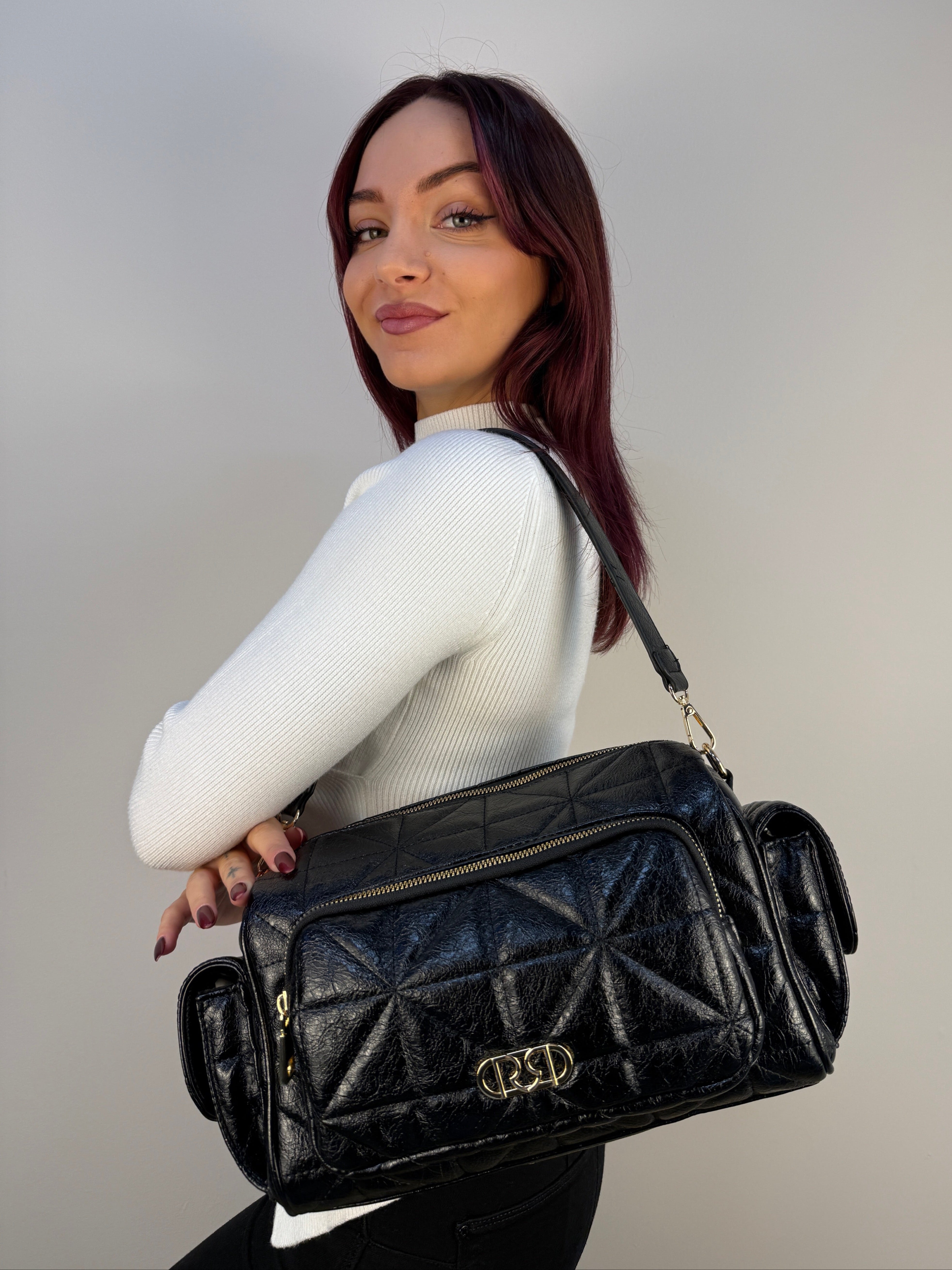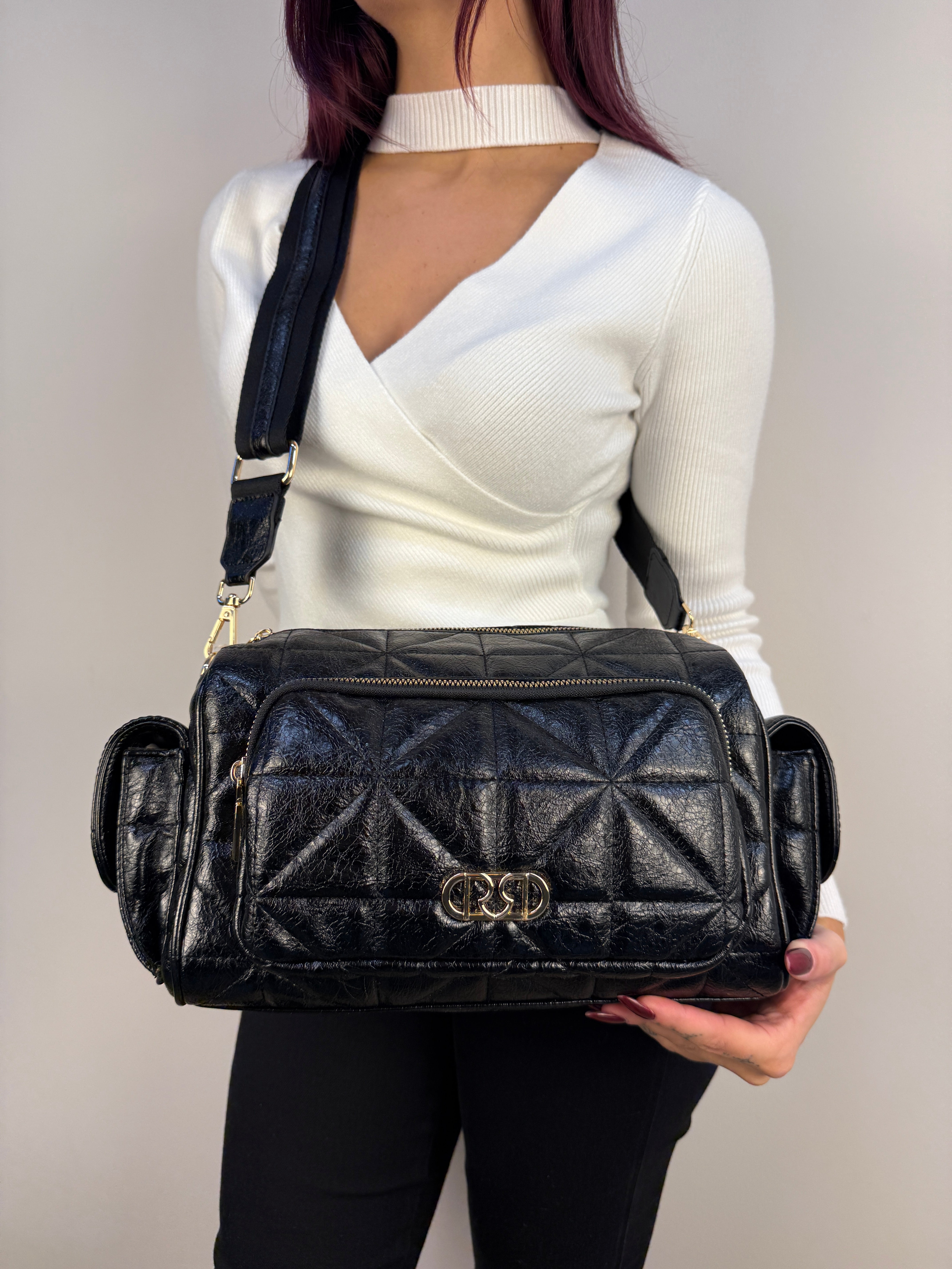 Pratica e di carattere, questa borsa reporter Rinascimento unisce funzionalità e stile contemporaneo. Realizzata in similpelle lucida trapuntata, si distingue per le tasche laterali con chiusura a bottoni a pressione, perfette per riporre piccoli oggetti in modo sicuro e accessibile. La tasca frontale con zip è impreziosita da un elegante logo metallico dorato, che si abbina ai dettagli e agli accessori in finitura oro, aggiungendo un tocco di raffinatezza all’intero design. Il vano principale è ampio e protetto da una chiusura con zip, all’interno del quale si trova una tasca interna con zip per organizzare al meglio gli effetti personali. Per una portabilità versatile, la borsa è dotata sia di manici che di una tracolla regolabile e removibile.