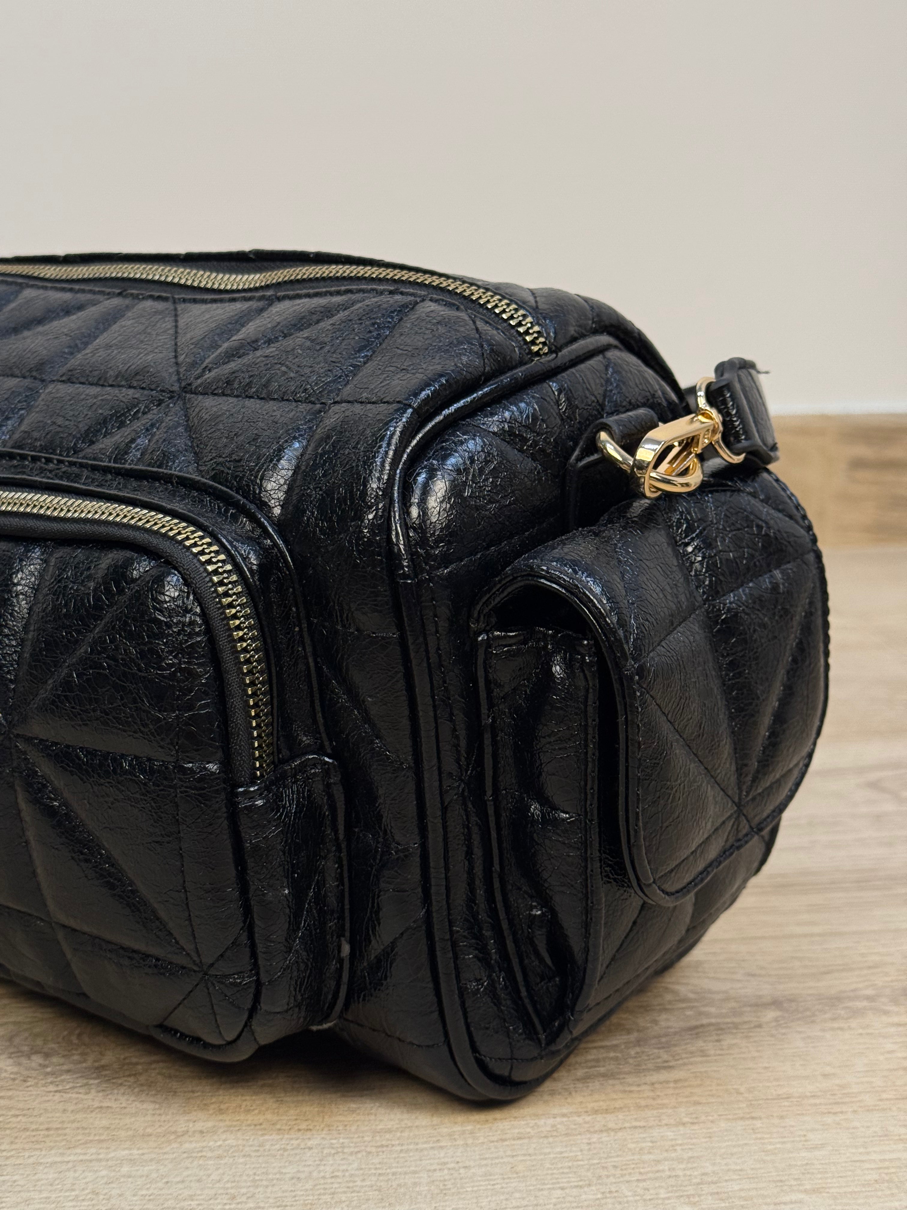 Borsa reporter in similpelle lucida trapuntata con dettagli oro