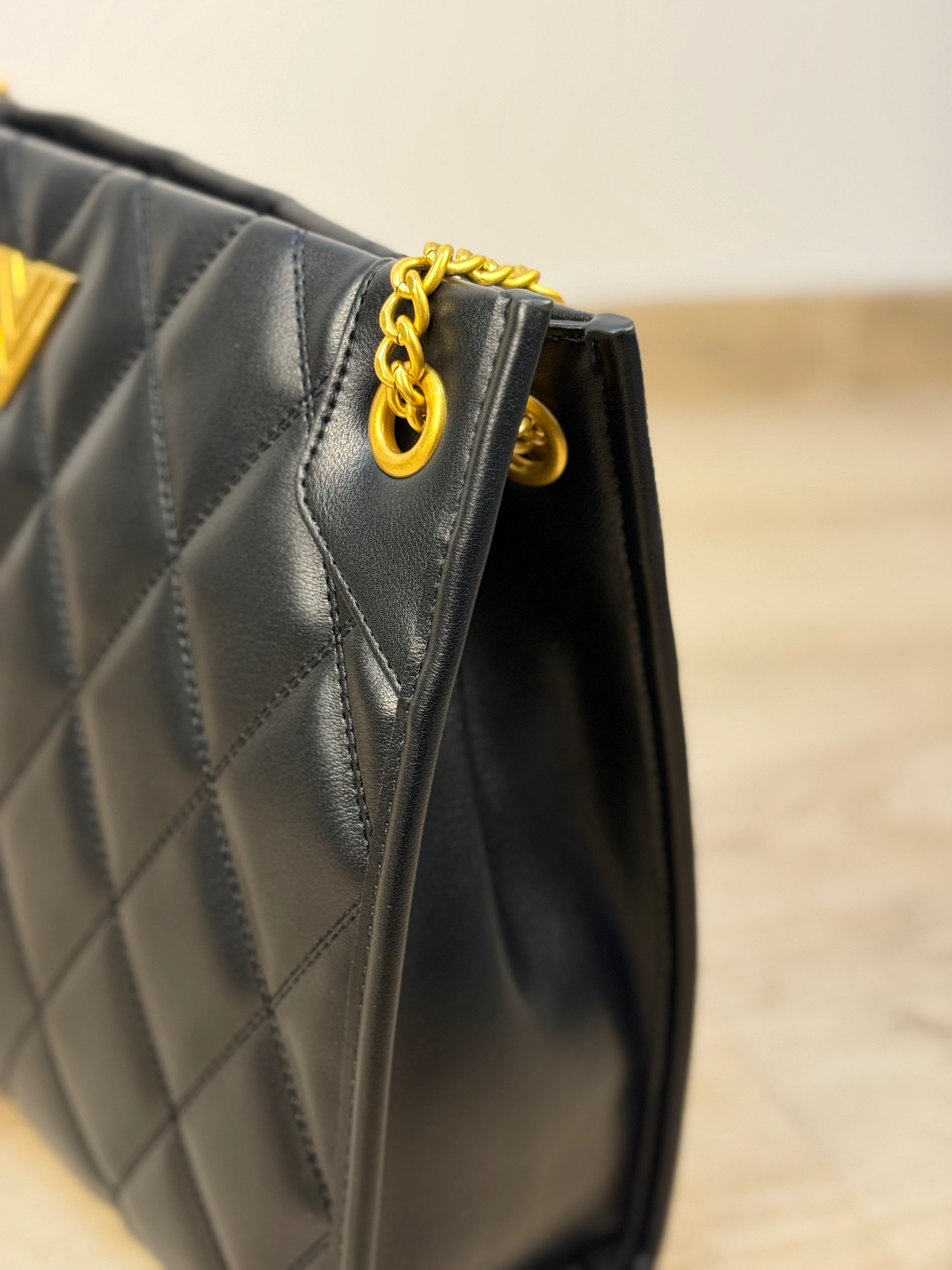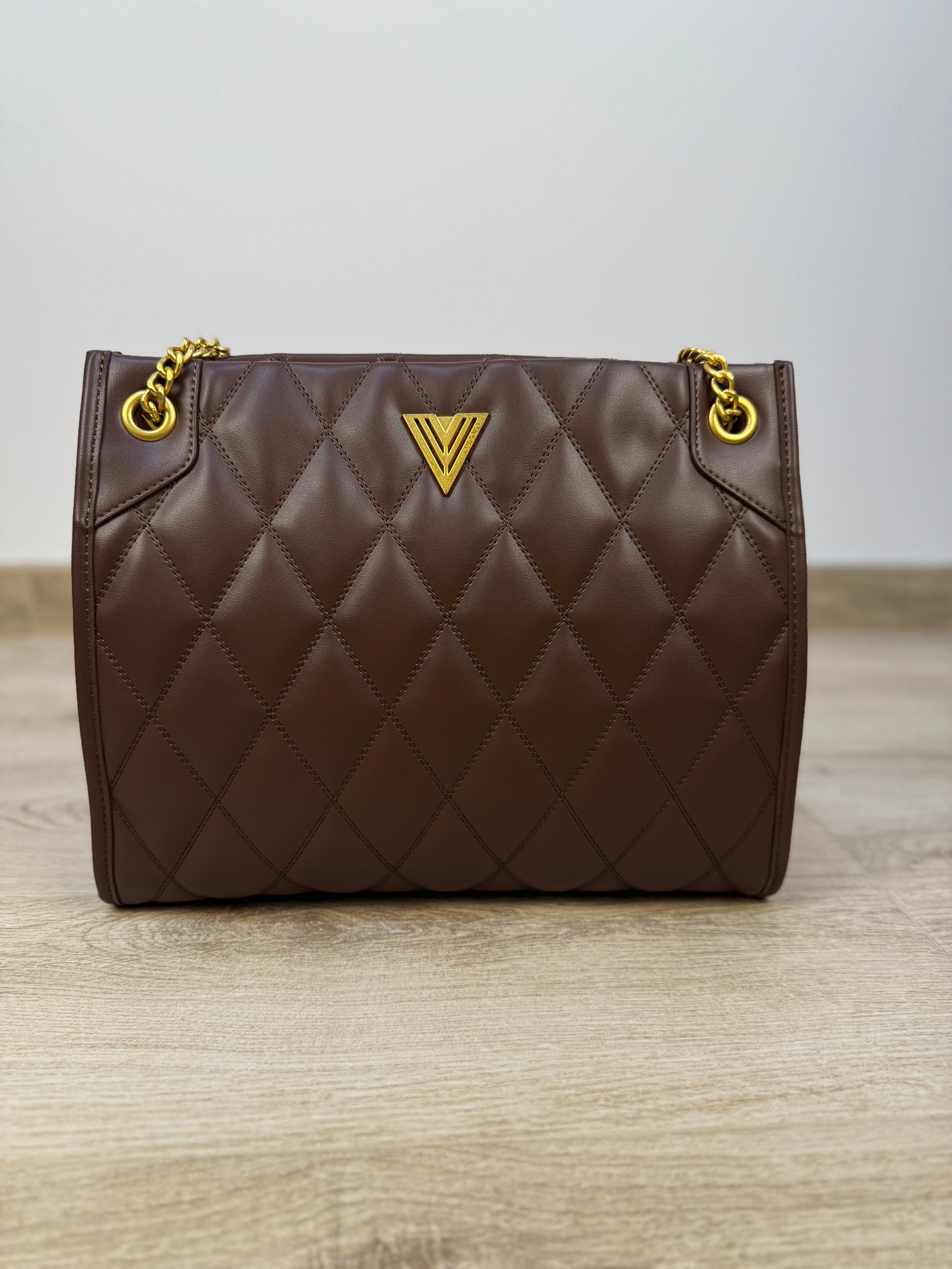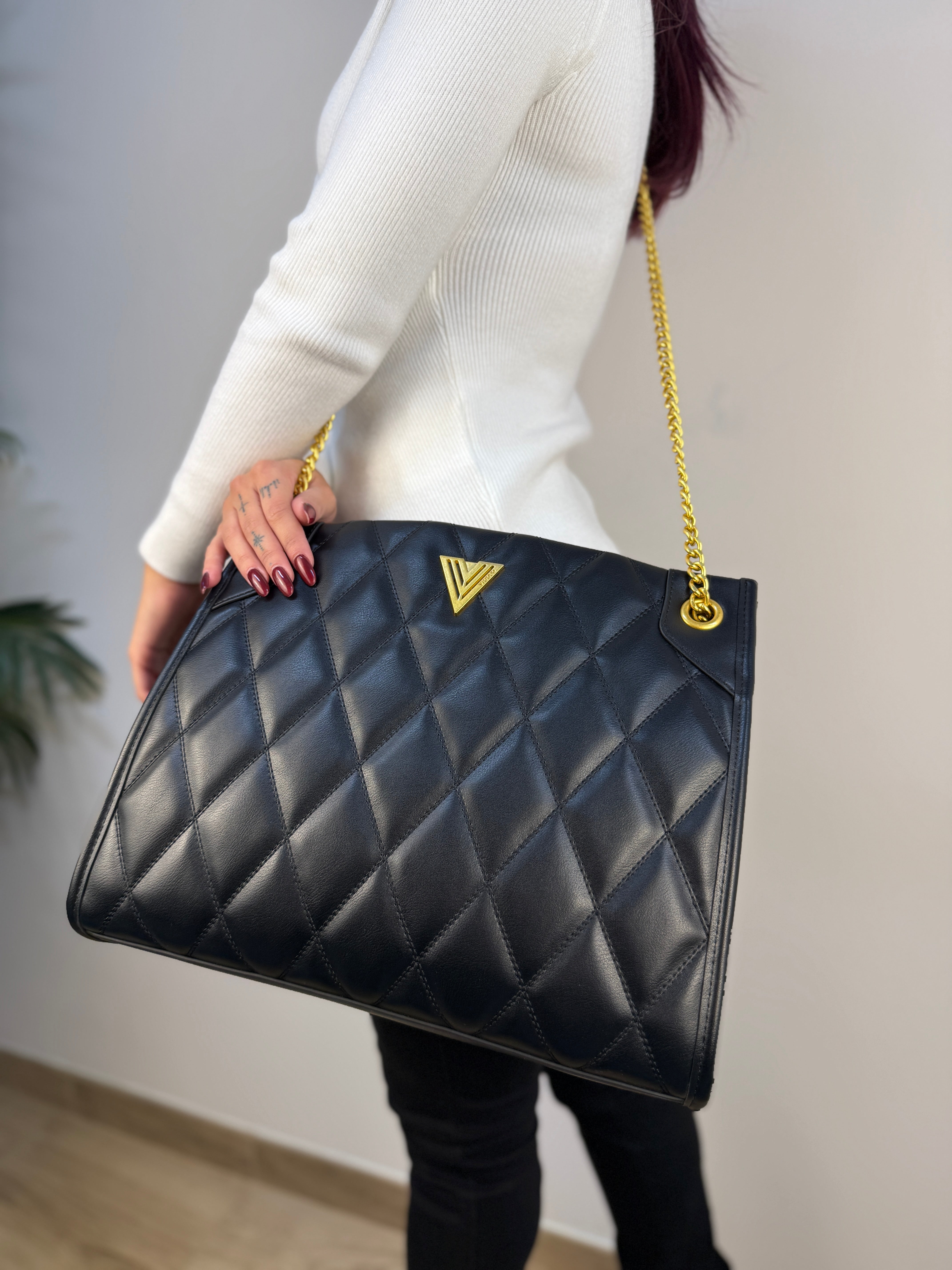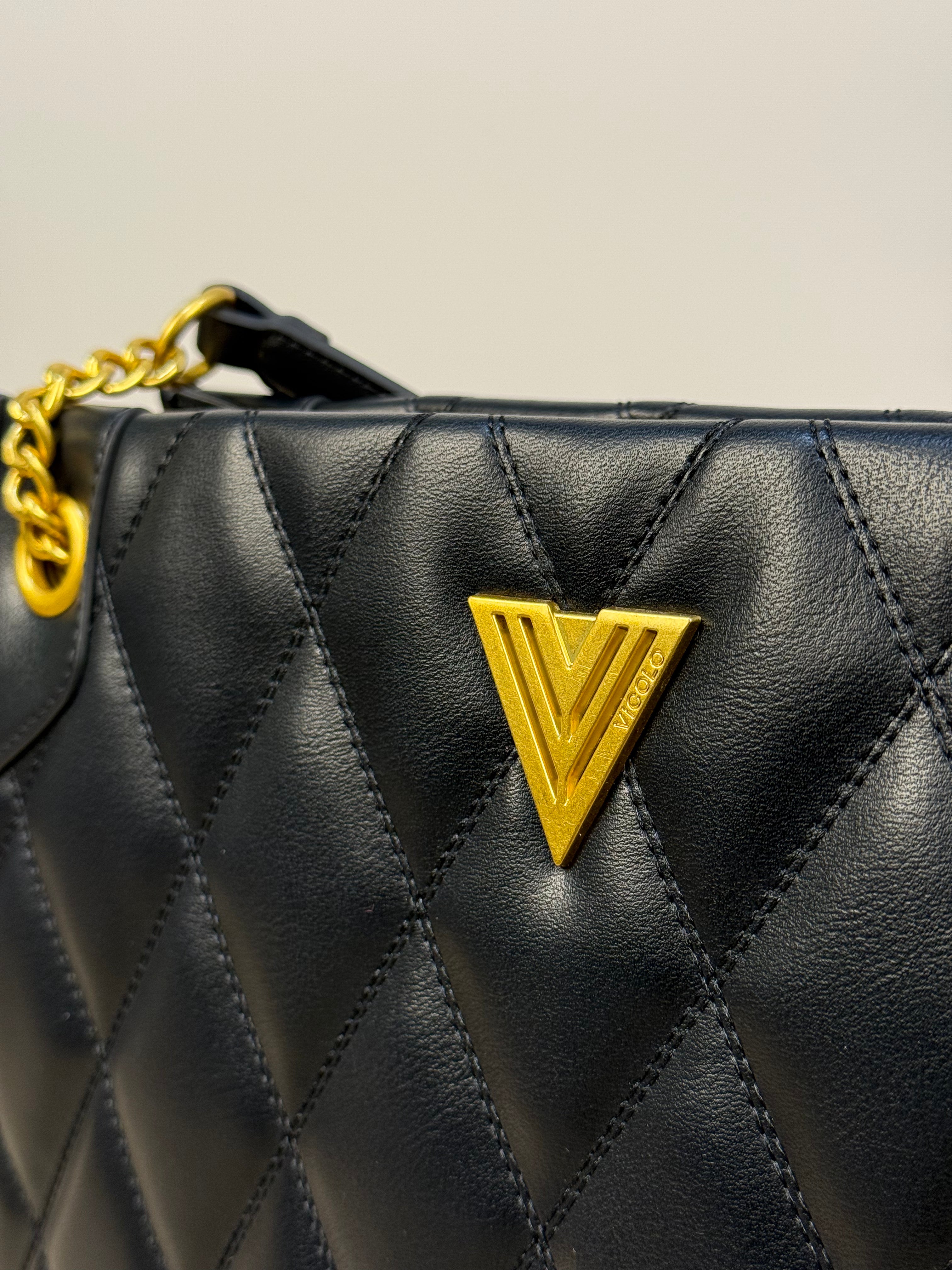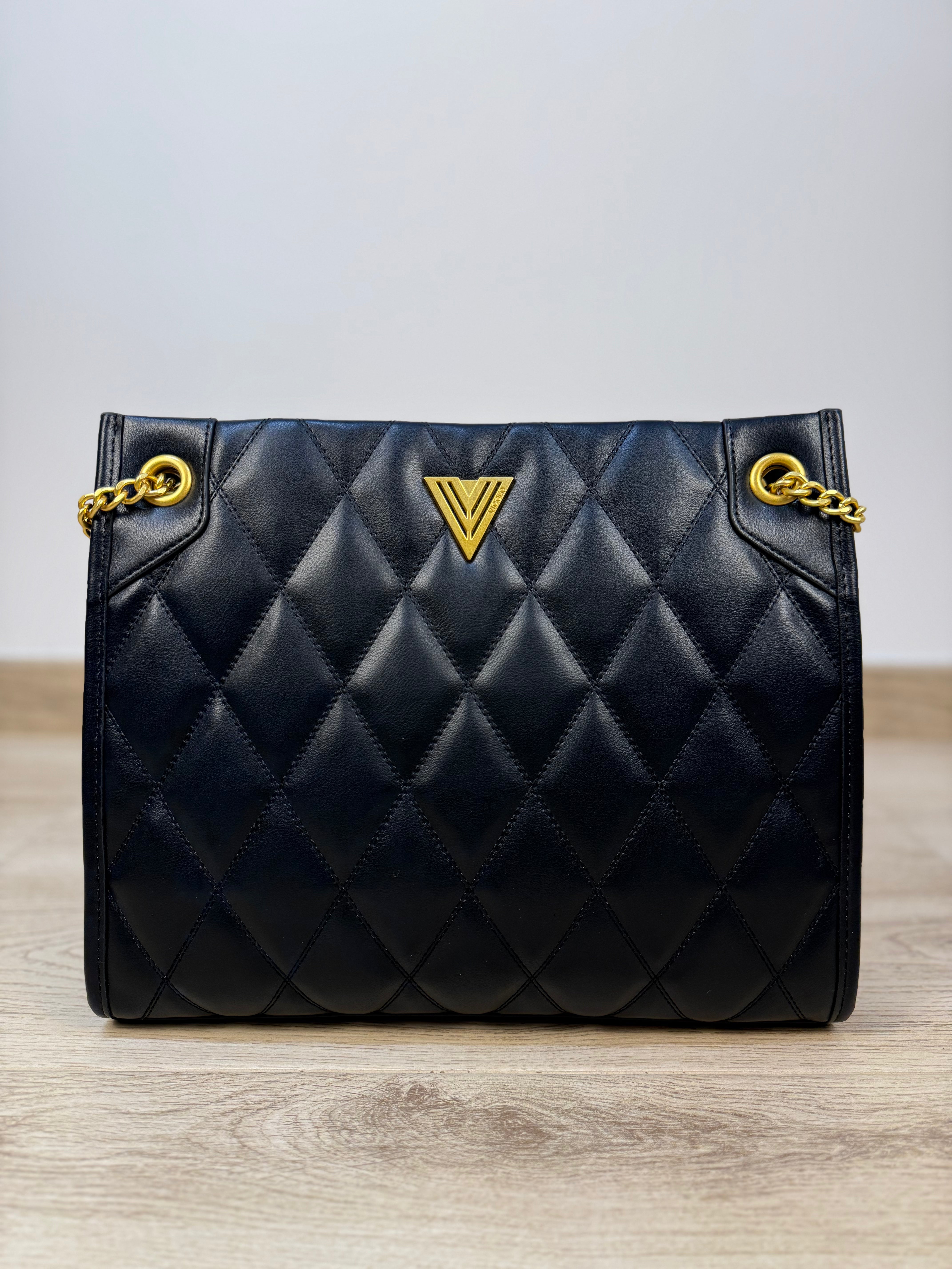 Elegante e versatile, questa borsa Vicolo in similpelle rigida è l'accessorio perfetto per completare ogni look, dal giorno alla sera. La texture trapuntata dona un tocco raffinato, mentre la catena dorata aggiunge un dettaglio glam e sofisticato. Dotata di chiusura con bottone a calamita interno, garantisce praticità e sicurezza. Il logo metallico frontale impreziosisce il design con un accento distintivo. All'interno, la borsa è foderata e presenta una tasca con zip per custodire gli oggetti più preziosi, oltre a una tasca aperta ideale per avere piccoli accessori sempre a portata di mano. Un must-have di stagione, perfetto per chi ama uno stile chic e contemporaneo.