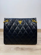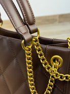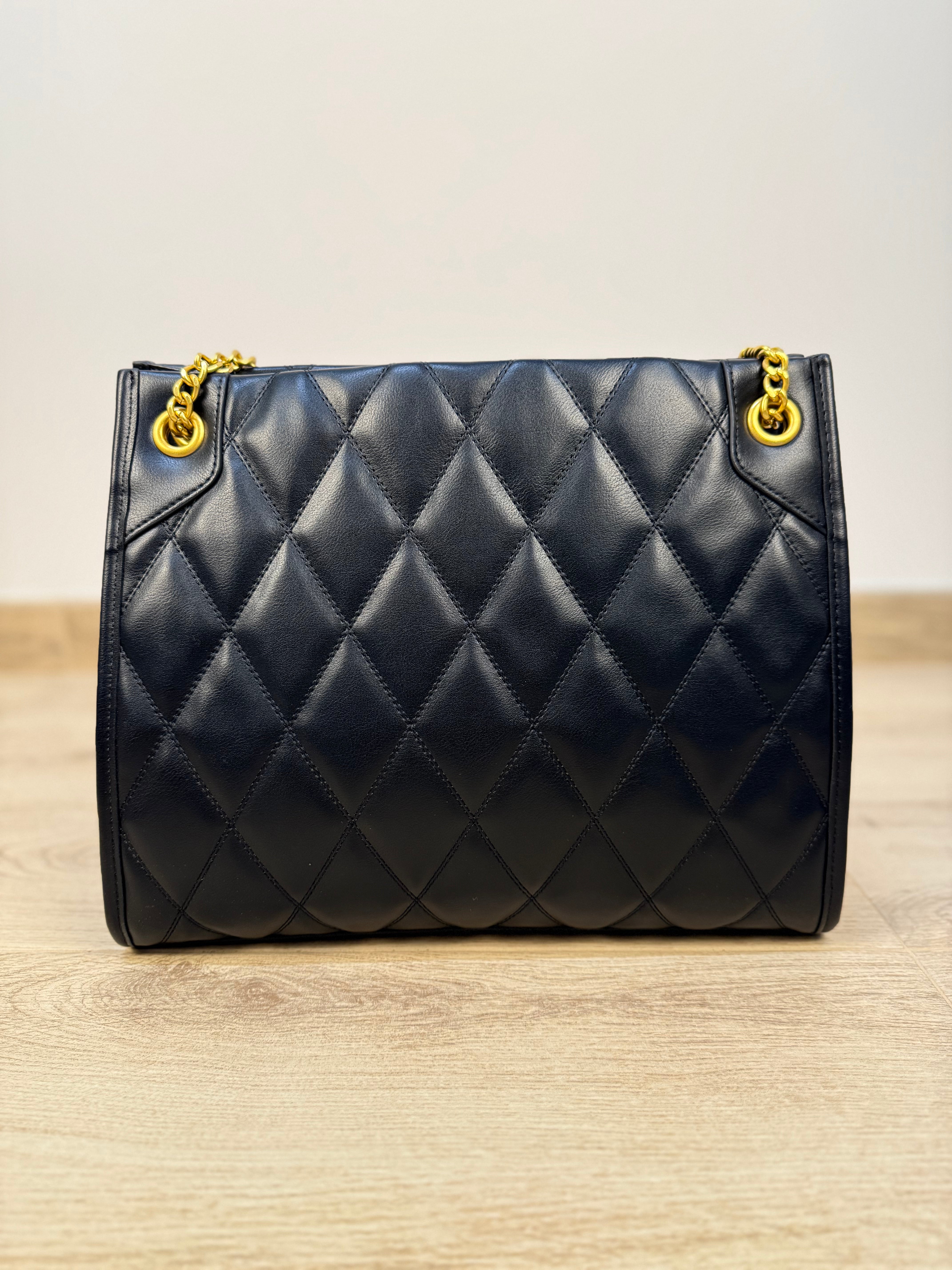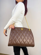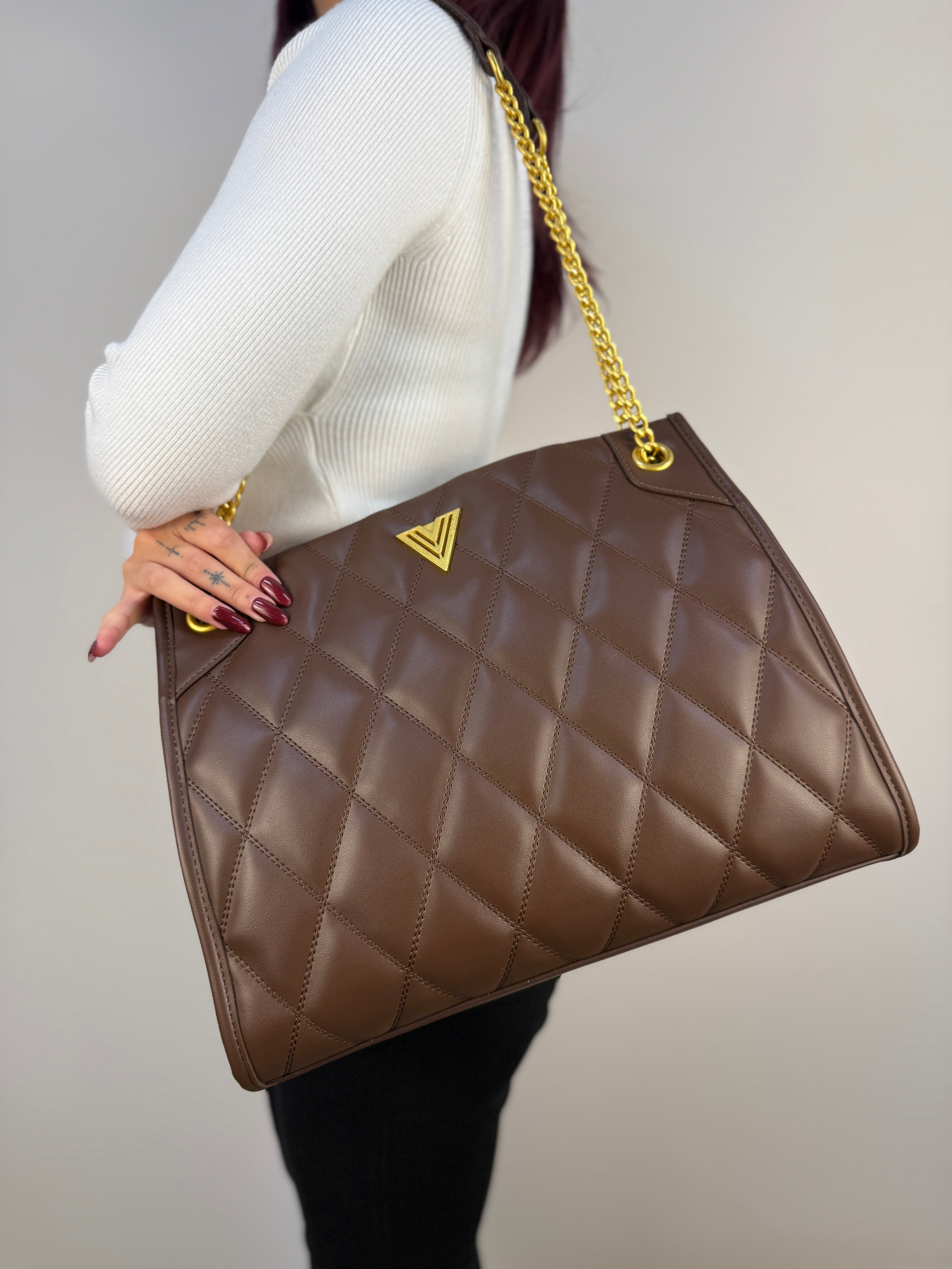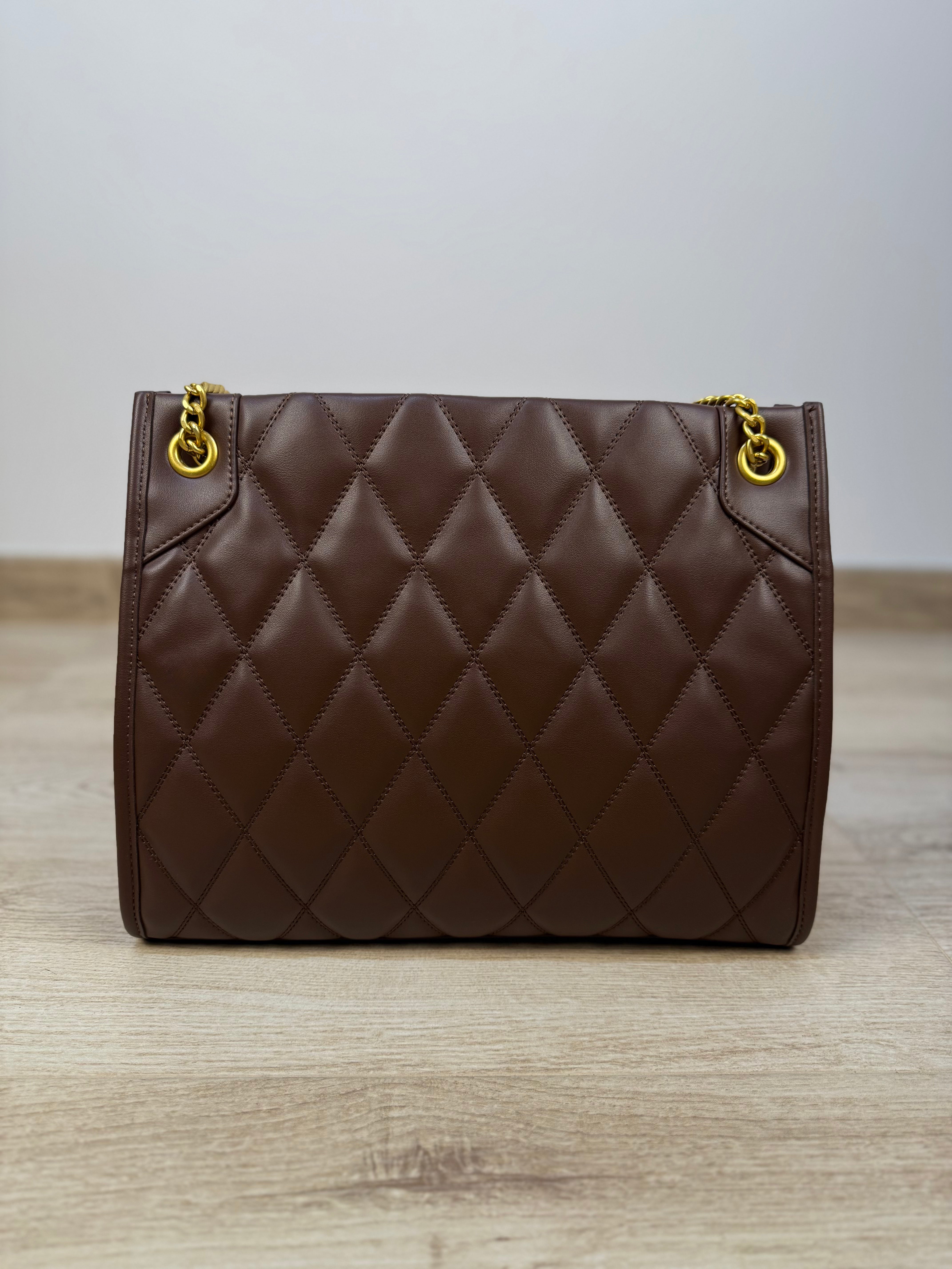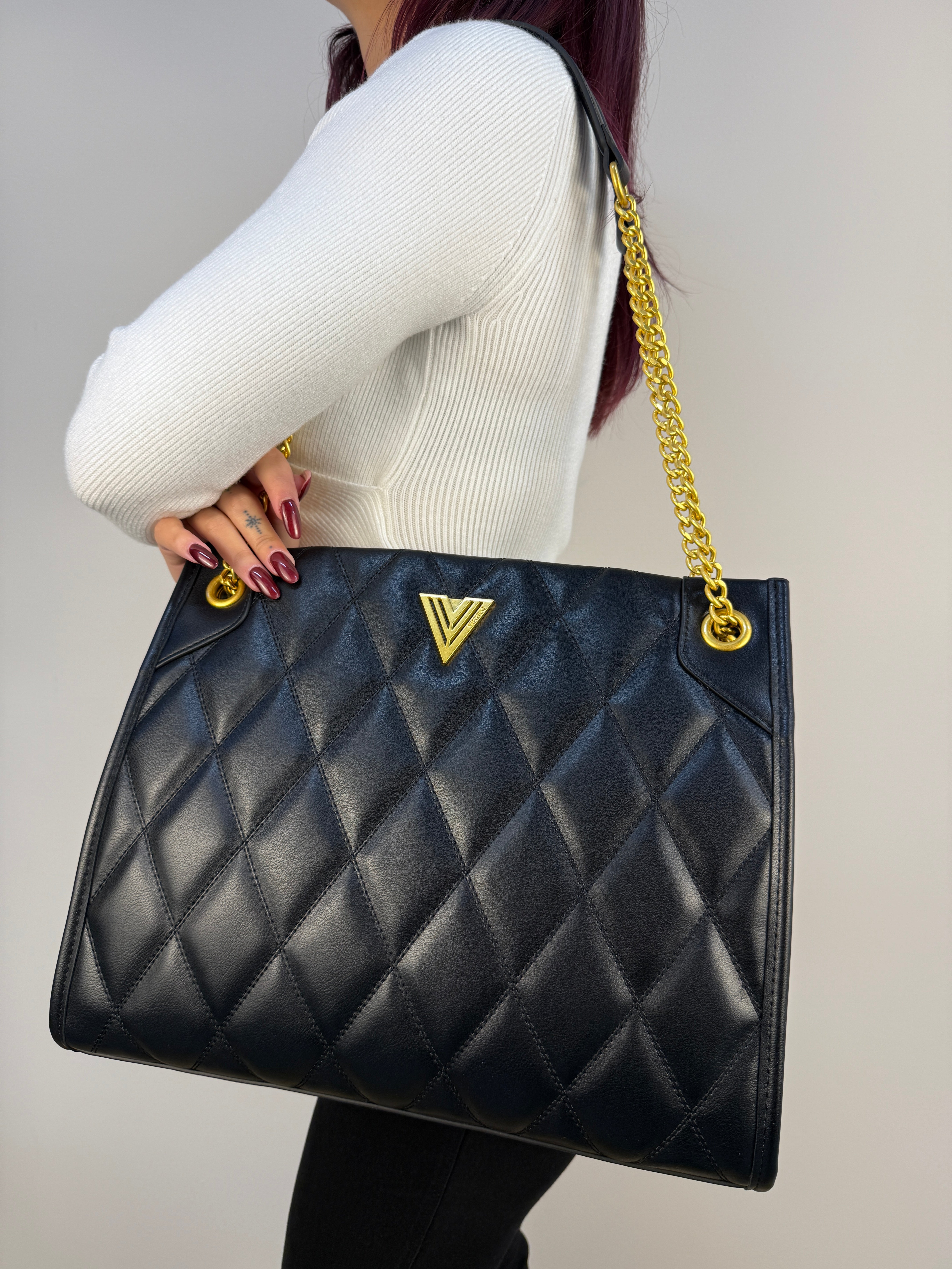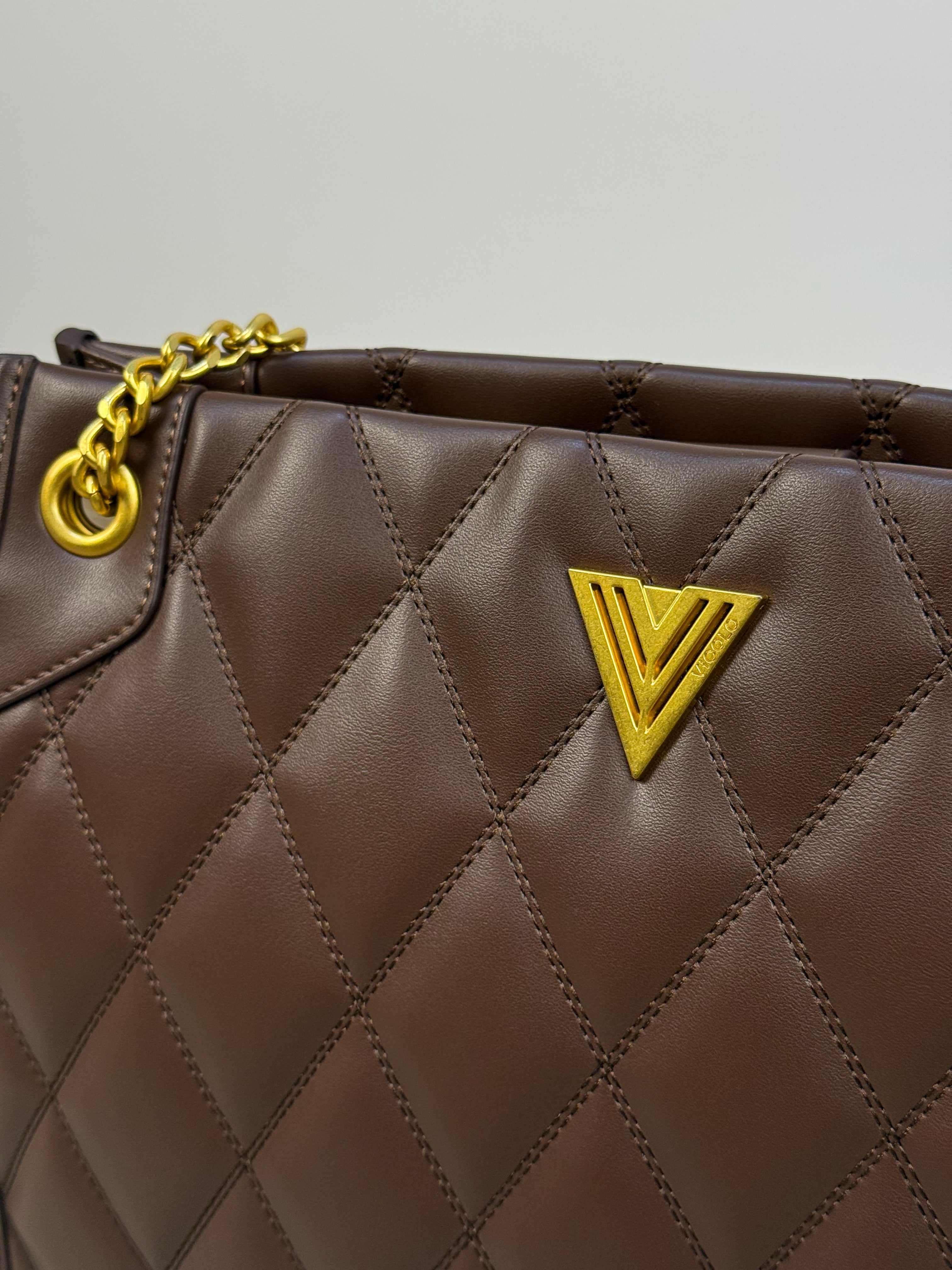 Elegante e versatile, questa borsa Vicolo in similpelle rigida è l'accessorio perfetto per completare ogni look, dal giorno alla sera. La texture trapuntata dona un tocco raffinato, mentre la catena dorata aggiunge un dettaglio glam e sofisticato. Dotata di chiusura con bottone a calamita interno, garantisce praticità e sicurezza. Il logo metallico frontale impreziosisce il design con un accento distintivo. All'interno, la borsa è foderata e presenta una tasca con zip per custodire gli oggetti più preziosi, oltre a una tasca aperta ideale per avere piccoli accessori sempre a portata di mano. Un must-have di stagione, perfetto per chi ama uno stile chic e contemporaneo.