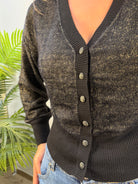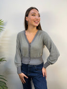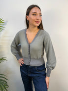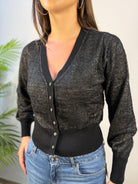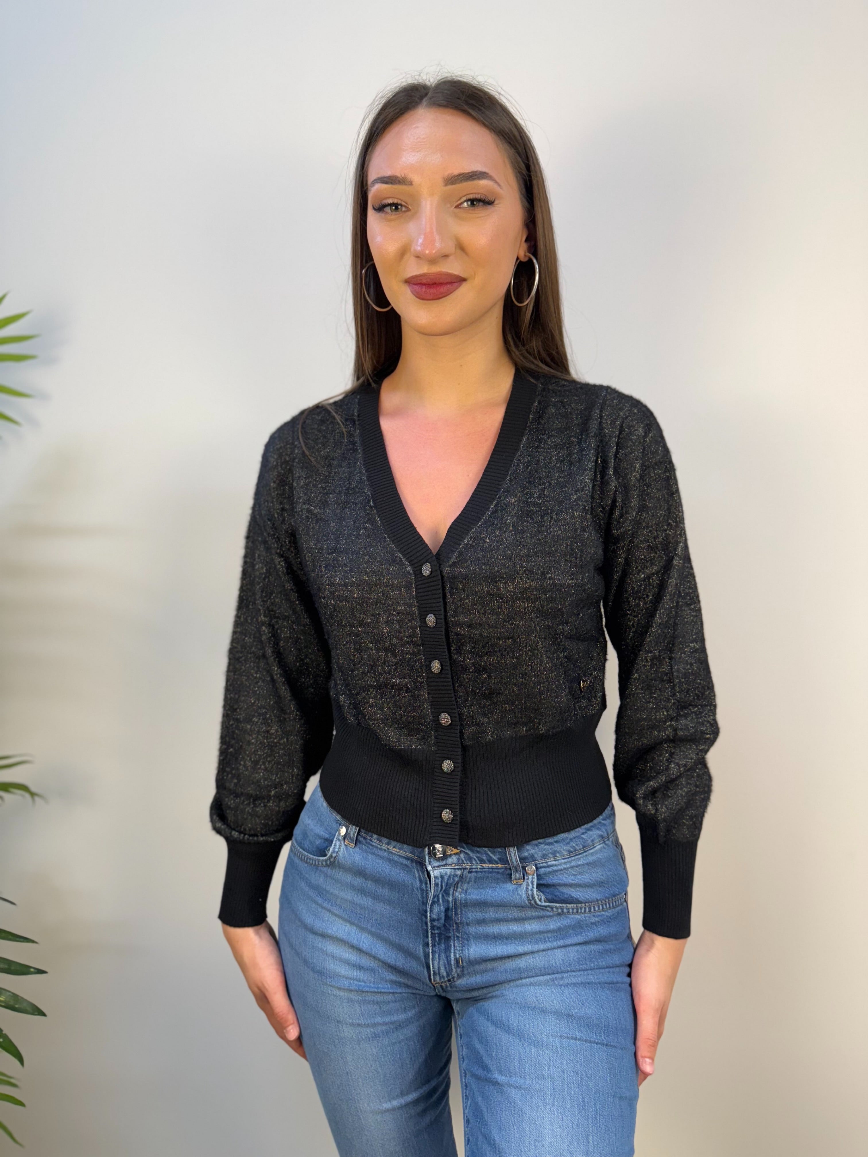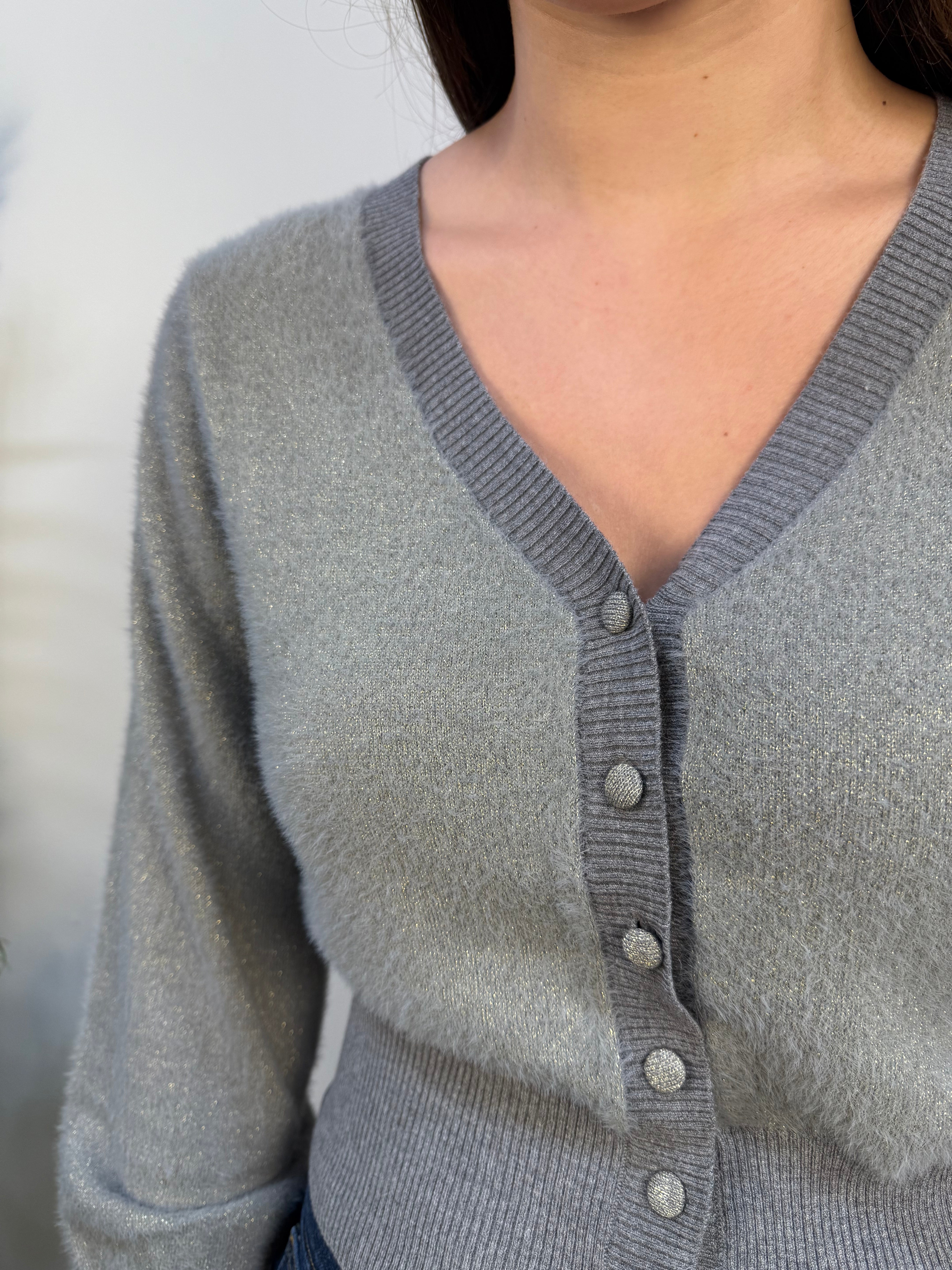 Cardigan Yes-Zee in morbido tessuto effetto fluffy, piacevole al tatto e avvolgente, ideale per aggiungere un tocco raffinato e luminoso al look. Il modello presenta uno scollo a V, chiusura con bottoni ad asola in tessuto tono su tono e una lavorazione elegante e curata nei dettagli. I polsini, il fascione e lo scollo sono realizzati a costine, per una finitura strutturata e confortevole. Il capo è impreziosito da delicati dettagli in lurex all over, che donano una luminosità sottile e sofisticata.