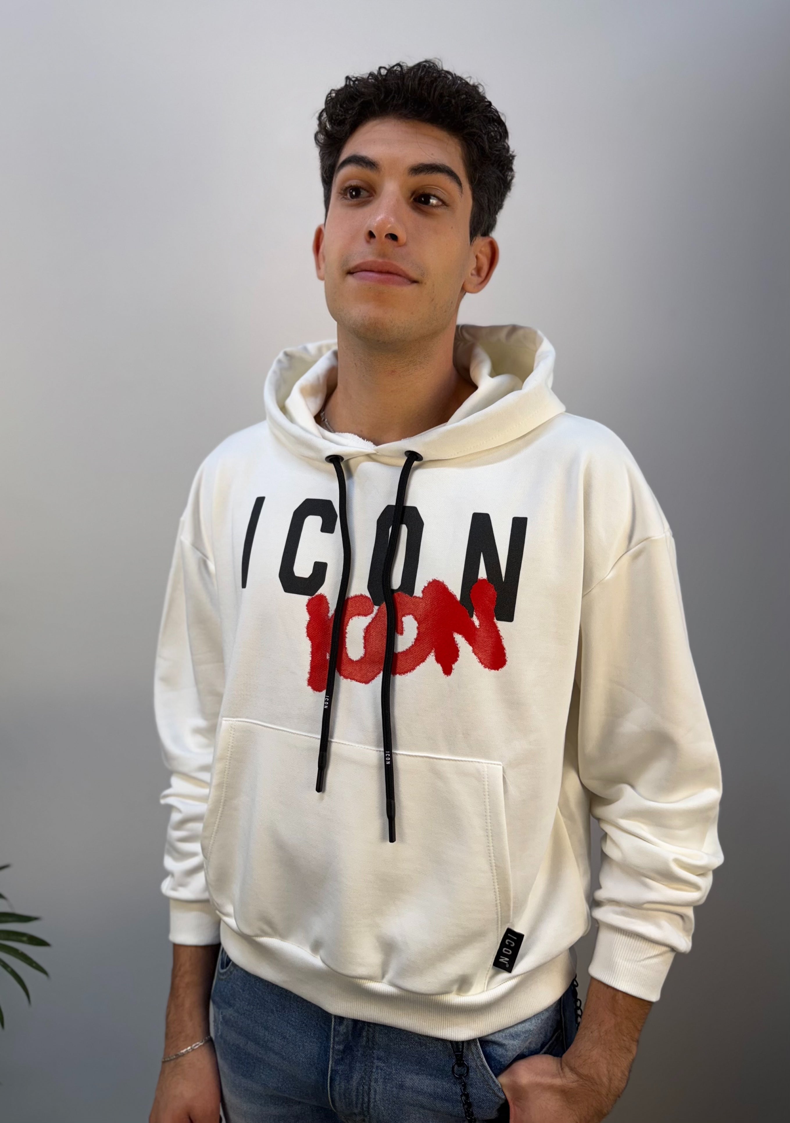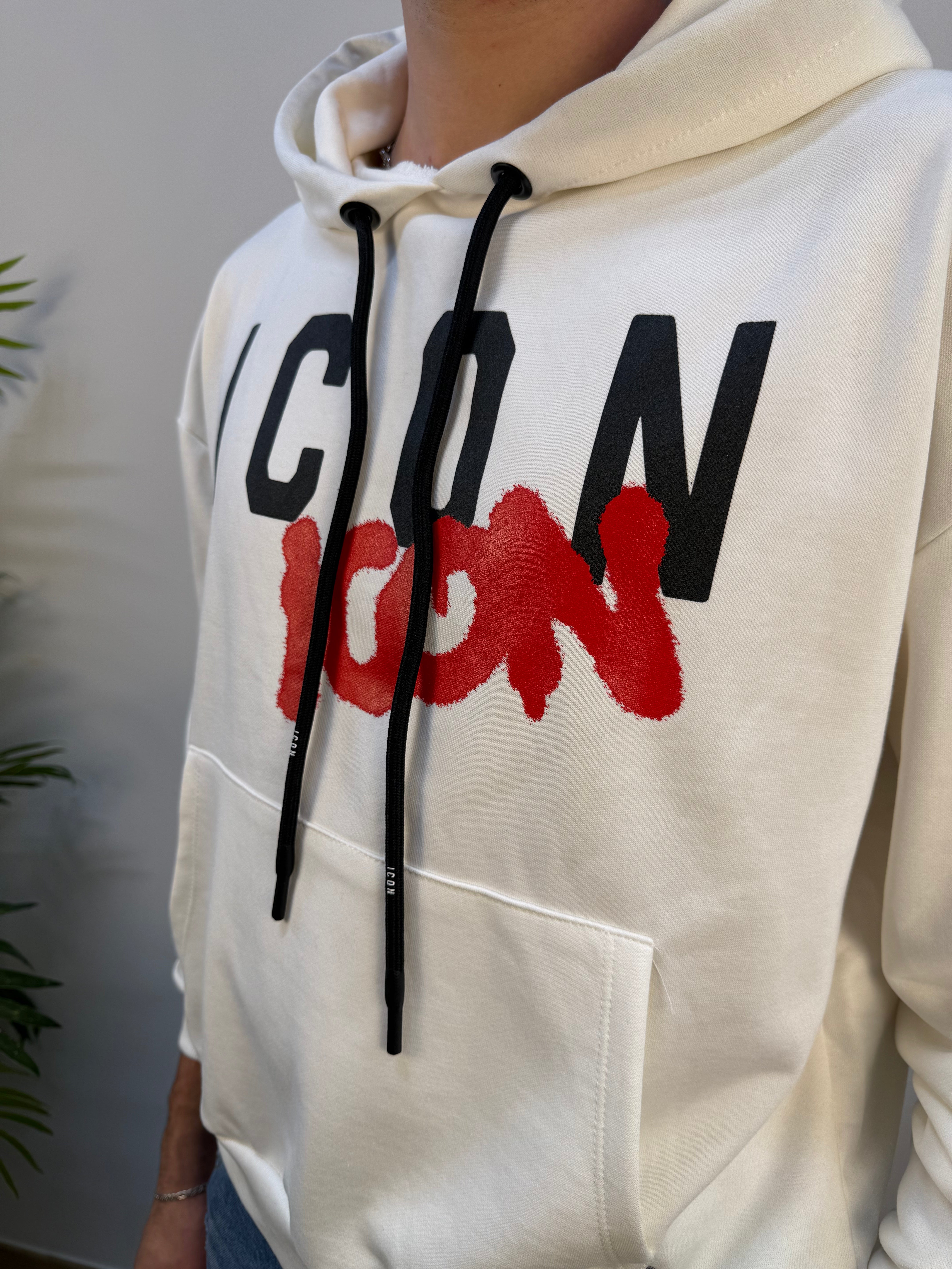 Felpa ICON color panna con interno garzato, calda e confortevole. Il design è arricchito da una maxi stampa logata a contrasto rosso e nero sul fronte, che dona carattere al capo. Dotata di cappuccio regolabile tramite lacci e ampio tascone frontale, presenta polsini e fondo a costine per una vestibilità ben definita.