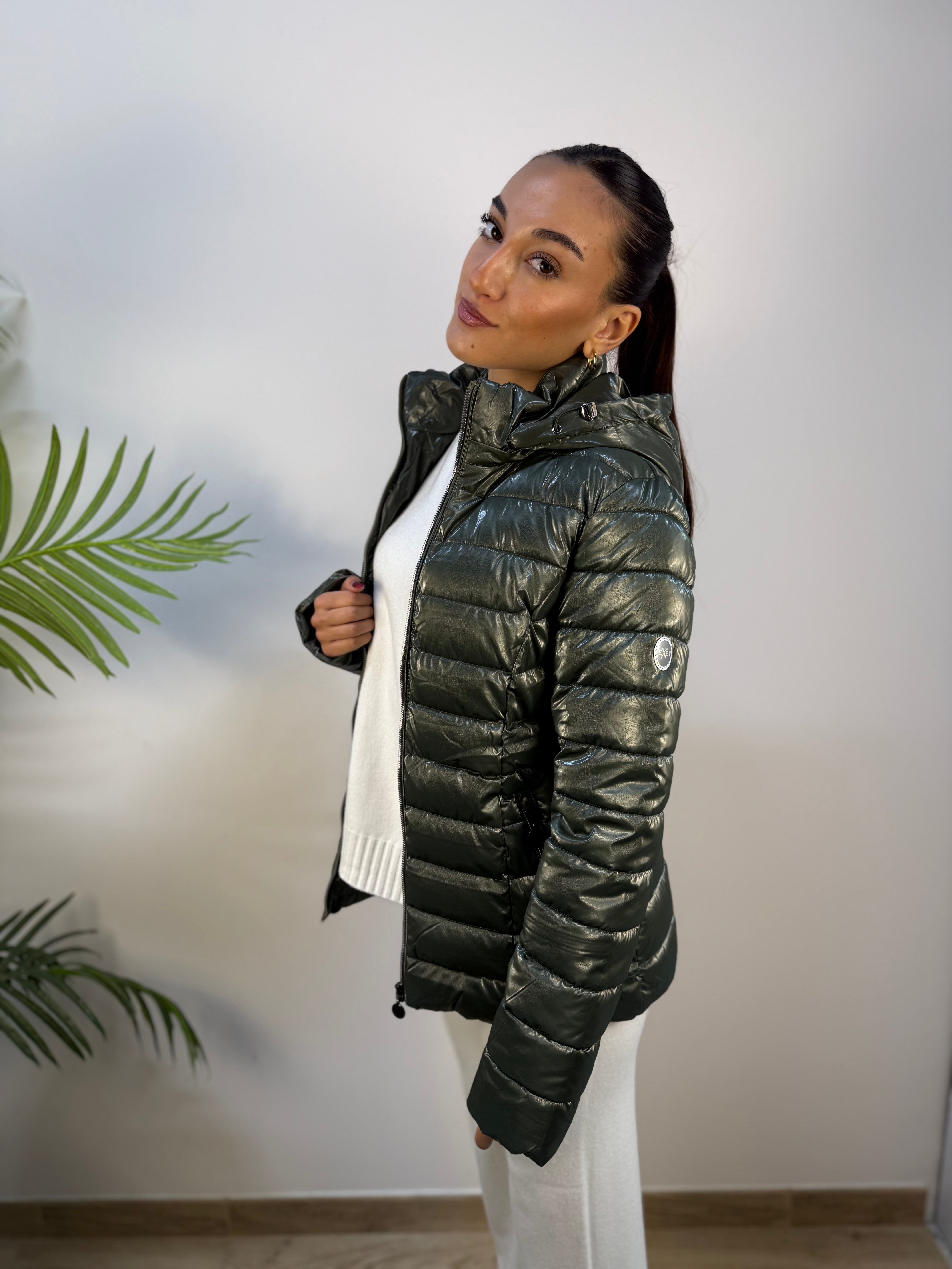 Piumino Exsy in un meraviglioso color verde effetto lucido, con chiusura frontale a zip e tasche frontali con zip argento. Dotato di cappuccio removibile, unisce stile e praticità per un look moderno e sofisticato.