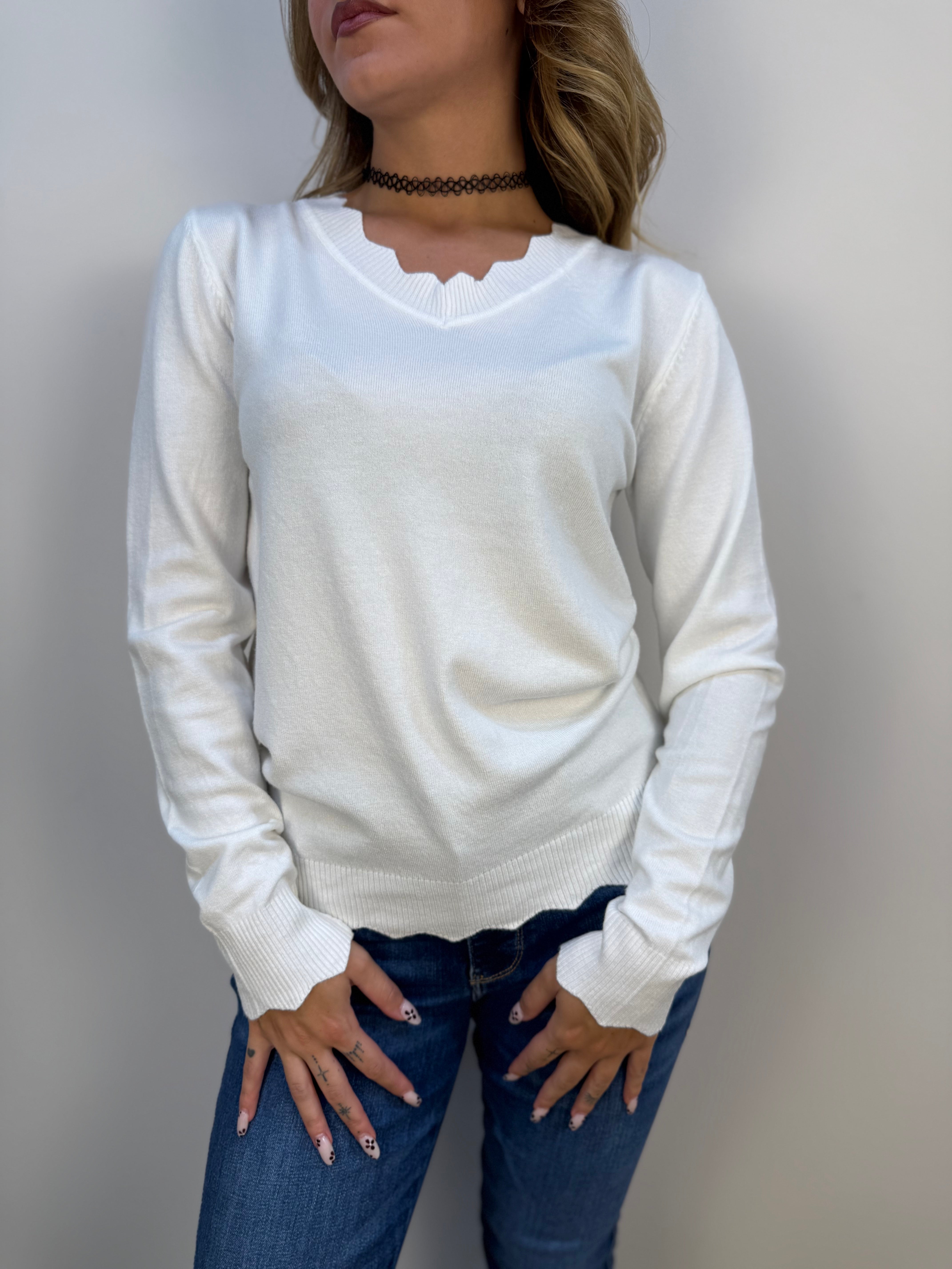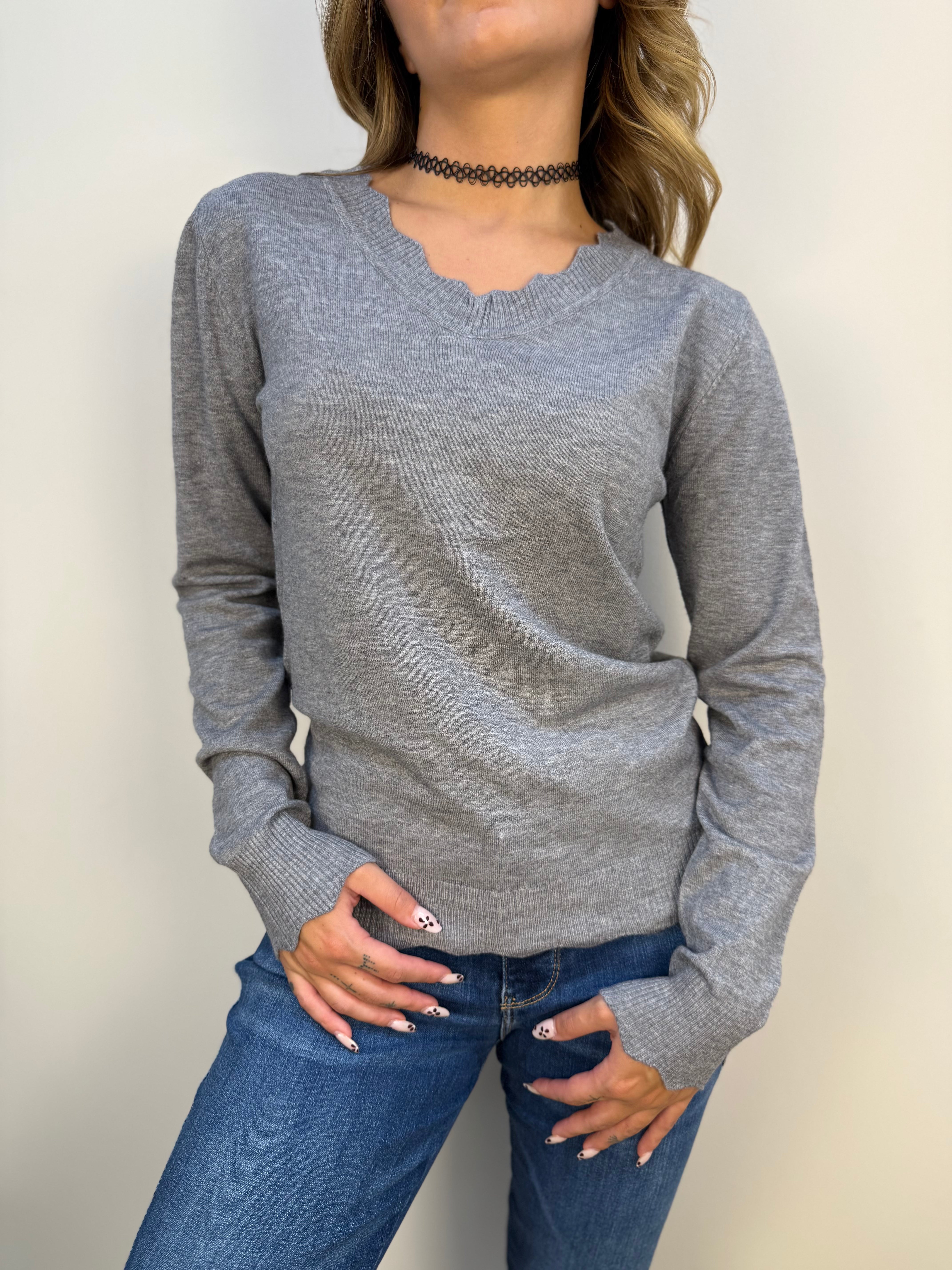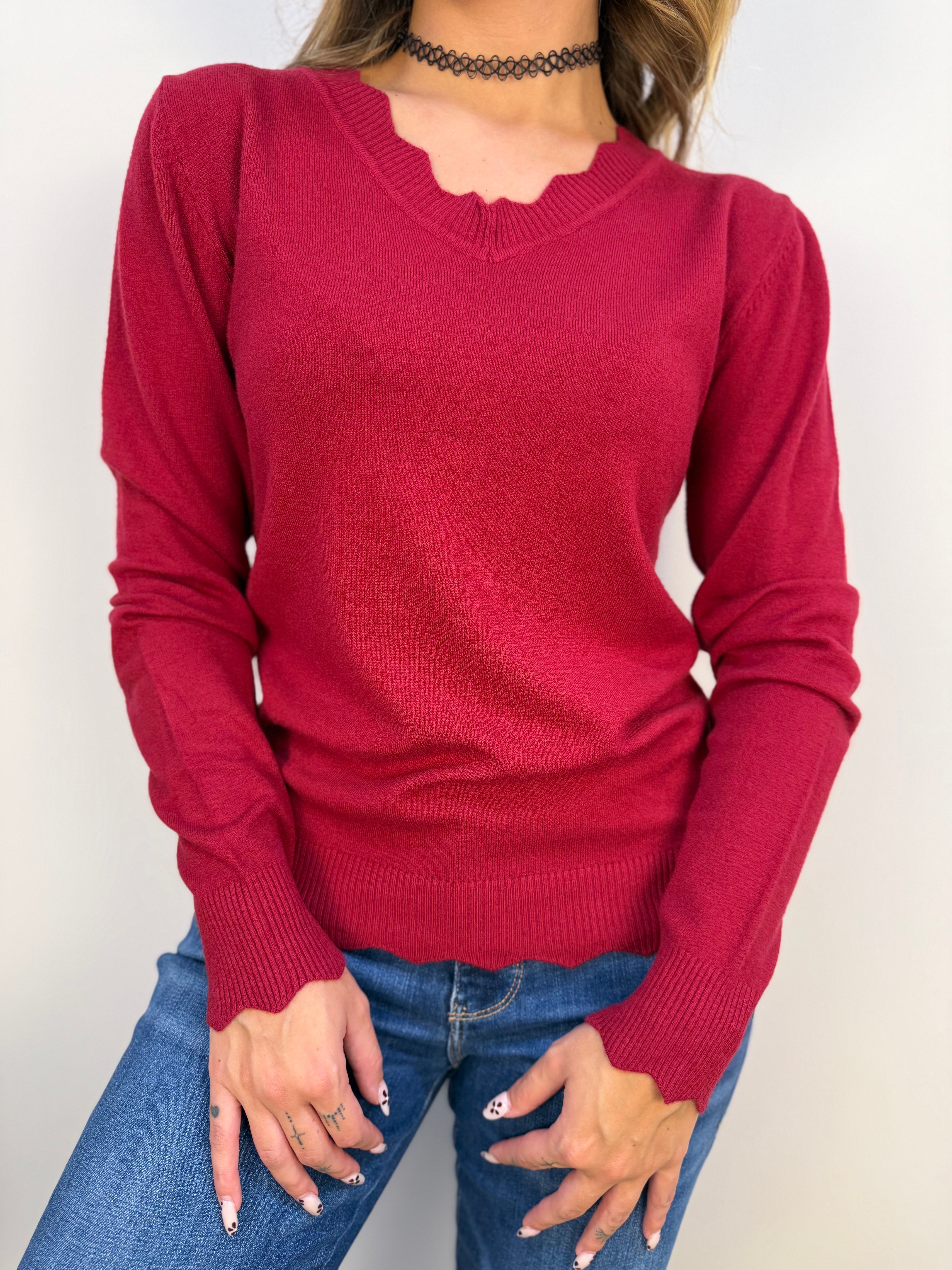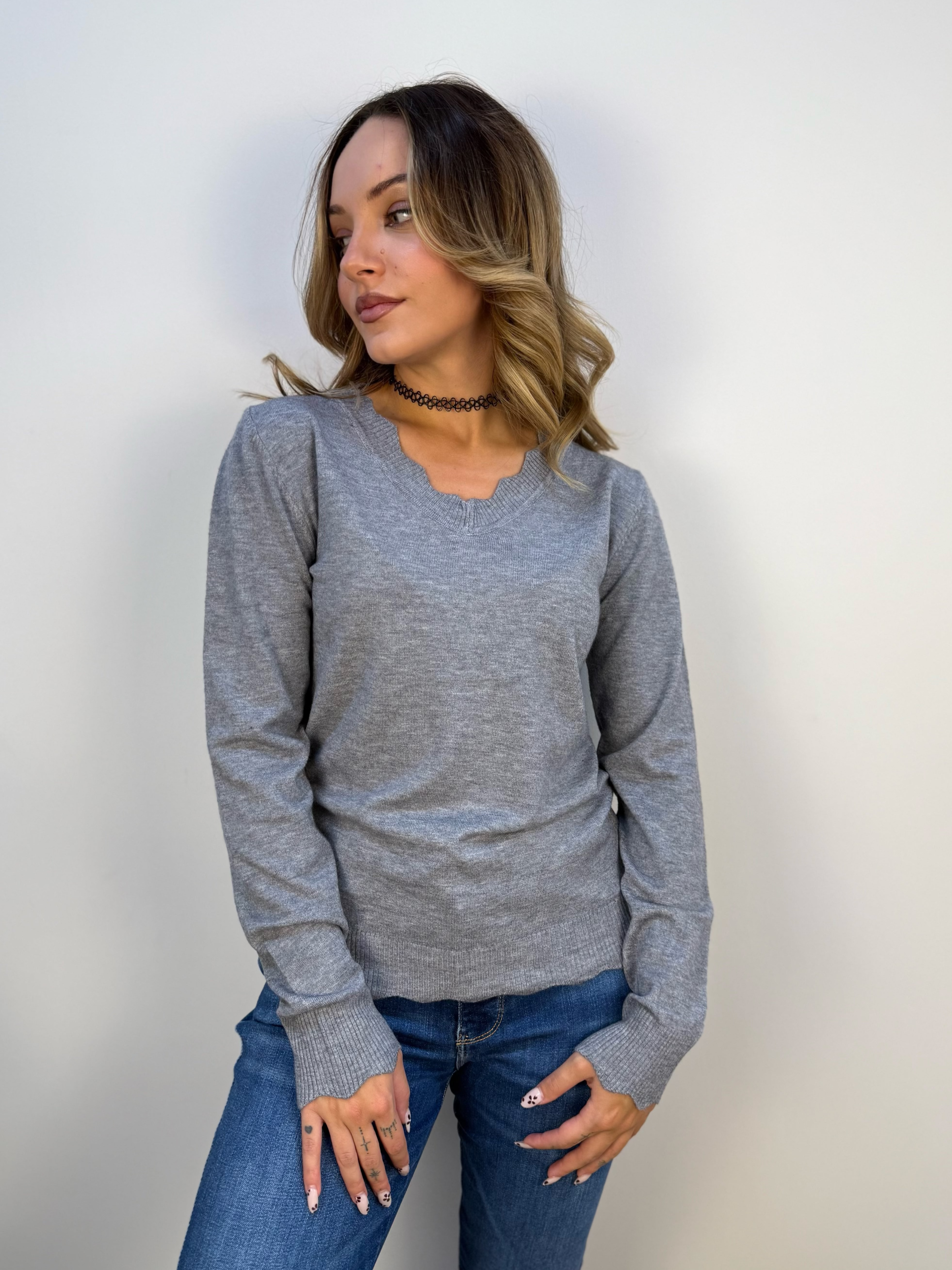 Maglia con scollo a V, realizzato in un filato morbido e caldo, ideale per la stagione fredda. Le estremità — polsini, fascione e scollo — presentano una lavorazione a costine con finitura ondulata, che dona al capo un tocco delicato e femminile. Proposto nelle varianti colore grigio, rosso e bianco.