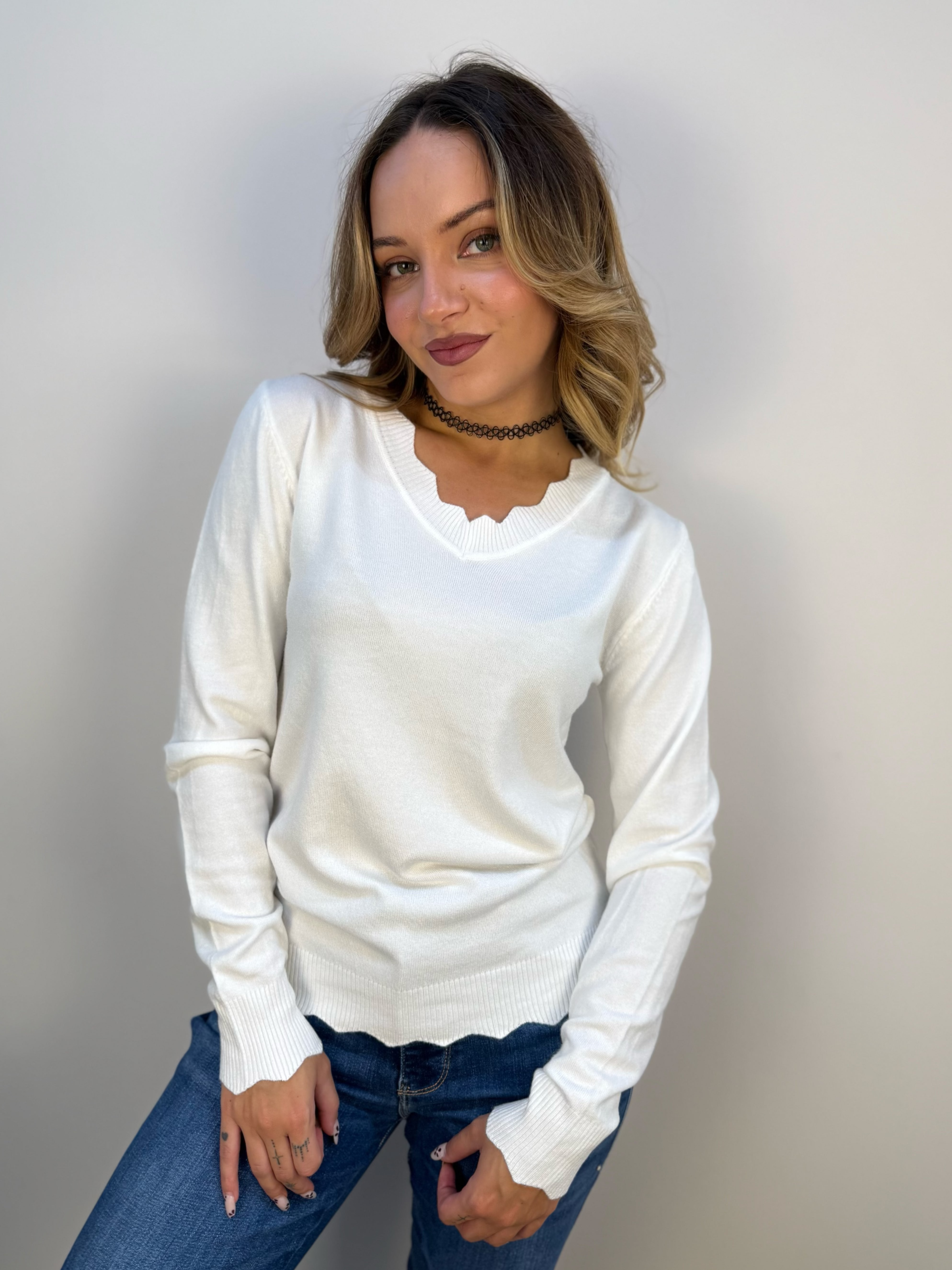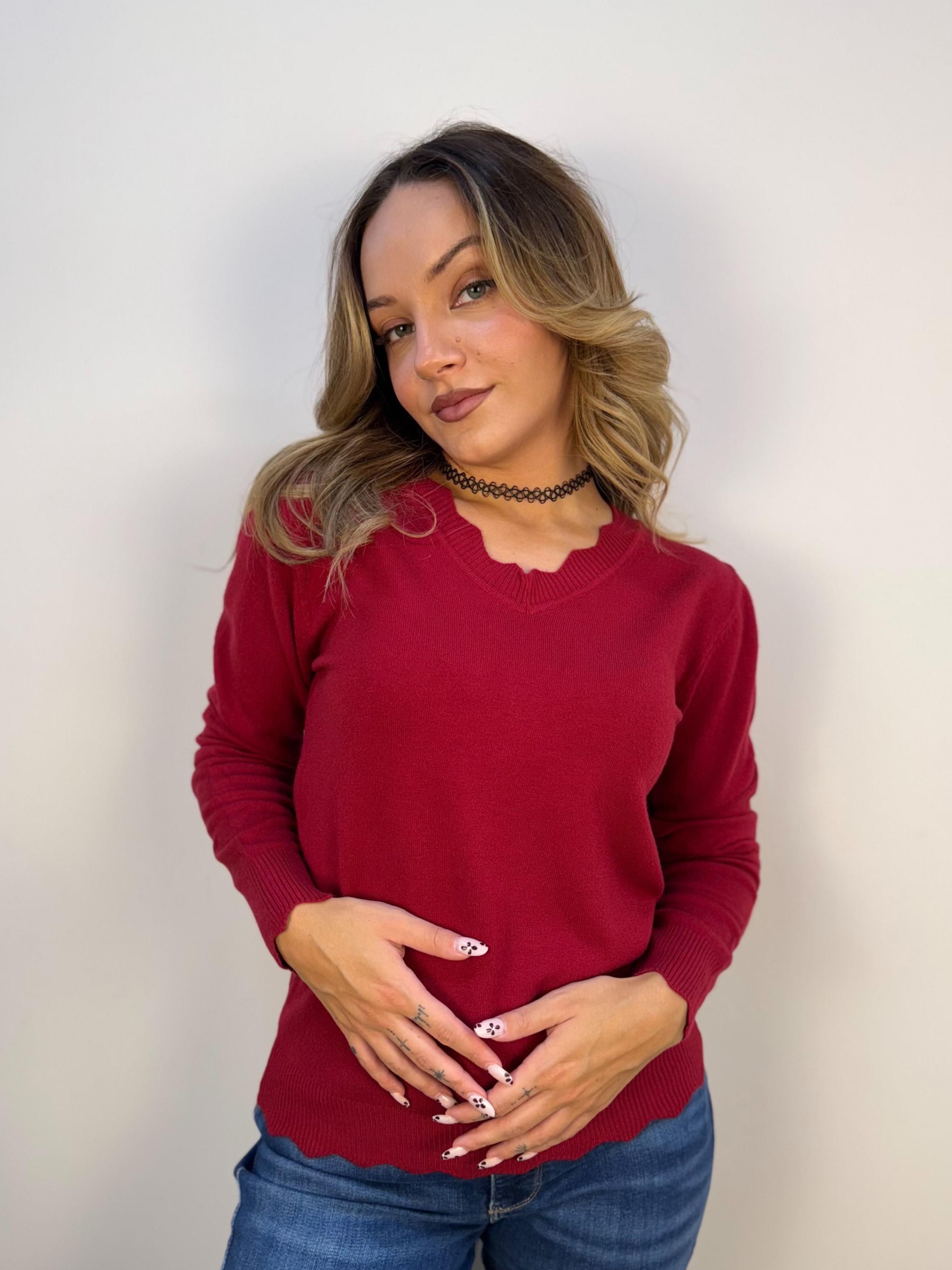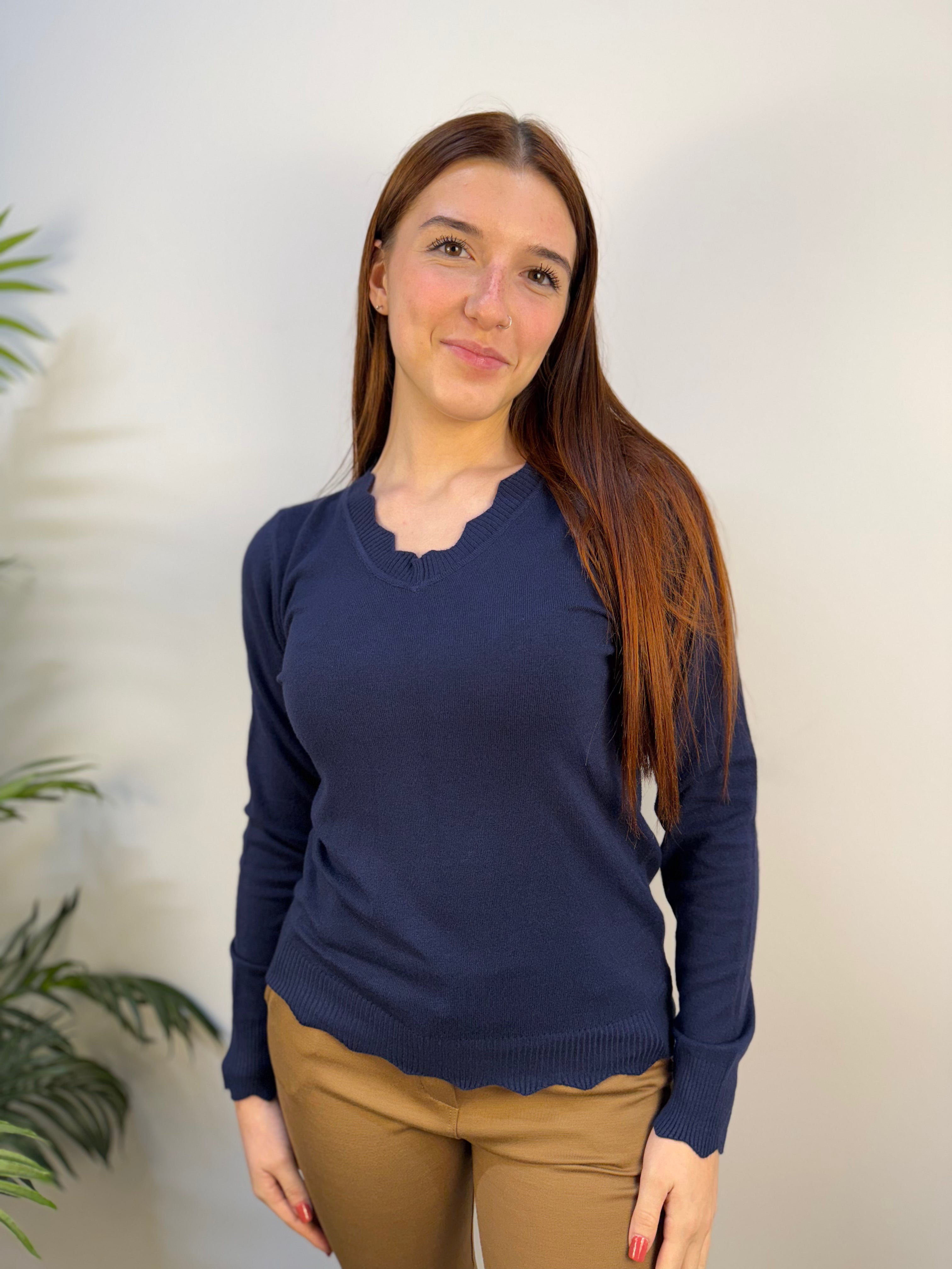 Maglia con scollo a V, realizzato in un filato morbido e caldo, ideale per la stagione fredda. Le estremità — polsini, fascione e scollo — presentano una lavorazione a costine con finitura ondulata, che dona al capo un tocco delicato e femminile. Proposto nelle varianti colore grigio, rosso e bianco.
