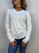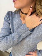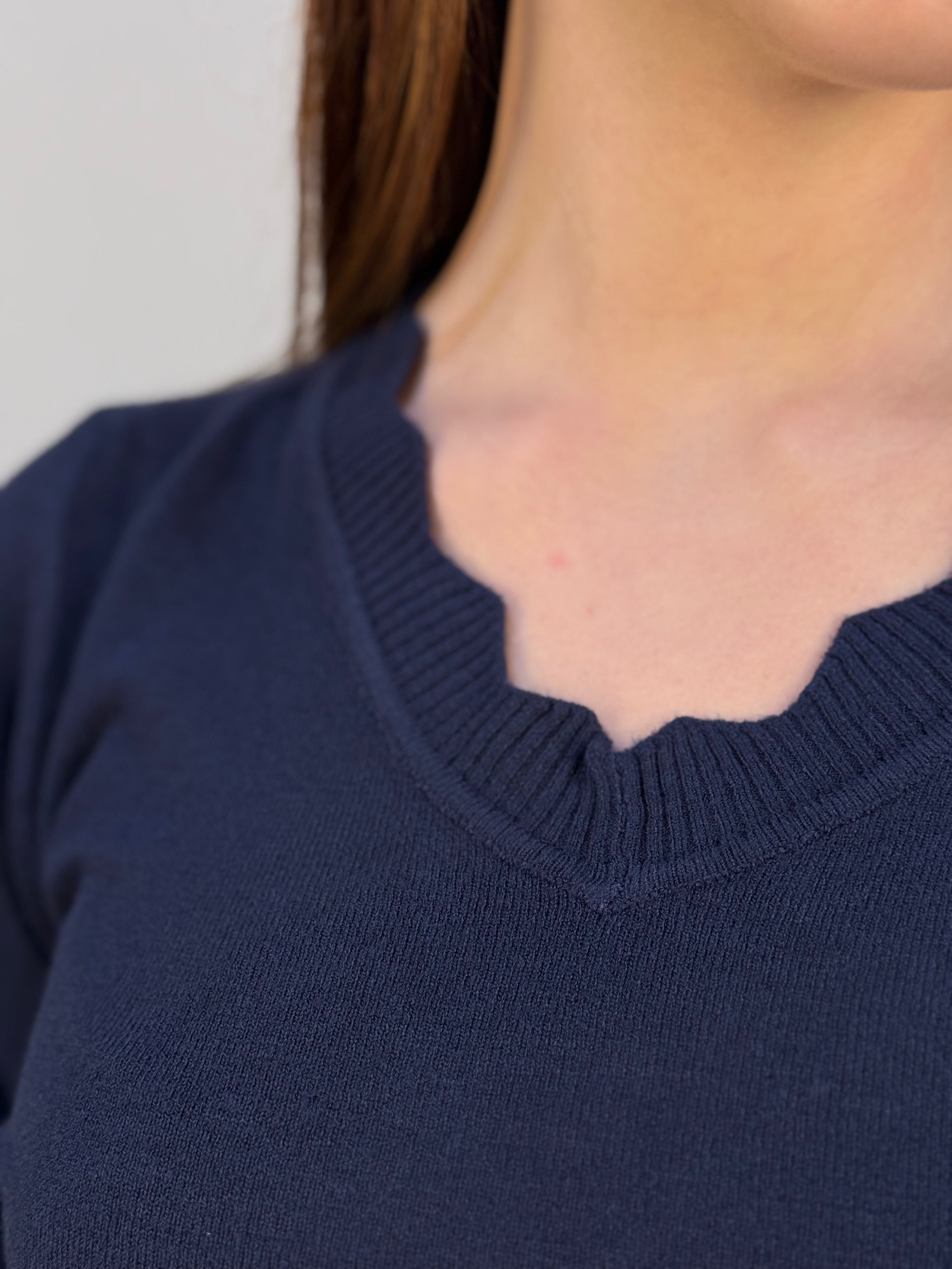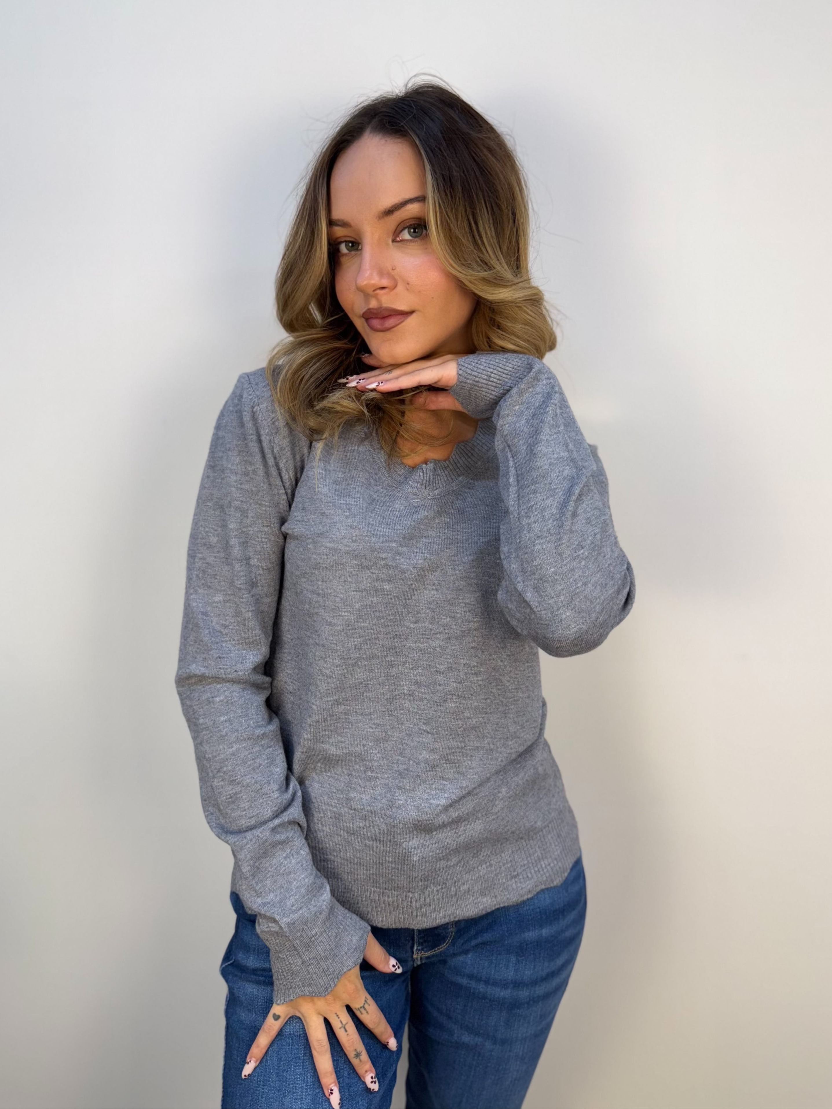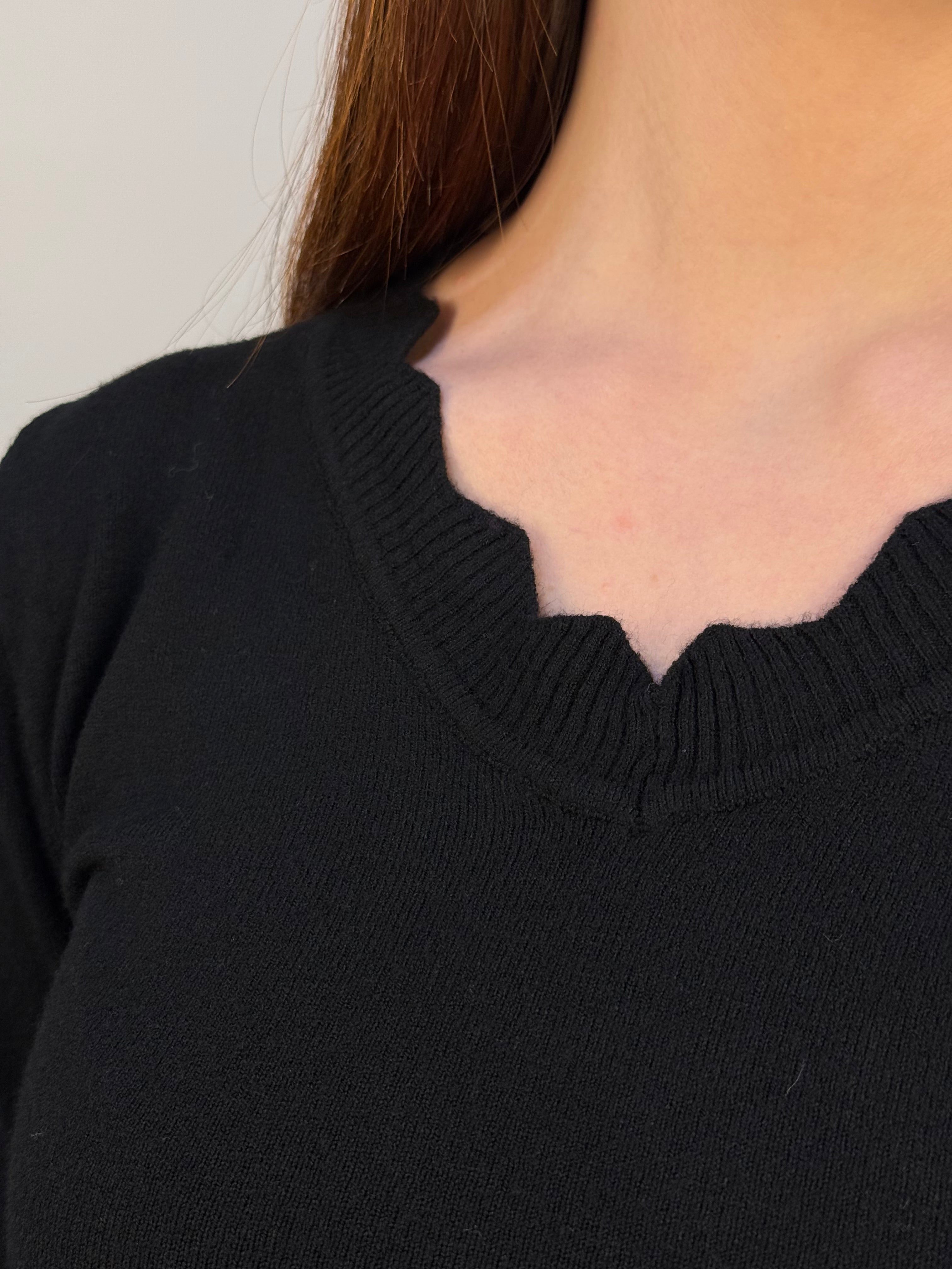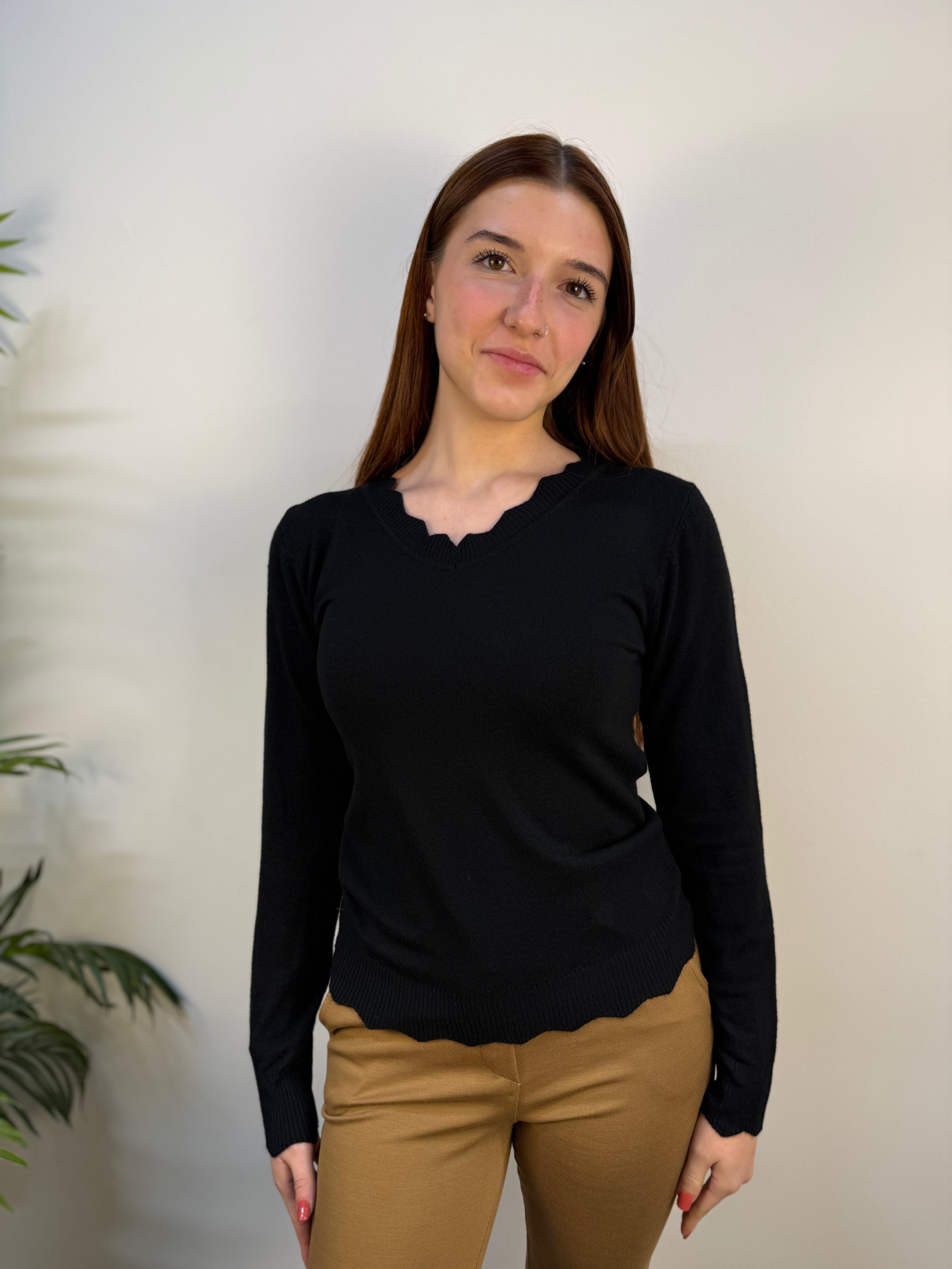 Maglia con scollo a V, realizzato in un filato morbido e caldo, ideale per la stagione fredda. Le estremità — polsini, fascione e scollo — presentano una lavorazione a costine con finitura ondulata, che dona al capo un tocco delicato e femminile. Proposto nelle varianti colore grigio, rosso e bianco.