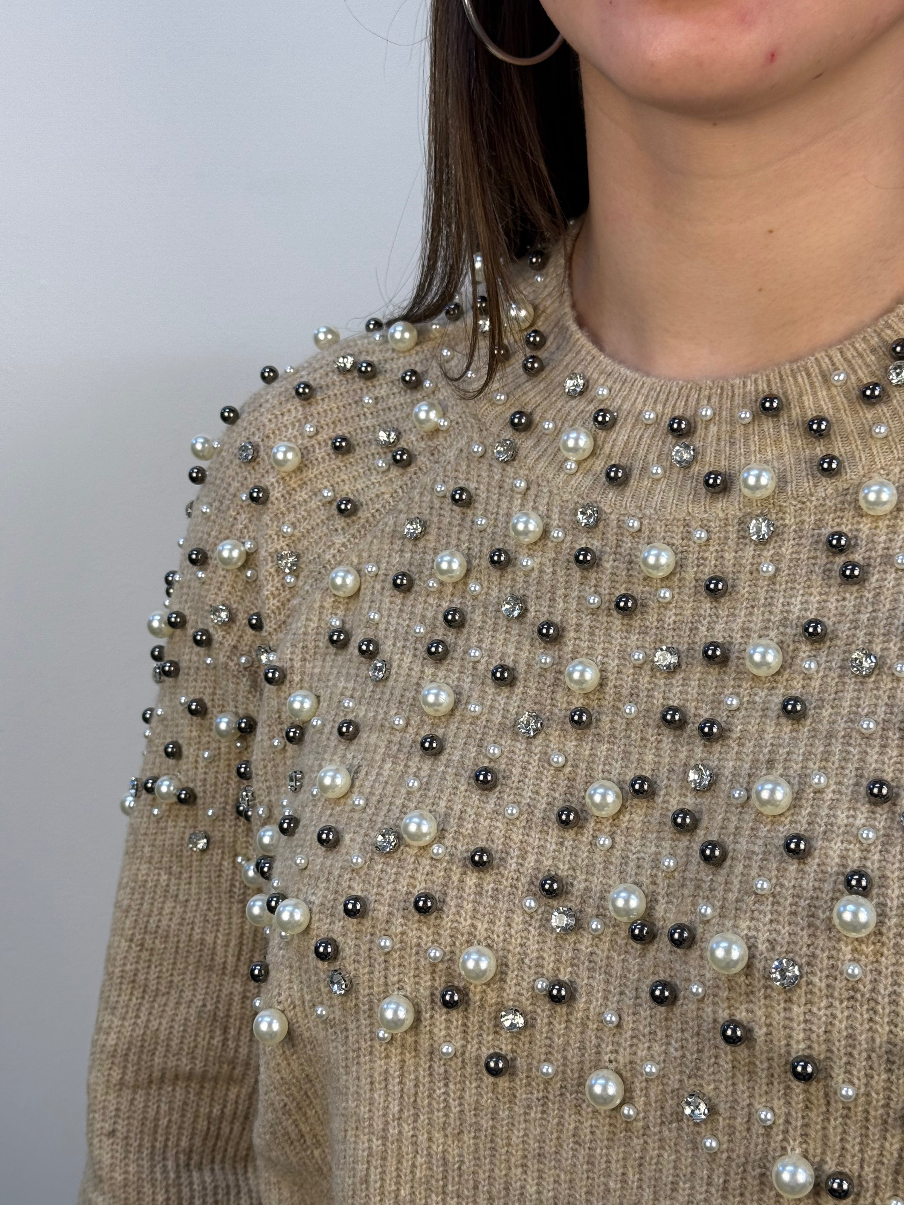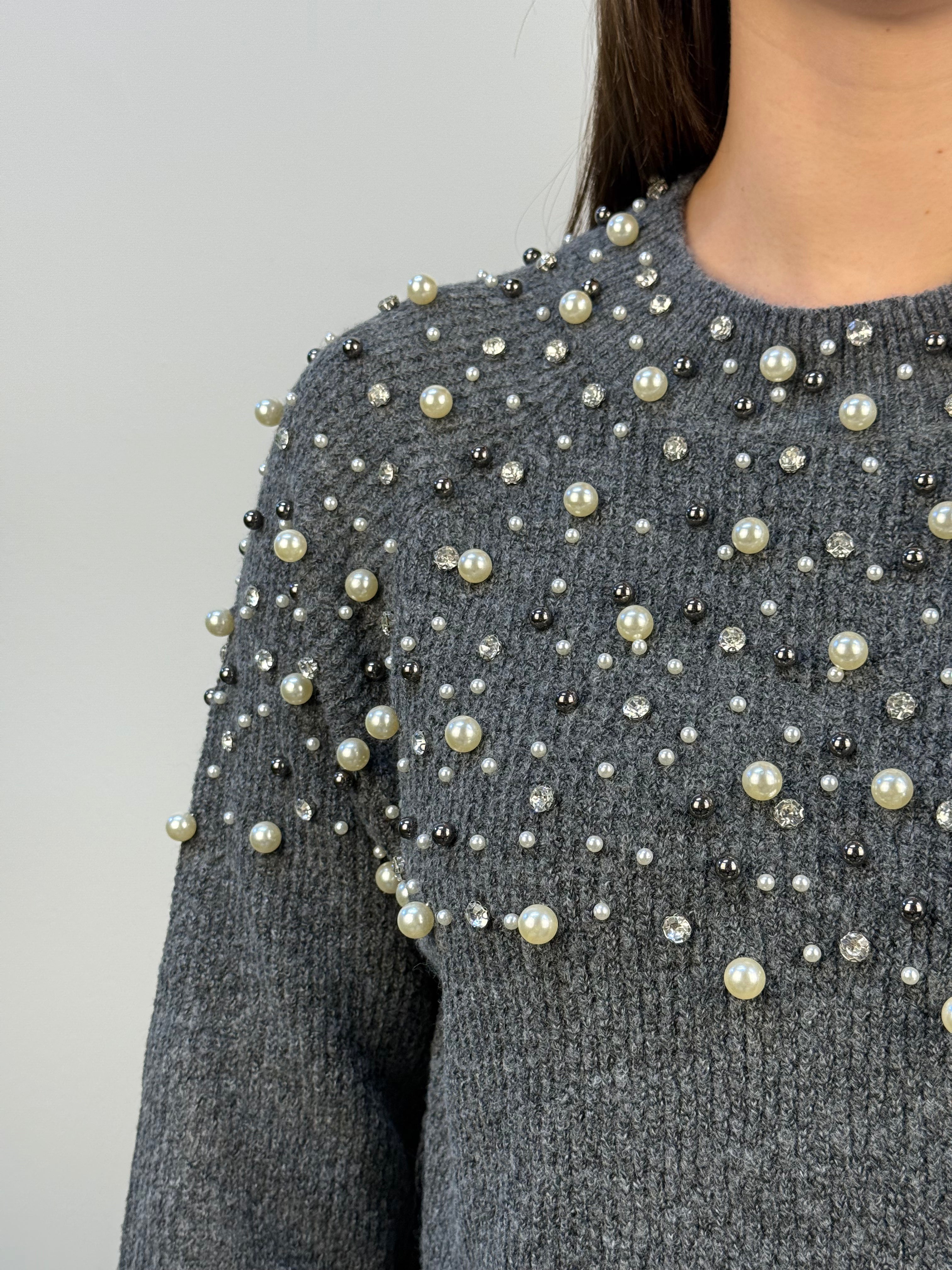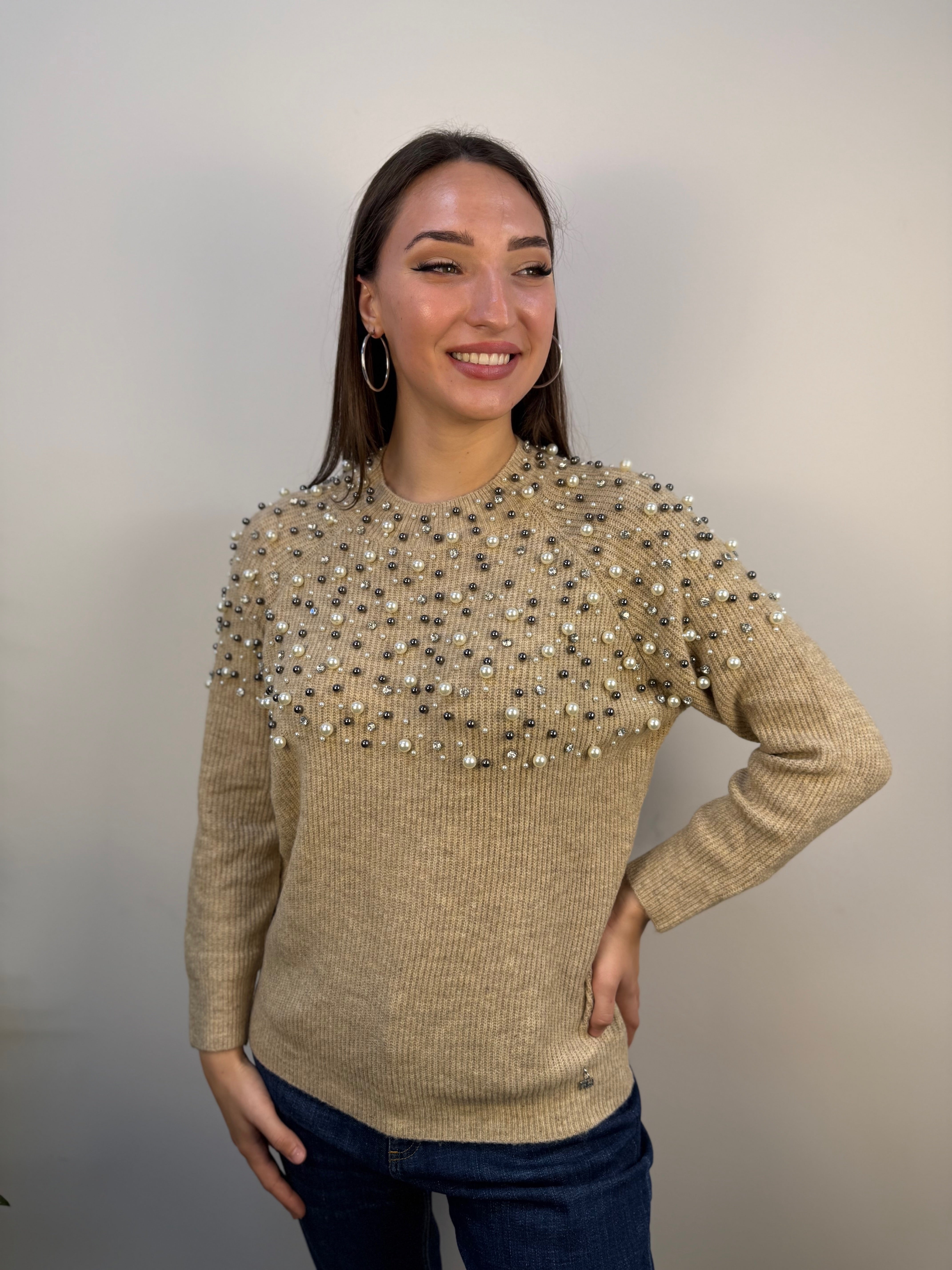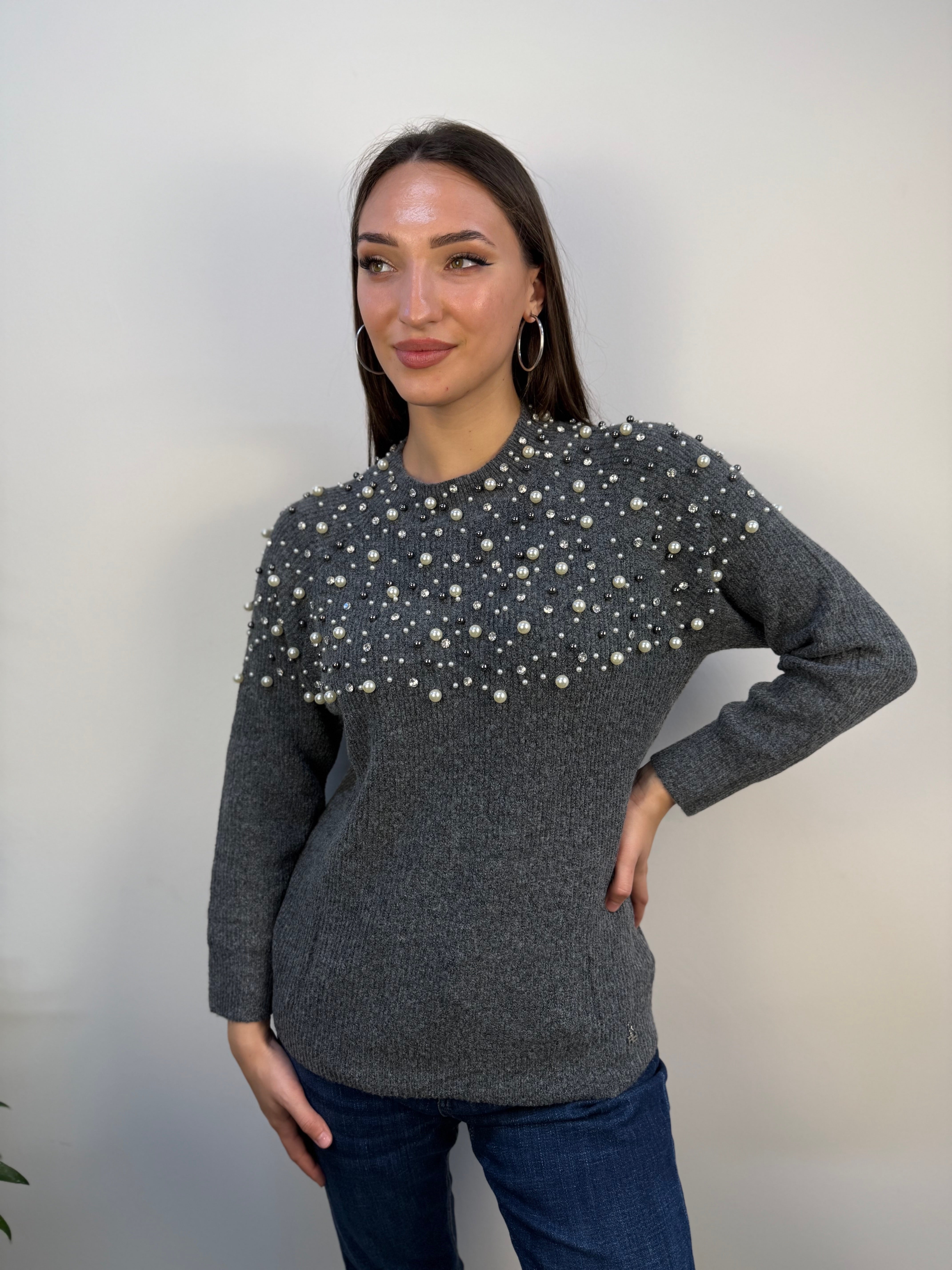Maglia Artigli leggermente oversize in morbida viscosa, pensata per offrire calore e comfort con un tocco di eleganza. Il design pulito è impreziosito da applicazioni di perle e strass posizionate su spalle e petto, che donano al capo una raffinatezza delicata e luminosa. La vestibilità morbida la rende ideale per look femminili e sofisticati, senza rinunciare alla comodità. Un capo perfetto per aggiungere un dettaglio prezioso ai tuoi outfit quotidiani o da sera.