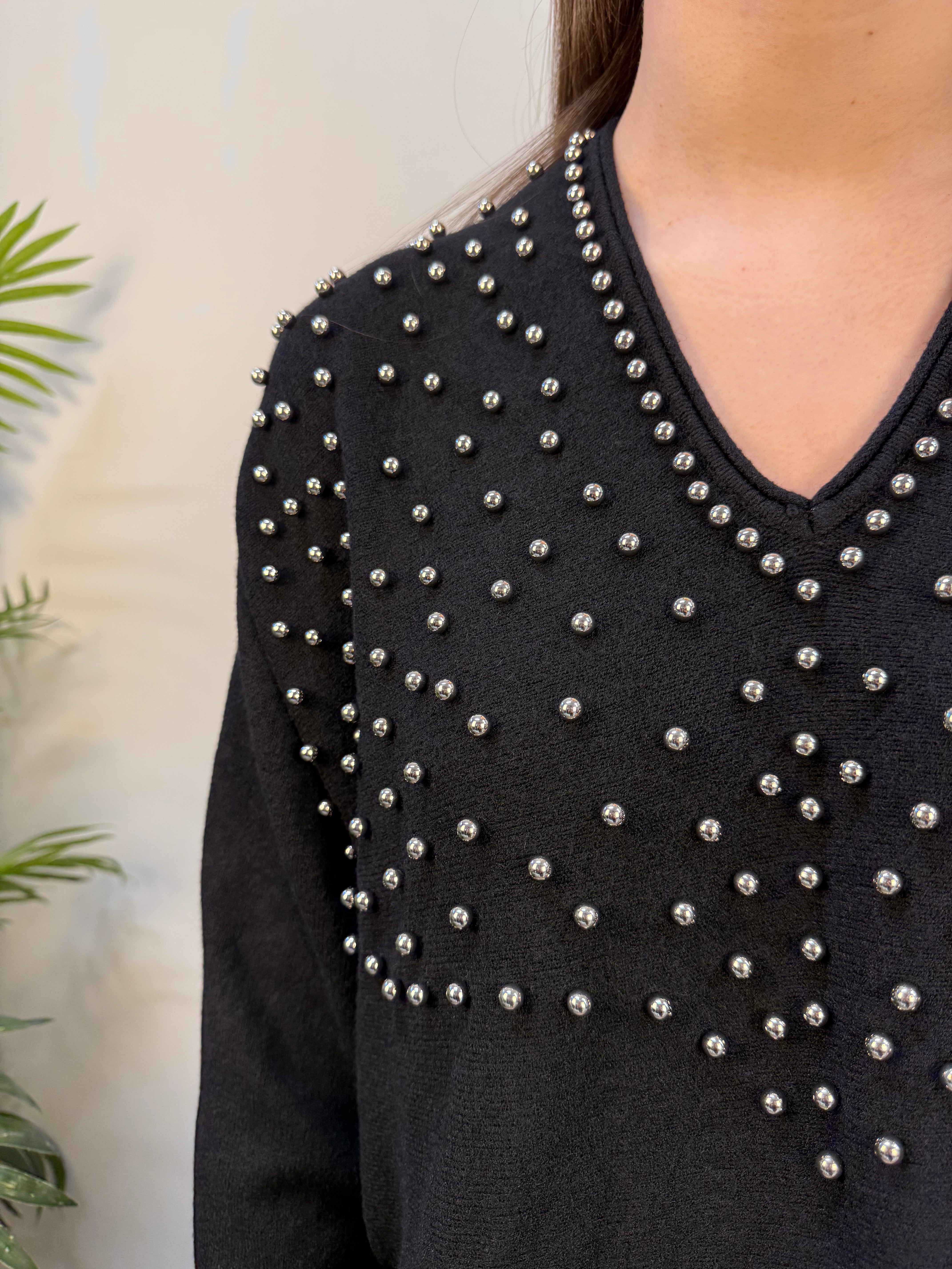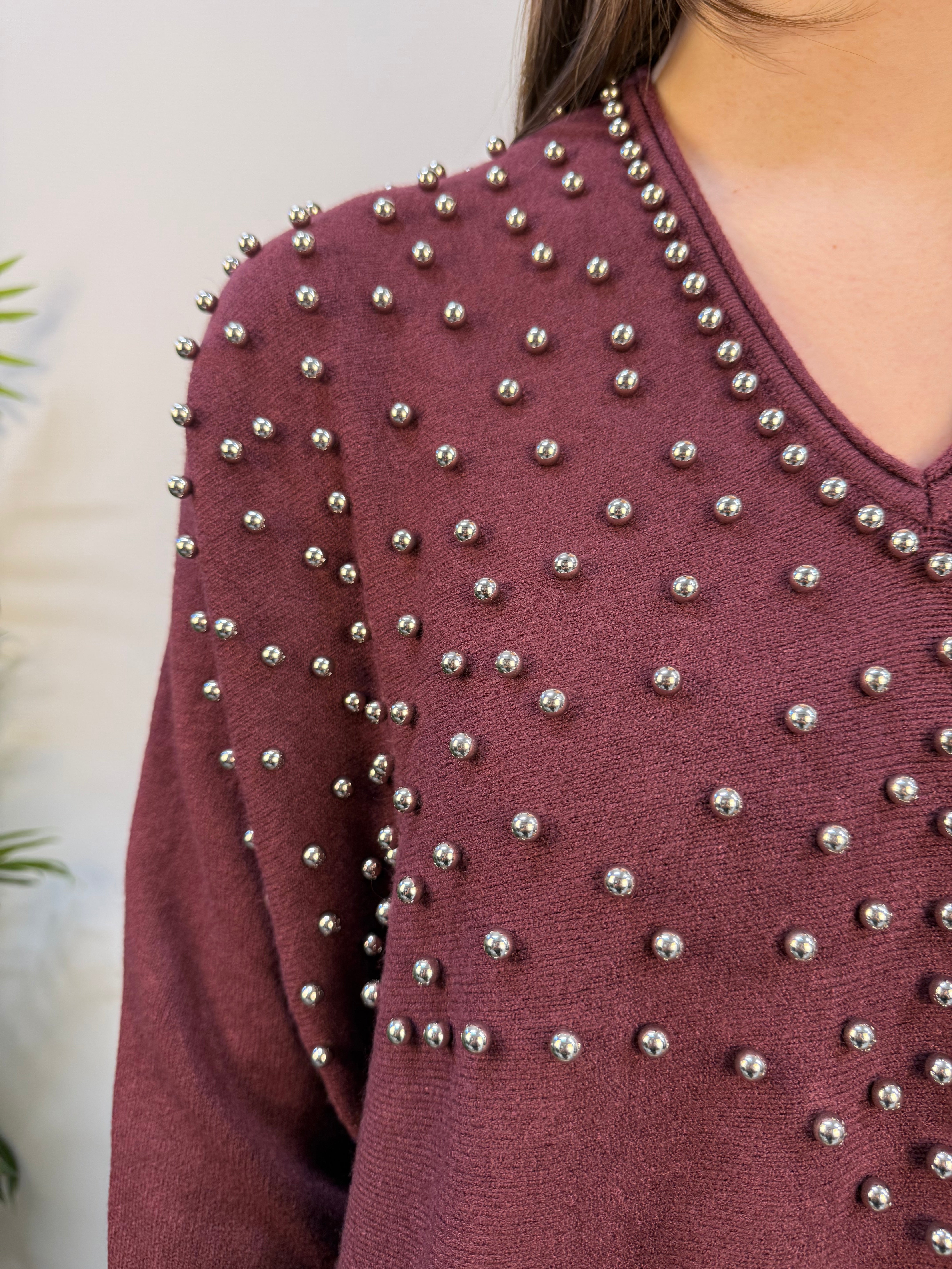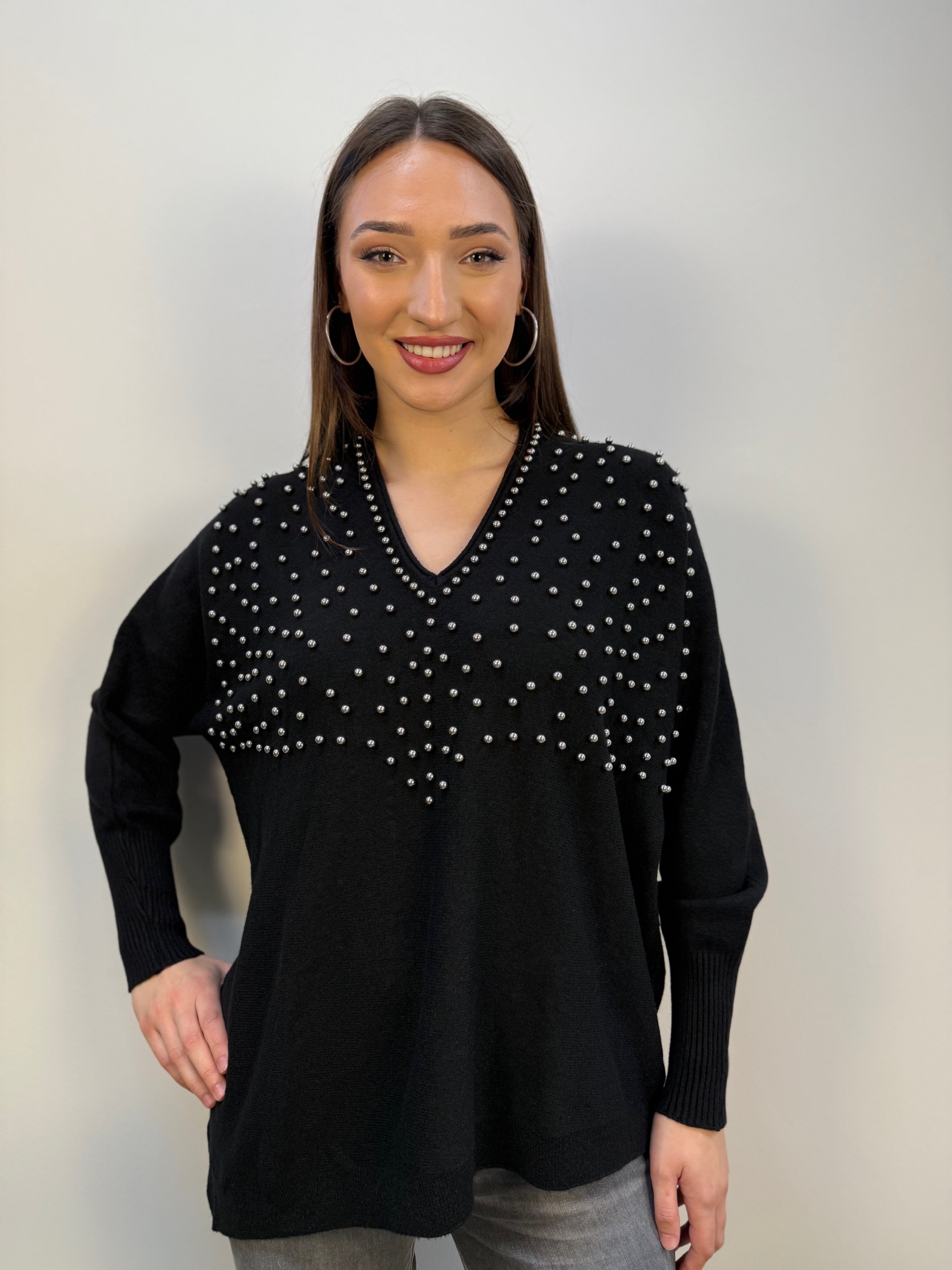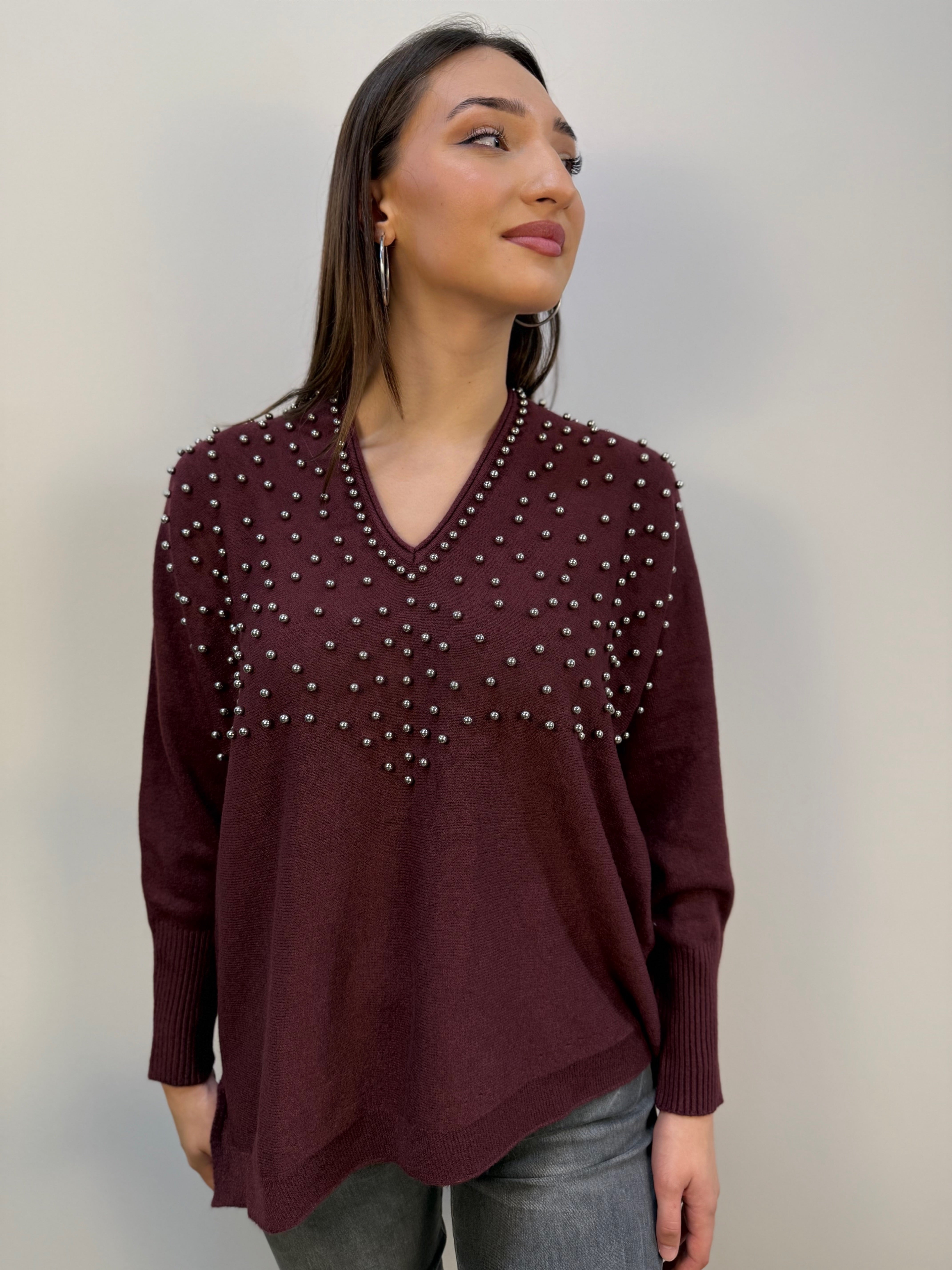 Disponibile nelle varianti nero e bordeaux, questo pullover Rinascimento è perfetto per l’autunno grazie ai colori caldi e versatili. Con uno scollo a V classico e una lunghezza leggermente più lunga sul davanti, offre una silhouette moderna e comoda. I polsini a costine aggiungono struttura, mentre le perline color argento nella parte superiore donano un tocco raffinato e luminoso al capo. Vestibilità oversize.