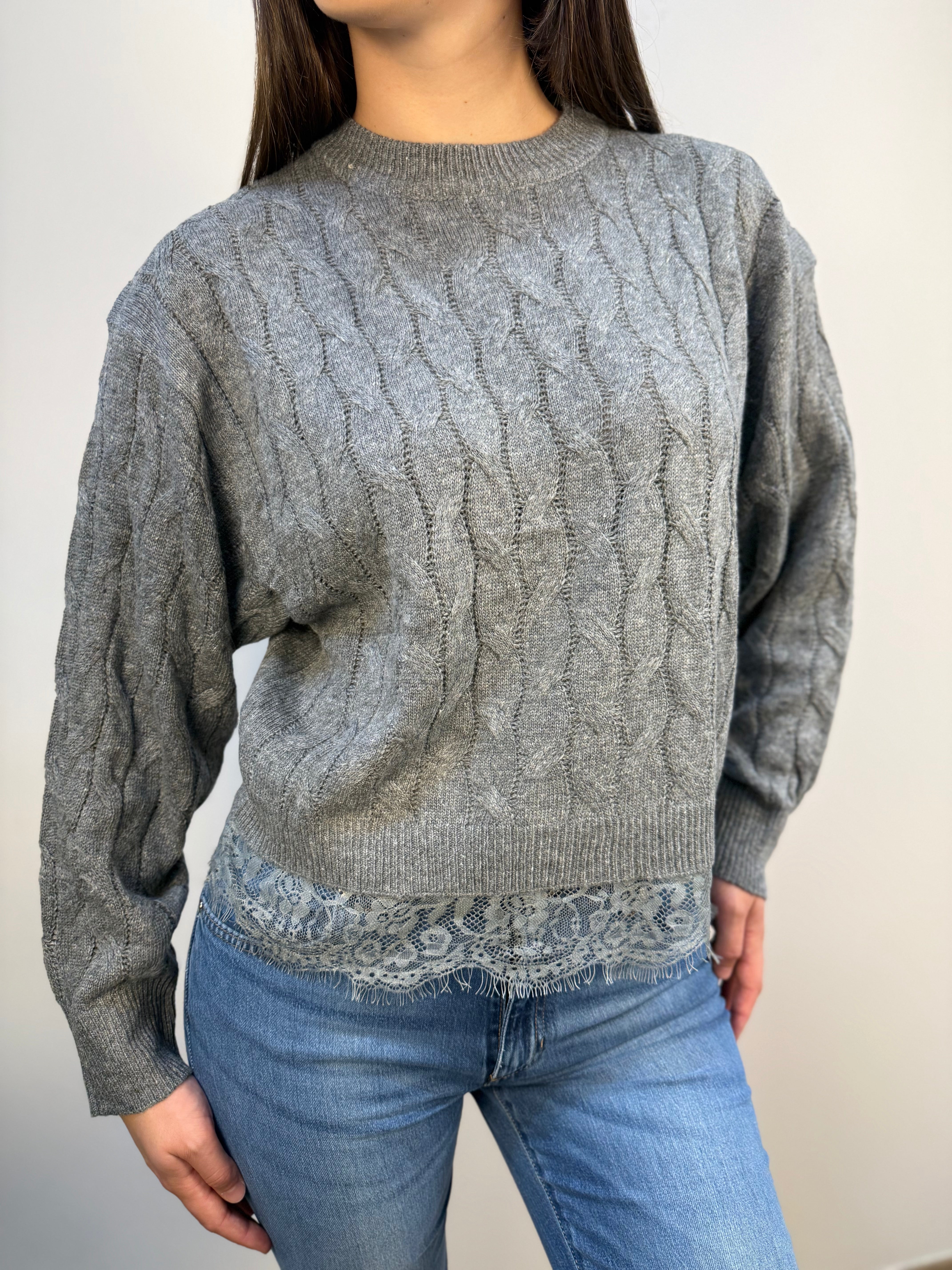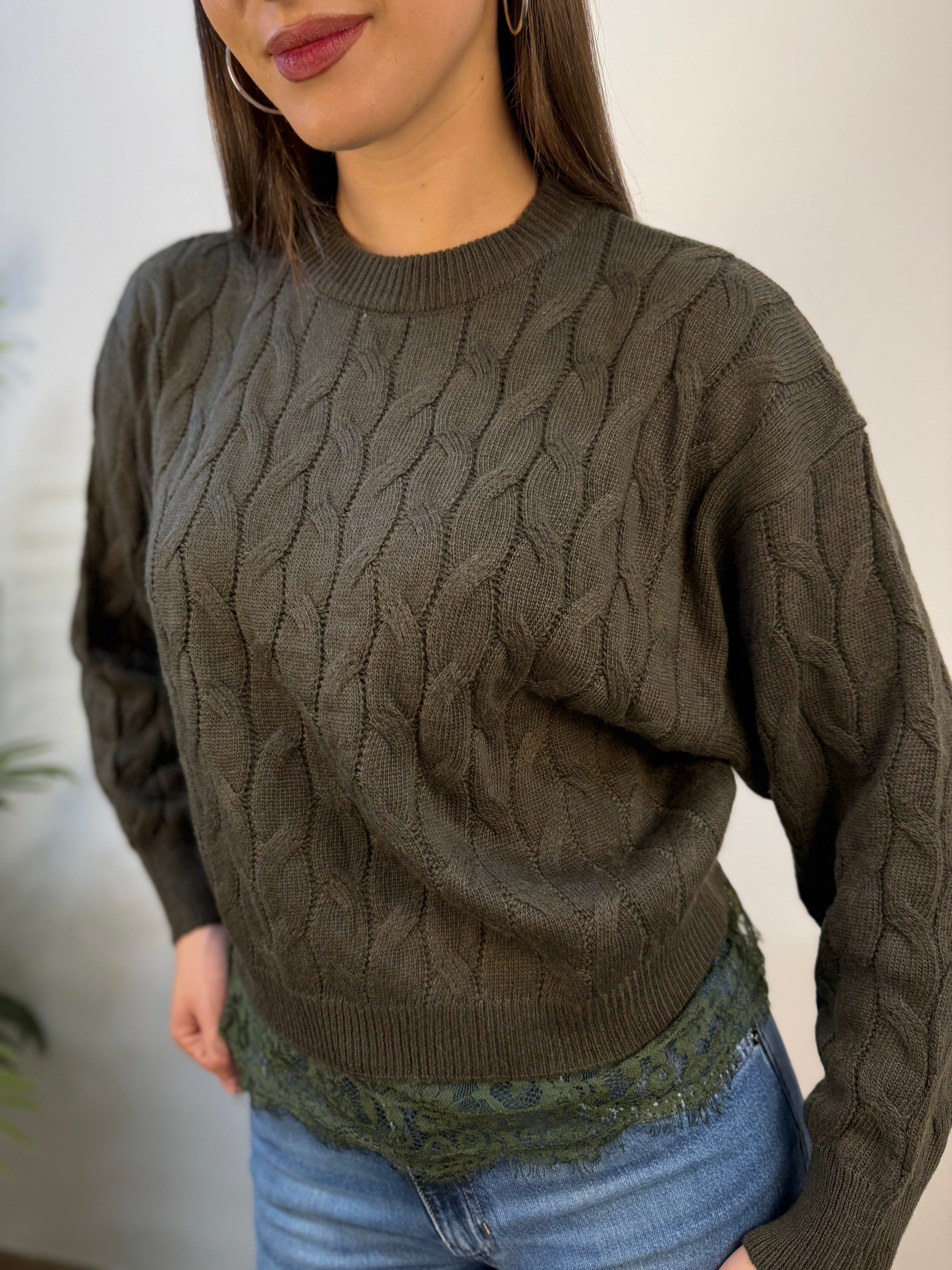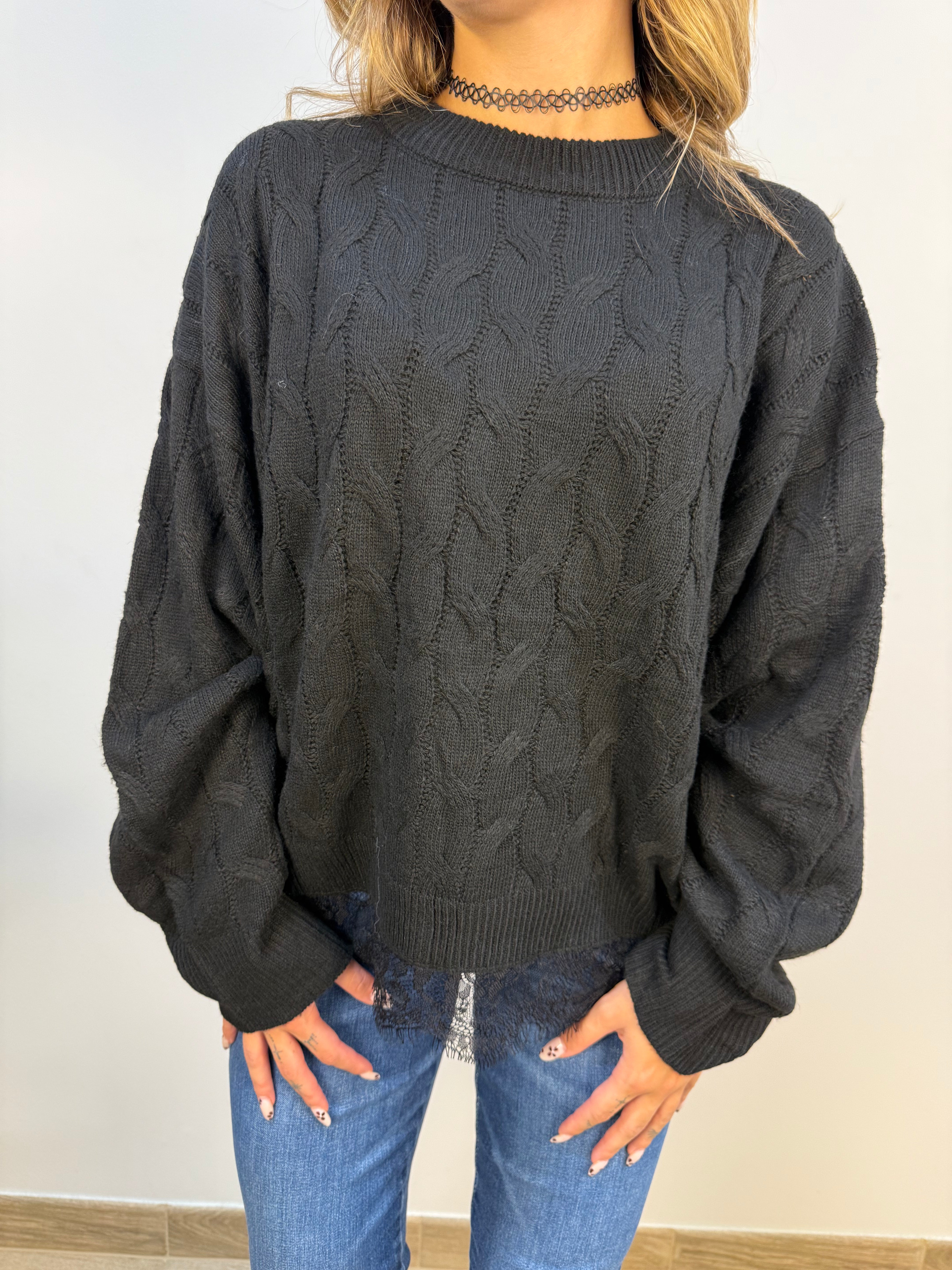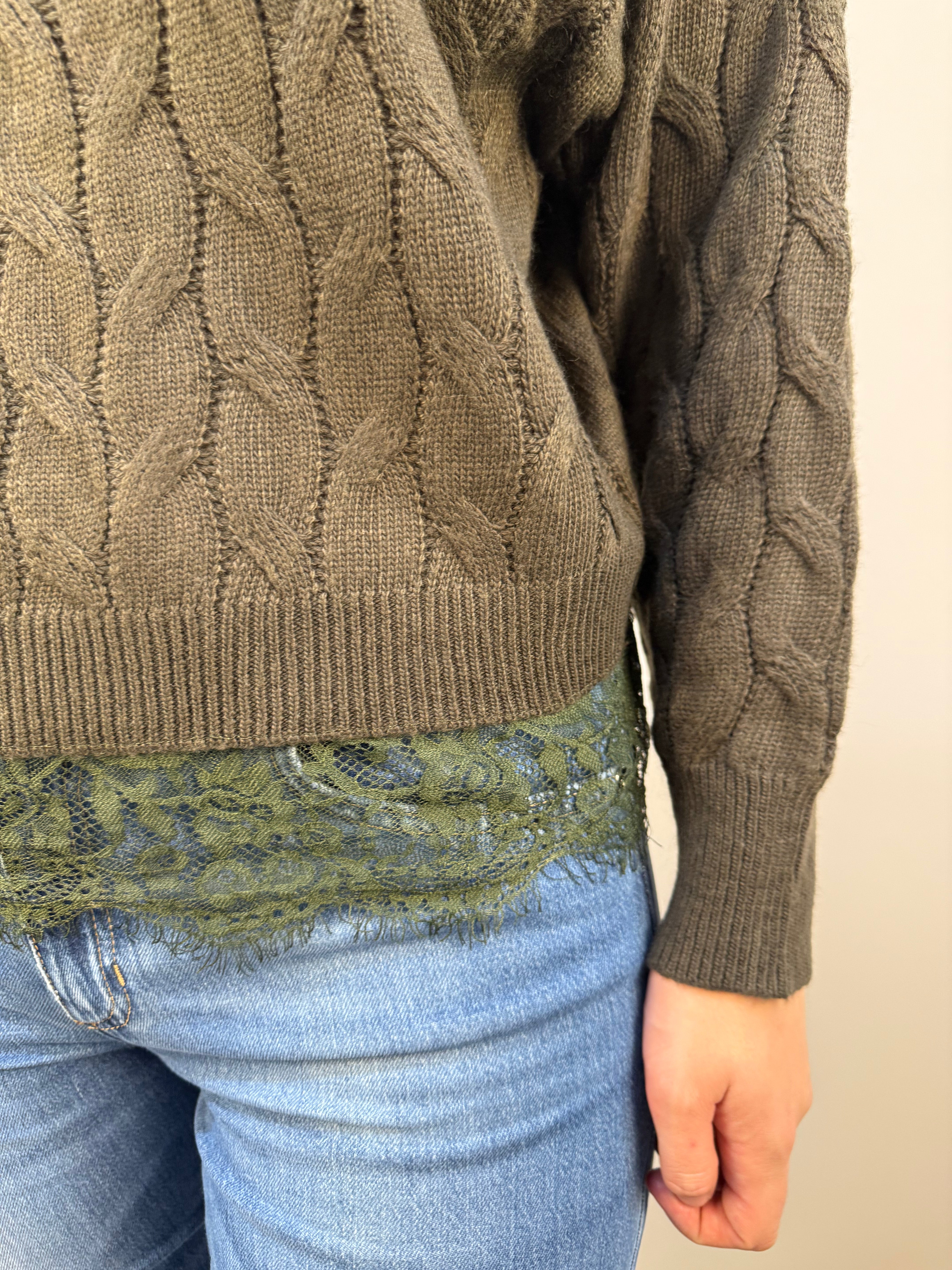 Maglione a trecce con dettaglio in pizzo tono su tono