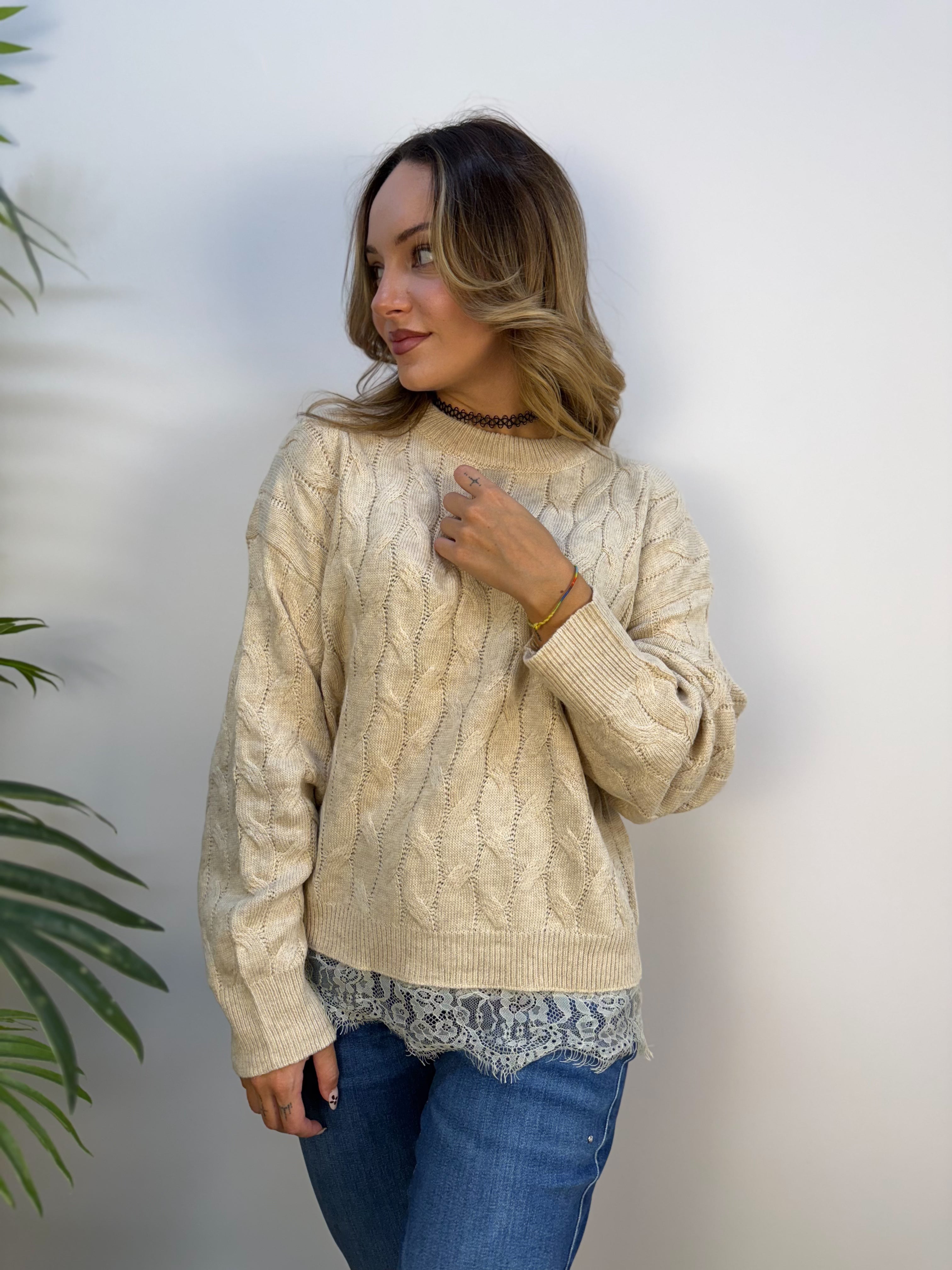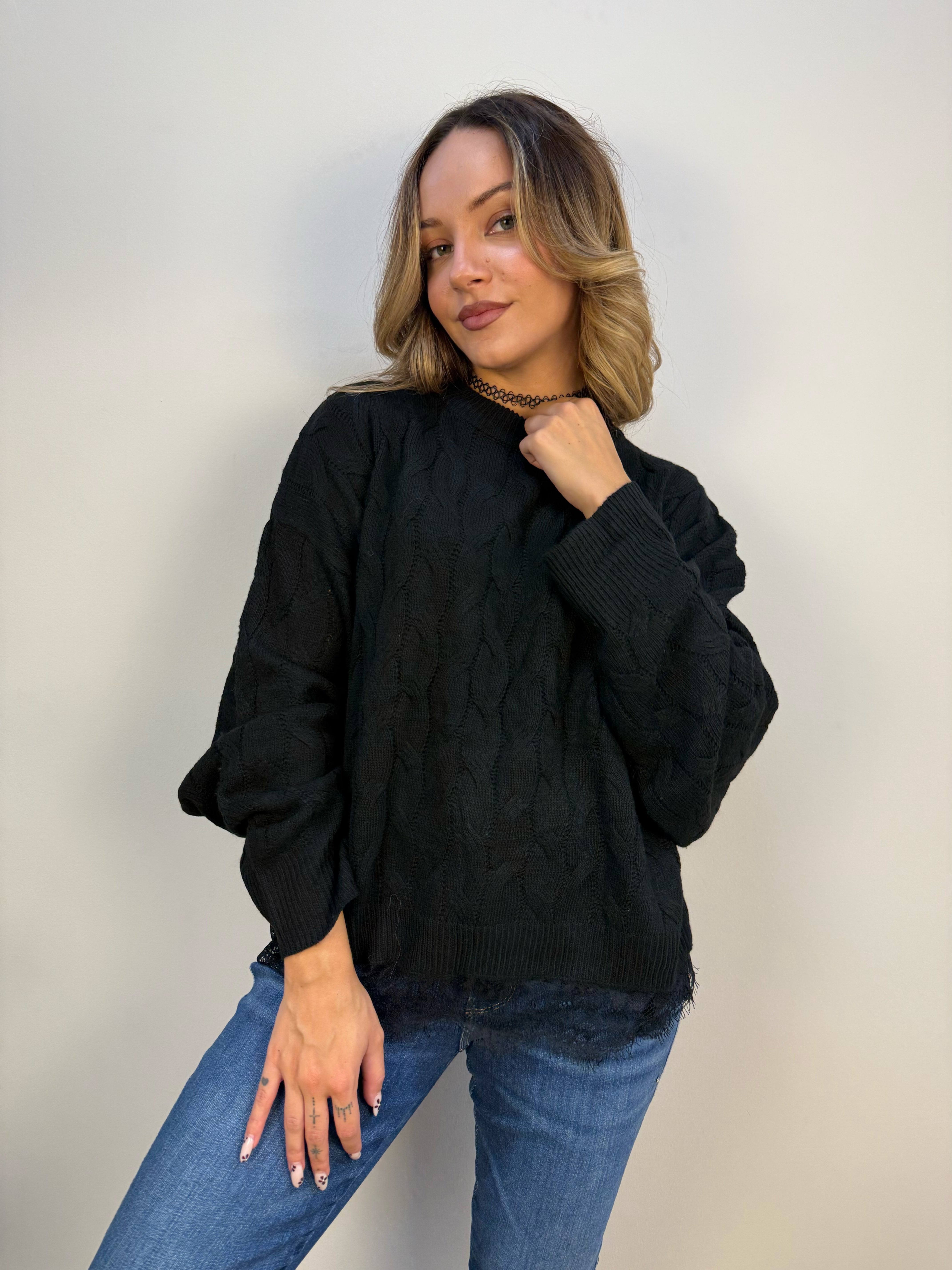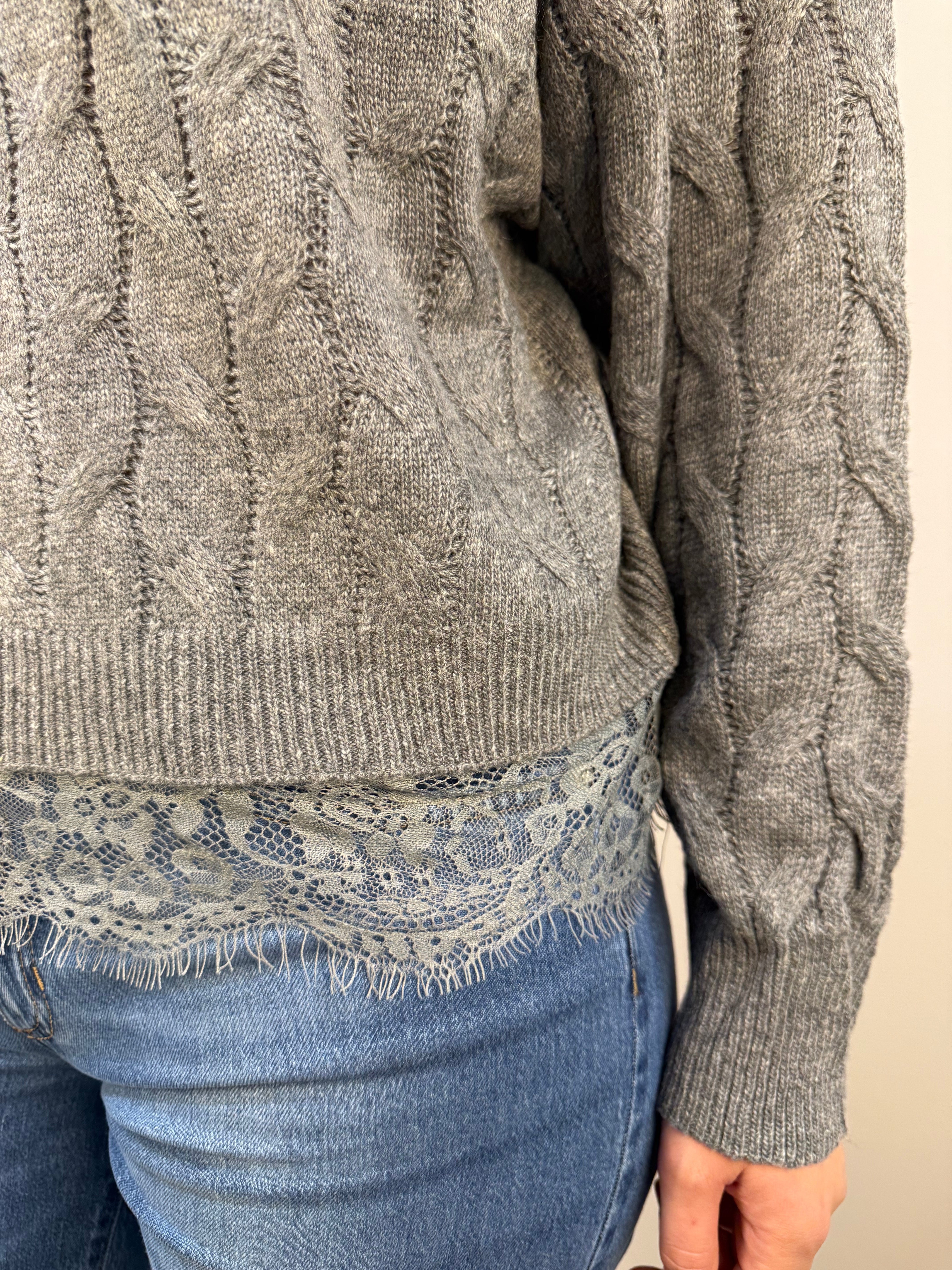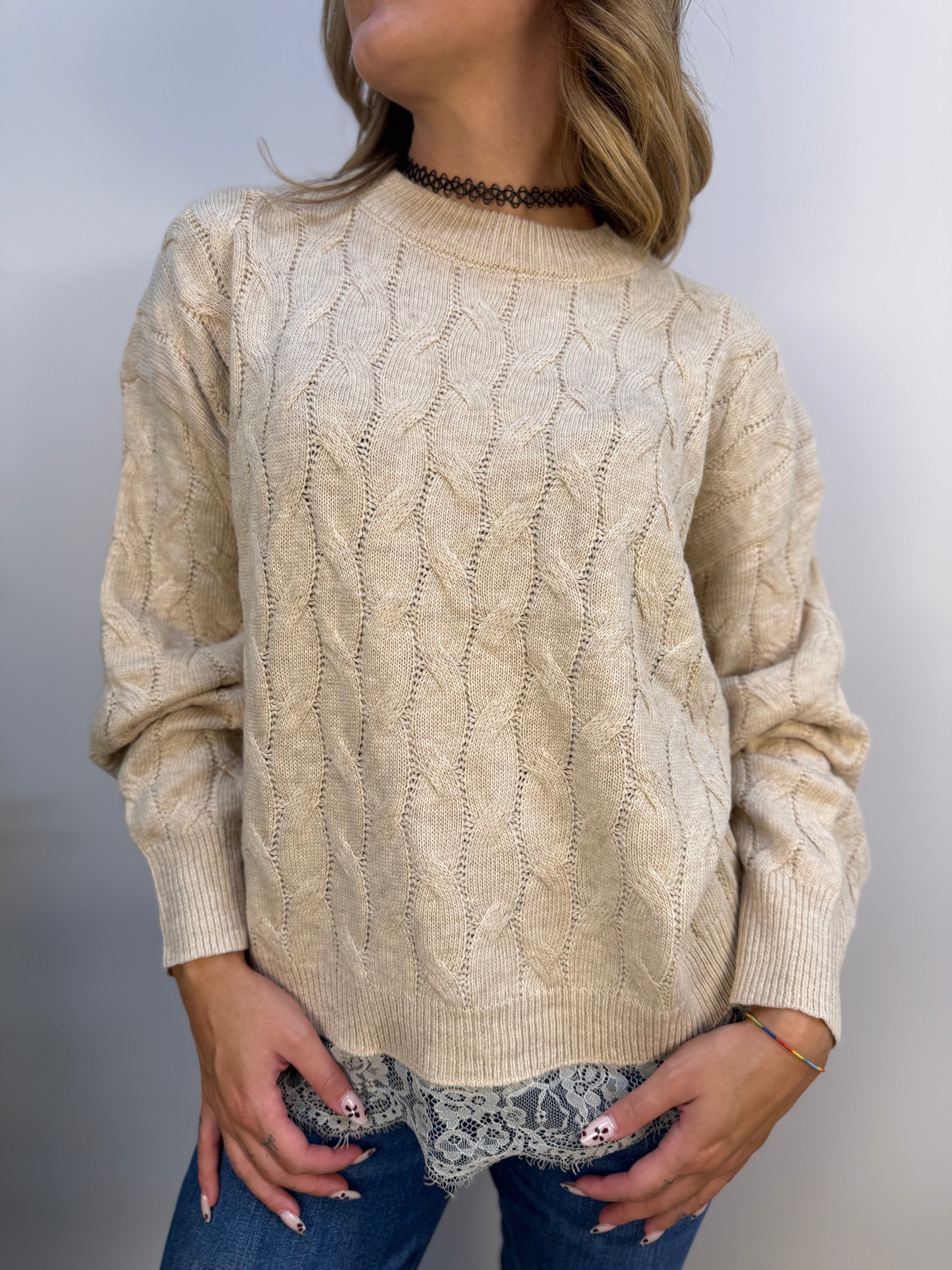 Maglione a trecce con dettaglio in pizzo tono su tono
